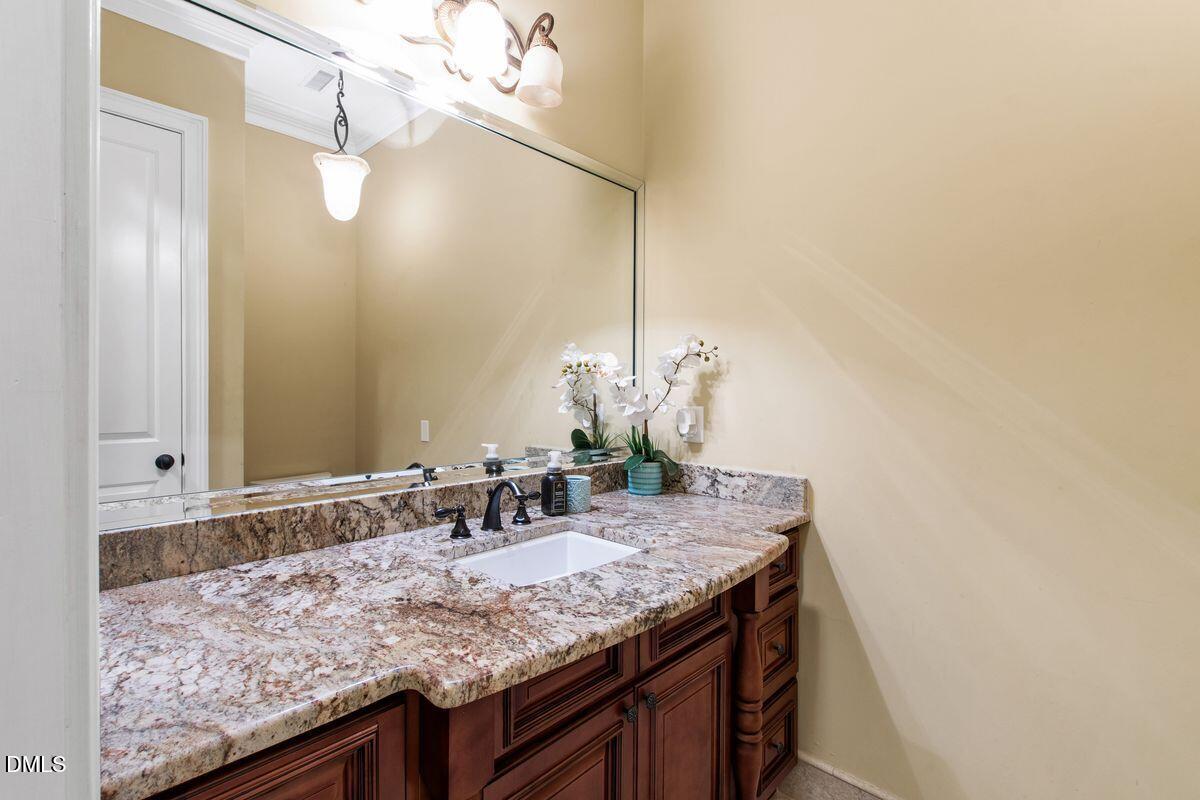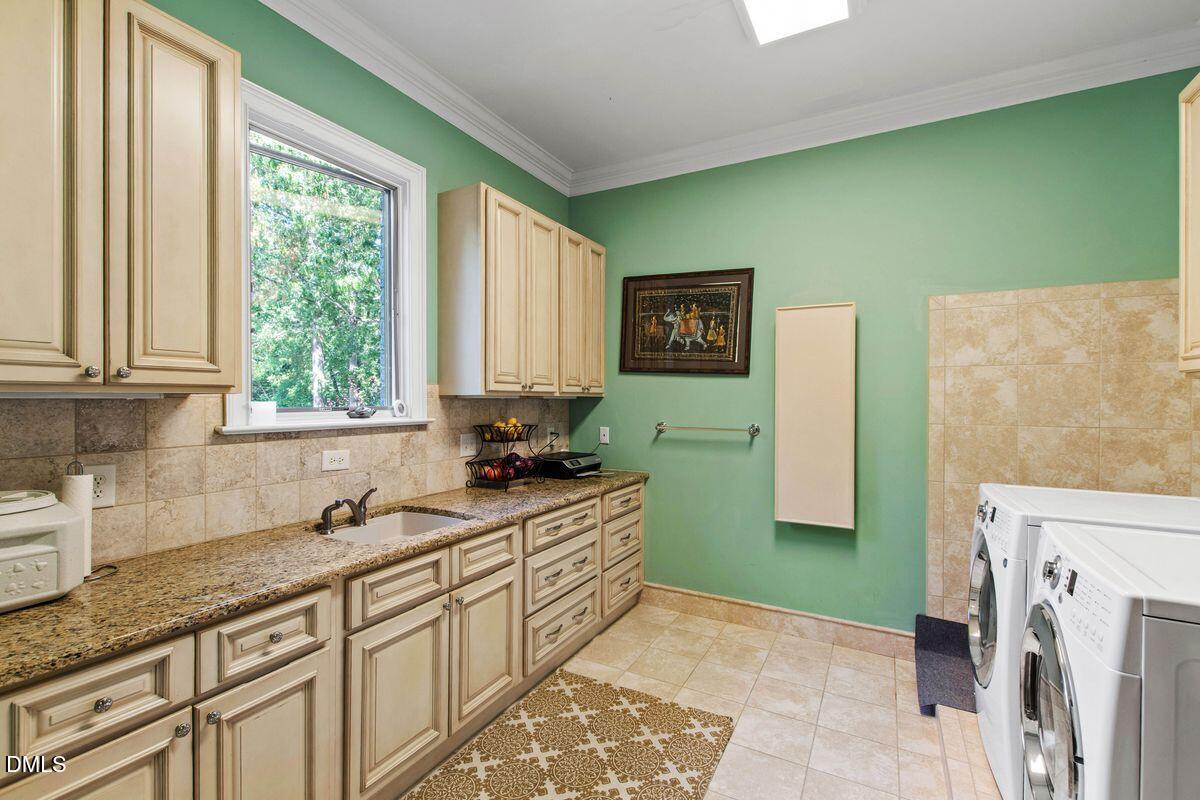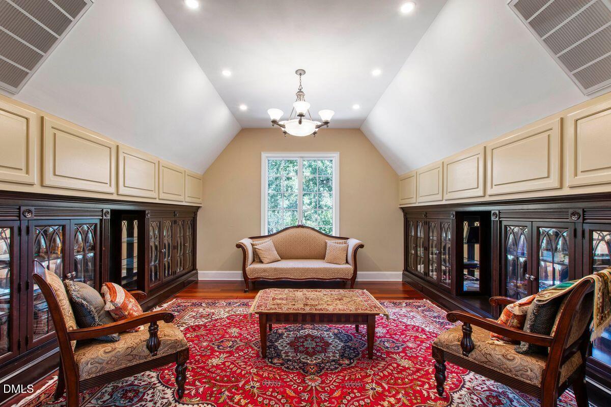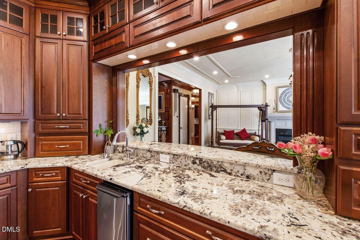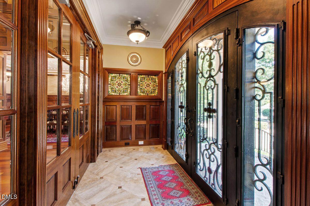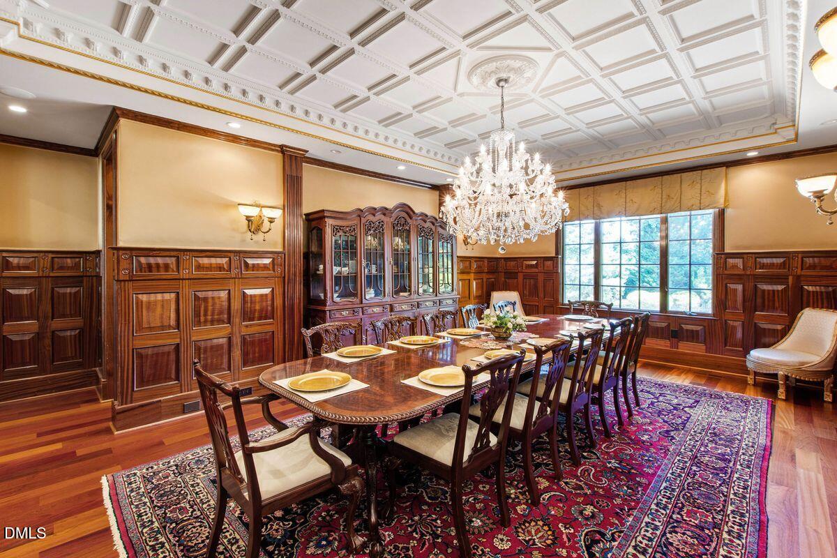 The formal dining room exemplifies this artistry with 18-carat gold leaf ceiling trim modeled after a historic downtown Cary landmark, mahogany wainscoting, padded silk wall coverings, and a 24-arm Italian crystal chandelier of nearly 1,200 individual pieces. Four gas fireplaces showcase unique surrounds of this home, from carved marble to stately limestone, adding warmth and distinction throughout.