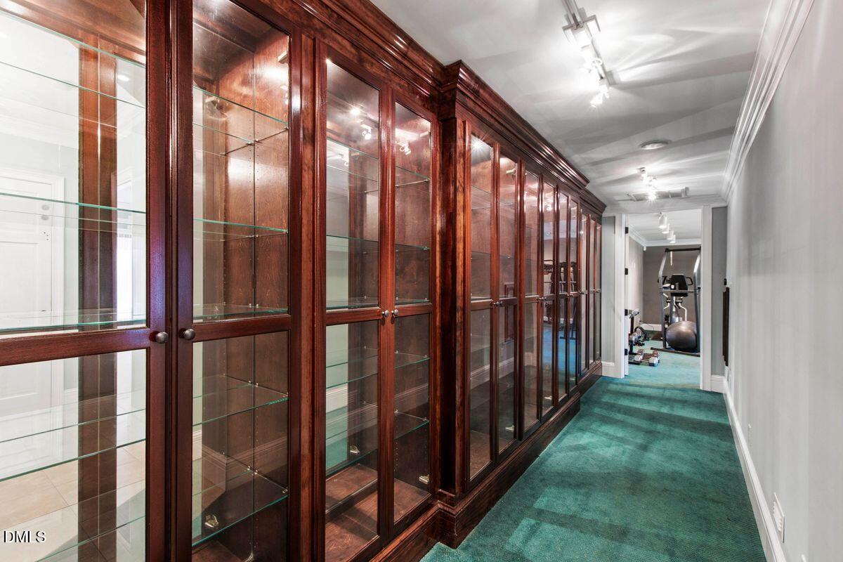 Entertainment and leisure are thoughtfully woven throughout: a pub room crafted from salvaged antique English bars, a billiards room with a coffered ceiling and a professional Gandy table, a home theater with daylight projection, a gym with golf course views, and a wine cellar with a tasting area--each space blending historic charm with modern convenience. An elevator large enough to transport a baby grand piano connects all four levels, while upper floors include versatile recreation and storage areas.