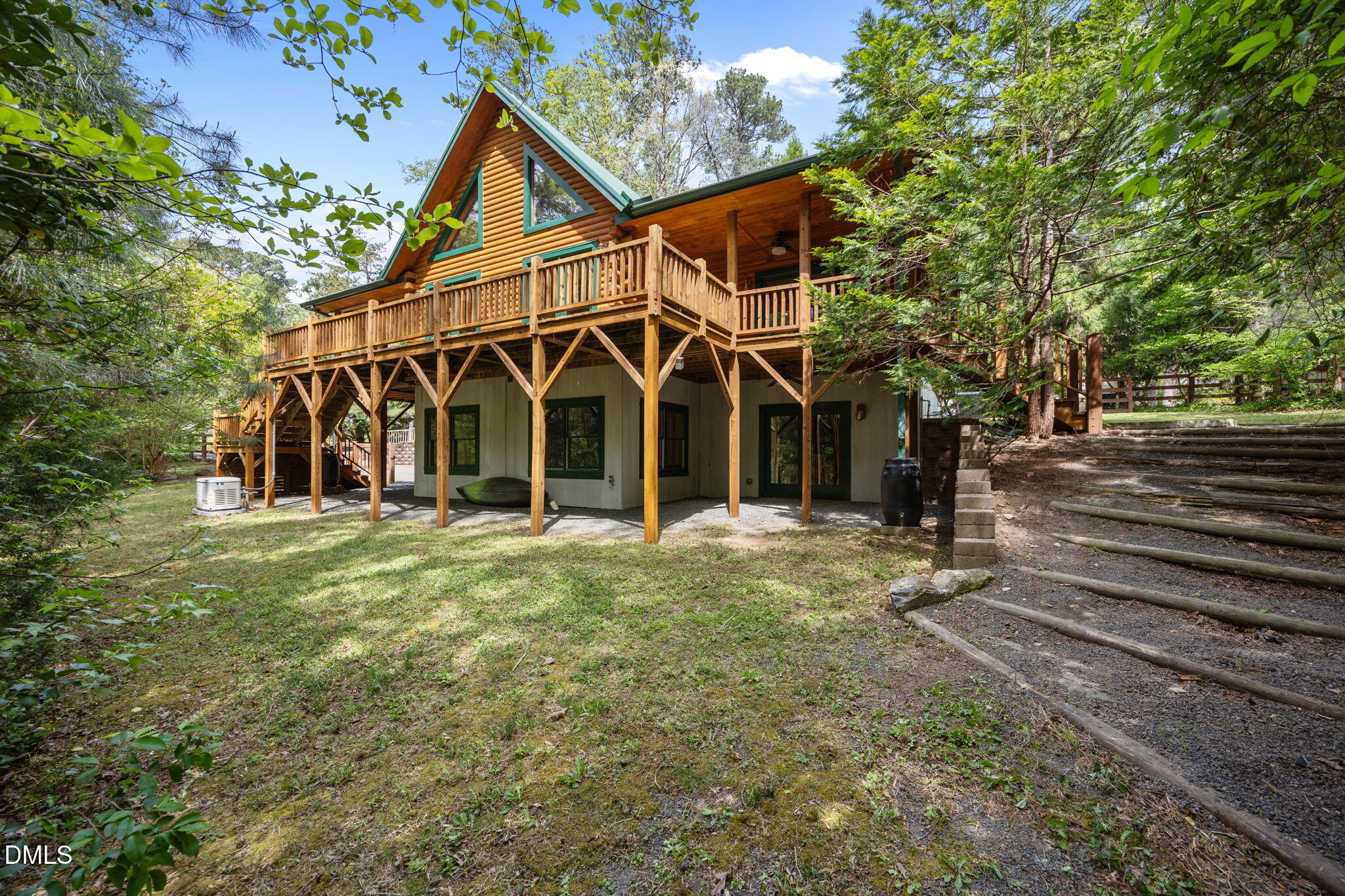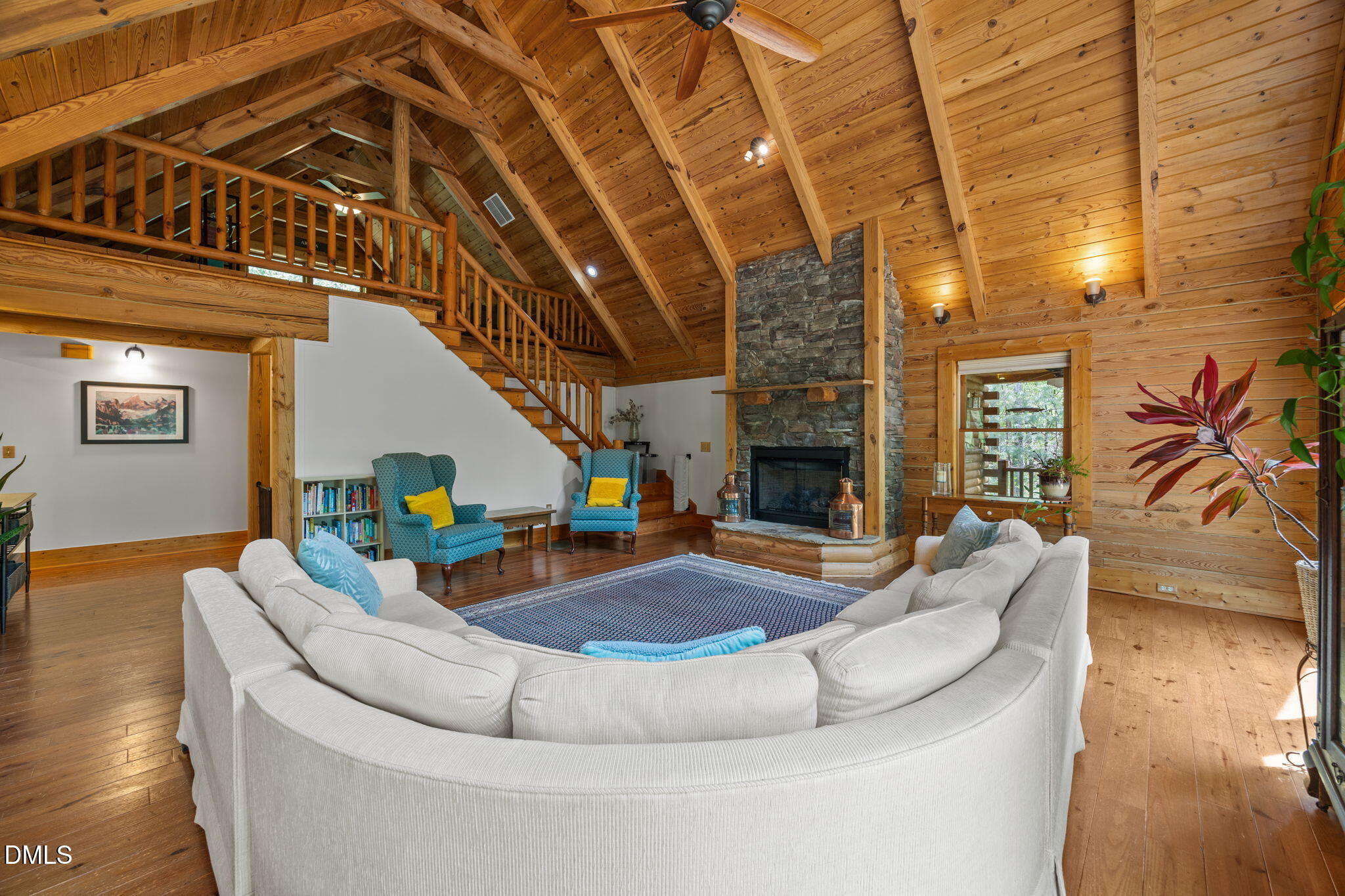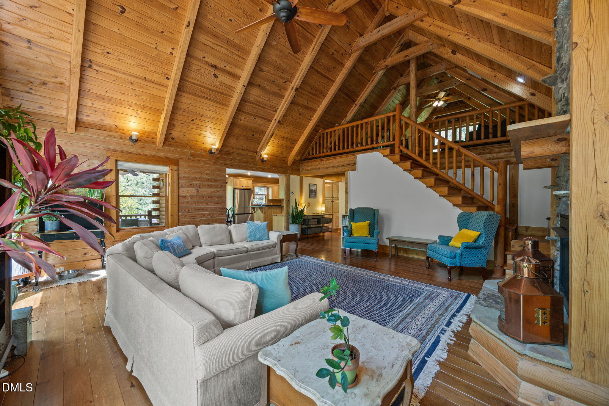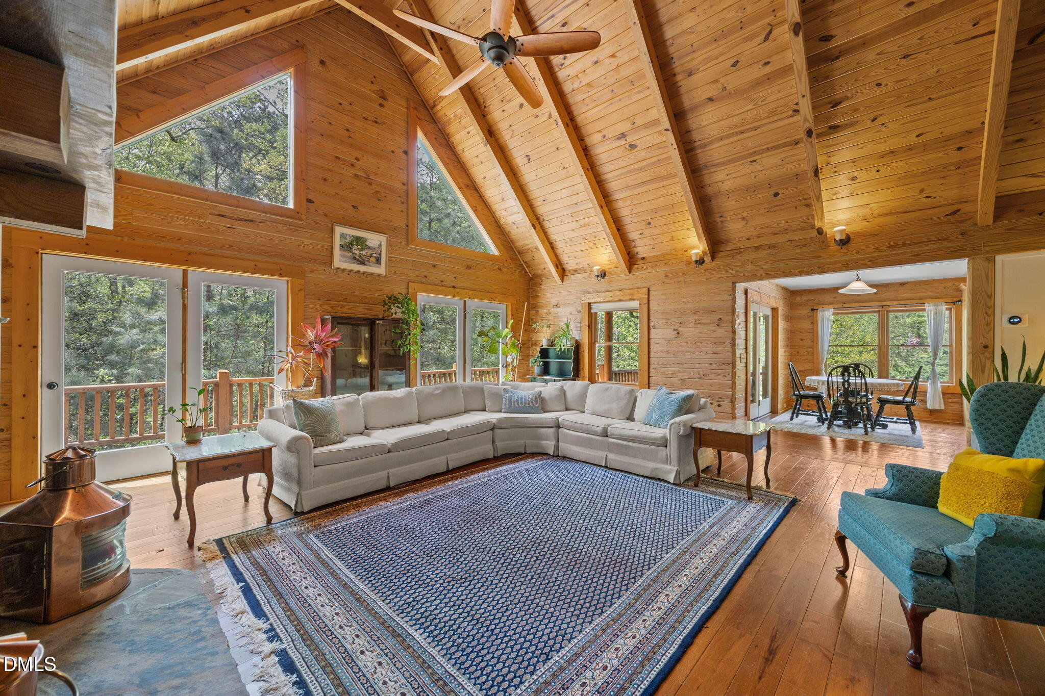 Tucked into a wonderful Durham neighborhood, this log home offers a rare blend of warmth, character, everyday convenience, and ample storage, featuring over 1,200 square feet of usable unfinished basement space. Natural light fills the home, highlighting the great room with soaring ceilings and comfortable bedrooms. A loft overlooking the main living area provides flexibility for a TV room, playroom, or home office. Surrounded by nature views and set in a desirable location, the home feels like a peaceful retreat while still being close to everything Durham has to offer, including the Eno River State Park and a brand new Publix grocery store. The lower level features a versatile, nearly finished studio that could serve as a soundproof music space, office, meditation room, or cozy hangout. A dedicated storage room and separate workshop add functionality, while the wraparound deck offers the perfect setting to relax or entertain outdoors. Do not miss this wonderful home that combines character, flexibility, and thoughtful design in a truly special setting.