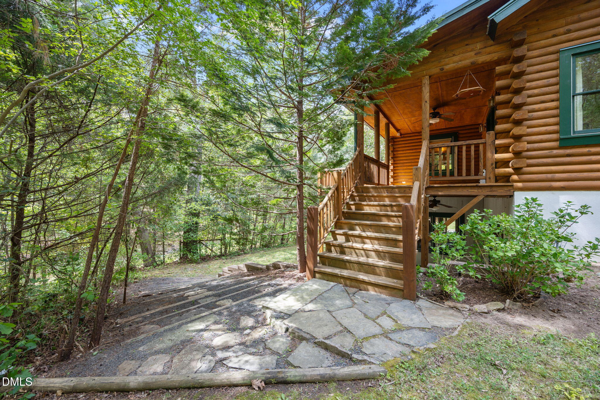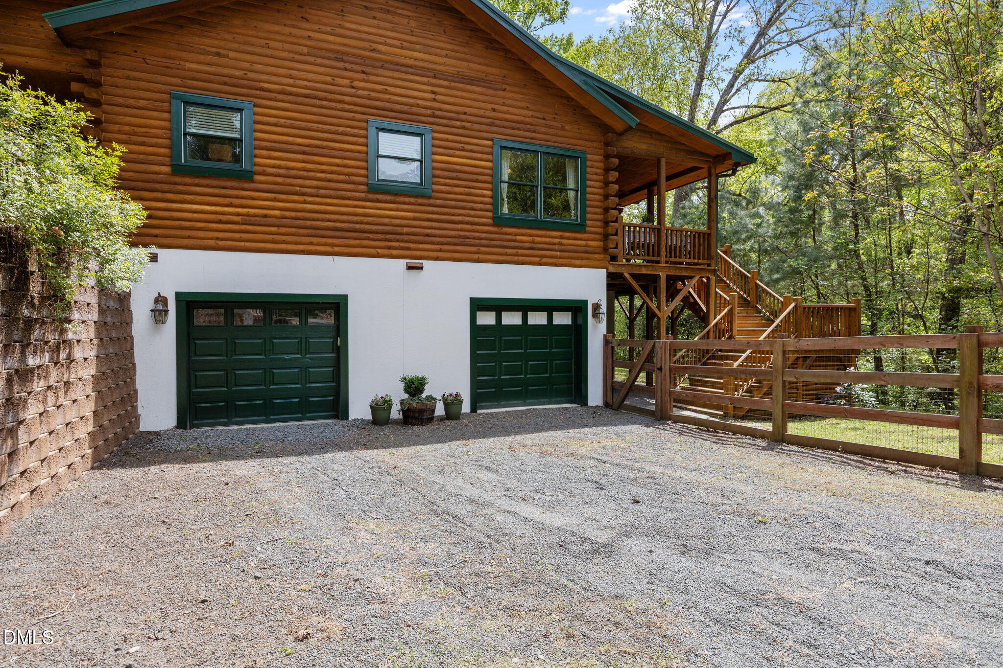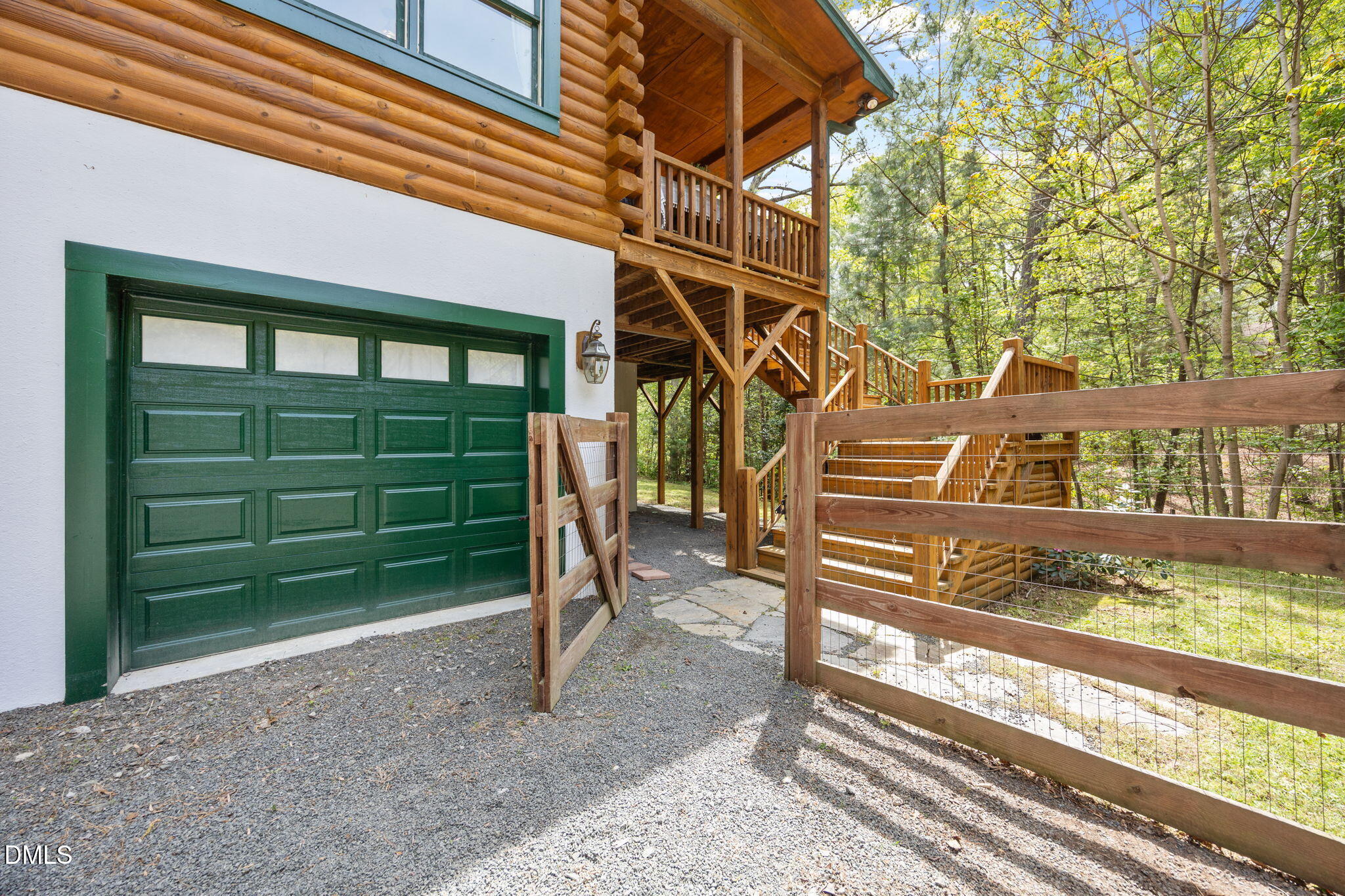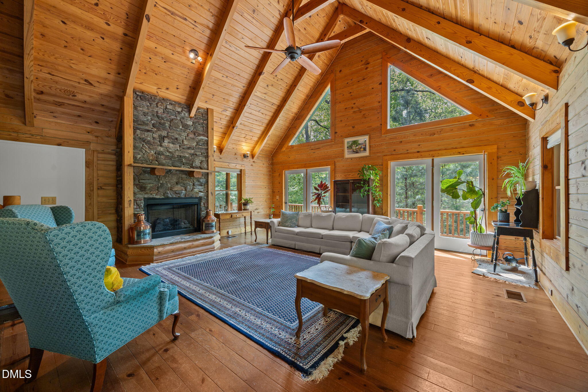 Tucked into a wonderful Durham neighborhood, this log home offers a rare blend of warmth, character, everyday convenience, and ample storage, featuring over 1,200 square feet of usable unfinished basement space. Natural light fills the home, highlighting the great room with soaring ceilings and comfortable bedrooms. A loft overlooking the main living area provides flexibility for a TV room, playroom, or home office. Surrounded by nature views and set in a desirable location, the home feels like a peaceful retreat while still being close to everything Durham has to offer, including the Eno River State Park and a brand new Publix grocery store. The lower level features a versatile, nearly finished studio that could serve as a soundproof music space, office, meditation room, or cozy hangout. A dedicated storage room and separate workshop add functionality, while the wraparound deck offers the perfect setting to relax or entertain outdoors. Do not miss this wonderful home that combines character, flexibility, and thoughtful design in a truly special setting.