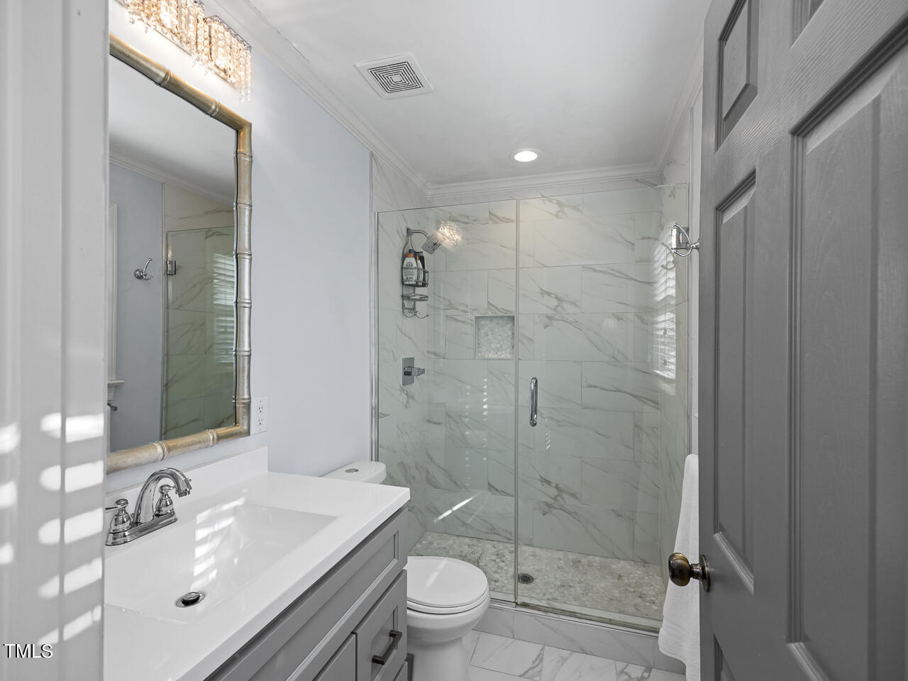 Welcome to perfection - classic, white brick ranch set back off the street in desirable Meredith Woods subdivision resting on flat, fully fenced yard! Immediately upon entry, you'll notice this light filled open floorplan. To the right, a spacious and open concept completely updated in 2019. The kitchen boasts granite countertops, painted white cabinetry with gold accents, stainless appliances and built in bistro perfect for hosting guests. To the left of the entry, an entire bedroom wing maximizing privacy. Large owner's suite opens into updated bathroom with new vanity, tiled shower with frameless glass walk-in shower. Three guest rooms all boast generous measurements and share updated guest bathroom with bright, white tile. Main living area opens to private deck and hardscaped grilling patio. Detached shed for plenty of storage solutions. With 2022 HVAC and 2019 roof and windows, the major expenses have been taken care of! All within walking distance to neighborhood pool/dog park, Laurel Hills and Glen Eden Parks, and greenway trails. Close proximity to highways, shopping, dining, Art Museum and UNC Rex Hospitals. 3137 Merrianne proves you can have it all!