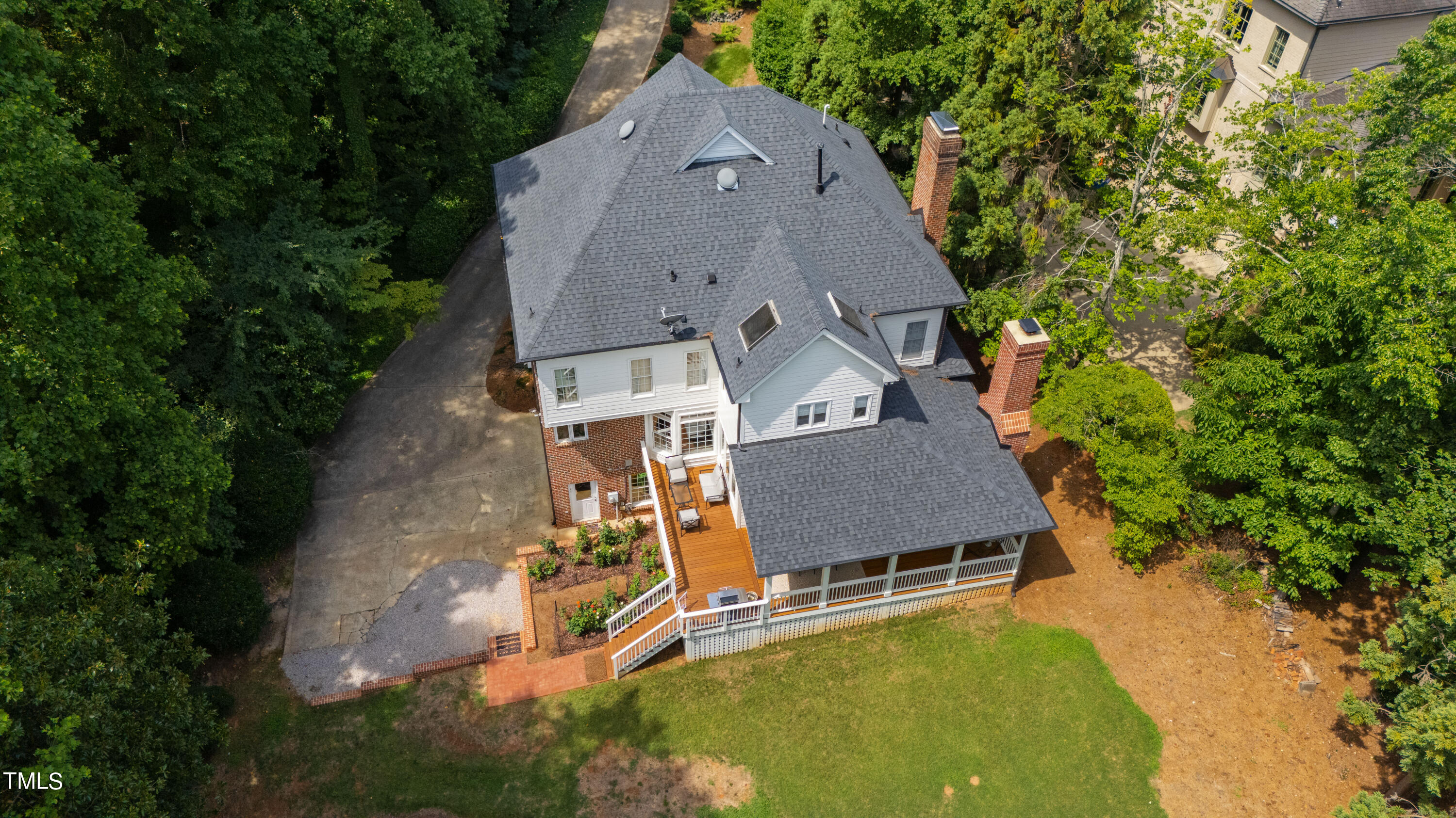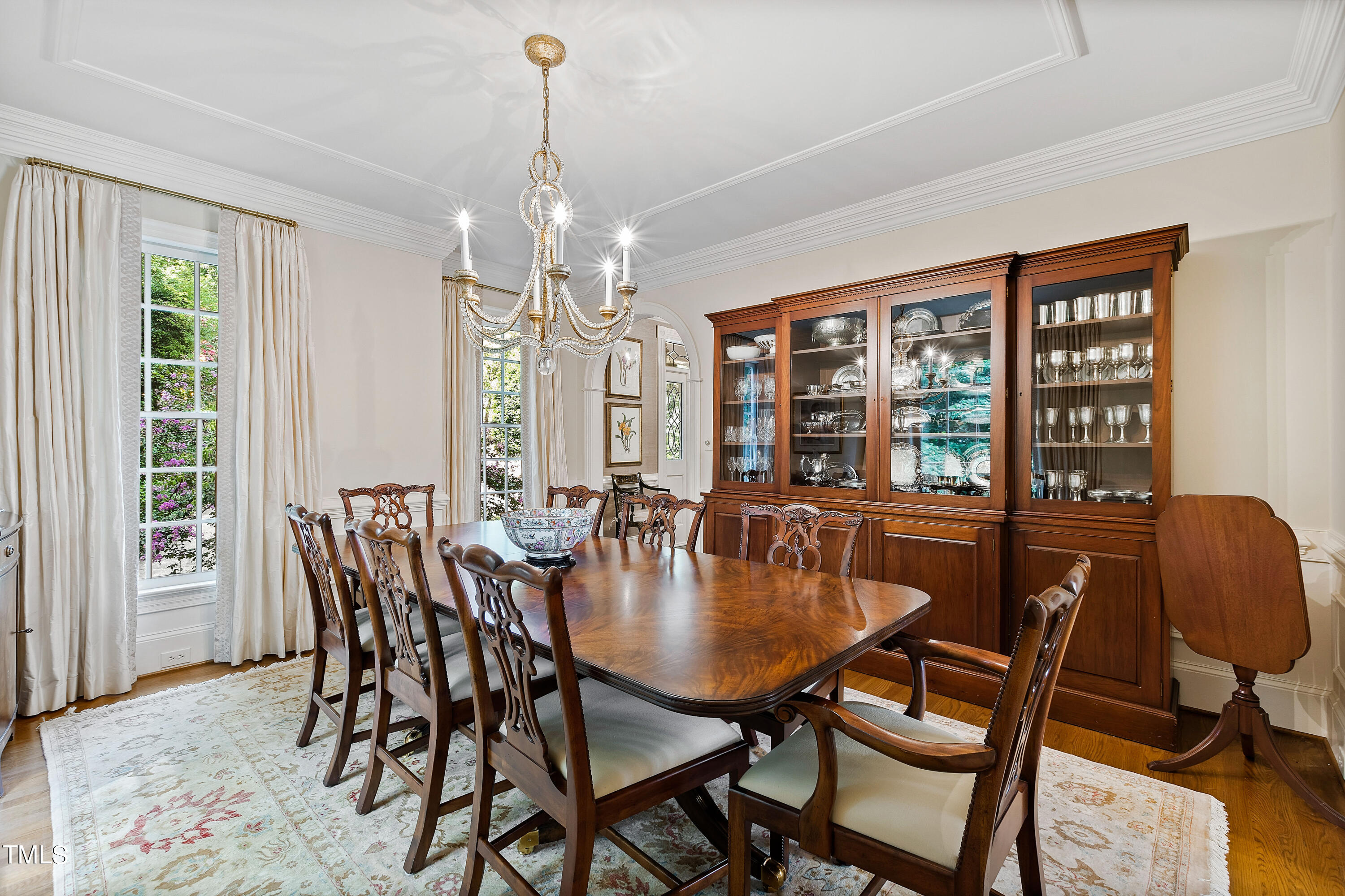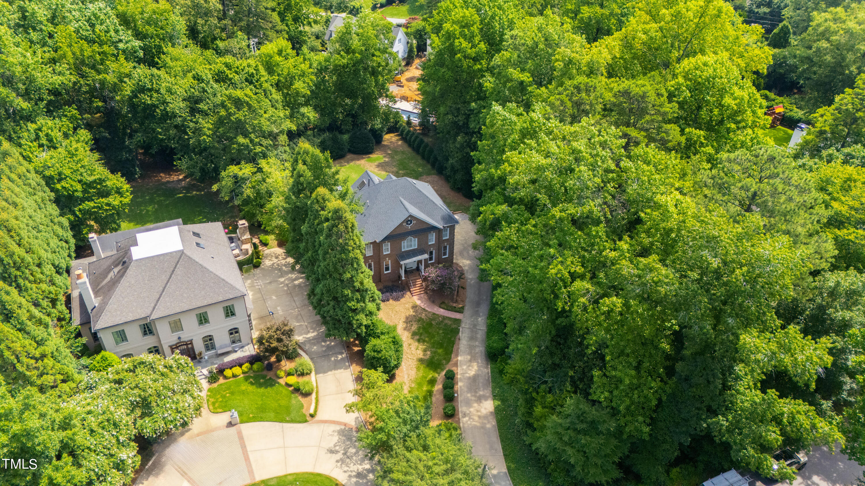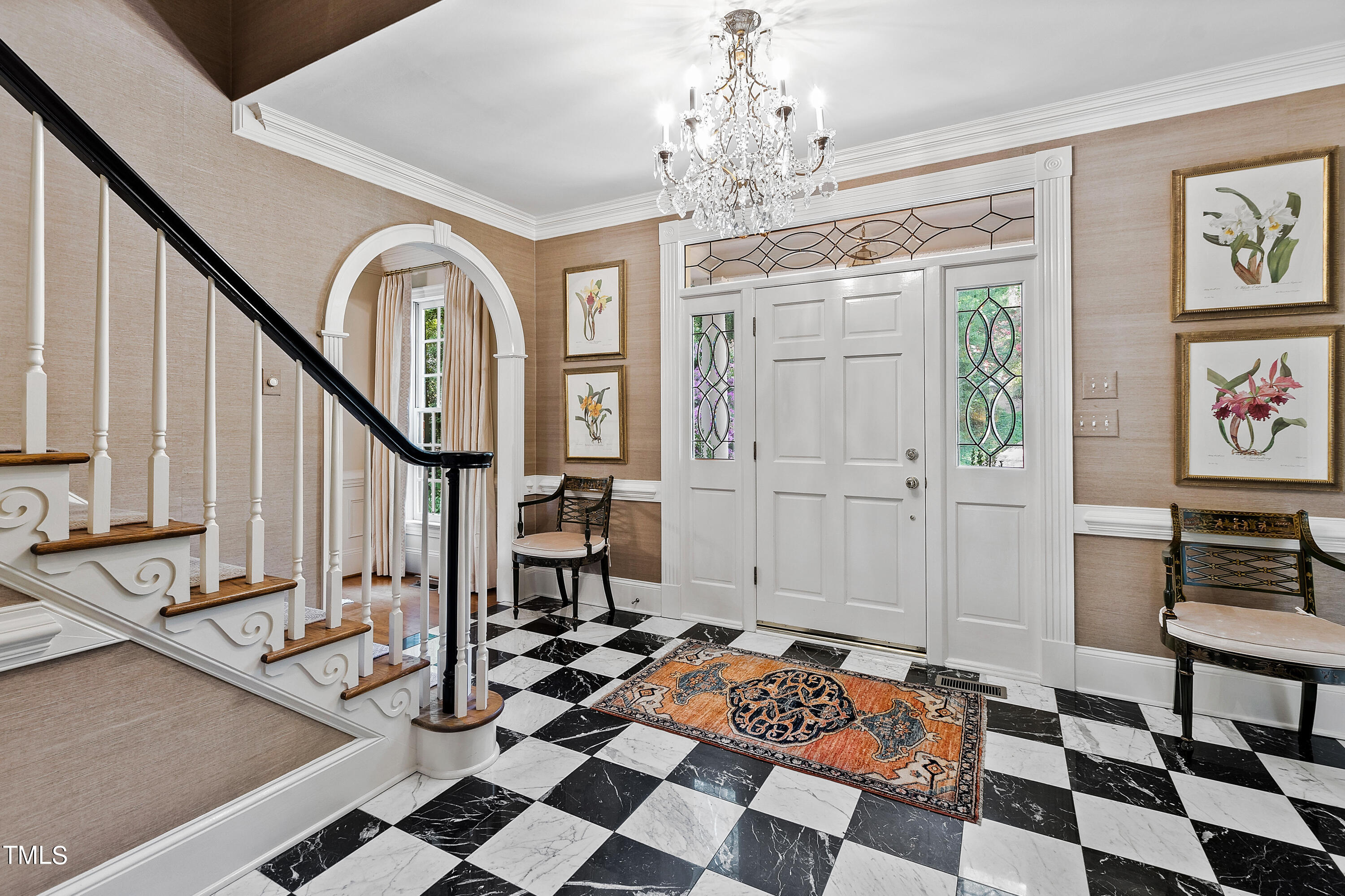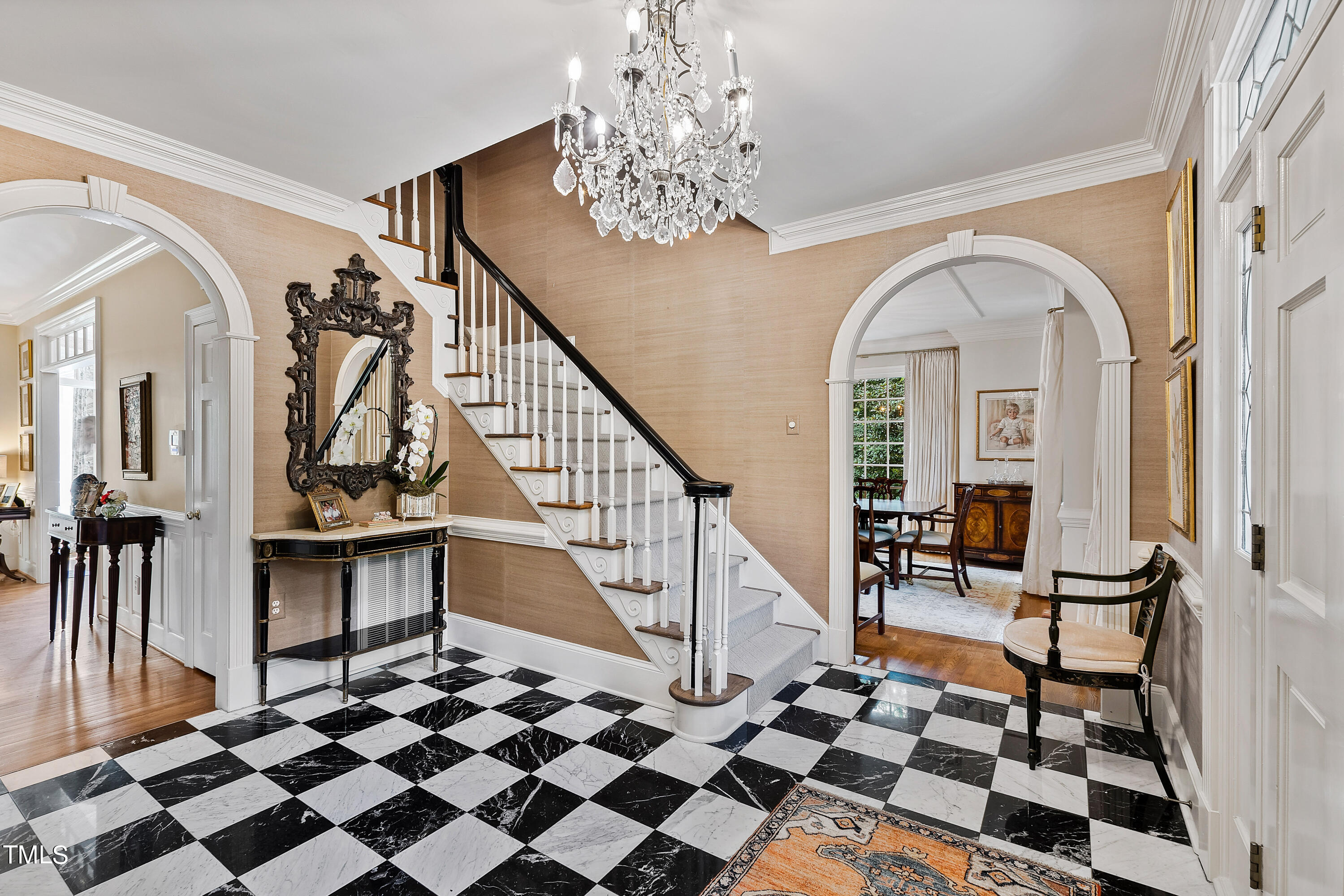 Perfectly situated on a large .69-acre lot in the heart of Country Club Hills, one of Raleigh's most beautiful neighborhoods, this stately Georgian brick home is a perfect combination of timeless architecture and modern amenities. Leaded-glass side lights and transom surround the front door welcoming its guests to a stunning, marble-floored foyer with an understated elegance. The formal living/library and dining rooms flanking the grand entryway offer beautiful entertaining spaces while the comfortable family room and sunroom provide cozy spaces for family events. Nine-ft. ceilings on both levels add to the warm, classic style of the home. One of the highlights is the covered porch which spans the entire rear of the home and features a masonry, wood-burning fireplace and built-in ceiling heaters for enjoying cool fall evenings. The second level boasts four graciously-sized bedrooms including a primary suite with vaulted ceilings, huge walk-in closet and luxurious bath. A lower-level bonus room offers a myriad of possibilities...theater room, home office or recreation room. Two-car garage with large storage room. Over 650+ square feet of unfinished space in the walk-up attic is great for easy-access storage or future expansion. Enjoy a convenient location equidistant to great shopping centers...North Hills, The Village District and Crabtree Valley Mall. Also, a quick trip to the Greenway, Root Elementary and St. David's School.