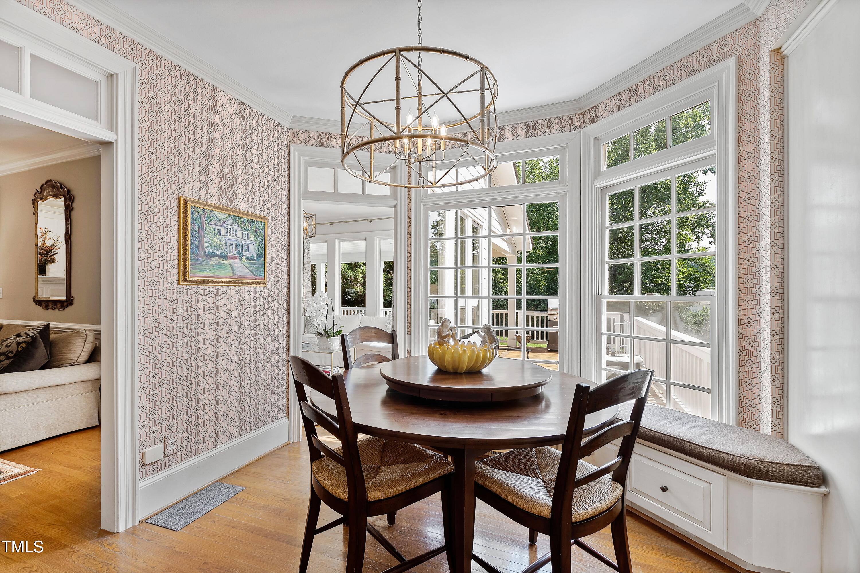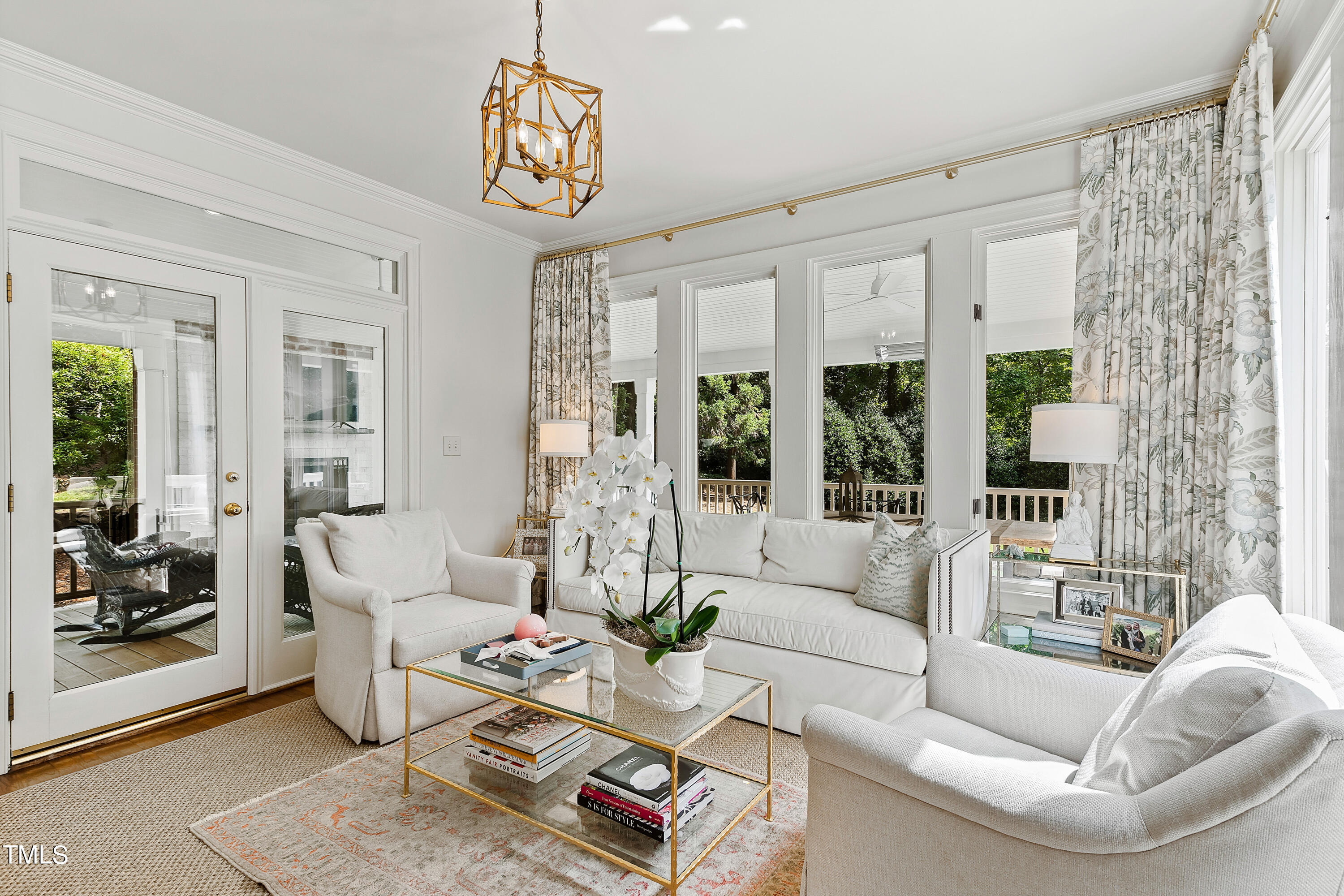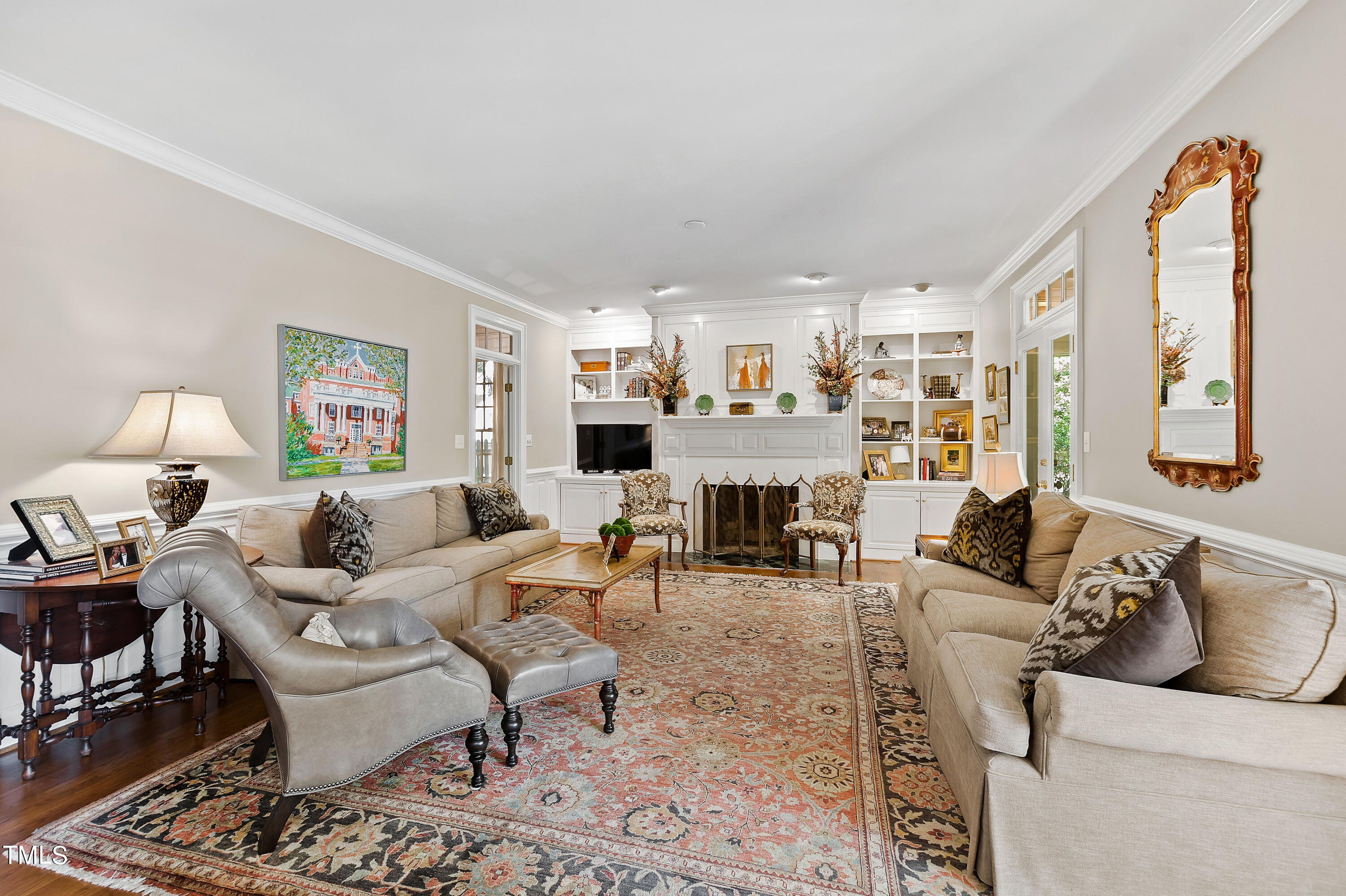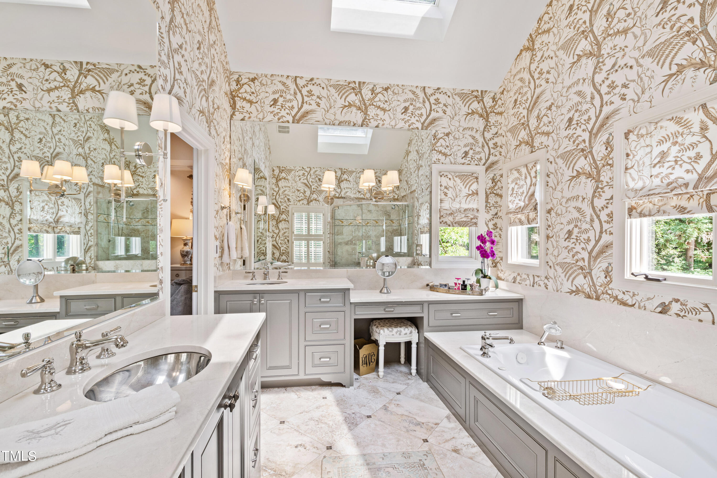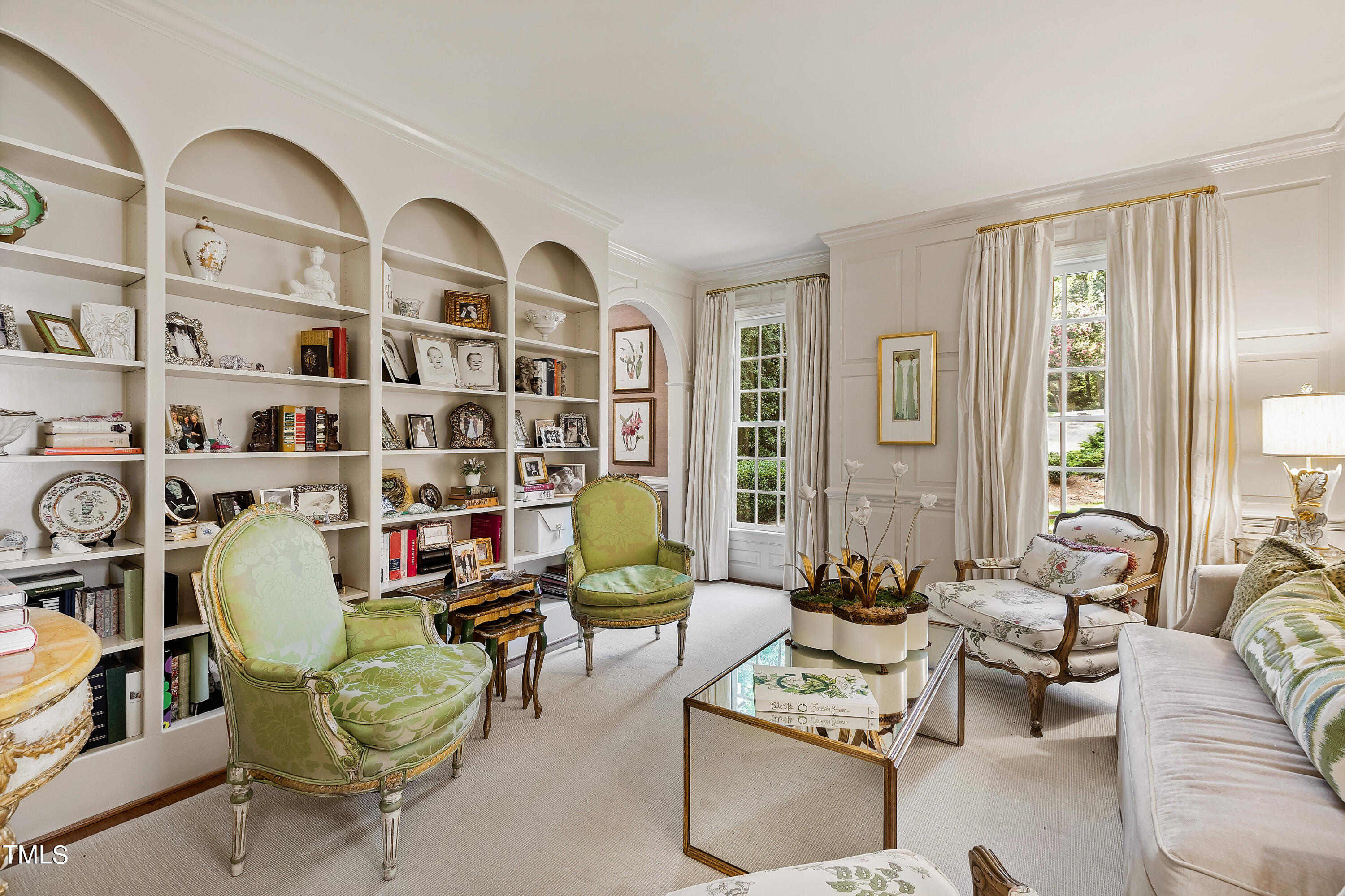 Perfectly situated on a large .69-acre lot in the heart of Country Club Hills, one of Raleigh's most beautiful neighborhoods, this stately Georgian brick home is a perfect combination of timeless architecture and modern amenities. Leaded-glass side lights and transom surround the front door welcoming its guests to a stunning, marble-floored foyer with an understated elegance. The formal living/library and dining rooms flanking the grand entryway offer beautiful entertaining spaces while the comfortable family room and sunroom provide cozy spaces for family events. Nine-ft. ceilings on both levels add to the warm, classic style of the home. One of the highlights is the covered porch which spans the entire rear of the home and features a masonry, wood-burning fireplace and built-in ceiling heaters for enjoying cool fall evenings. The second level boasts four graciously-sized bedrooms including a primary suite with vaulted ceilings, huge walk-in closet and luxurious bath. A lower-level bonus room offers a myriad of possibilities...theater room, home office or recreation room. Two-car garage with large storage room. Over 650+ square feet of unfinished space in the walk-up attic is great for easy-access storage or future expansion. Enjoy a convenient location equidistant to great shopping centers...North Hills, The Village District and Crabtree Valley Mall. Also, a quick trip to the Greenway, Root Elementary and St. David's School.