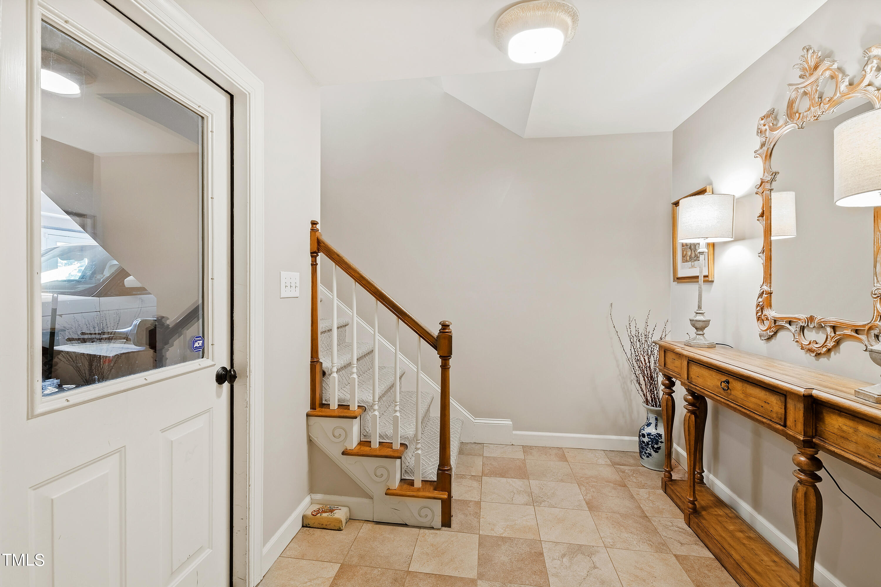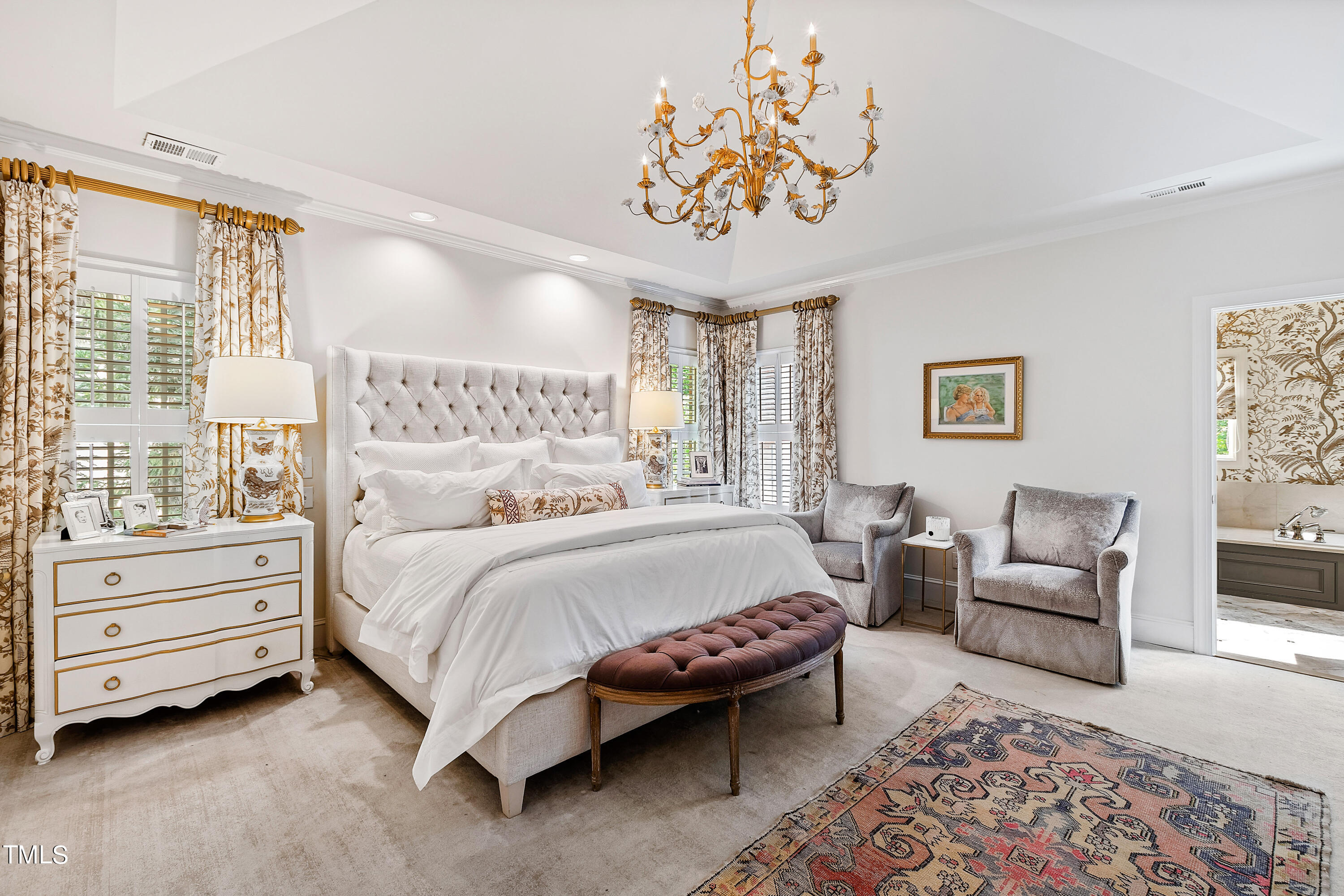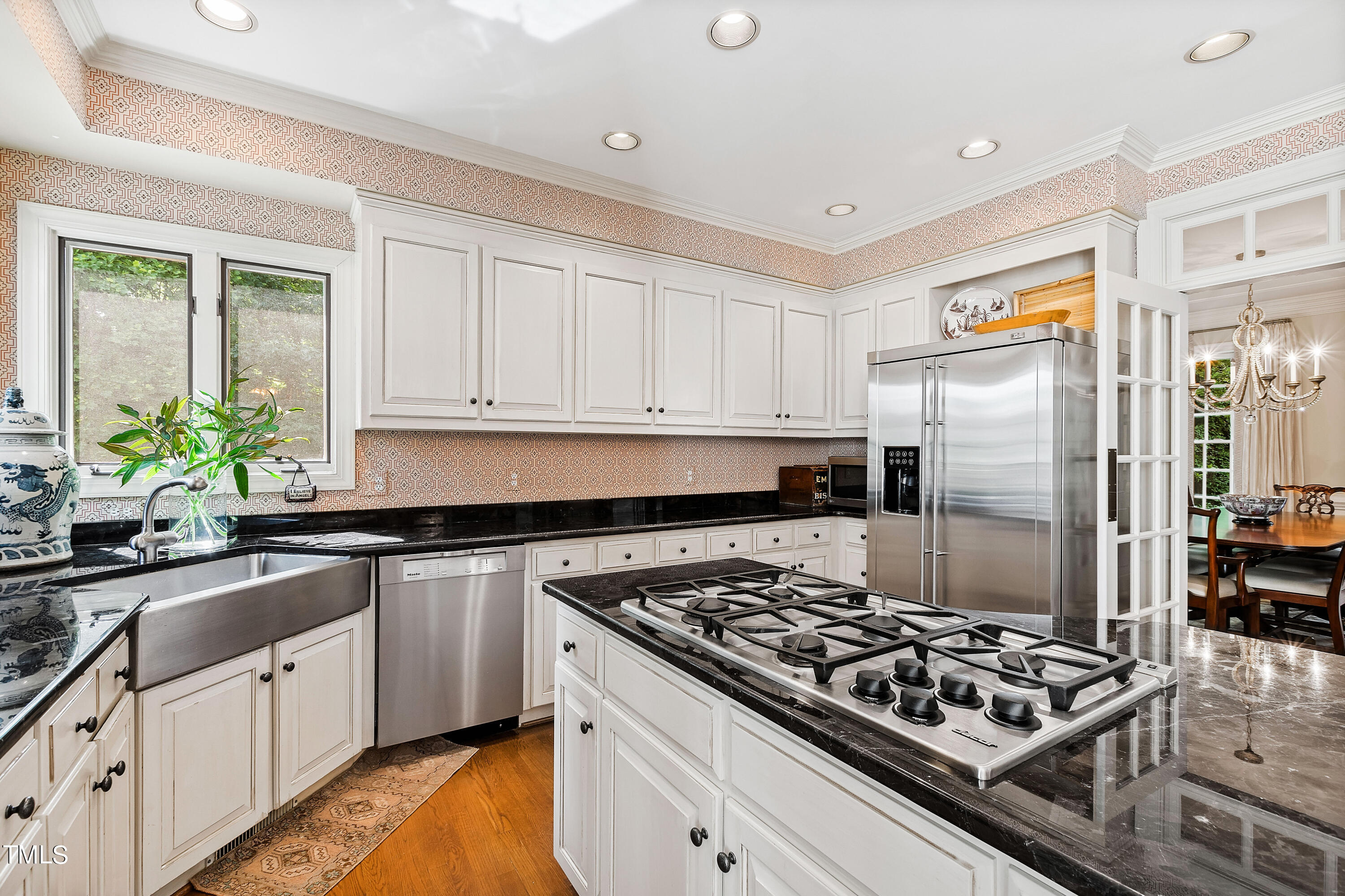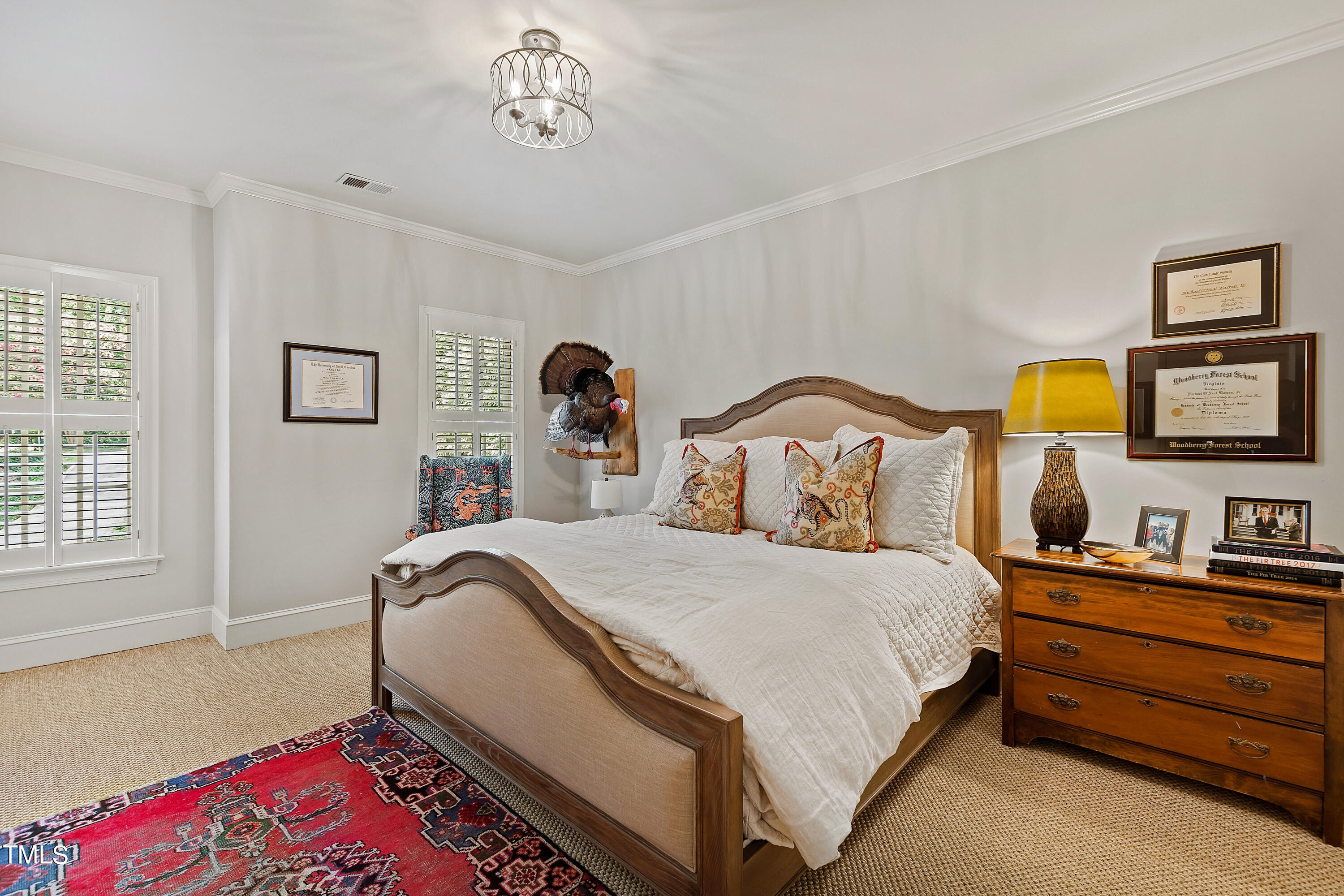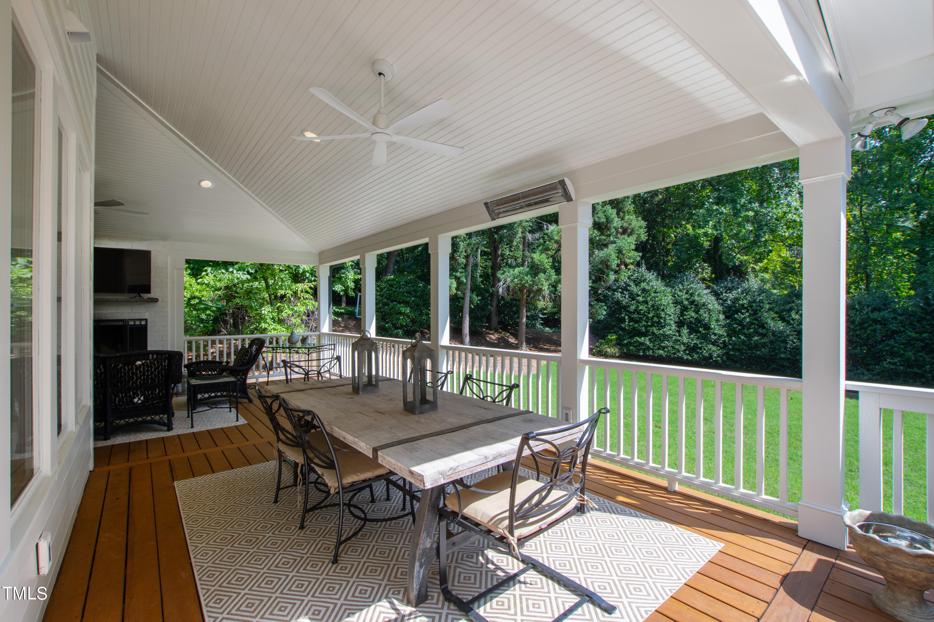 Perfectly situated on a large .69-acre lot in the heart of Country Club Hills, one of Raleigh's most beautiful neighborhoods, this stately Georgian brick home is a perfect combination of timeless architecture and modern amenities. Leaded-glass side lights and transom surround the front door welcoming its guests to a stunning, marble-floored foyer with an understated elegance. The formal living/library and dining rooms flanking the grand entryway offer beautiful entertaining spaces while the comfortable family room and sunroom provide cozy spaces for family events. Nine-ft. ceilings on both levels add to the warm, classic style of the home. One of the highlights is the covered porch which spans the entire rear of the home and features a masonry, wood-burning fireplace and built-in ceiling heaters for enjoying cool fall evenings. The second level boasts four graciously-sized bedrooms including a primary suite with vaulted ceilings, huge walk-in closet and luxurious bath. A lower-level bonus room offers a myriad of possibilities...theater room, home office or recreation room. Two-car garage with large storage room. Over 650+ square feet of unfinished space in the walk-up attic is great for easy-access storage or future expansion. Enjoy a convenient location equidistant to great shopping centers...North Hills, The Village District and Crabtree Valley Mall. Also, a quick trip to the Greenway, Root Elementary and St. David's School.