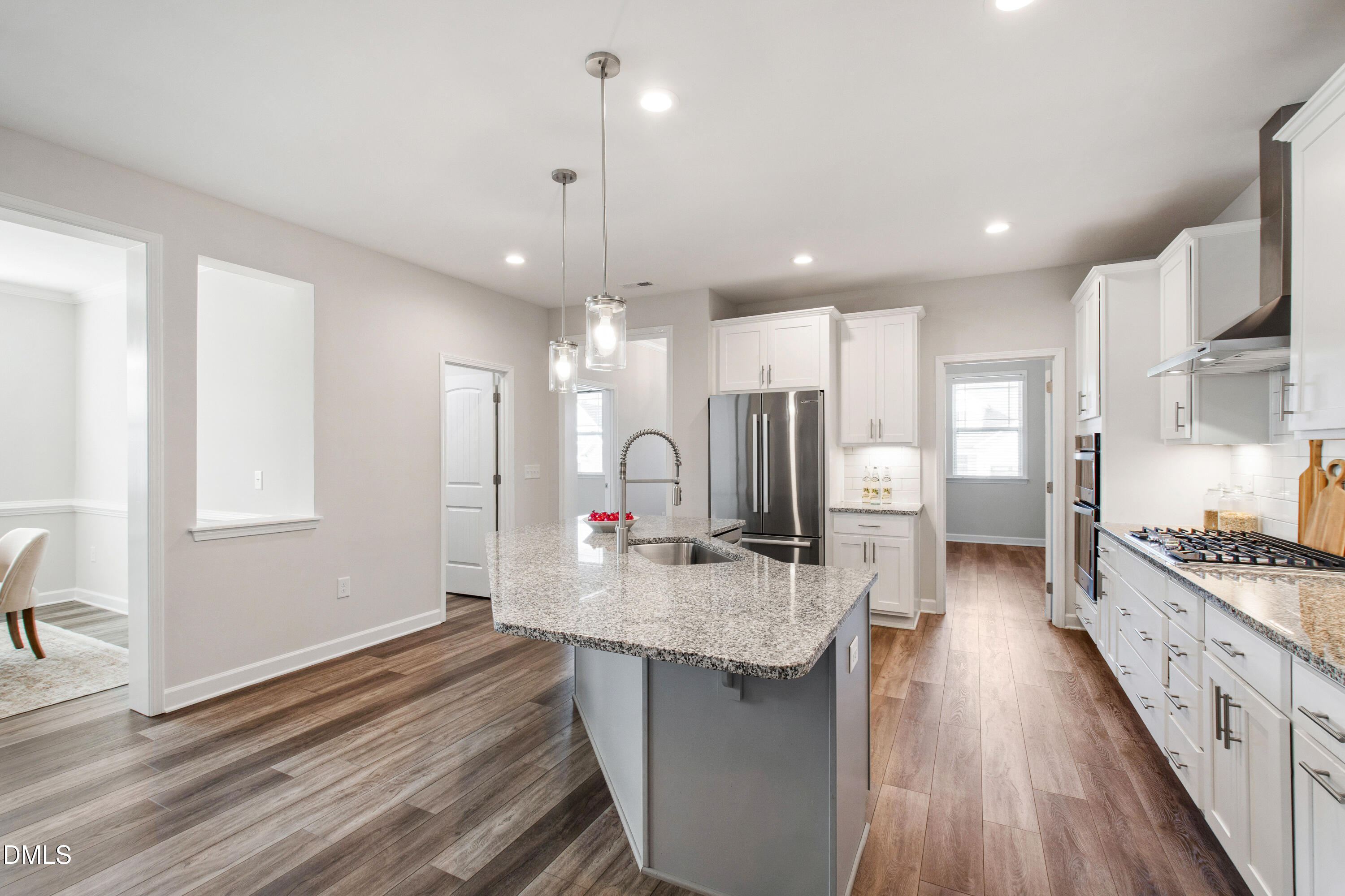 A welcoming covered front porch opens into a bright, open layout designed for modern living. The kitchen serves as the heart of the home and features built-in appliances, subway tile backsplash, a large stainless steel sink basin, a walk-in pantry, and a five burner gas range. The seamless flow into the main living area and separate dining room creates an ideal setting for everyday comfort and effortless entertaining.
