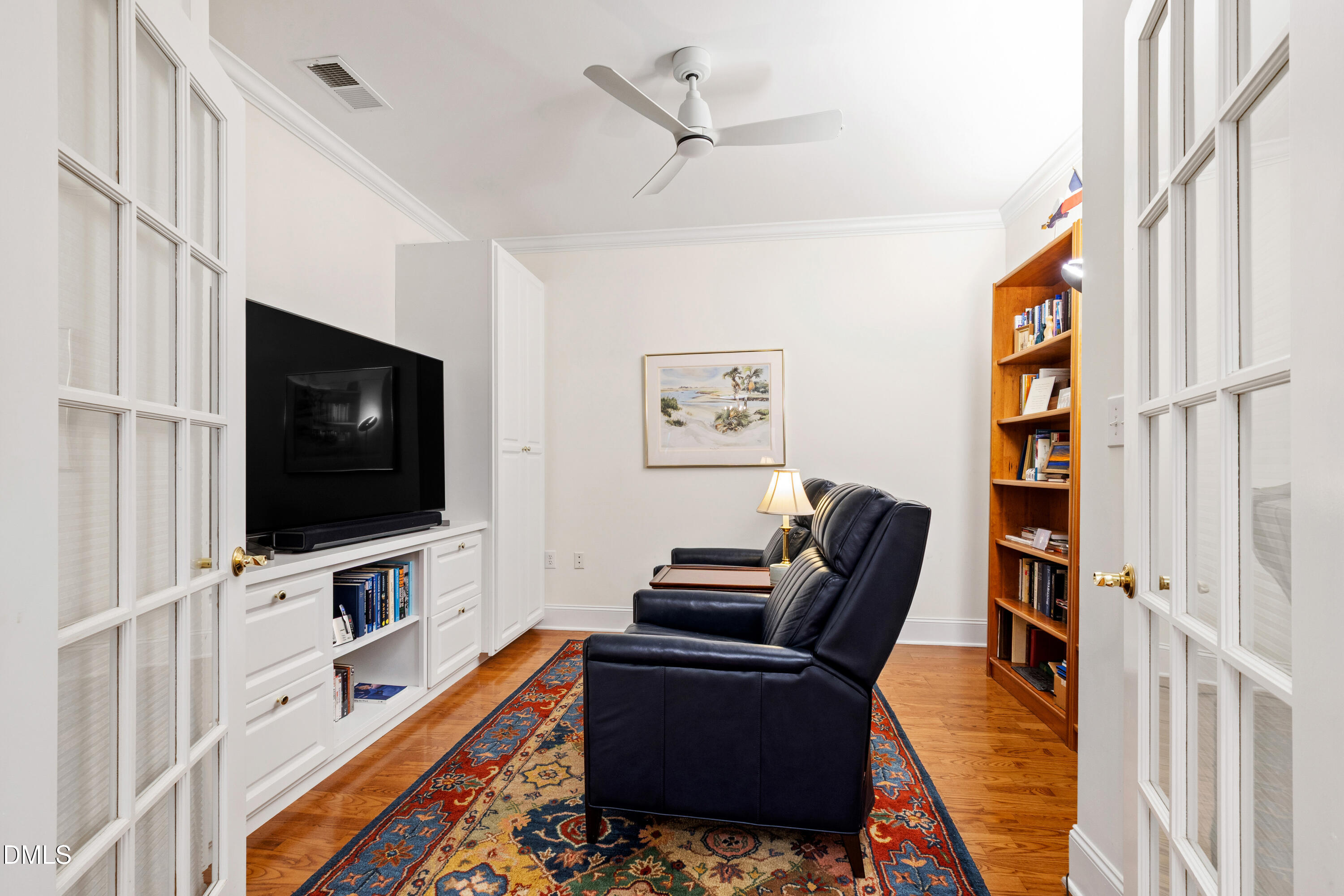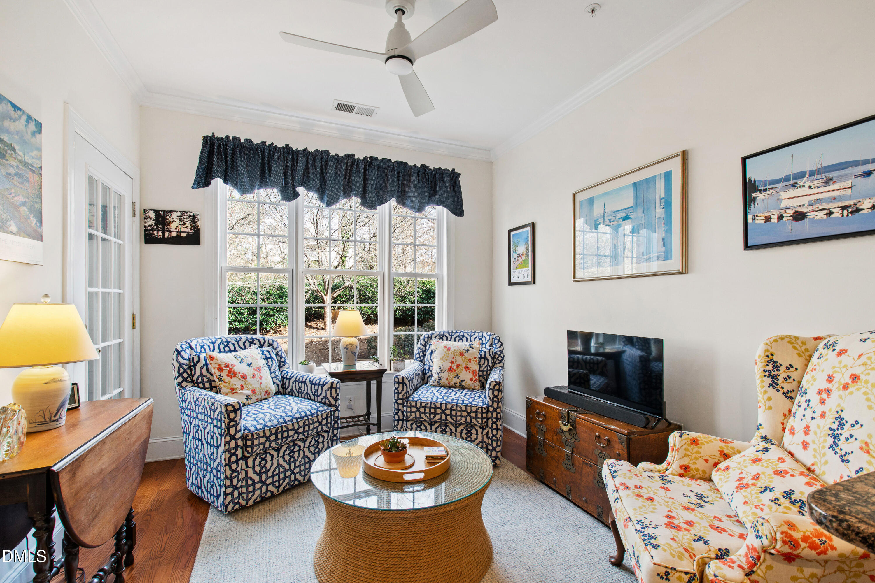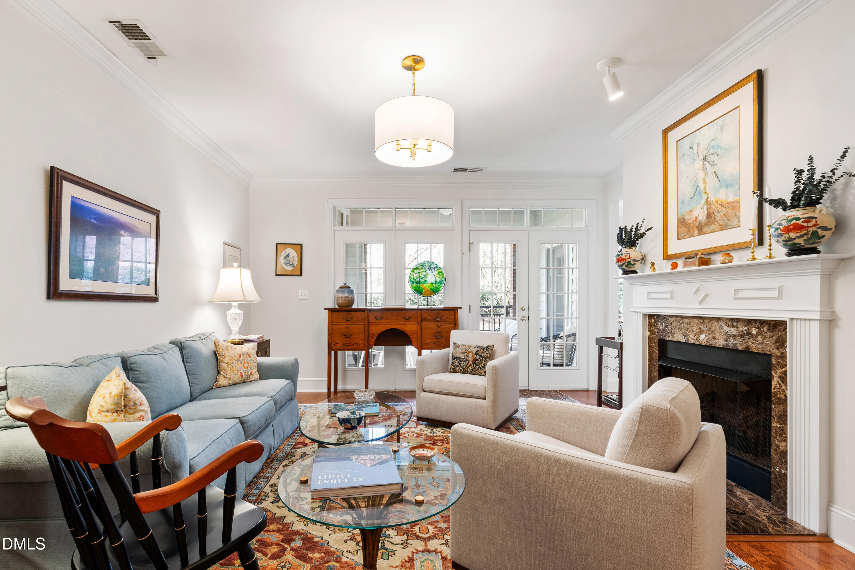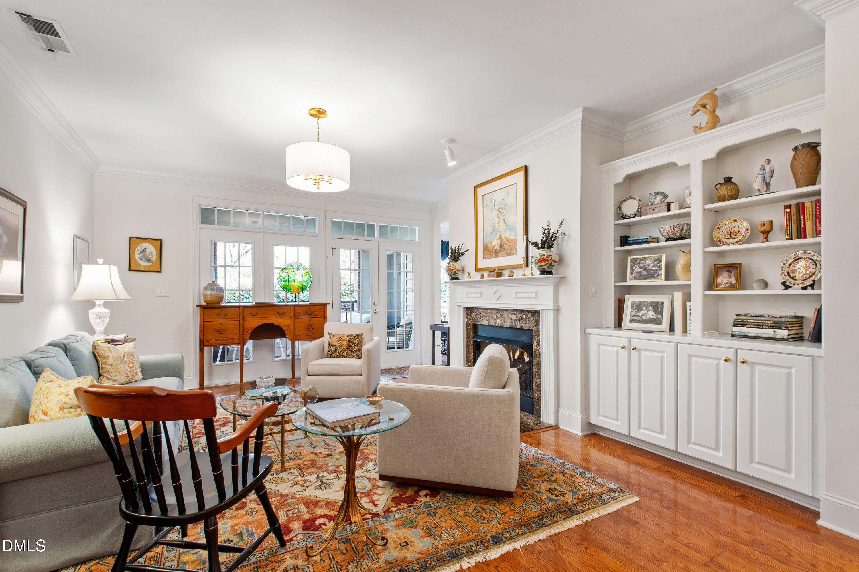 Elegant and thoughtfully designed, this residence at Olde Raleigh Commons offers a classic two-bedroom floor plan paired with true lock-and-leave ease. A gracious living area with transomed windows, a gas log fireplace, custom built-ins, and hardwood flooring opens seamlessly to the formal dining room--ideal for both everyday living and entertaining. Freshly painted in a soft alabaster palette, the interiors feel light, timeless, and refined. 2023:HVAC and on demand water heater, new ceiling fans and lighting, new custom cabinetry in flex room.