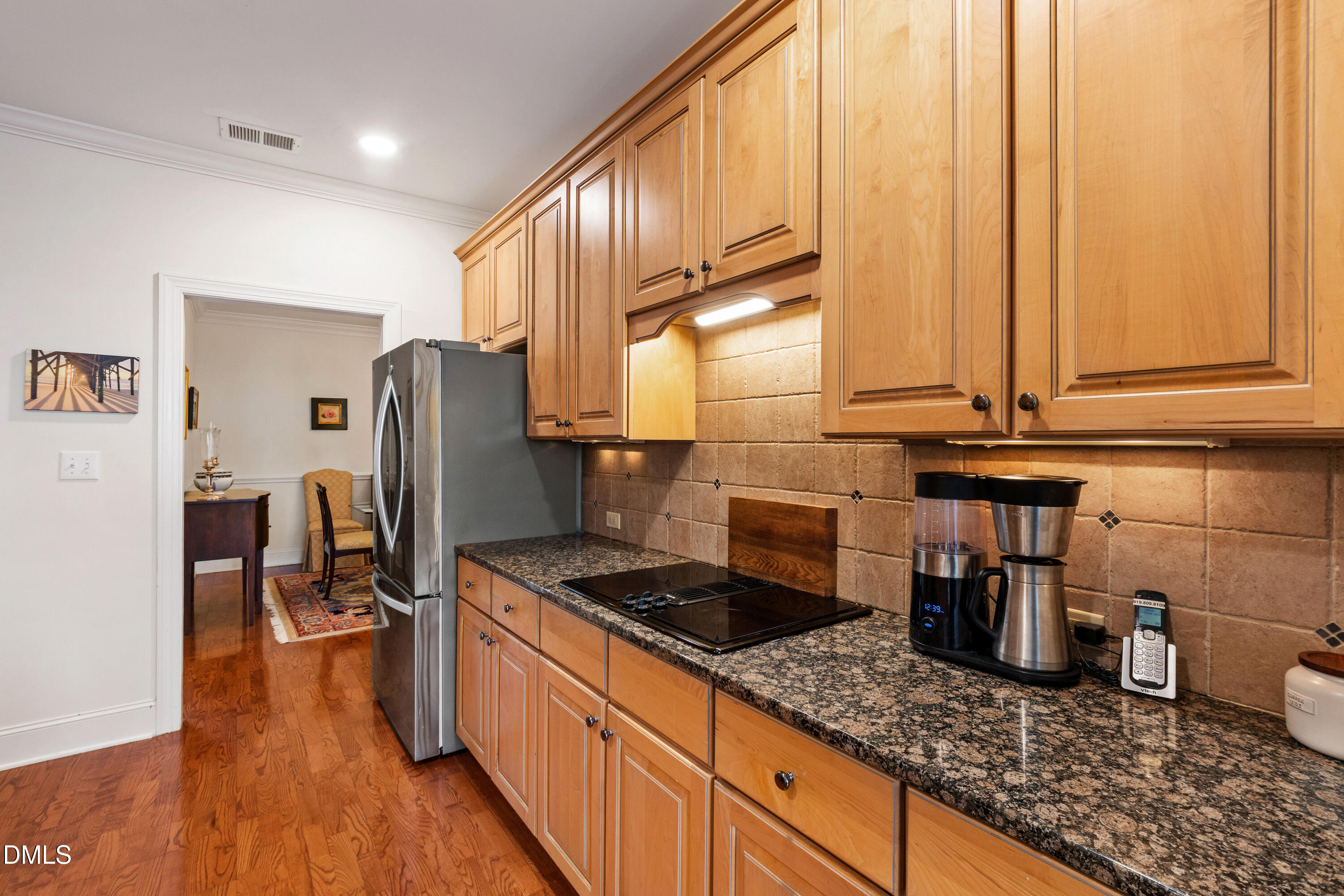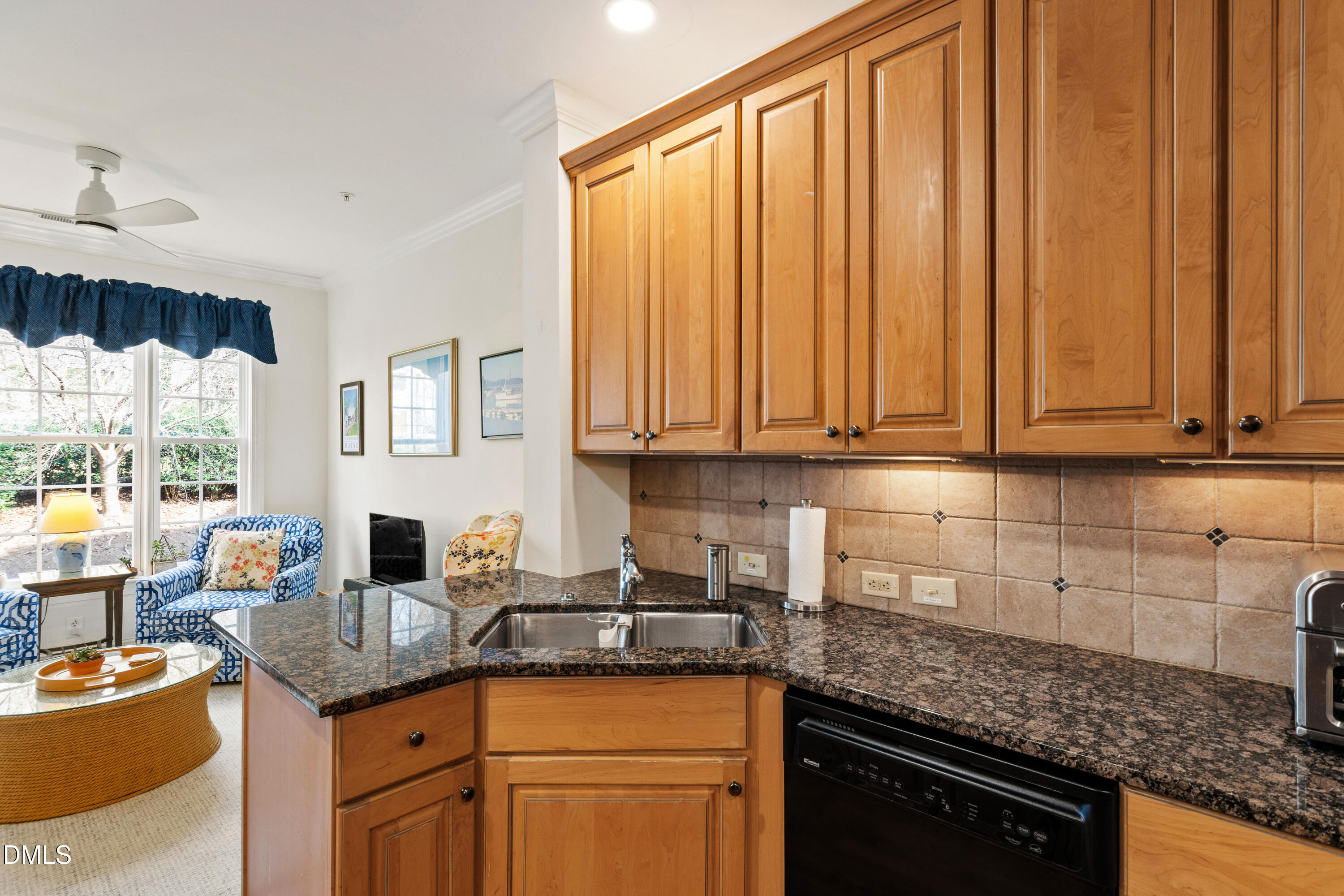 Just off the foyer, a flexible office or sitting room with French doors provides versatility for today's lifestyle. The kitchen features granite countertops, newer stainless steel appliances, abundant cabinetry, and a pantry, while the adjoining breakfast area enjoys views of landscaped grounds and direct access to the covered porch--perfect for morning coffee or evening unwinding.