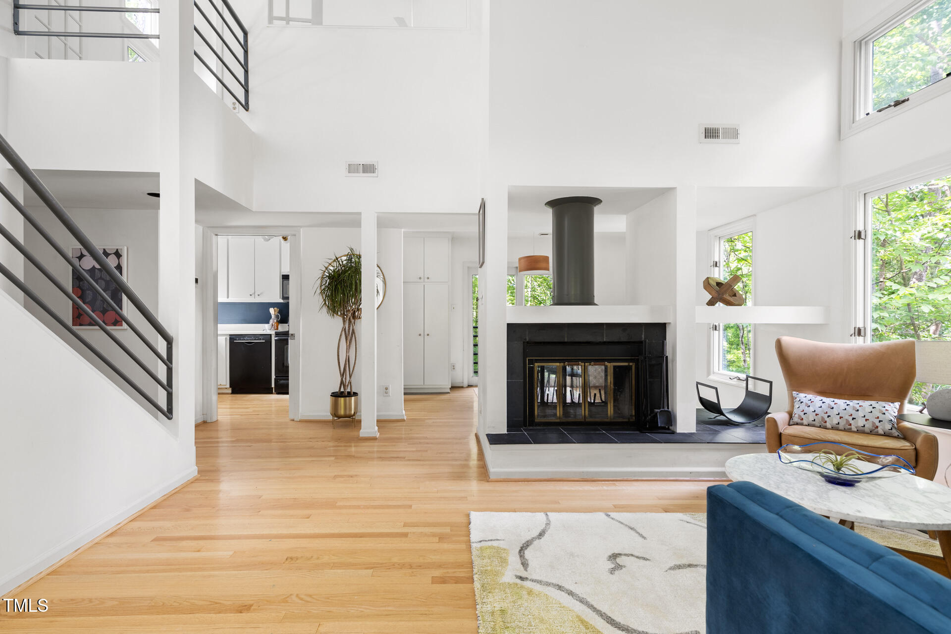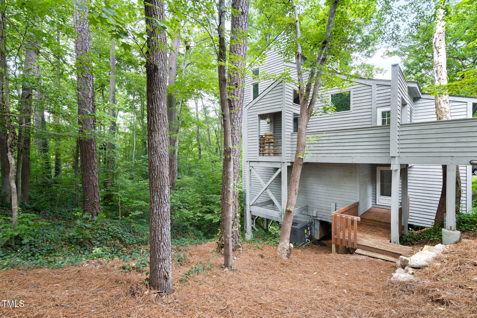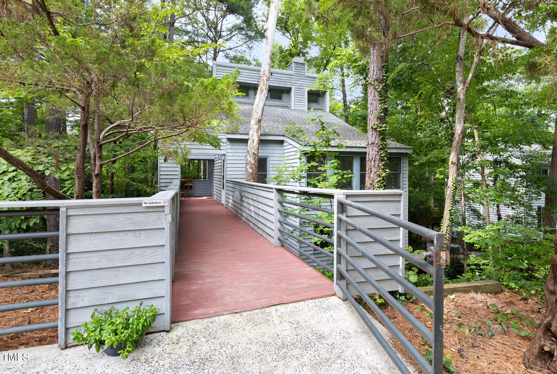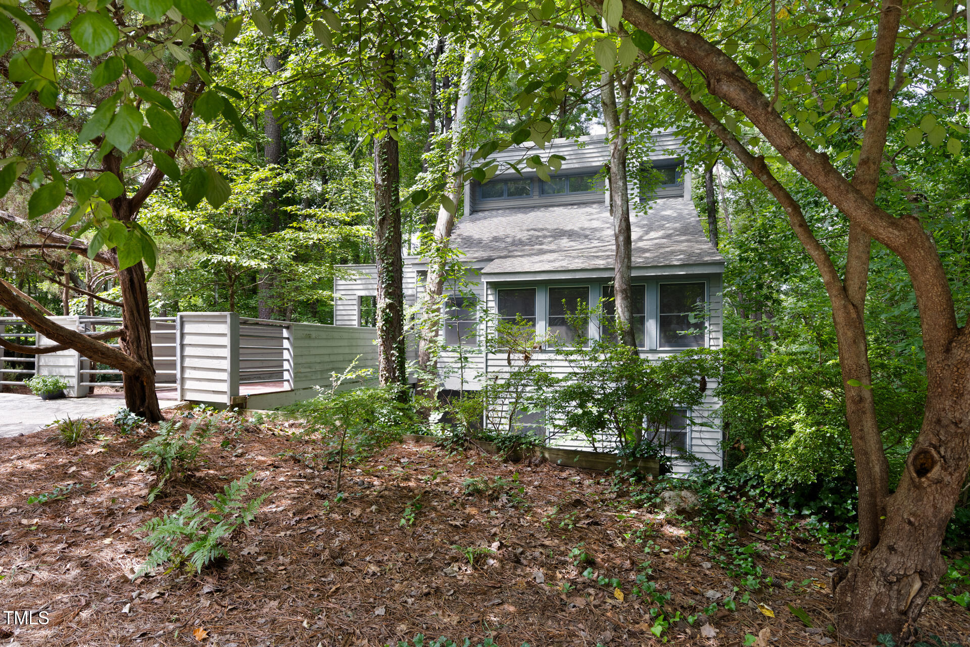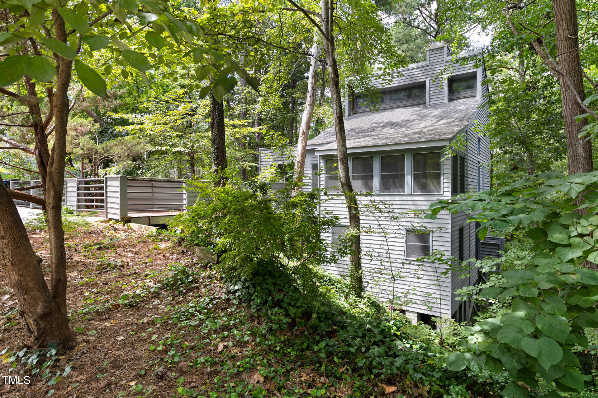 This modern home joins Carolina contemporary style with treehouse living, in a charming SW Durham community. Bill Waddell designed, the Michael and Mary Matros House is a wonderfully unique case. The remarkable entry sequence across a pastoral bridge and into a wooded canopy will make you want to slow your pace. Just inside, the volumetrically mesmerizing living area turns the leafy and sunny views surrounding the property into a peaceful showcase. A fireplace bifurcates the living and dining zones with a charming balcony overlooking the wooded backyard, an exterior view best-case. A social sunroom is visually connected through louvered openings and allows for overflow hangout space. A private and generous primary suite occupies the upper level with lofty ceilings and just past a stylish landing bookcase. The lower level features another full bath, laundry, two bedrooms with a shared balcony and a flex room that might become an ideal project workspace. Opening onto yet another deck with steps to an outdoor shed for additional storage and a low maintenance yard that will let your summer lawn mowing worries be erased. Situated perfectly between Durham and Chapel Hill, 4108 combines savvy architectural design with a lovely wooded lot - truly a rare find, this looker on Livingstone Place.