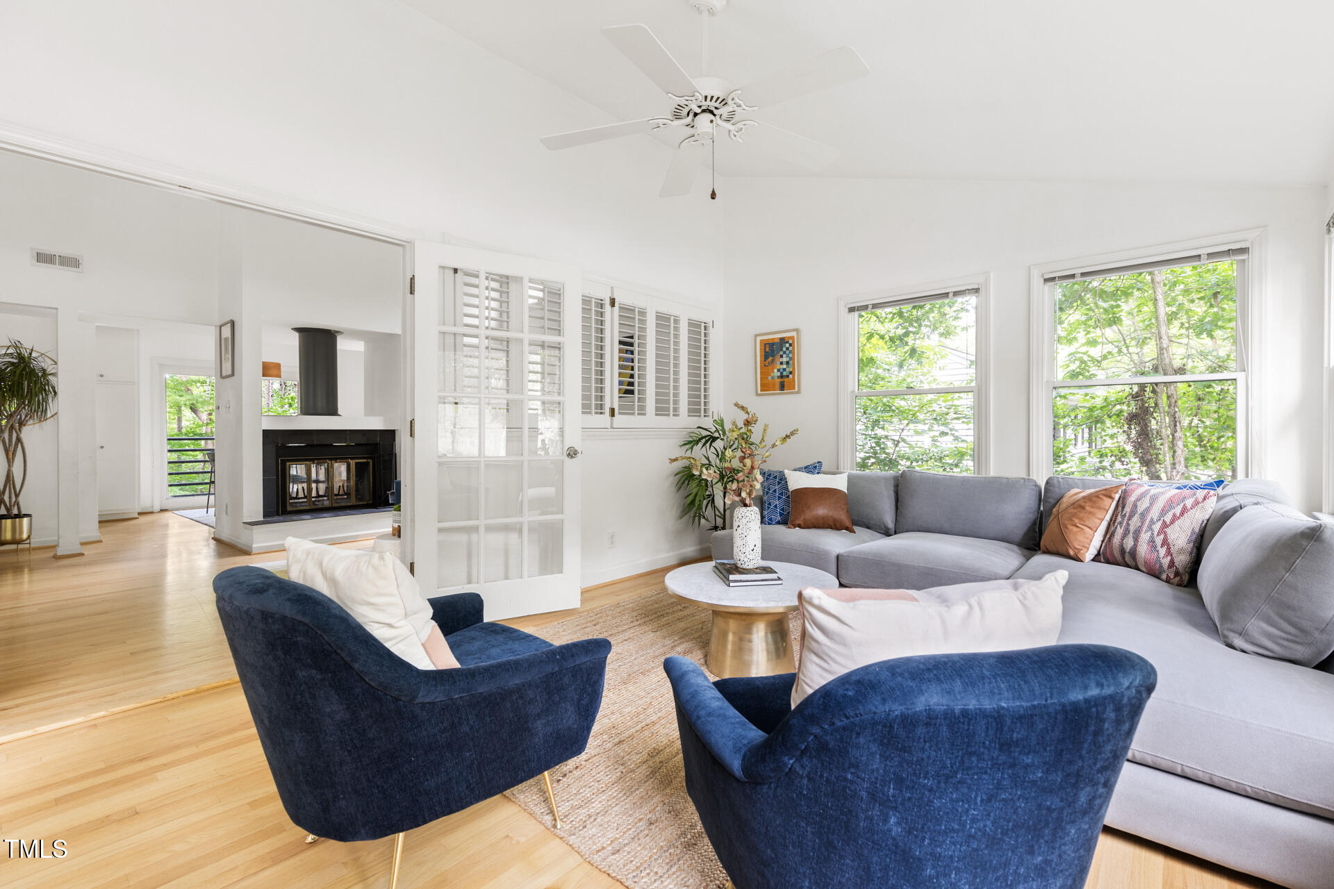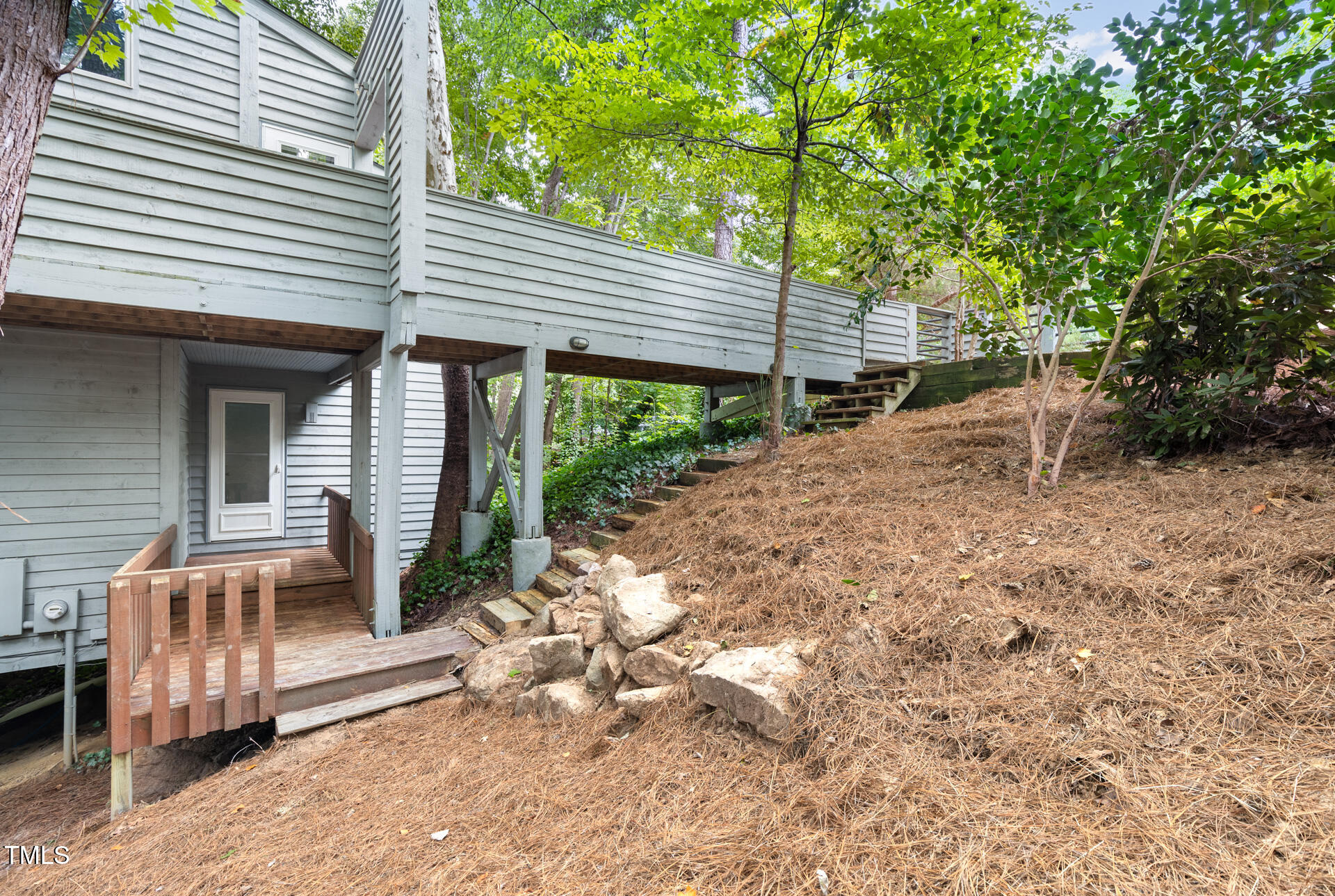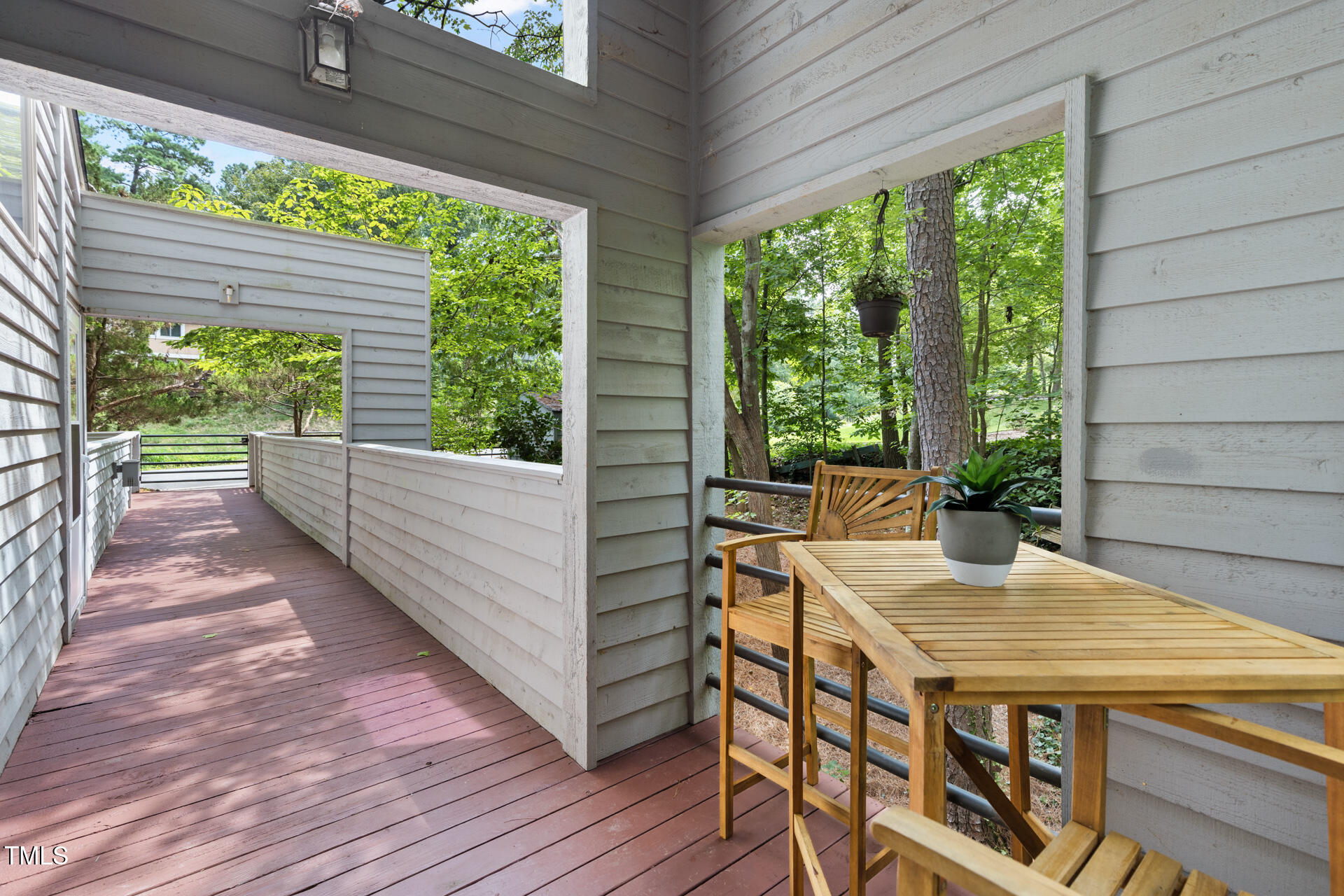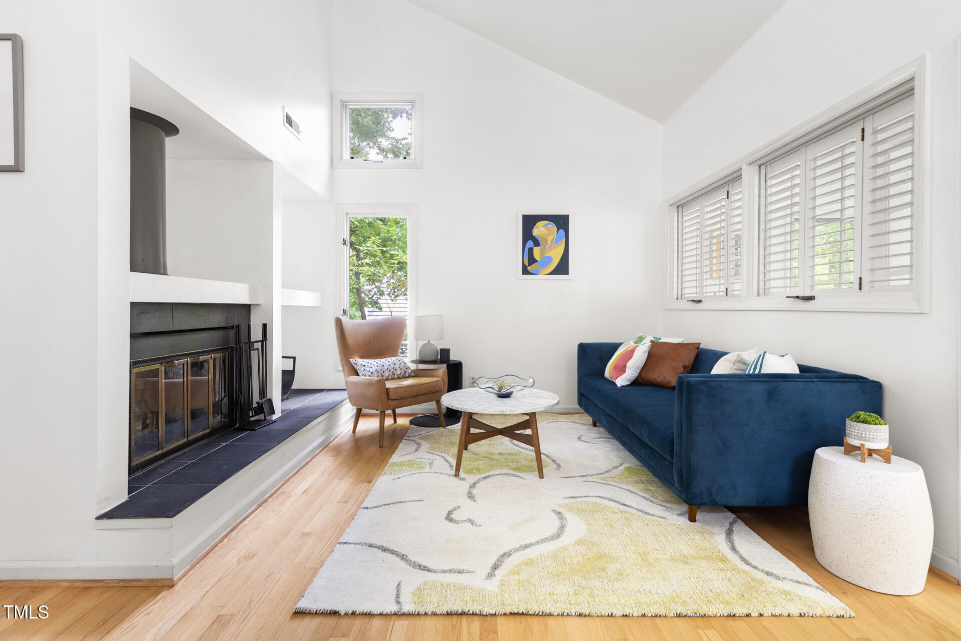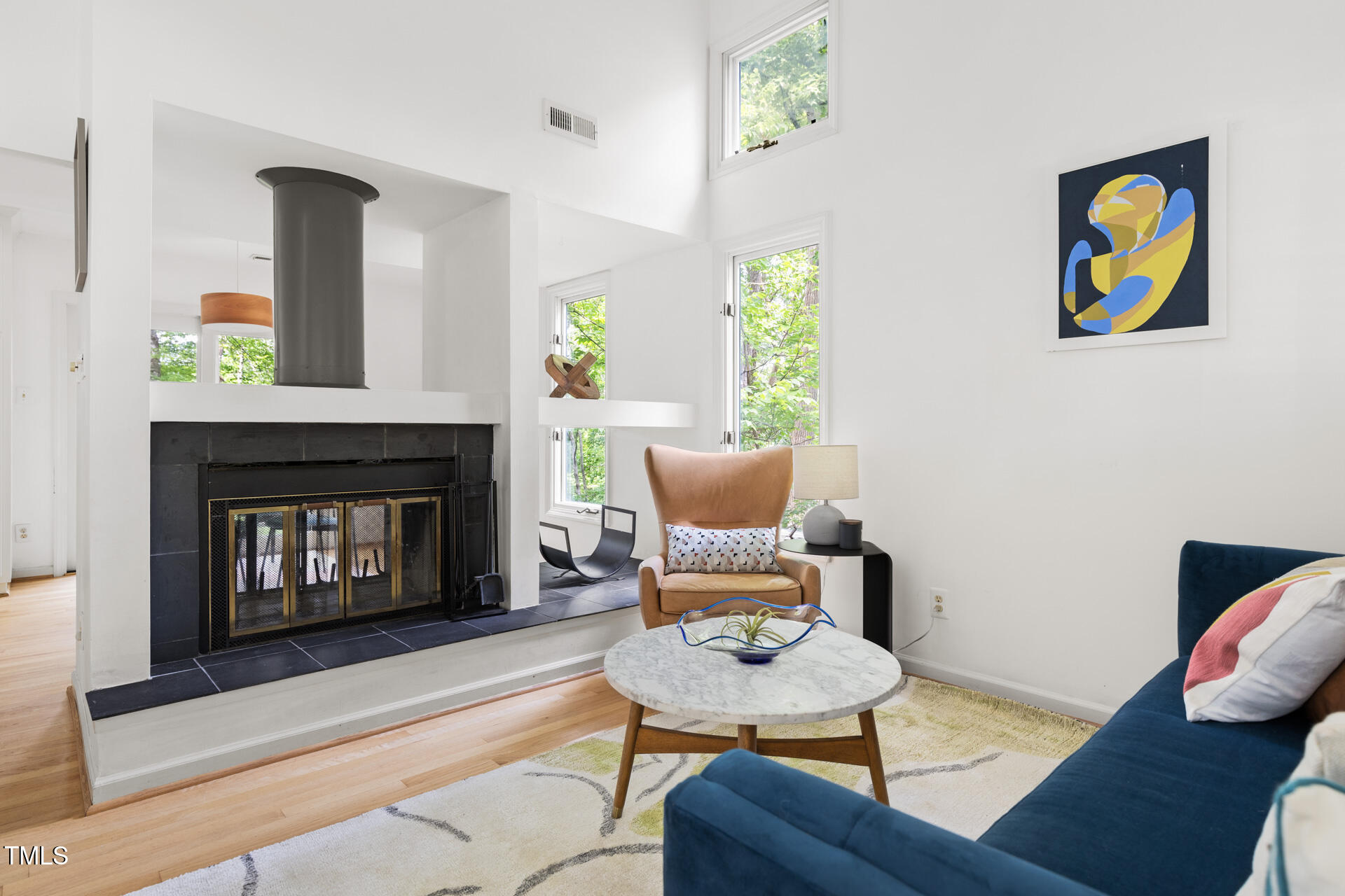 This modern home joins Carolina contemporary style with treehouse living, in a charming SW Durham community. Bill Waddell designed, the Michael and Mary Matros House is a wonderfully unique case. The remarkable entry sequence across a pastoral bridge and into a wooded canopy will make you want to slow your pace. Just inside, the volumetrically mesmerizing living area turns the leafy and sunny views surrounding the property into a peaceful showcase. A fireplace bifurcates the living and dining zones with a charming balcony overlooking the wooded backyard, an exterior view best-case. A social sunroom is visually connected through louvered openings and allows for overflow hangout space. A private and generous primary suite occupies the upper level with lofty ceilings and just past a stylish landing bookcase. The lower level features another full bath, laundry, two bedrooms with a shared balcony and a flex room that might become an ideal project workspace. Opening onto yet another deck with steps to an outdoor shed for additional storage and a low maintenance yard that will let your summer lawn mowing worries be erased. Situated perfectly between Durham and Chapel Hill, 4108 combines savvy architectural design with a lovely wooded lot - truly a rare find, this looker on Livingstone Place.