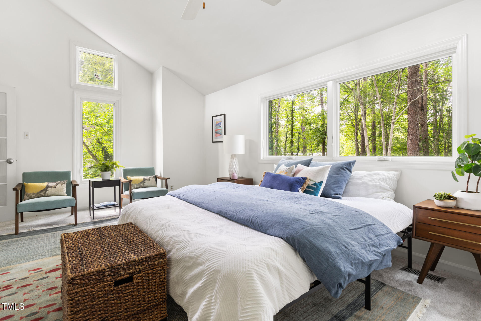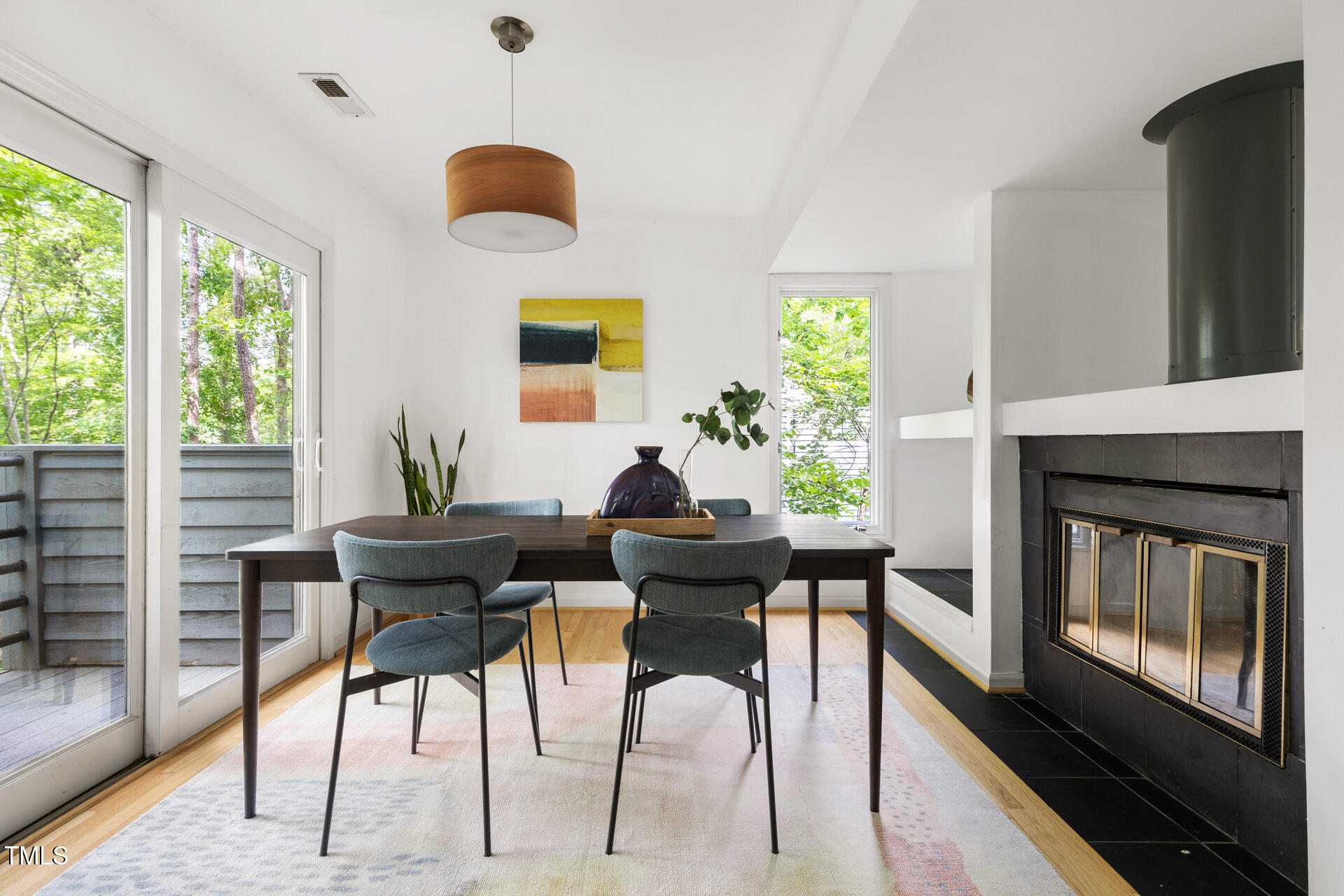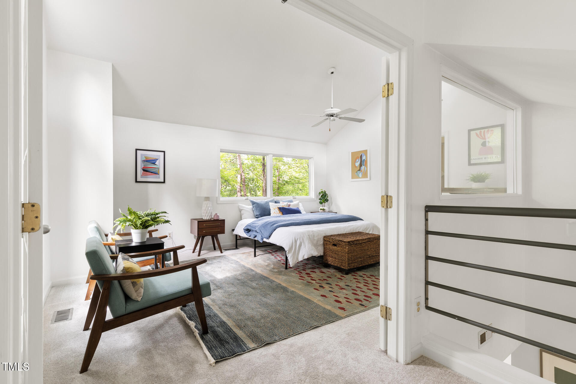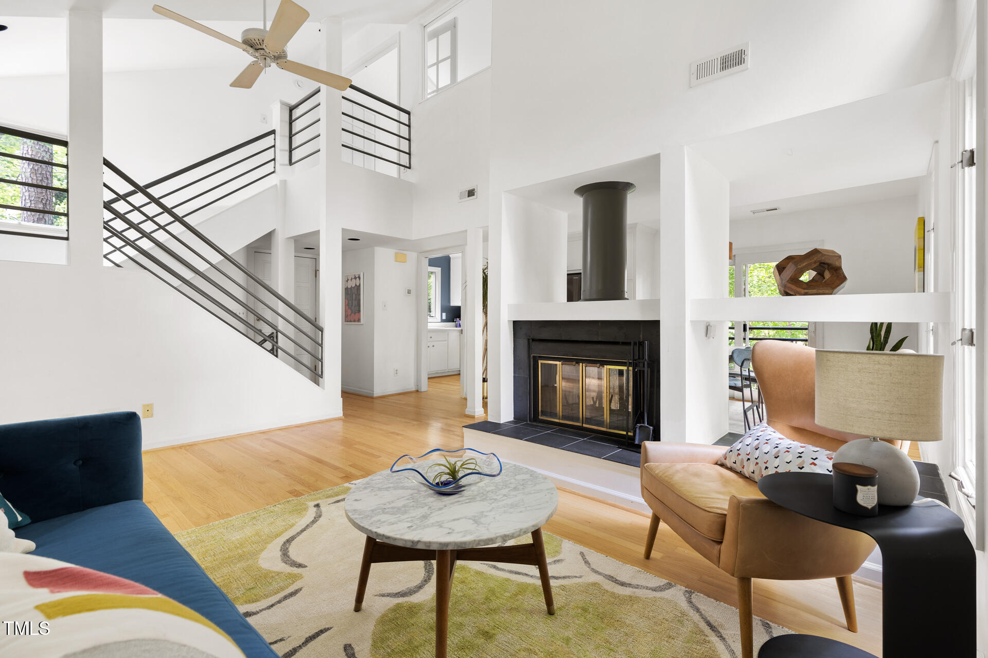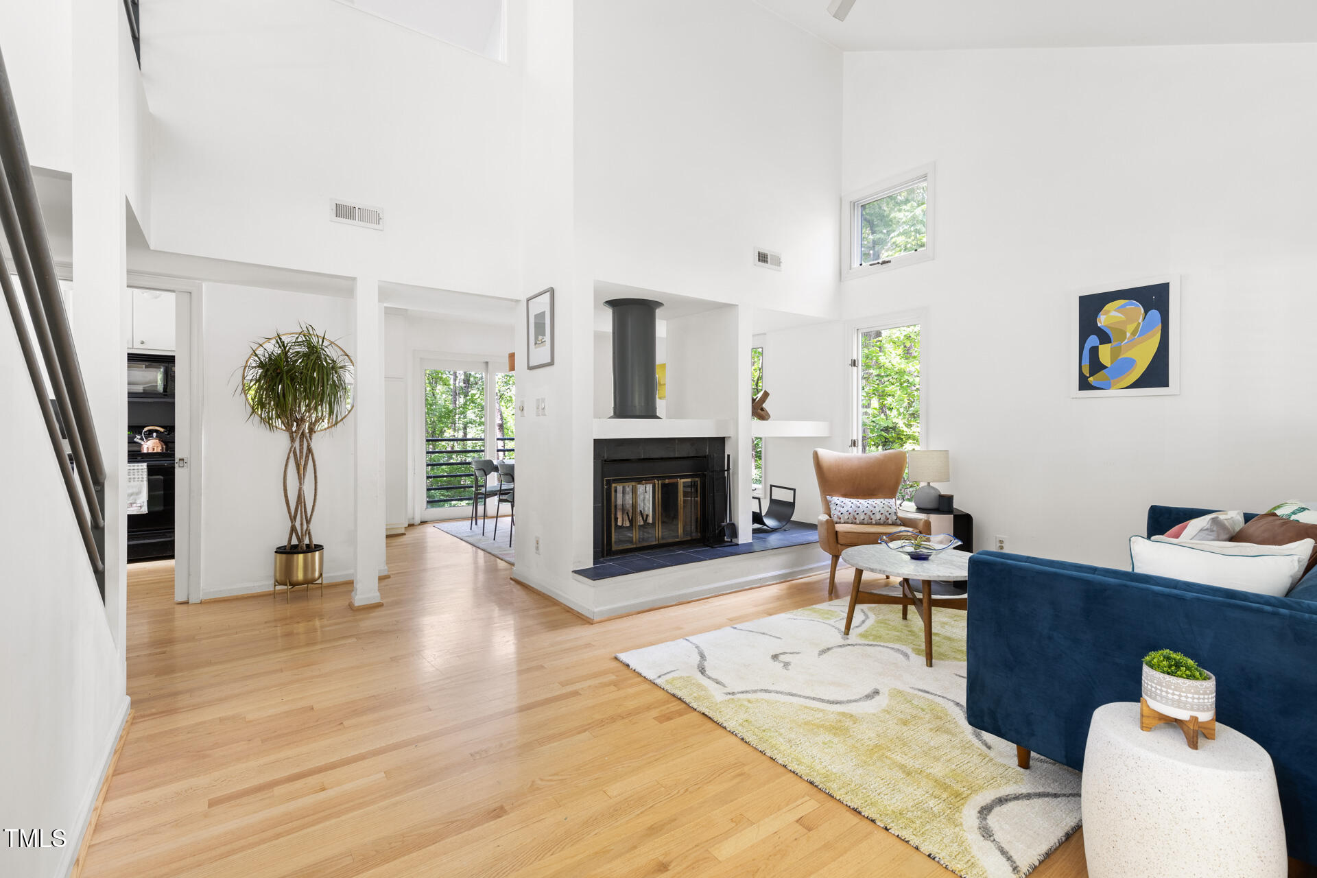 This modern home joins Carolina contemporary style with treehouse living, in a charming SW Durham community. Bill Waddell designed, the Michael and Mary Matros House is a wonderfully unique case. The remarkable entry sequence across a pastoral bridge and into a wooded canopy will make you want to slow your pace. Just inside, the volumetrically mesmerizing living area turns the leafy and sunny views surrounding the property into a peaceful showcase. A fireplace bifurcates the living and dining zones with a charming balcony overlooking the wooded backyard, an exterior view best-case. A social sunroom is visually connected through louvered openings and allows for overflow hangout space. A private and generous primary suite occupies the upper level with lofty ceilings and just past a stylish landing bookcase. The lower level features another full bath, laundry, two bedrooms with a shared balcony and a flex room that might become an ideal project workspace. Opening onto yet another deck with steps to an outdoor shed for additional storage and a low maintenance yard that will let your summer lawn mowing worries be erased. Situated perfectly between Durham and Chapel Hill, 4108 combines savvy architectural design with a lovely wooded lot - truly a rare find, this looker on Livingstone Place.