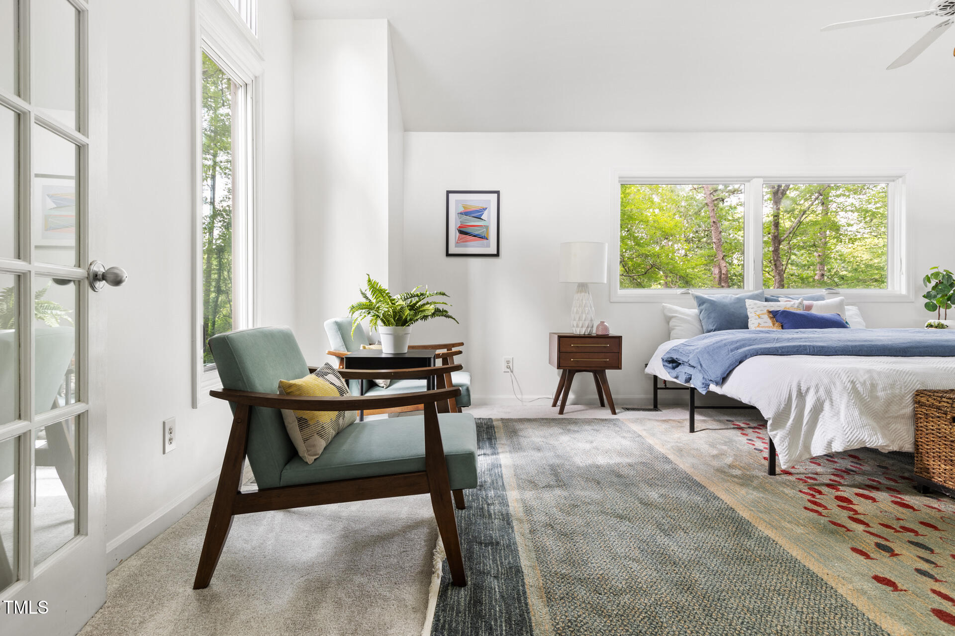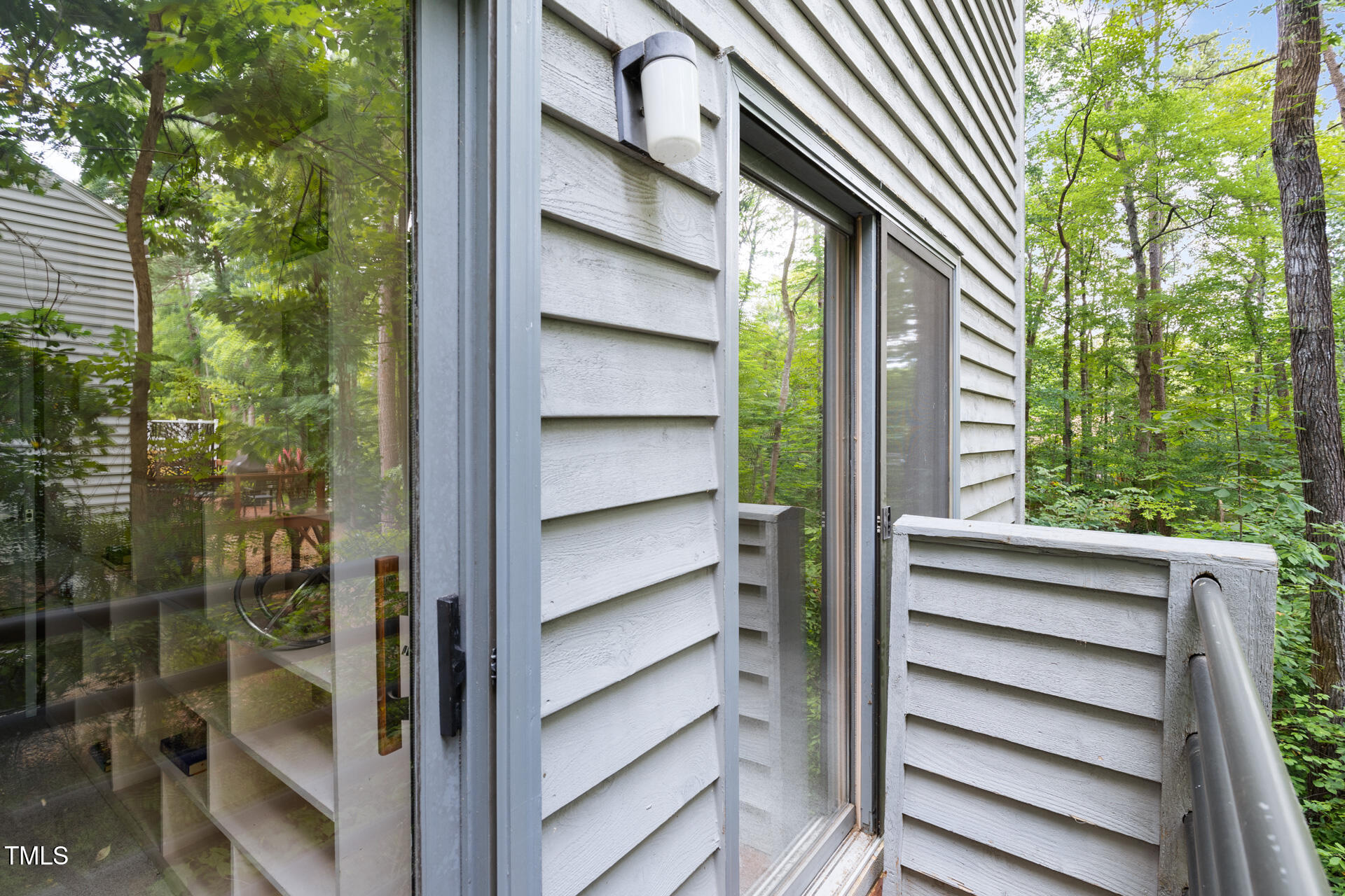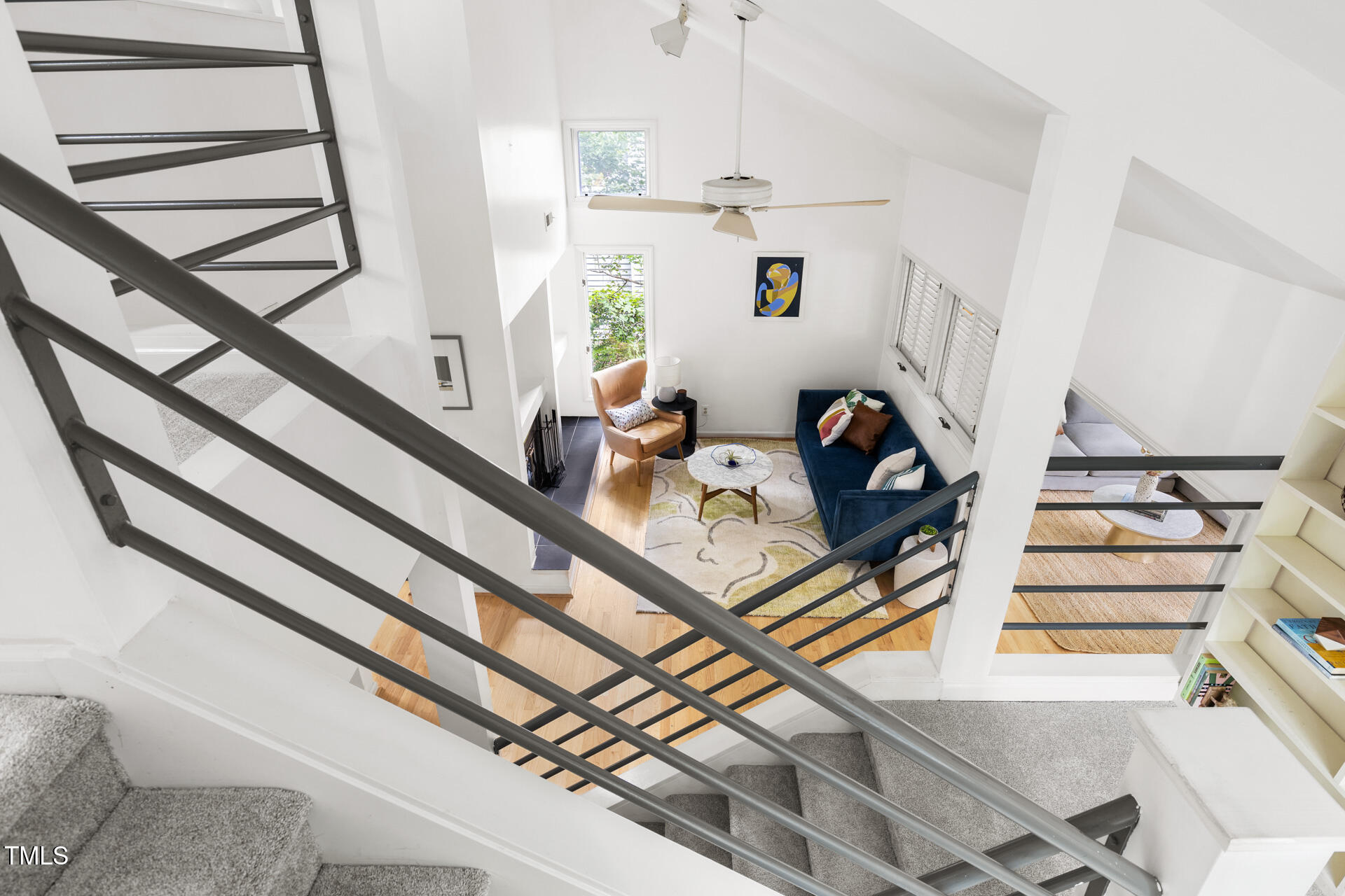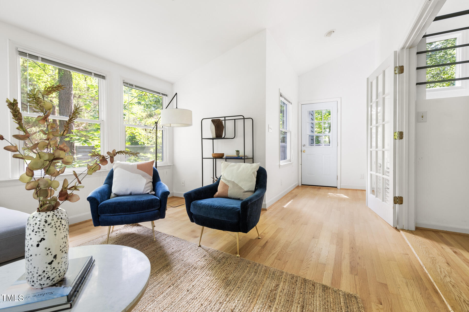 This modern home joins Carolina contemporary style with treehouse living, in a charming SW Durham community. Bill Waddell designed, the Michael and Mary Matros House is a wonderfully unique case. The remarkable entry sequence across a pastoral bridge and into a wooded canopy will make you want to slow your pace. Just inside, the volumetrically mesmerizing living area turns the leafy and sunny views surrounding the property into a peaceful showcase. A fireplace bifurcates the living and dining zones with a charming balcony overlooking the wooded backyard, an exterior view best-case. A social sunroom is visually connected through louvered openings and allows for overflow hangout space. A private and generous primary suite occupies the upper level with lofty ceilings and just past a stylish landing bookcase. The lower level features another full bath, laundry, two bedrooms with a shared balcony and a flex room that might become an ideal project workspace. Opening onto yet another deck with steps to an outdoor shed for additional storage and a low maintenance yard that will let your summer lawn mowing worries be erased. Situated perfectly between Durham and Chapel Hill, 4108 combines savvy architectural design with a lovely wooded lot - truly a rare find, this looker on Livingstone Place.