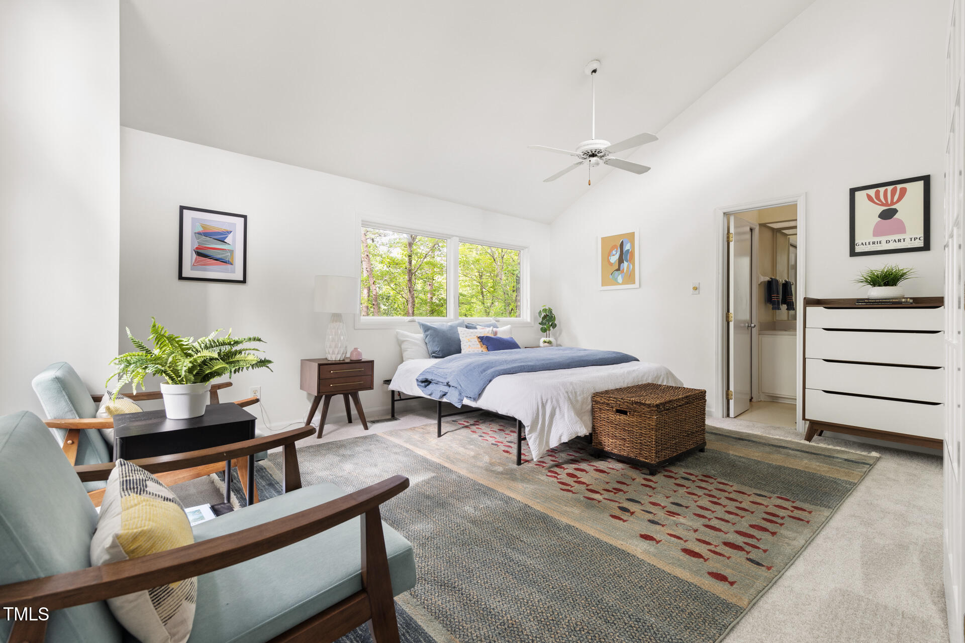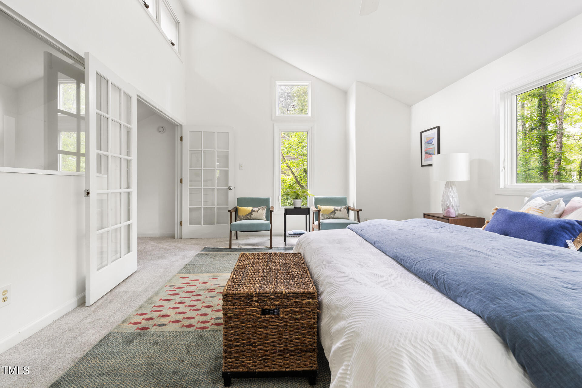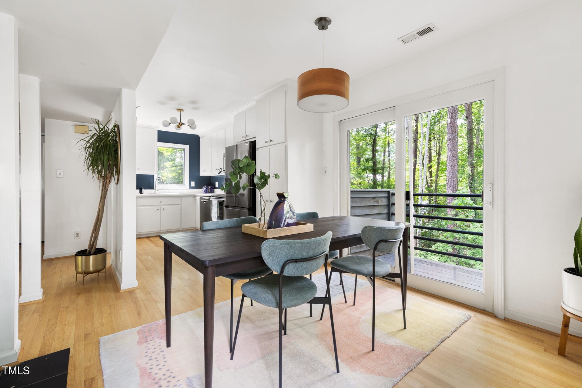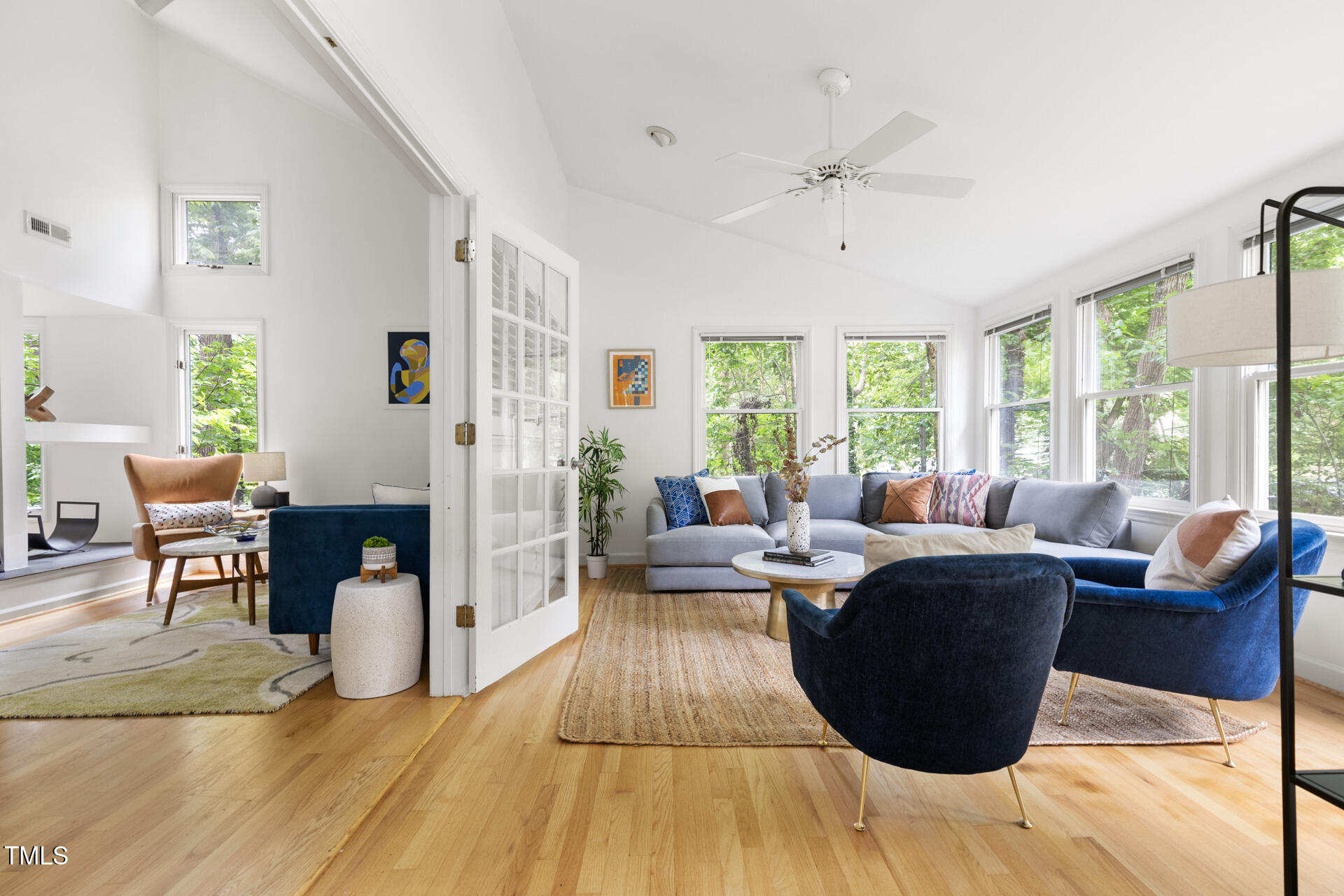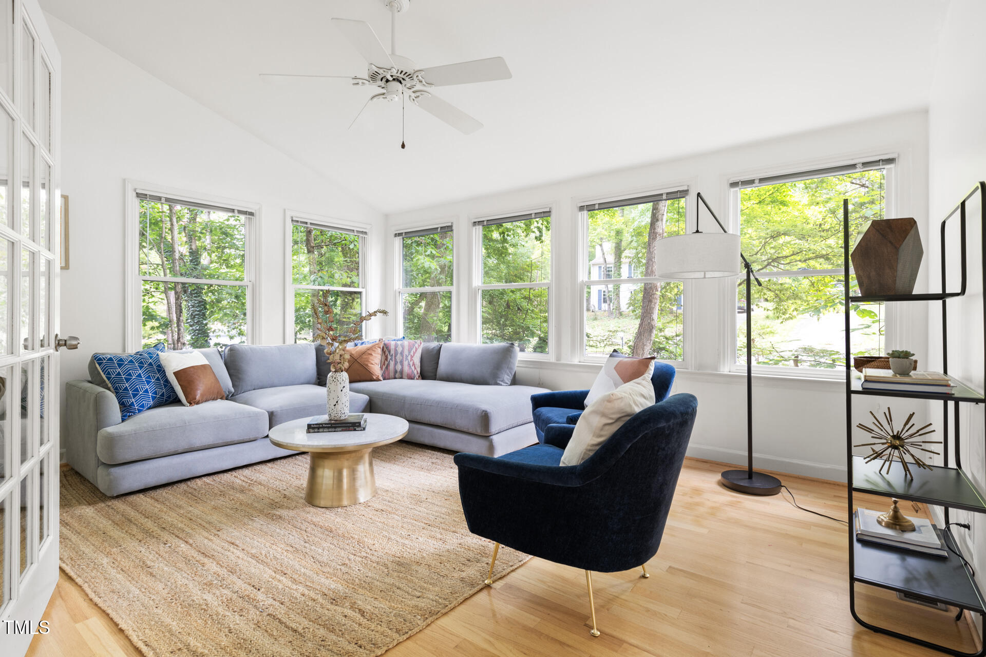 This modern home joins Carolina contemporary style with treehouse living, in a charming SW Durham community. Bill Waddell designed, the Michael and Mary Matros House is a wonderfully unique case. The remarkable entry sequence across a pastoral bridge and into a wooded canopy will make you want to slow your pace. Just inside, the volumetrically mesmerizing living area turns the leafy and sunny views surrounding the property into a peaceful showcase. A fireplace bifurcates the living and dining zones with a charming balcony overlooking the wooded backyard, an exterior view best-case. A social sunroom is visually connected through louvered openings and allows for overflow hangout space. A private and generous primary suite occupies the upper level with lofty ceilings and just past a stylish landing bookcase. The lower level features another full bath, laundry, two bedrooms with a shared balcony and a flex room that might become an ideal project workspace. Opening onto yet another deck with steps to an outdoor shed for additional storage and a low maintenance yard that will let your summer lawn mowing worries be erased. Situated perfectly between Durham and Chapel Hill, 4108 combines savvy architectural design with a lovely wooded lot - truly a rare find, this looker on Livingstone Place.