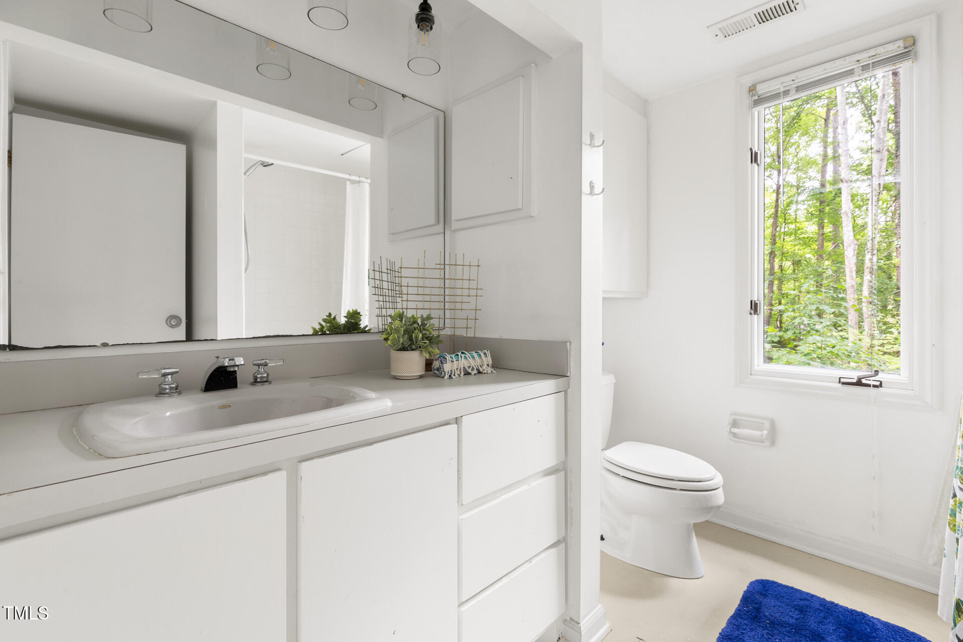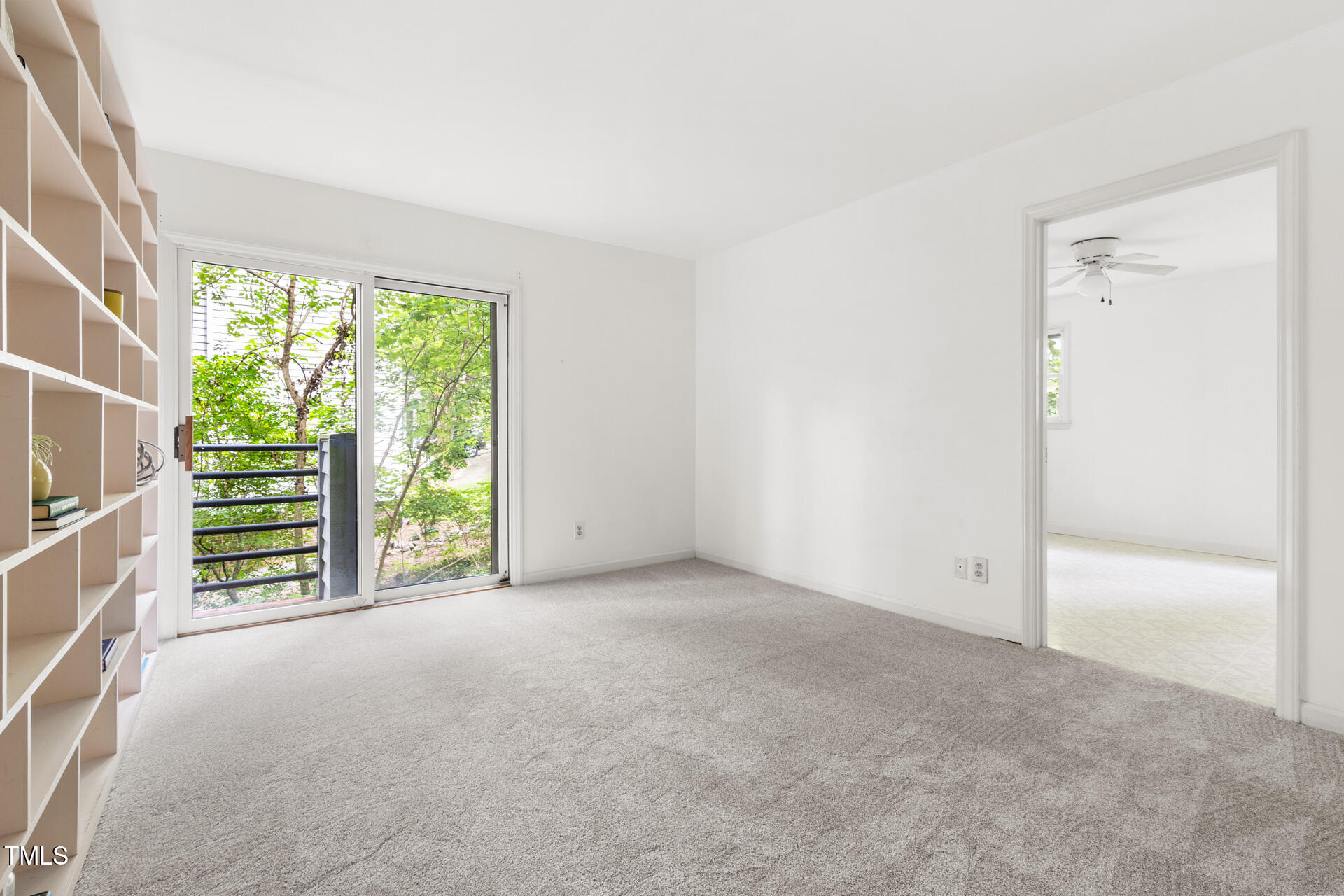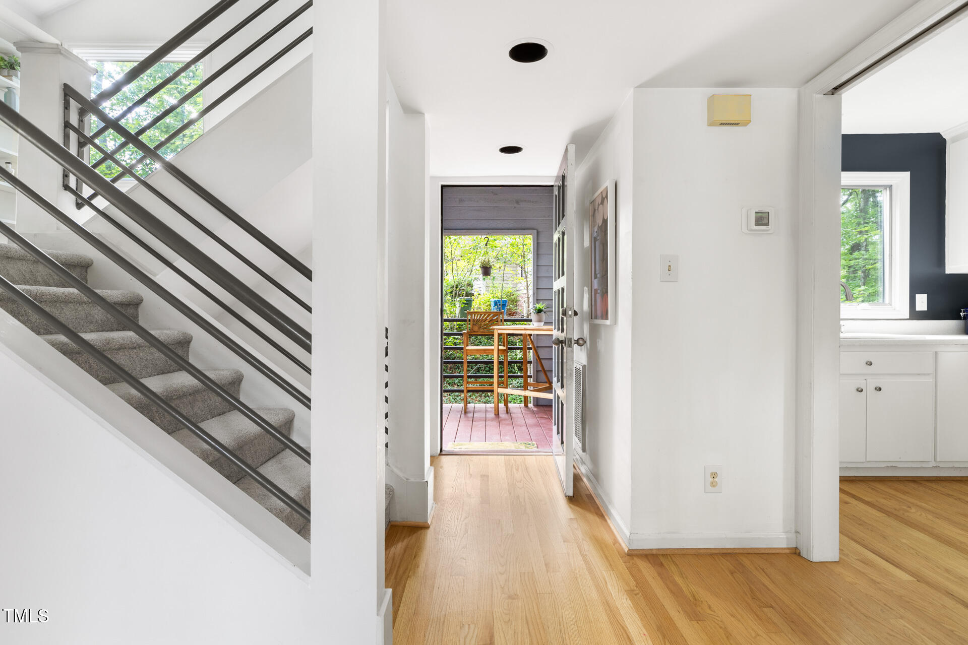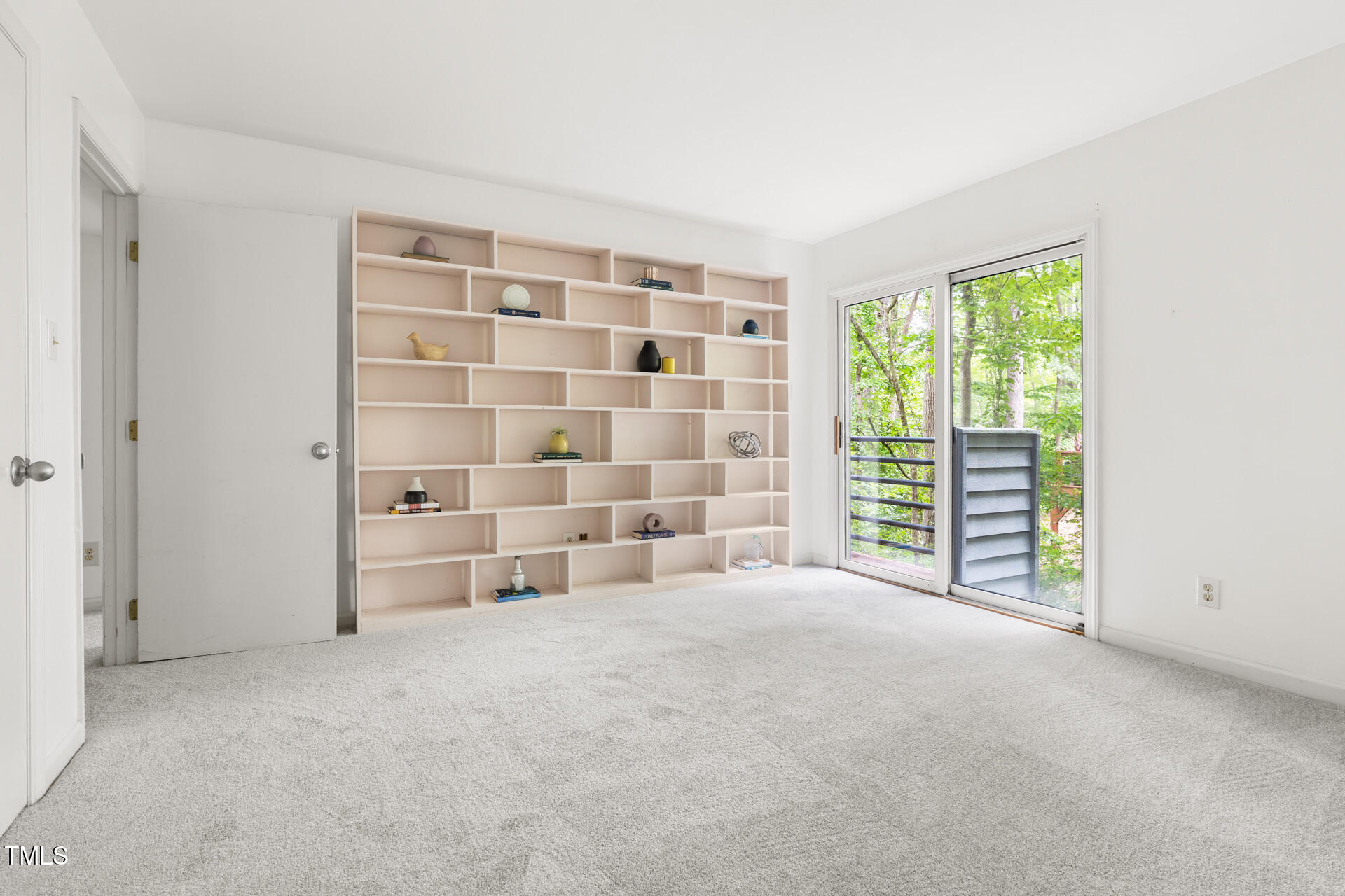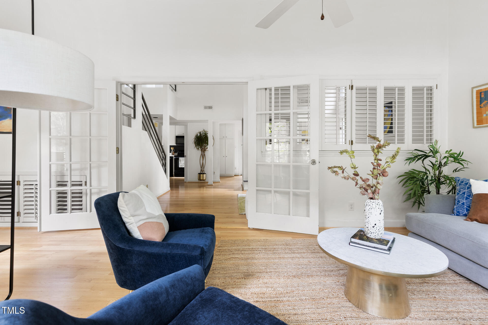 This modern home joins Carolina contemporary style with treehouse living, in a charming SW Durham community. Bill Waddell designed, the Michael and Mary Matros House is a wonderfully unique case. The remarkable entry sequence across a pastoral bridge and into a wooded canopy will make you want to slow your pace. Just inside, the volumetrically mesmerizing living area turns the leafy and sunny views surrounding the property into a peaceful showcase. A fireplace bifurcates the living and dining zones with a charming balcony overlooking the wooded backyard, an exterior view best-case. A social sunroom is visually connected through louvered openings and allows for overflow hangout space. A private and generous primary suite occupies the upper level with lofty ceilings and just past a stylish landing bookcase. The lower level features another full bath, laundry, two bedrooms with a shared balcony and a flex room that might become an ideal project workspace. Opening onto yet another deck with steps to an outdoor shed for additional storage and a low maintenance yard that will let your summer lawn mowing worries be erased. Situated perfectly between Durham and Chapel Hill, 4108 combines savvy architectural design with a lovely wooded lot - truly a rare find, this looker on Livingstone Place.