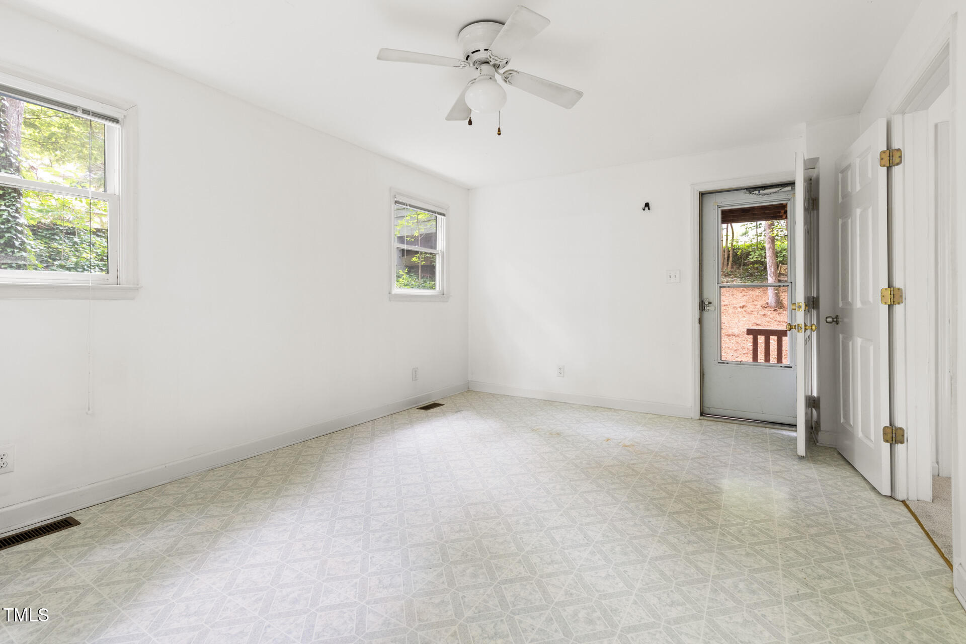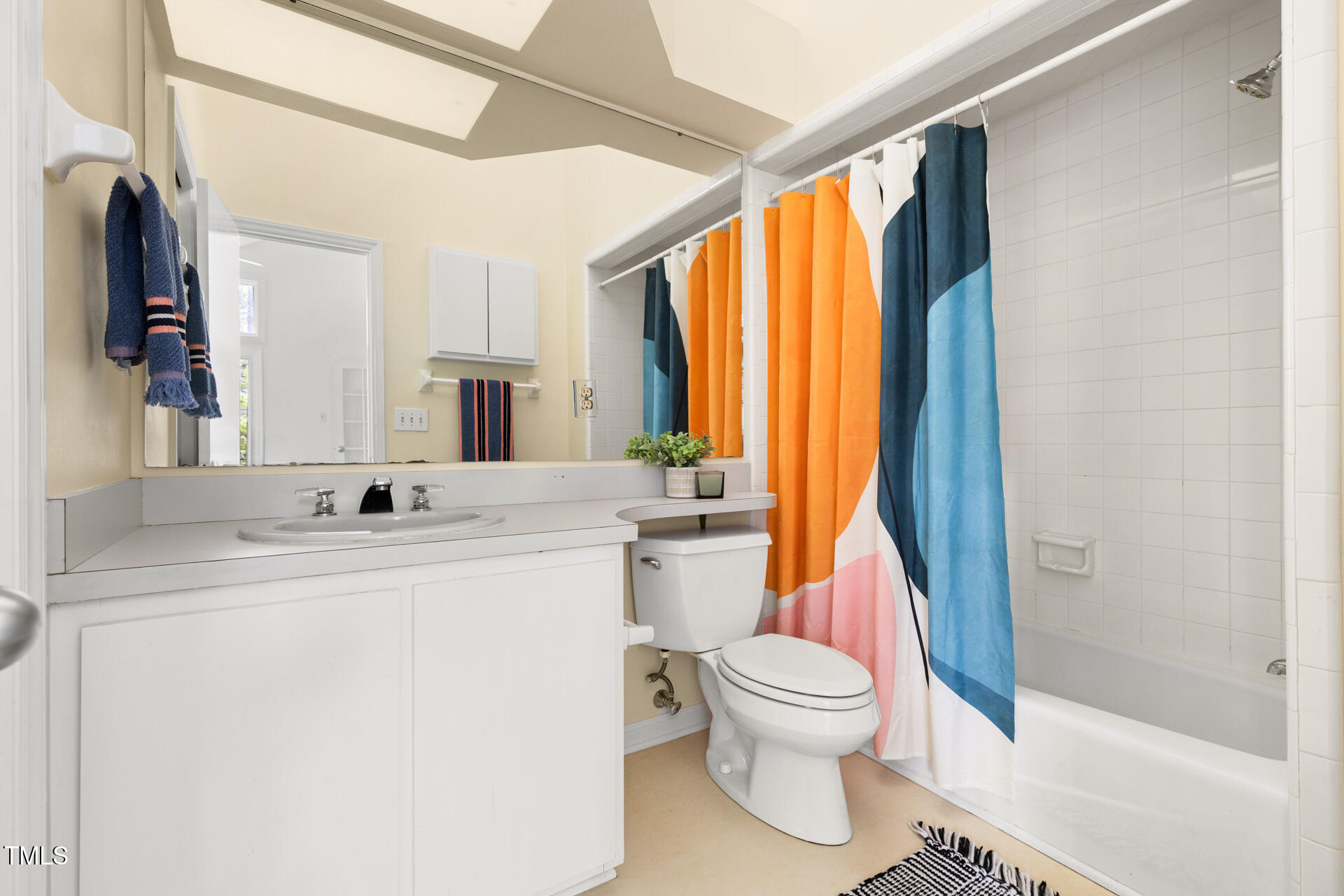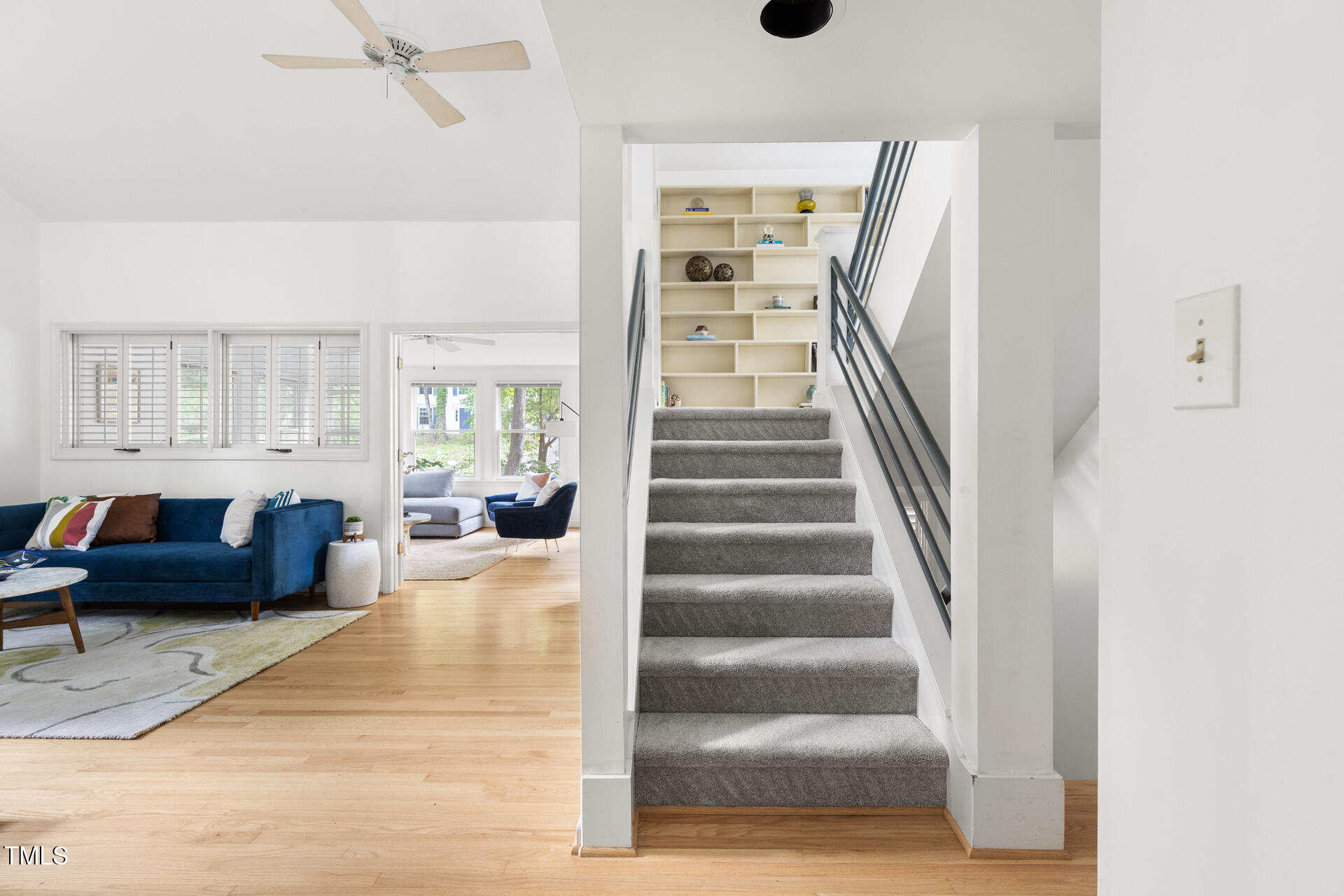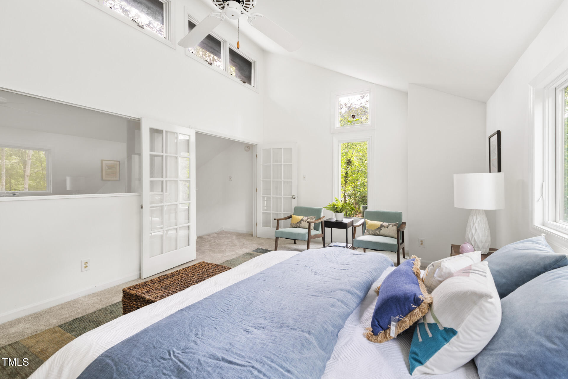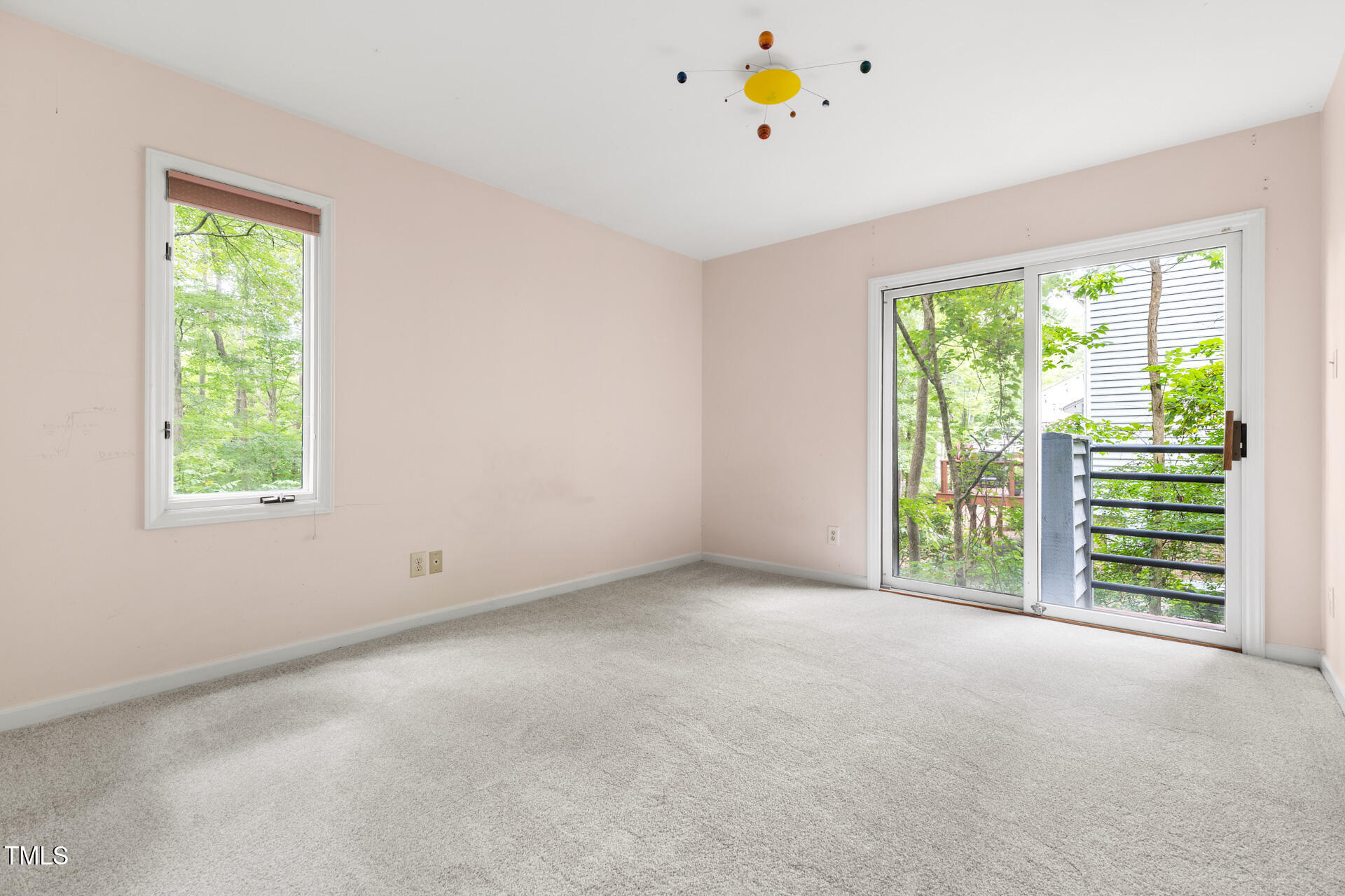 This modern home joins Carolina contemporary style with treehouse living, in a charming SW Durham community. Bill Waddell designed, the Michael and Mary Matros House is a wonderfully unique case. The remarkable entry sequence across a pastoral bridge and into a wooded canopy will make you want to slow your pace. Just inside, the volumetrically mesmerizing living area turns the leafy and sunny views surrounding the property into a peaceful showcase. A fireplace bifurcates the living and dining zones with a charming balcony overlooking the wooded backyard, an exterior view best-case. A social sunroom is visually connected through louvered openings and allows for overflow hangout space. A private and generous primary suite occupies the upper level with lofty ceilings and just past a stylish landing bookcase. The lower level features another full bath, laundry, two bedrooms with a shared balcony and a flex room that might become an ideal project workspace. Opening onto yet another deck with steps to an outdoor shed for additional storage and a low maintenance yard that will let your summer lawn mowing worries be erased. Situated perfectly between Durham and Chapel Hill, 4108 combines savvy architectural design with a lovely wooded lot - truly a rare find, this looker on Livingstone Place.