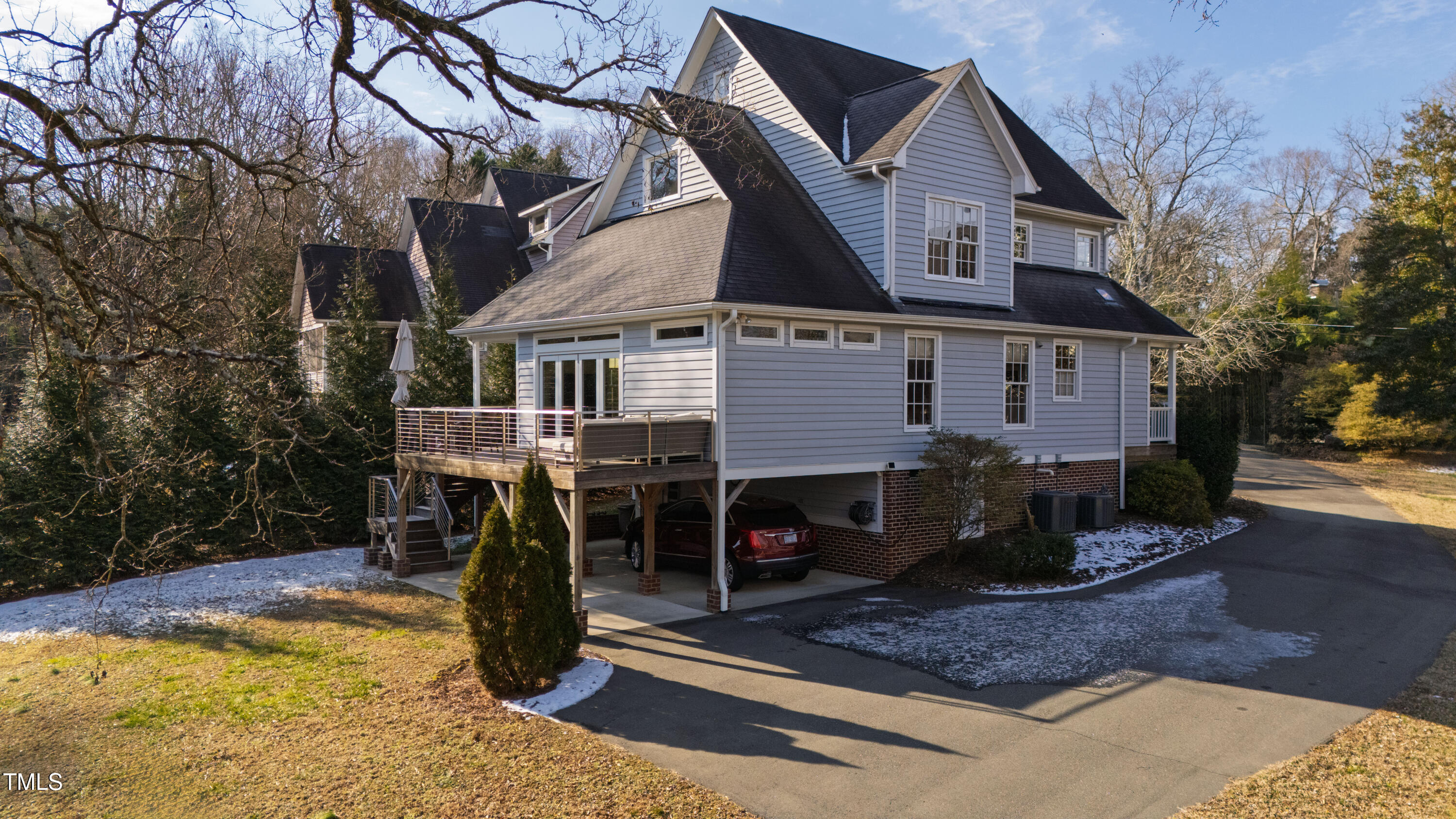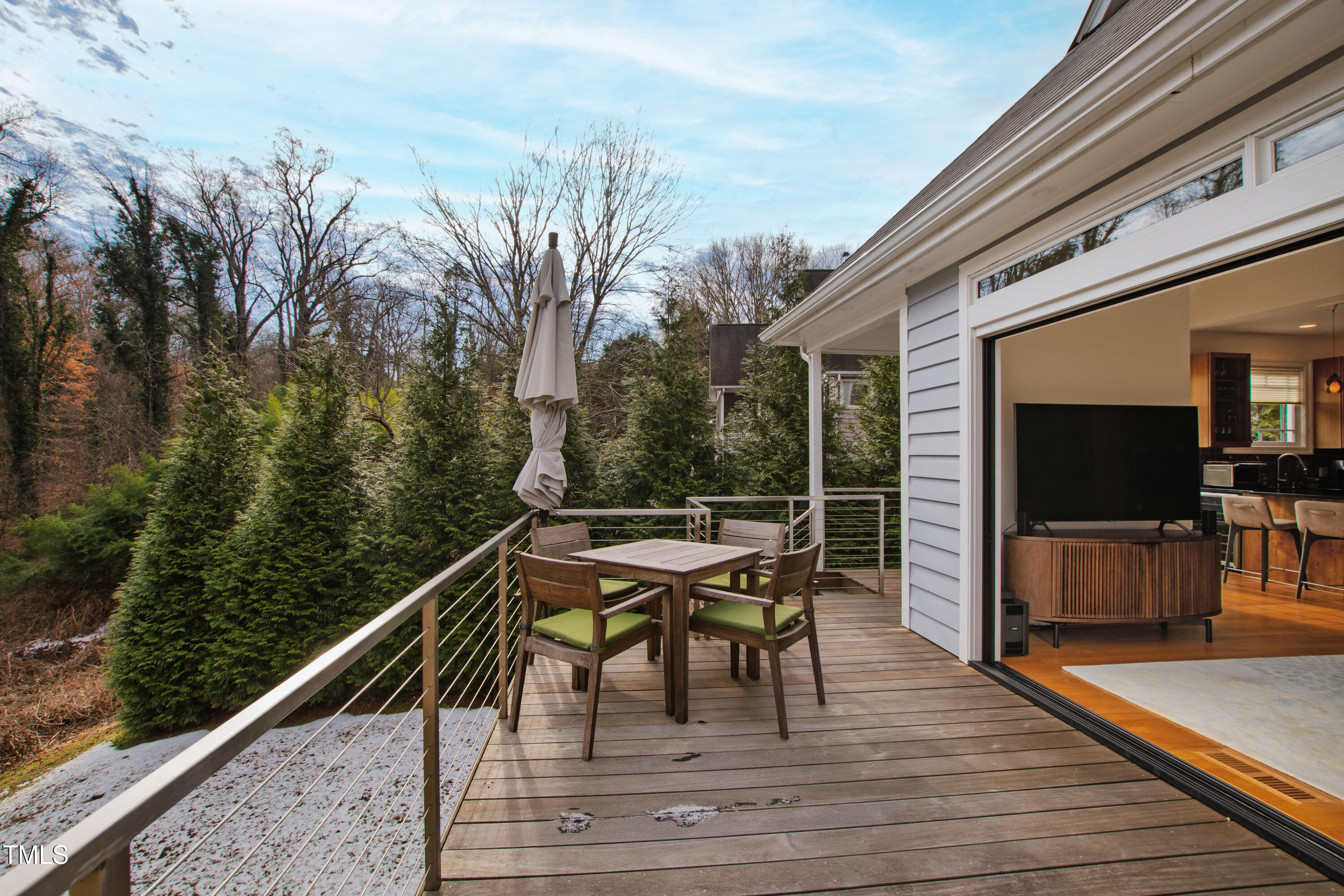 Back downstairs, the cozy den features bi-folding style doors that open onto a spacious ipe wood deck, offering breathtaking wooded views. Below, your vehicles will be sheltered under the two-car carport.