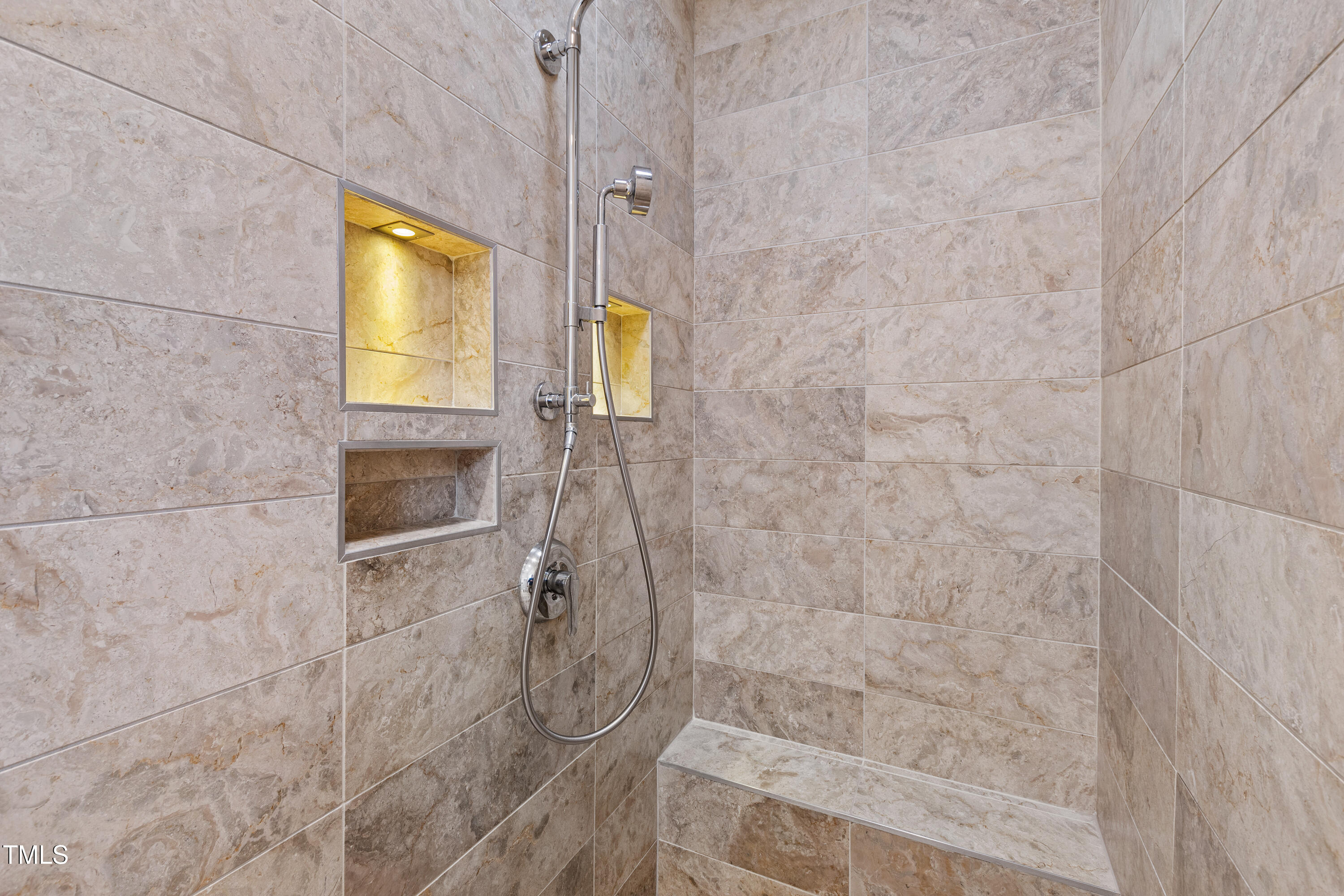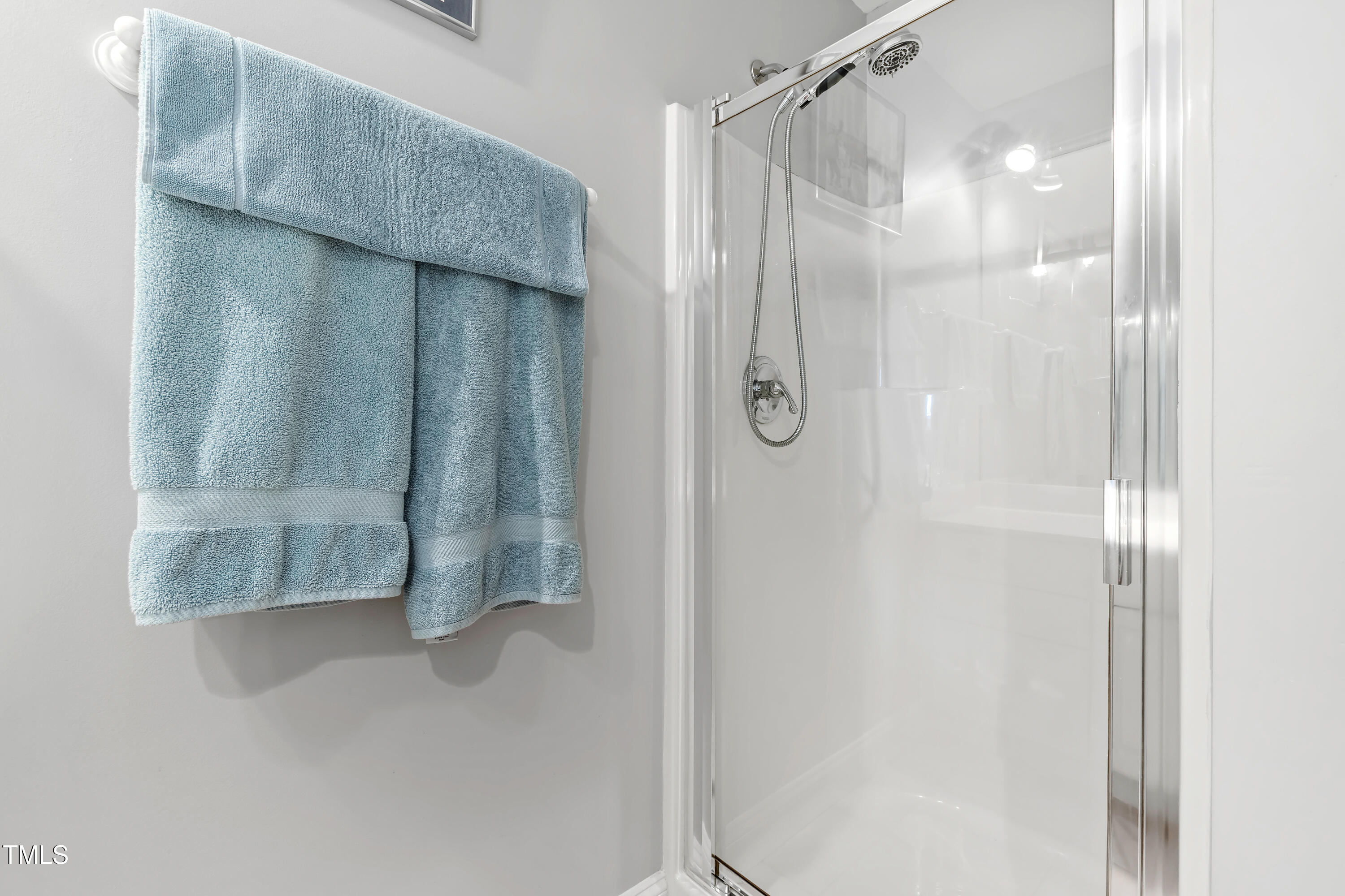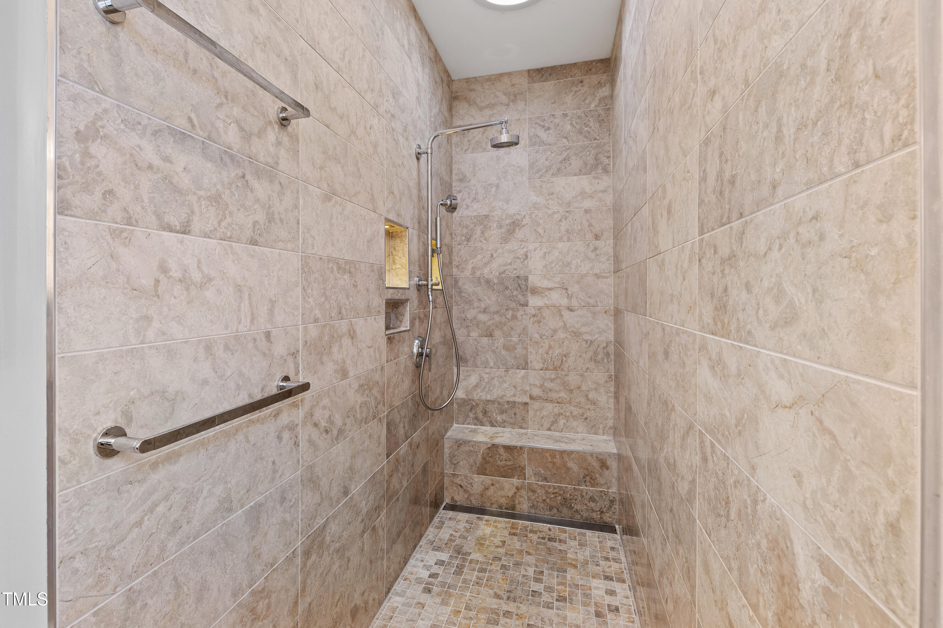 The primary suite on the main level features an updated bath with a tiled shower and a fully remodeled walk-in closet.
