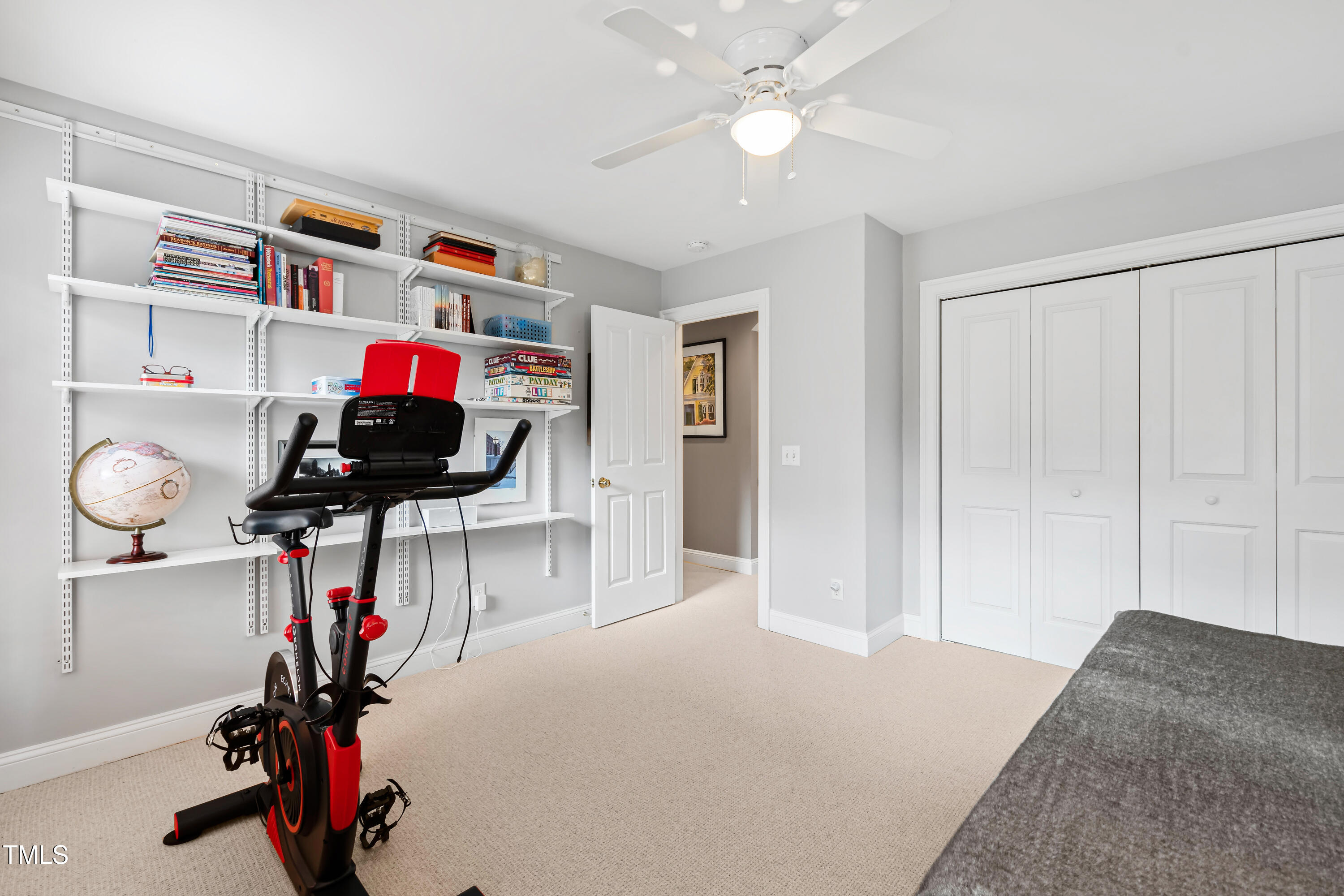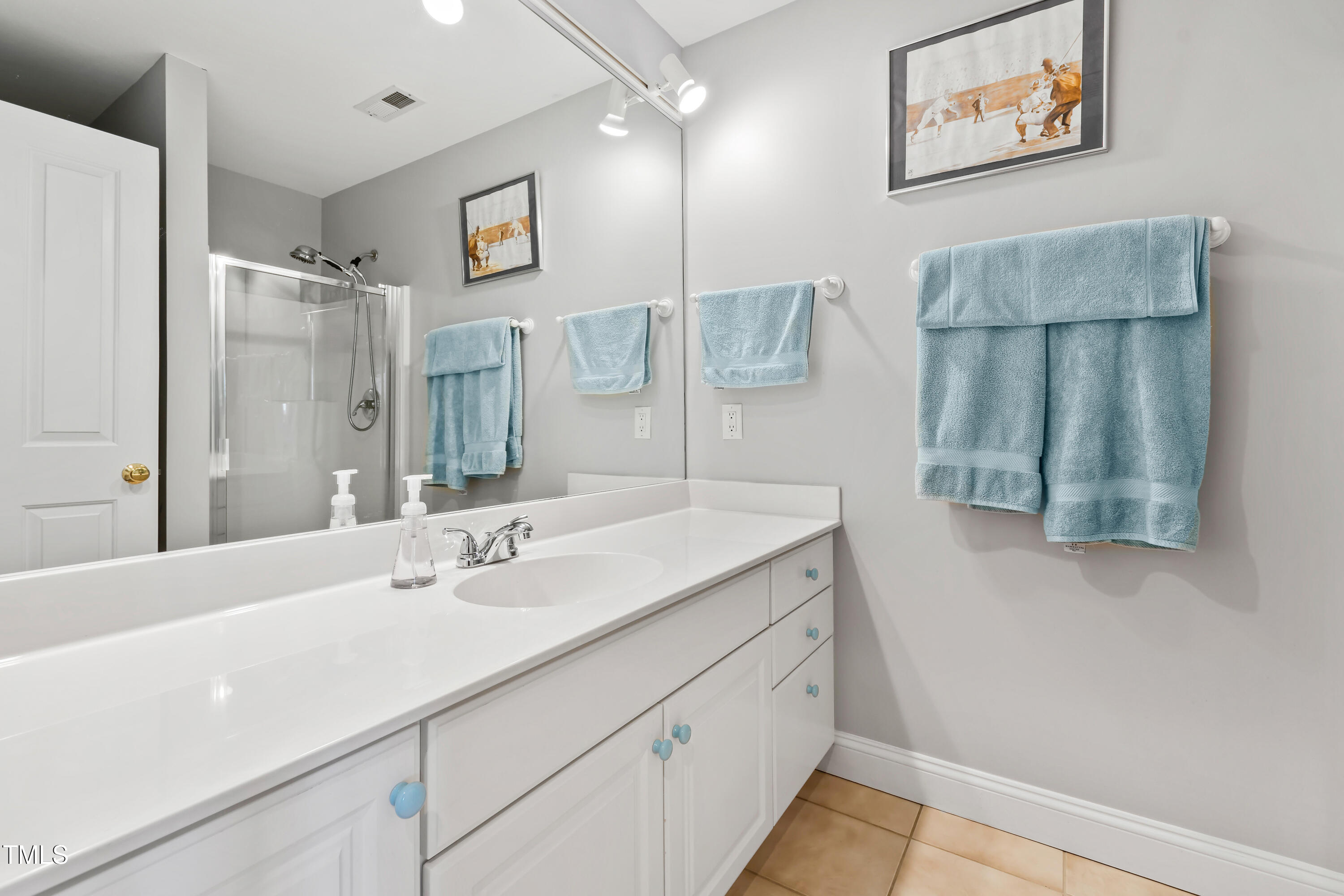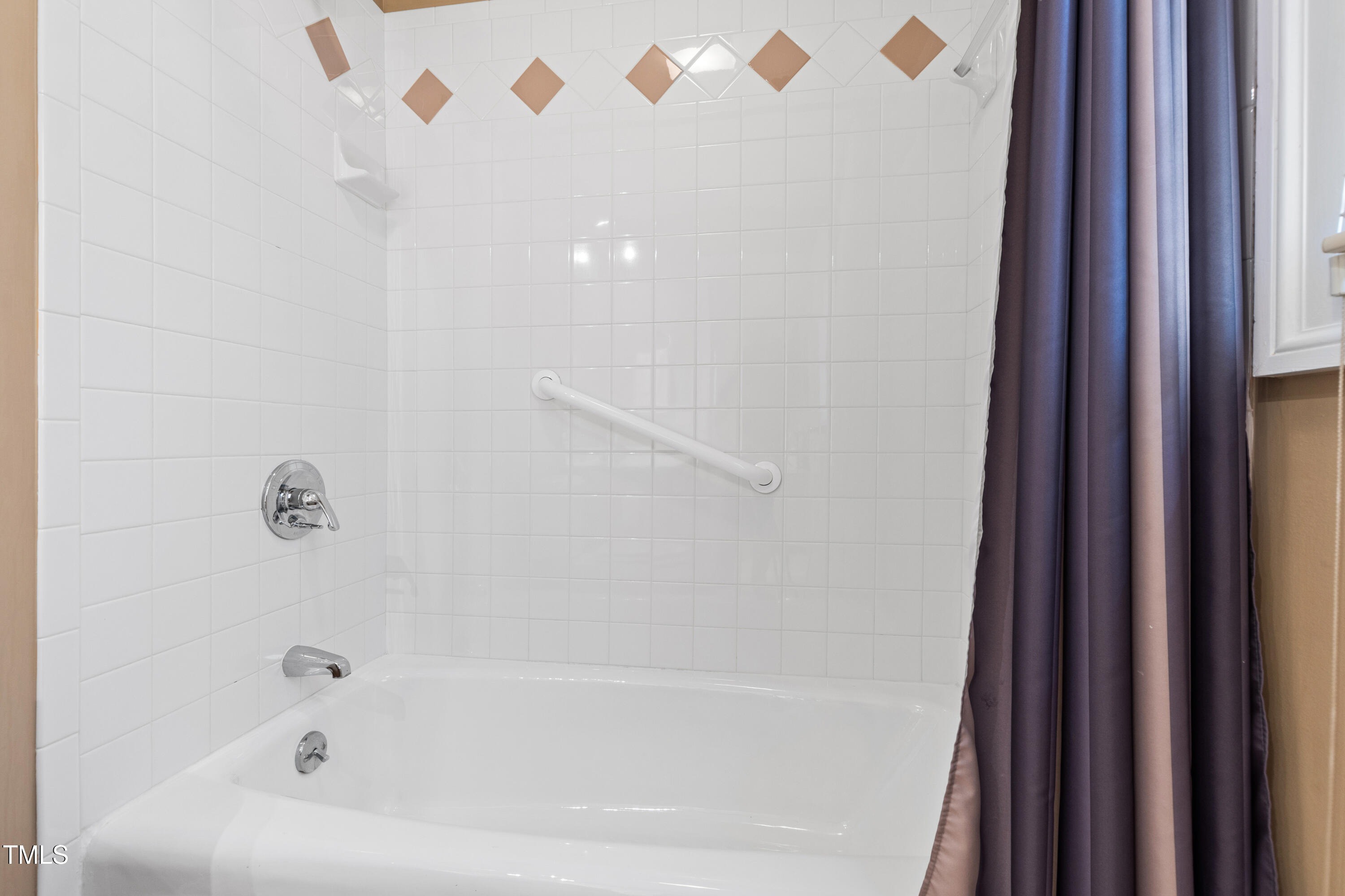 The primary suite on the main level features an updated bath with a tiled shower and a fully remodeled walk-in closet.