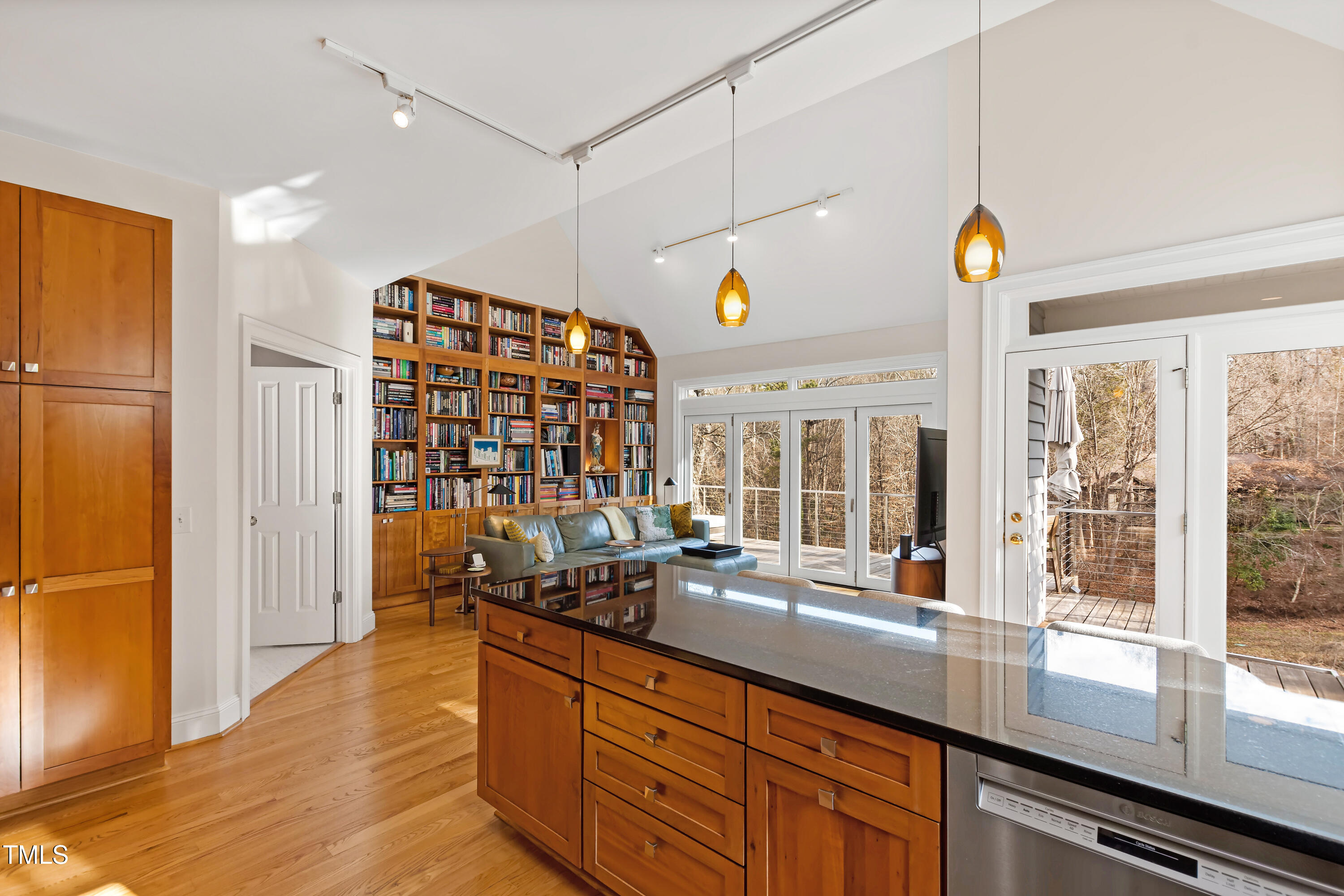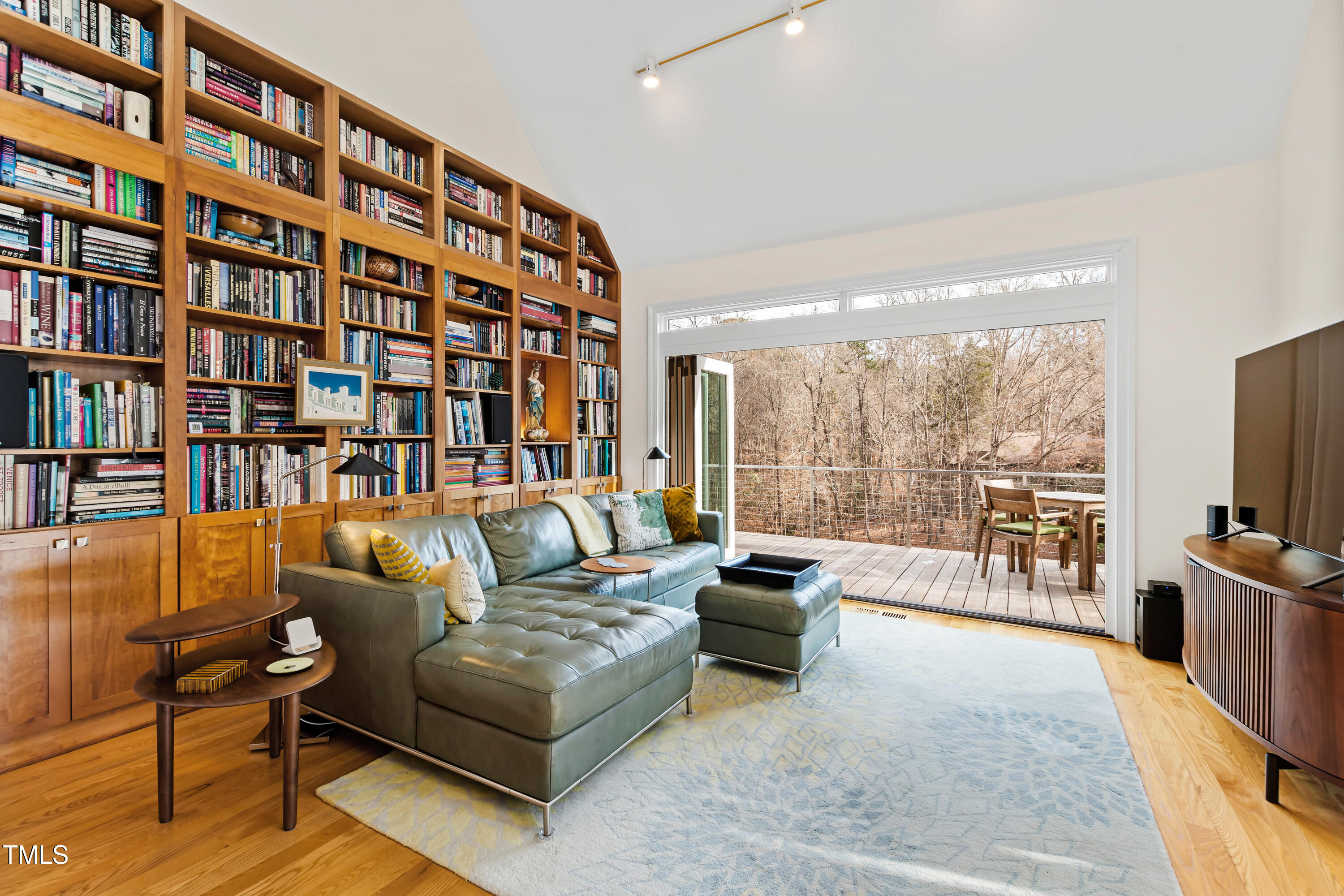 Inside, an abundance of natural light illuminates an open-concept living and dining area, creating an inviting atmosphere. The spacious kitchen is a chef's dream, boasting high-end stainless steel appliances and custom cabinetry. A cozy den provides the perfect space for entertaining or relaxing after a long day, complete with towering custom bookshelves.