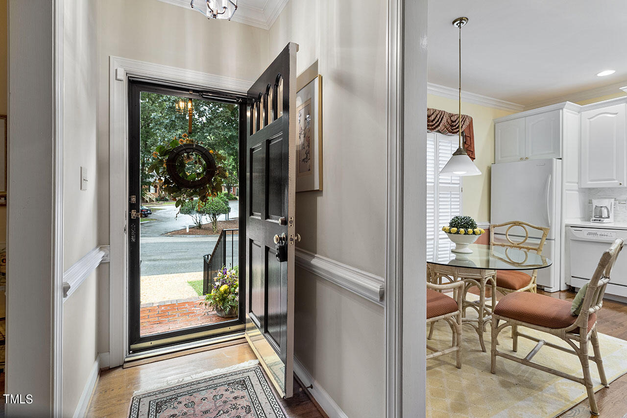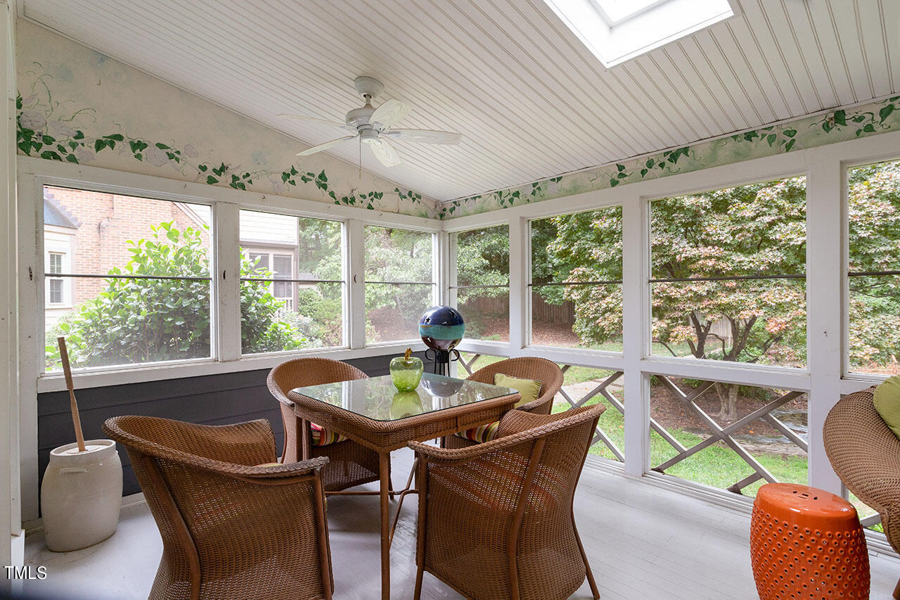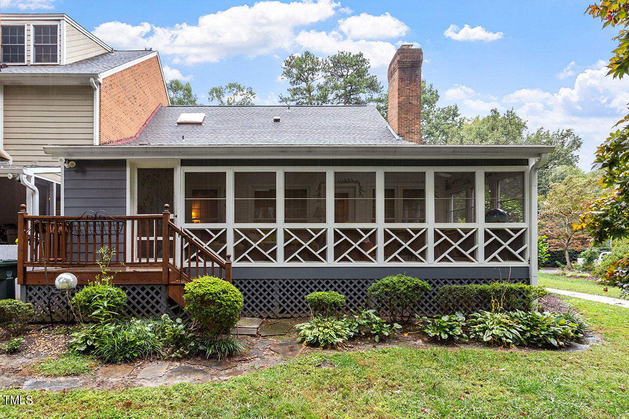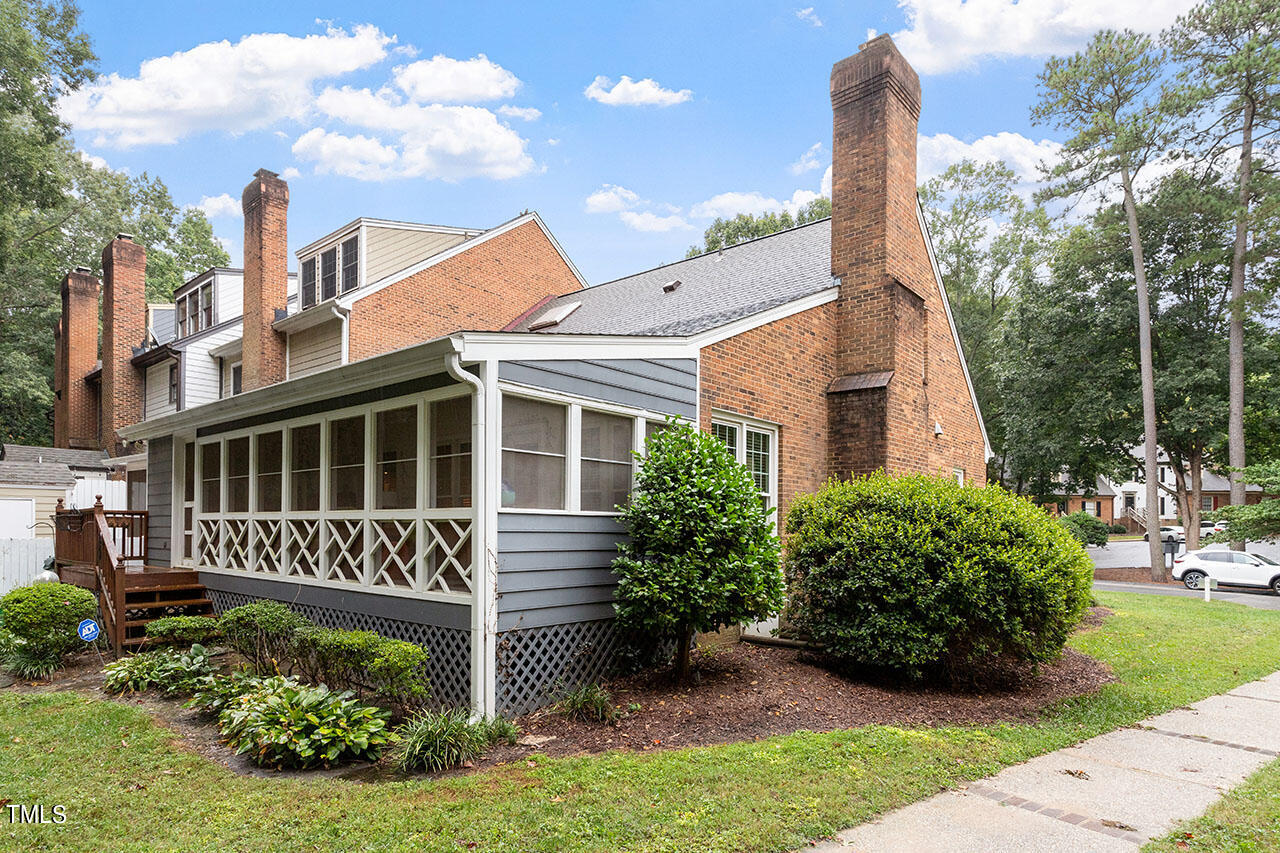 Nestled on a premiere lot within this highly desirable North Raleigh community, this end-unit townhome offers over 2,000 square feet of living space. As you step in to the entry foyer you will see a sun-filled eat-in kitchen on the left and on the right a formal dining room. The spacious great room with a fireplace offers a variety of uses for easy living and entertaining. The cozy sunroom with built-in cabinets overlooks the screened porch and is a perfect space to set up as a den or in home office. Enjoy the convenience of having the spacious primary bedroom and updated bathroom on the main level. The second floor features two additional bedrooms with a shared hall bath. Step out onto the oversized screened-in porch and take in the peaceful private view of the common area.