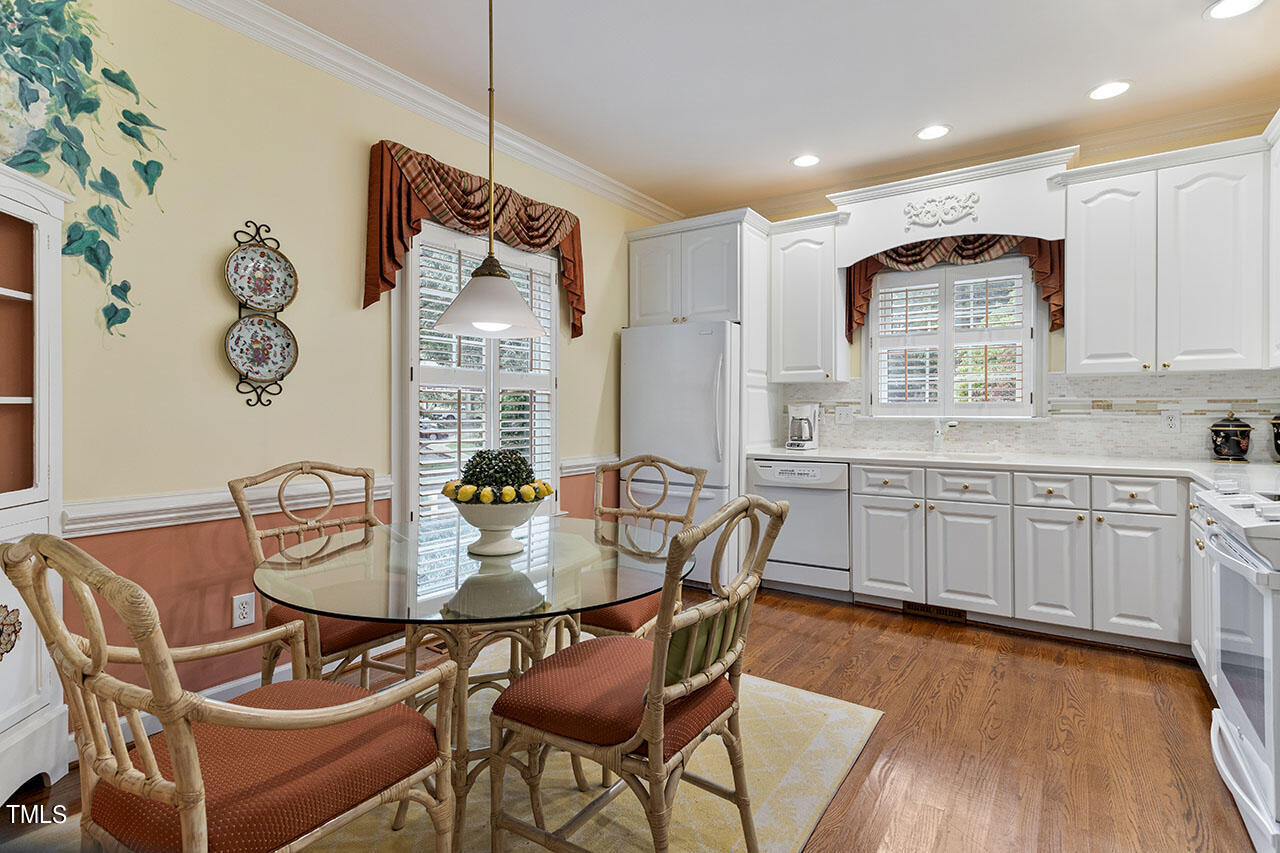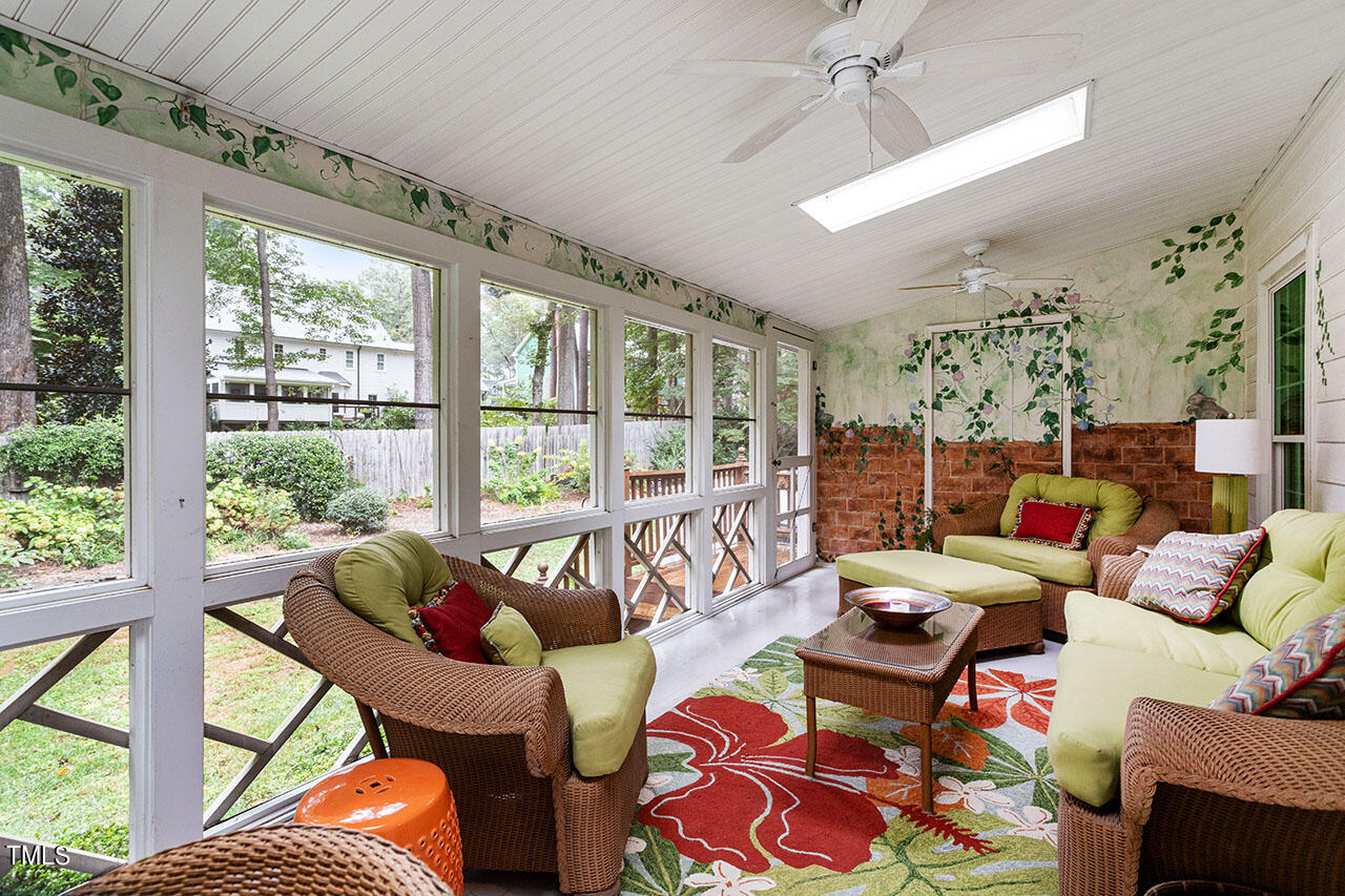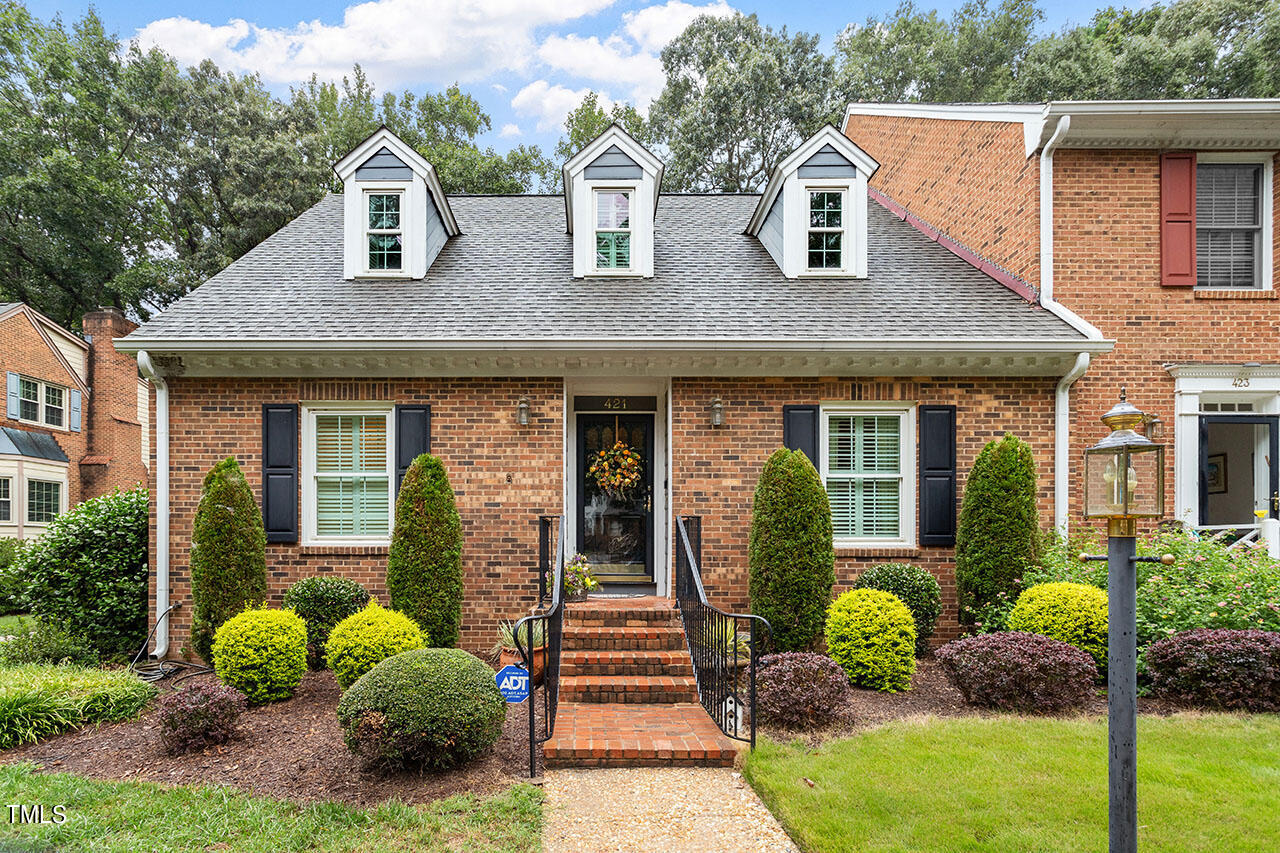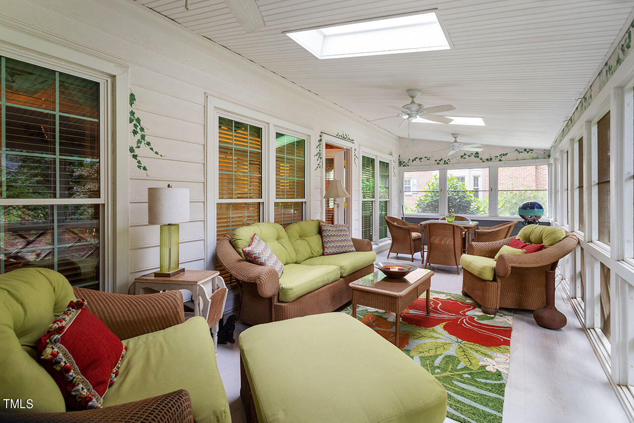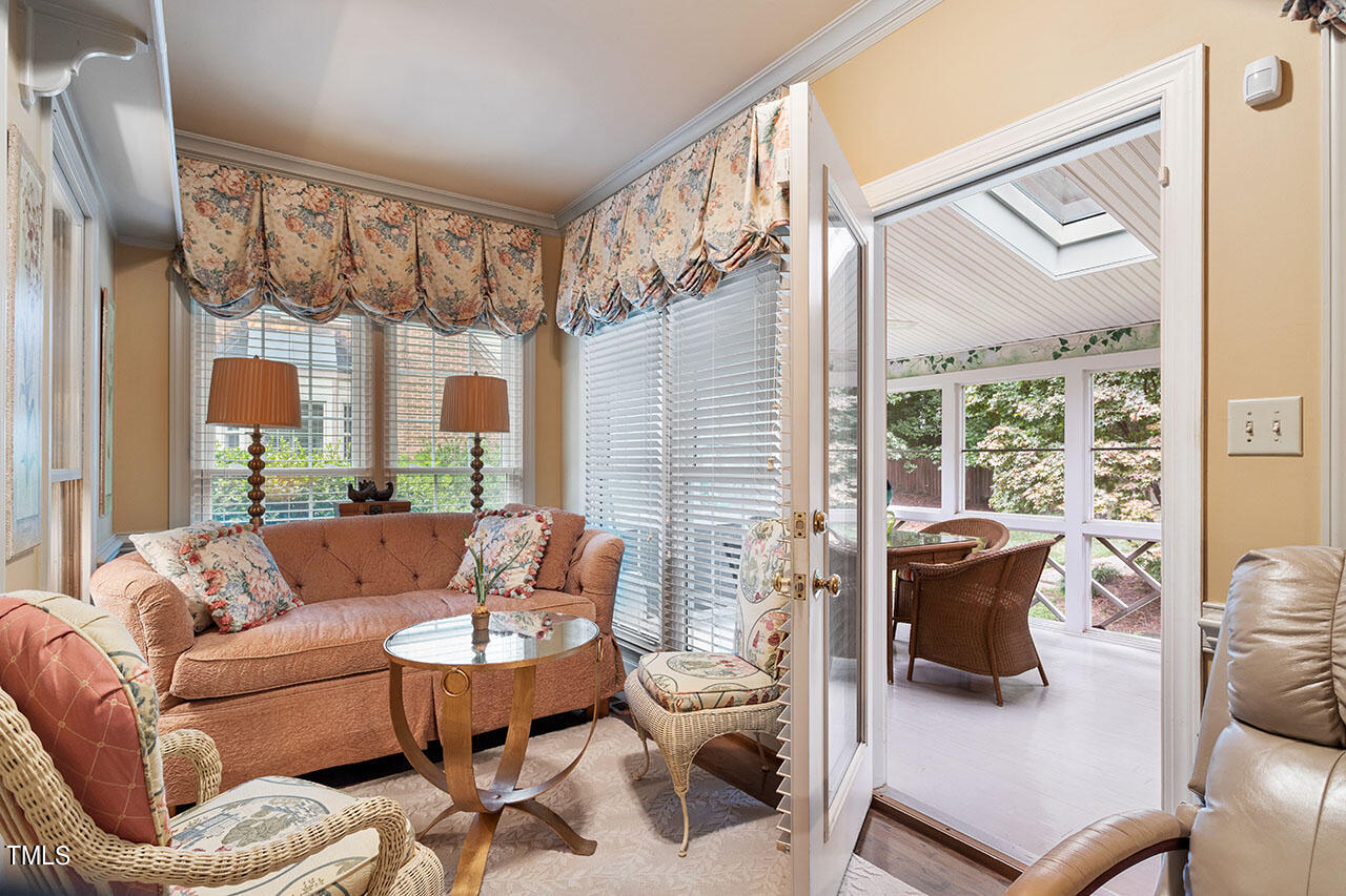 Nestled on a premiere lot within this highly desirable North Raleigh community, this end-unit townhome offers over 2,000 square feet of living space. As you step in to the entry foyer you will see a sun-filled eat-in kitchen on the left and on the right a formal dining room. The spacious great room with a fireplace offers a variety of uses for easy living and entertaining. The cozy sunroom with built-in cabinets overlooks the screened porch and is a perfect space to set up as a den or in home office. Enjoy the convenience of having the spacious primary bedroom and updated bathroom on the main level. The second floor features two additional bedrooms with a shared hall bath. Step out onto the oversized screened-in porch and take in the peaceful private view of the common area.