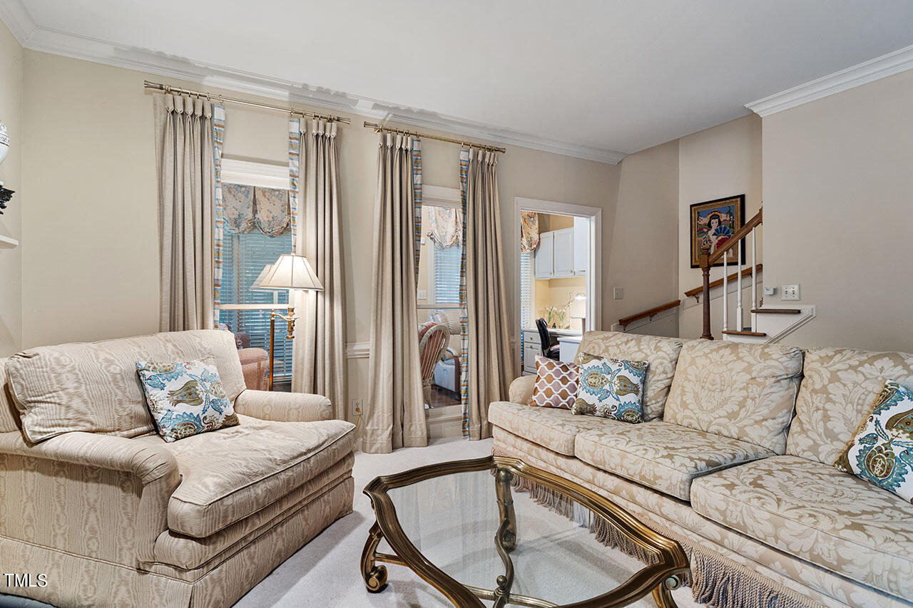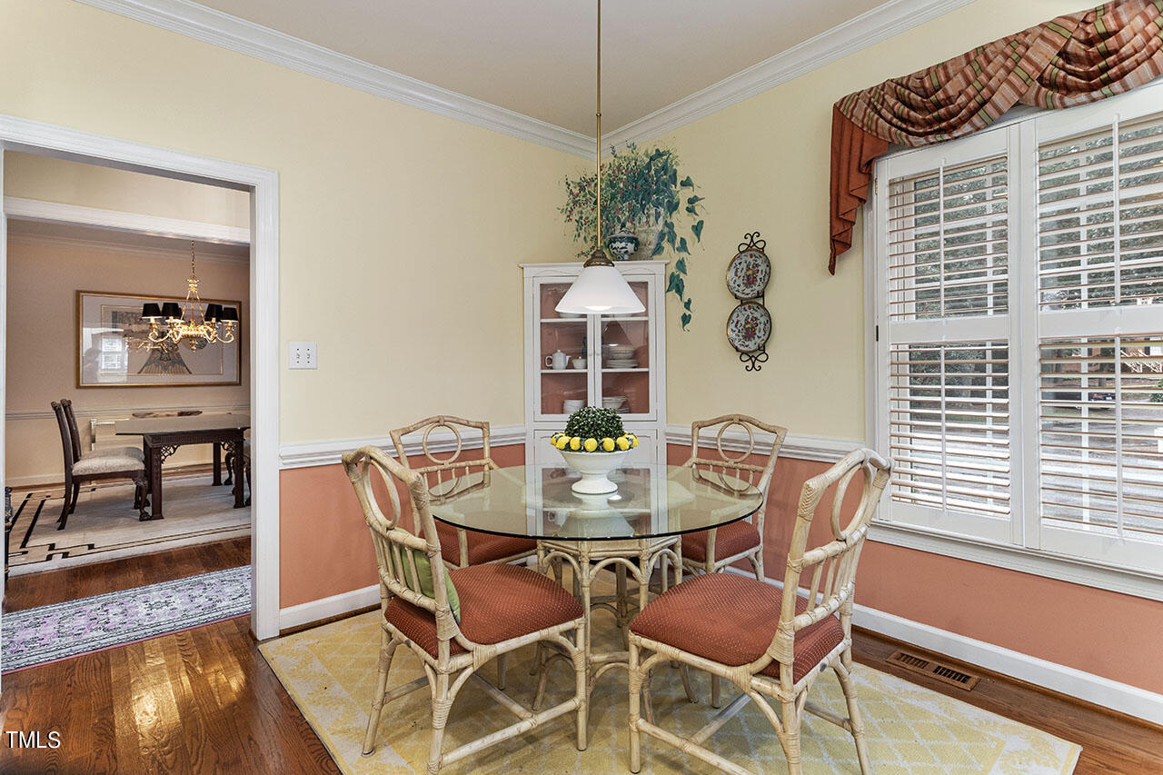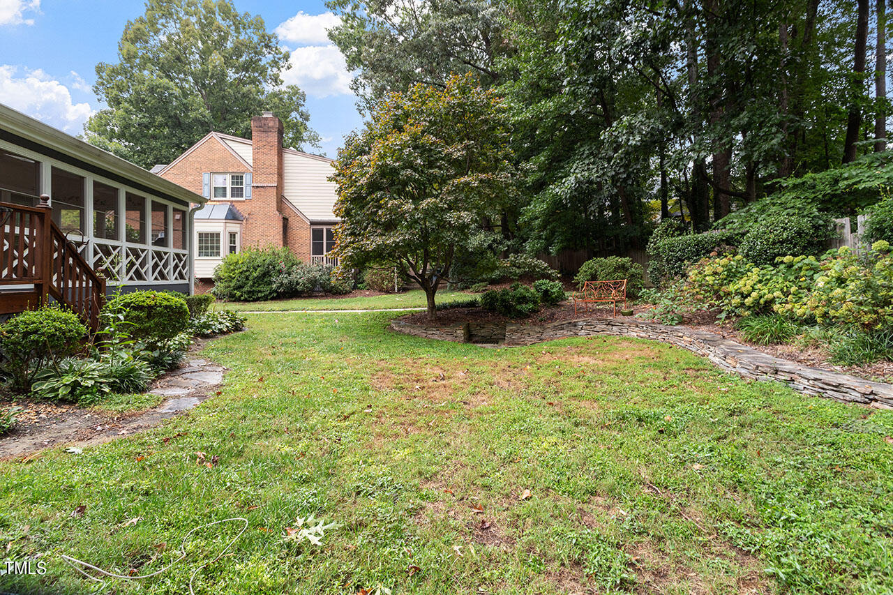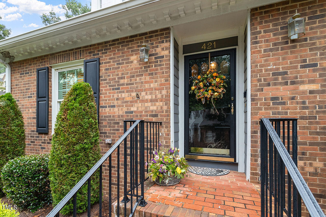 Nestled on a premiere lot within this highly desirable North Raleigh community, this end-unit townhome offers over 2,000 square feet of living space. As you step in to the entry foyer you will see a sun-filled eat-in kitchen on the left and on the right a formal dining room. The spacious great room with a fireplace offers a variety of uses for easy living and entertaining. The cozy sunroom with built-in cabinets overlooks the screened porch and is a perfect space to set up as a den or in home office. Enjoy the convenience of having the spacious primary bedroom and updated bathroom on the main level. The second floor features two additional bedrooms with a shared hall bath. Step out onto the oversized screened-in porch and take in the peaceful private view of the common area.