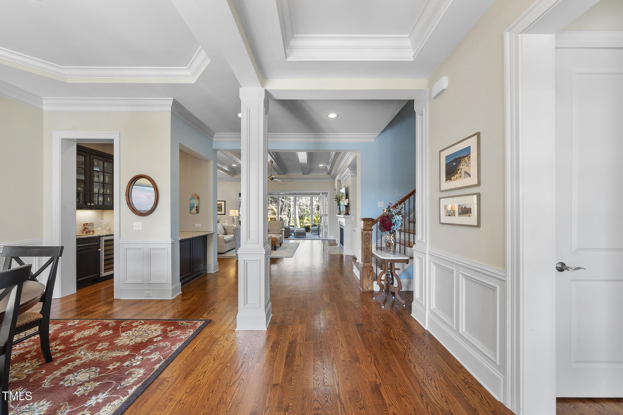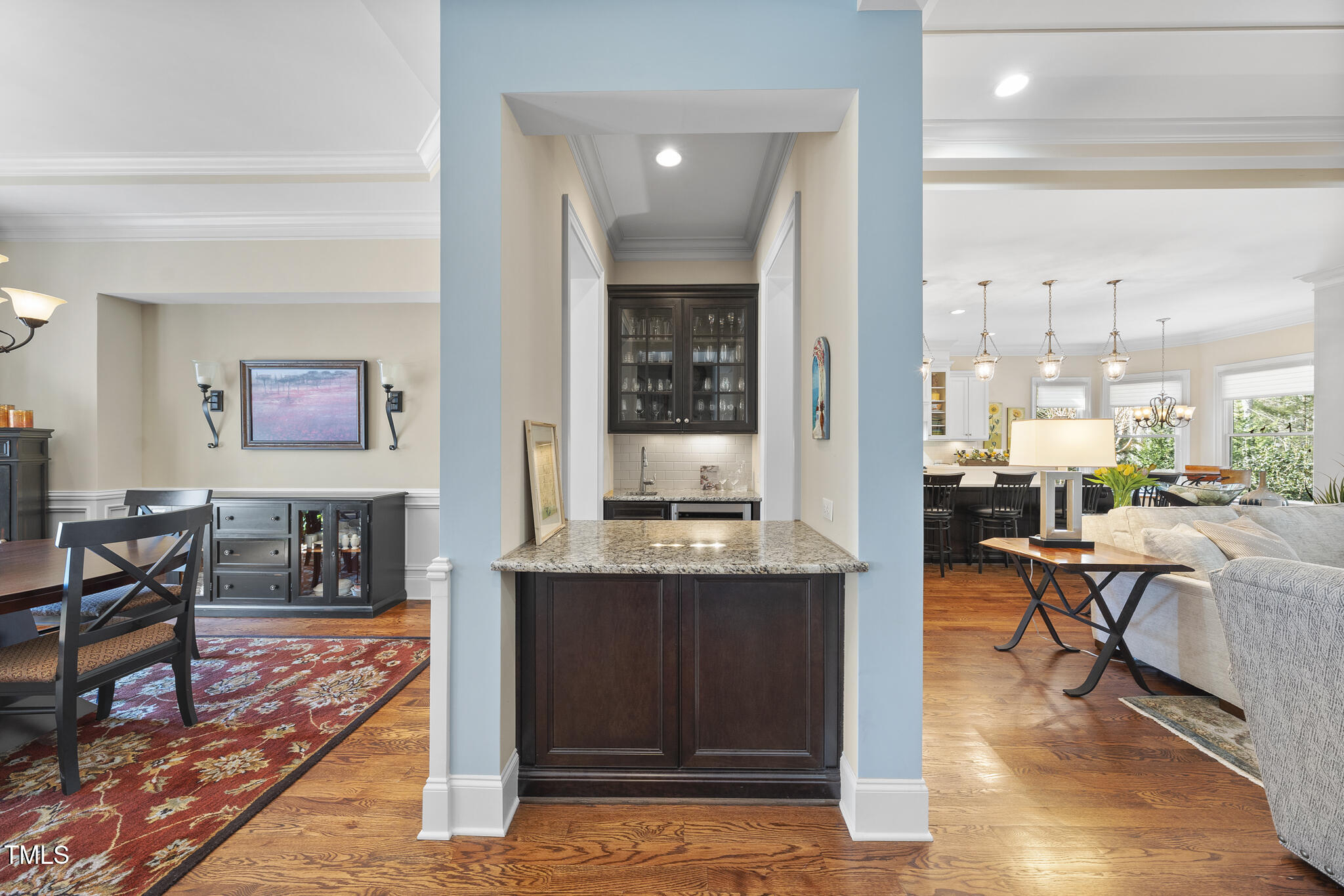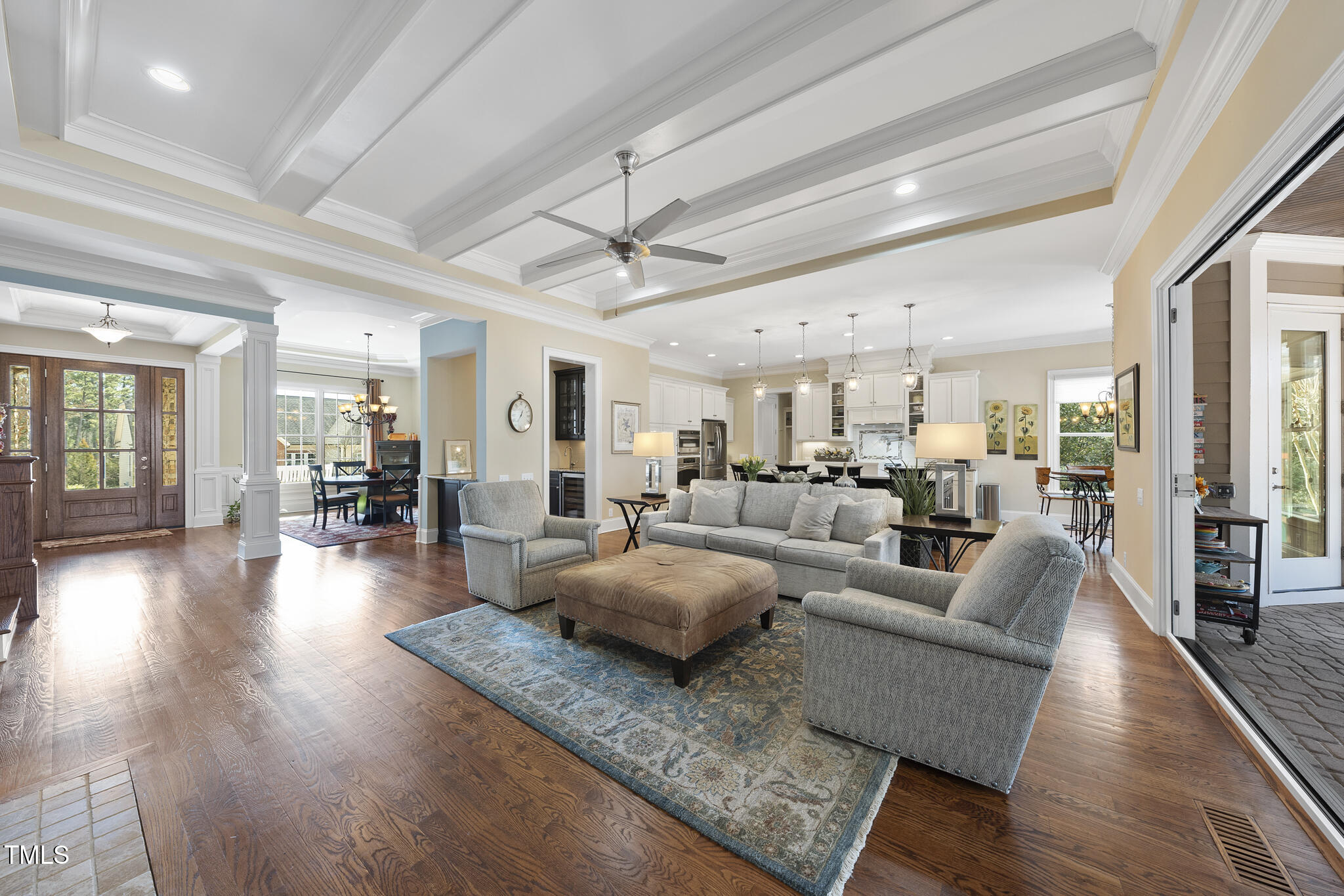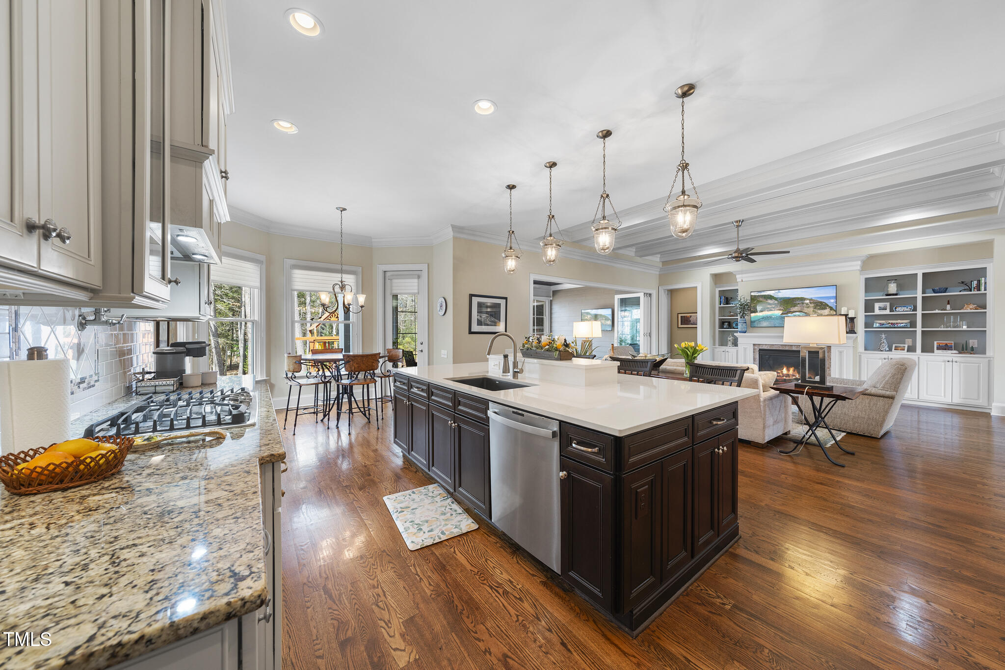 • other interior Features Bar, Bathtub/Shower Combination, Bookcases, Built-in Features, Ceiling Fan(s), Chandelier, Coffered Ceiling(s), Crown Molding, Double Vanity, Dual Closets, Eat-in Kitchen, Entrance Foyer, Granite Counters, Kitchen Island, Open Floorplan, Pantry, Master Downstairs, Quartz Counters, Recessed Lighting, Separate Shower, Smart Thermostat, Smooth Ceilings, Storage, Tray Ceiling(s), Walk-In Closet(s), Walk-In Shower, Water Closet, Wet Bar, Wired for Data