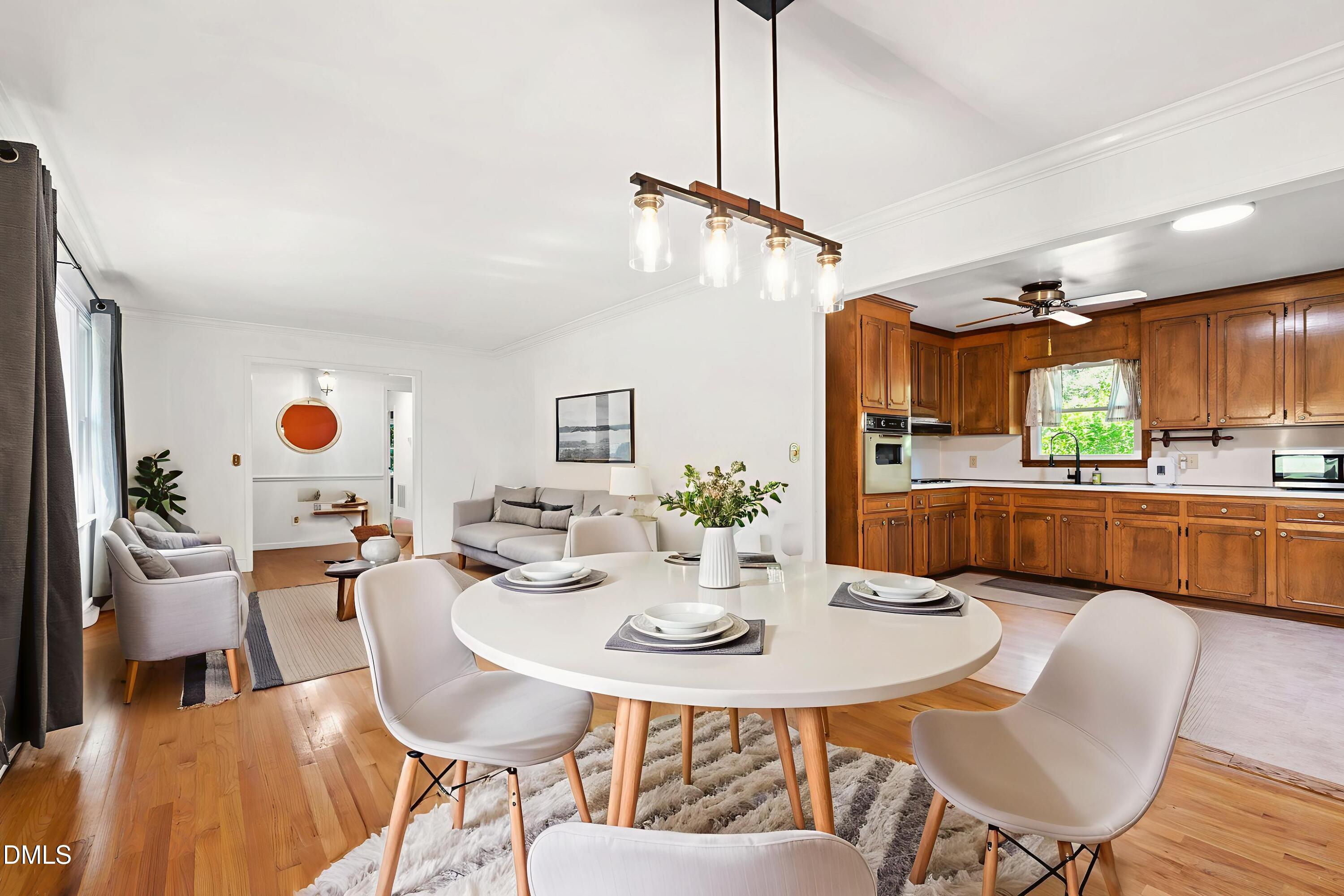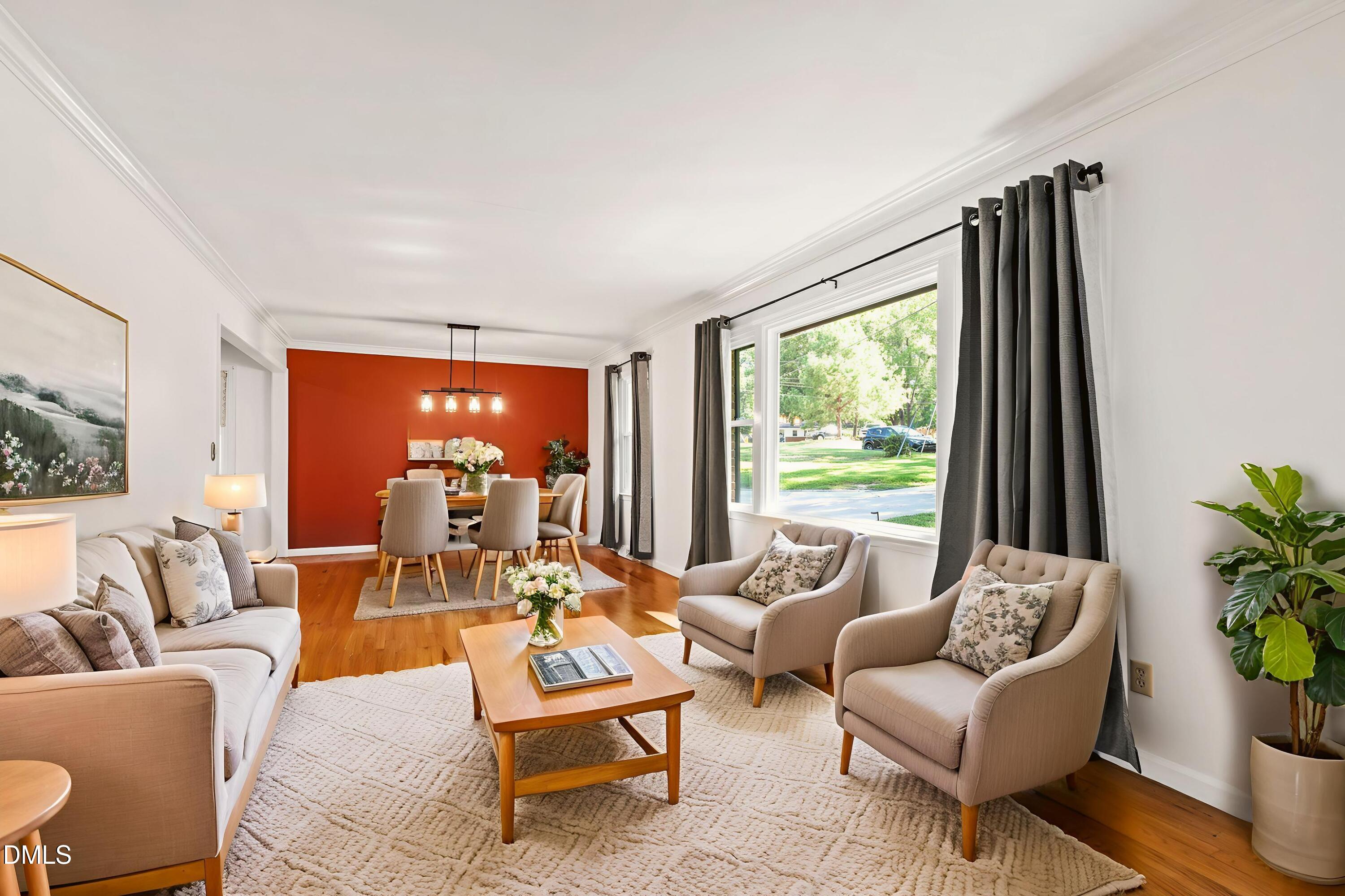 A retro-inspired 1971 brick ranch that blends vintage character with thoughtful and practical updates. Perfect for young professionals or couples who crave something more unique than a new build, this home has fantastic curb appeal with fresh exterior paint, all new windows, and a newly landscaped yard, plus a welcoming front storm door that fills the space with natural light. Inside, you'll find a bright, open living and dining room, a cozy family room with a wood-burning fireplace, and a kitchen that proudly shows off its original, well-maintained 70's appliances alongside classic wood cabinetry, new flooring, and updated light fixtures. Three bedrooms, including a private primary suite with a new ceiling fan, provide plenty of space, while original hardwoods beneath the carpet offer even more potential. Major upgrades have already been taken care of - new roof, brand-new windows with warranty, updated plumbing and electrical, attic insulation, serviced HVAC, and updated light fixtures - leaving room for you to add your own style without worrying about big-ticket items. Outside, enjoy an expansive restained deck overlooking a large, level backyard with a natural privacy buffer that extends past the creek, perfect for grilling or gathering friends. Tucked in an established South Raleigh neighborhood with mature trees and no HOA, you'll love the easy access to I-40, quick commute downtown, and walkability to the nearby park. Plus, qualified buyers could receive up to $20,000 in down payment and closing cost assistance through programs offered by First Citizens Bank & First National Bank - ask the agent for details!