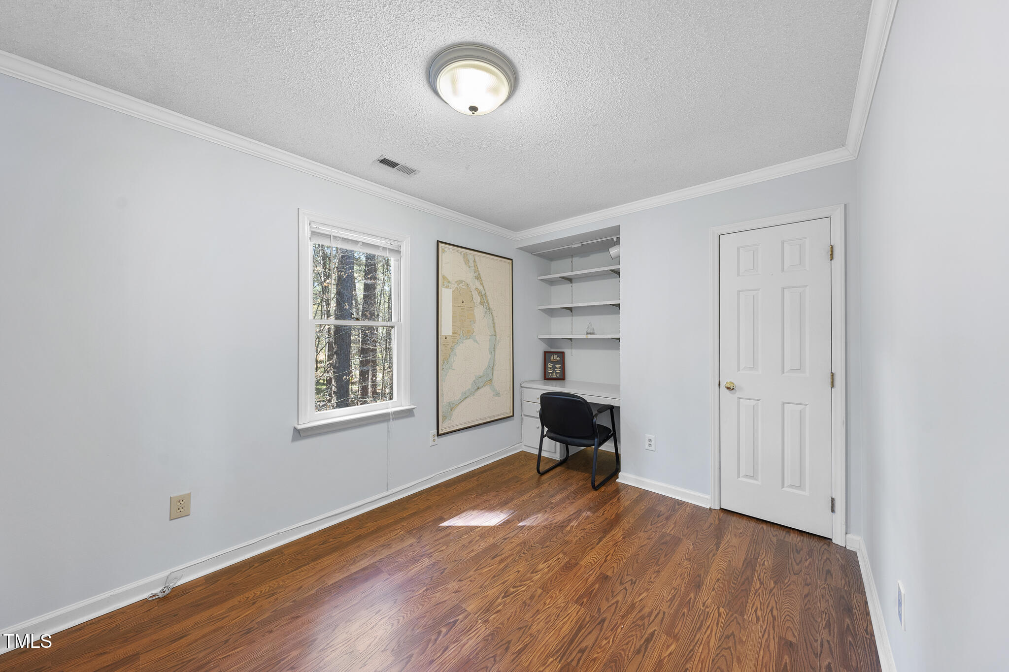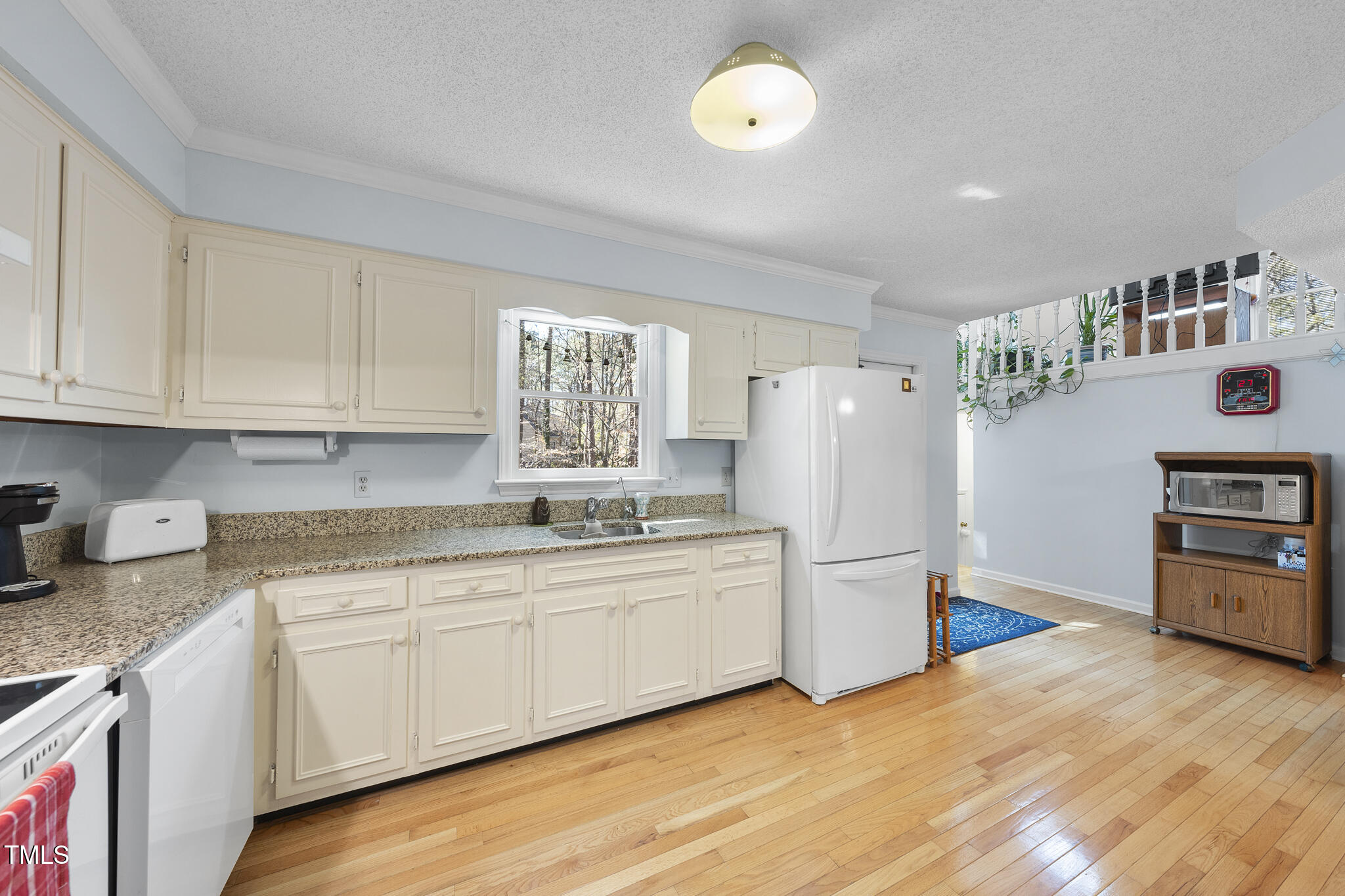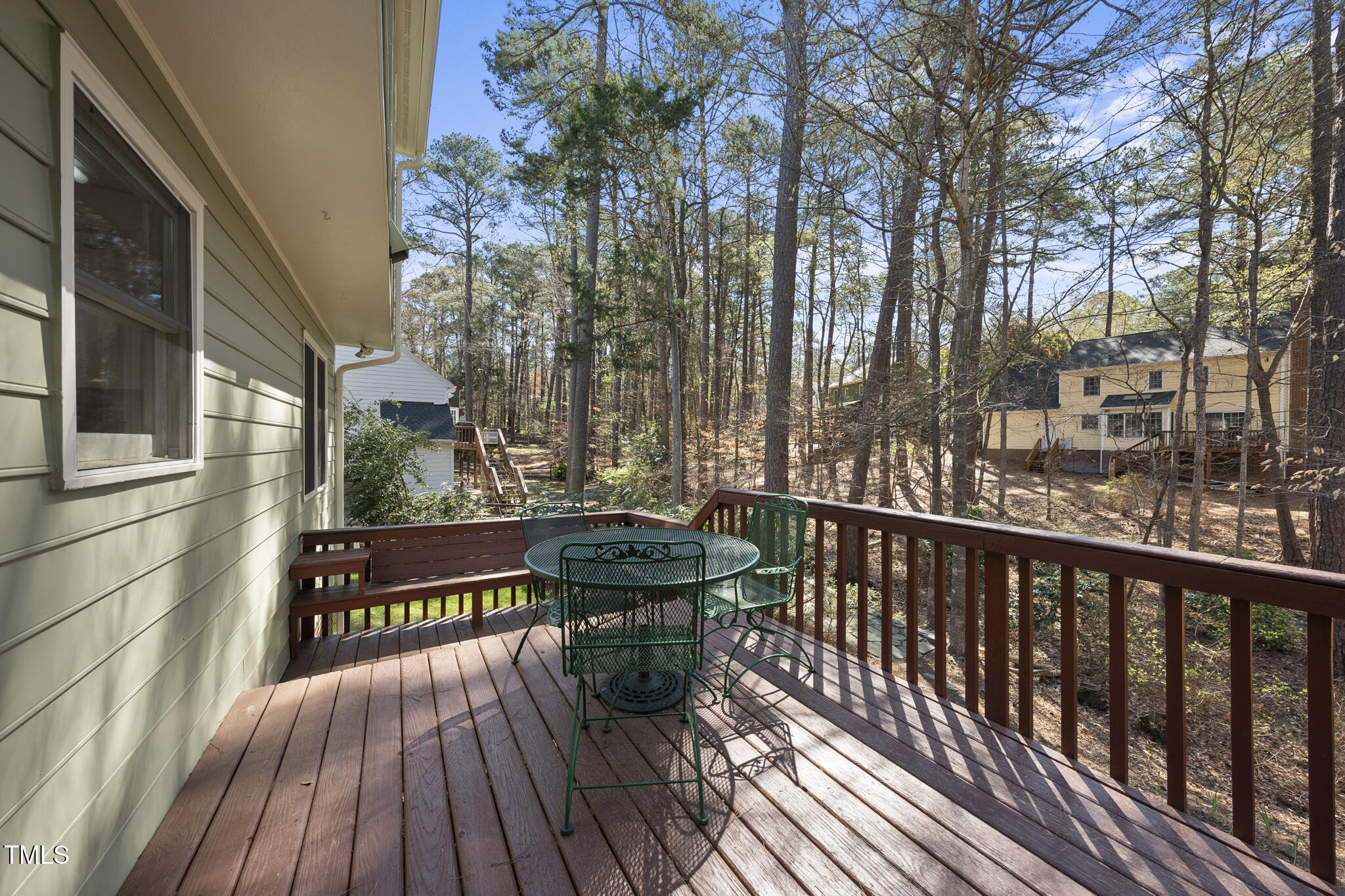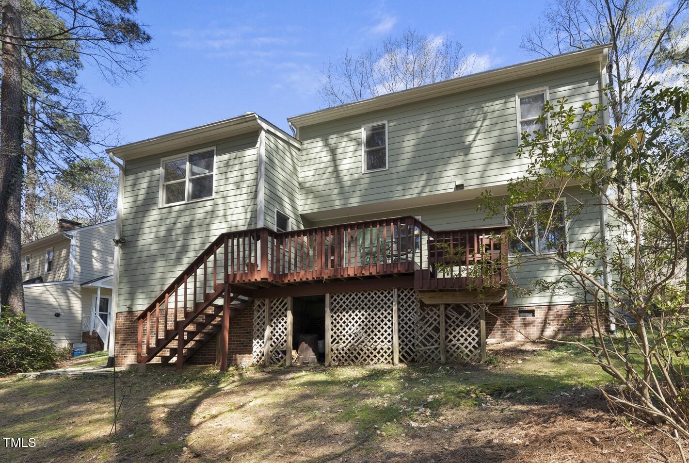 Close to the Southpoint area, this charming home is located in Durham's ultra-desirable Woodcroft subdivision. Set on a tranquil, partially wooded .25 ac lot and backing to a stream, you are just steps from the community trail system that feeds directly into the American Tobacco Trail. This home has had many recent improvements including interior paint (24/25), exterior paint in '22, crawl space encapsulated in '23, new dishwasher in '23, water heater in '22, roof in '19, and furnace in '24. Inside you'll find a main level with a spacious family room with wood burning fireplace, dining room, large kitchen with granite counter tops, breakfast room, half bath and with just few steps up, a unique loft with skylights, built-in desk and bookshelves. The primary bedroom features dual custom wall-unit closets with drawers and en-suite bath, two secondary bedrooms and a full bath.