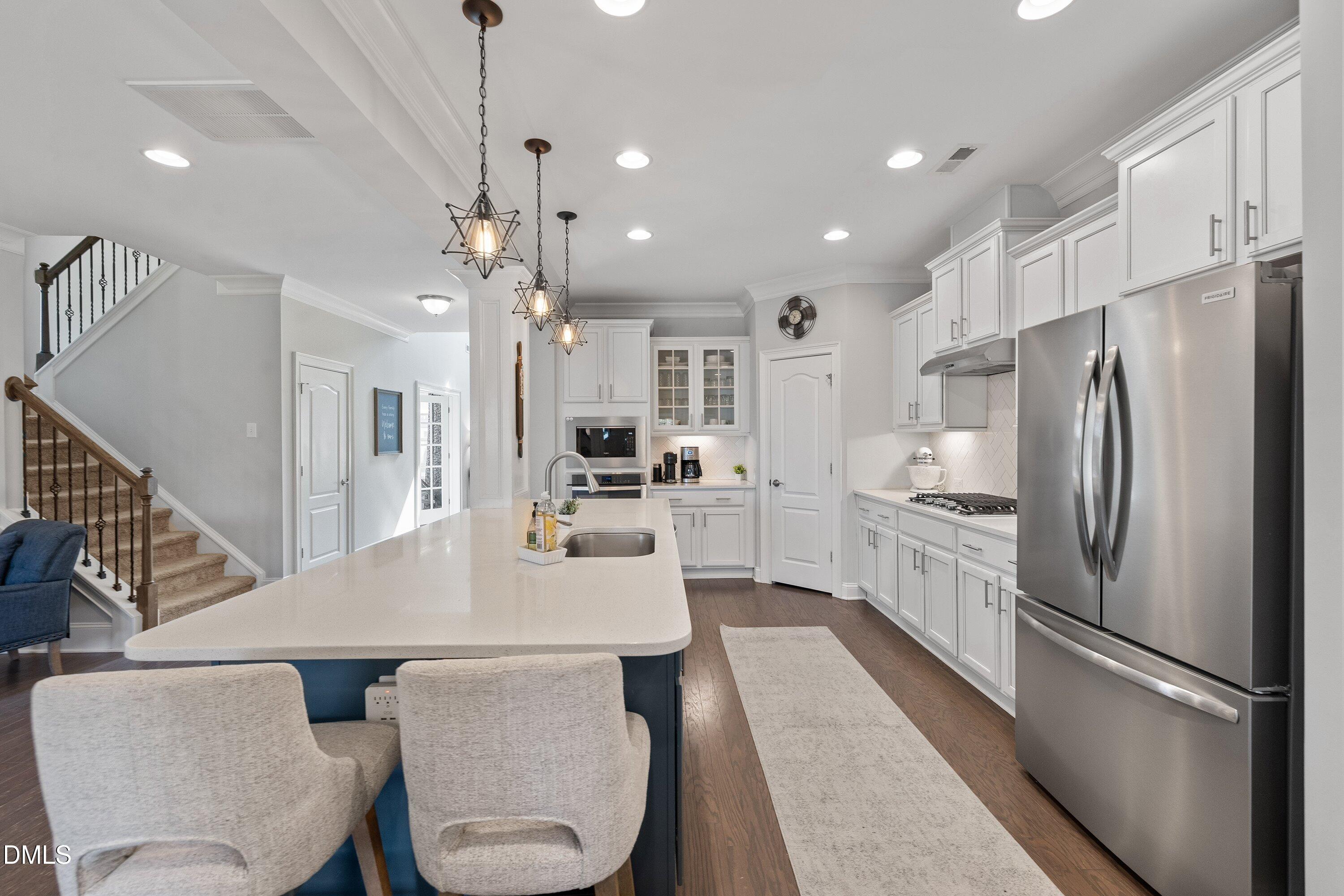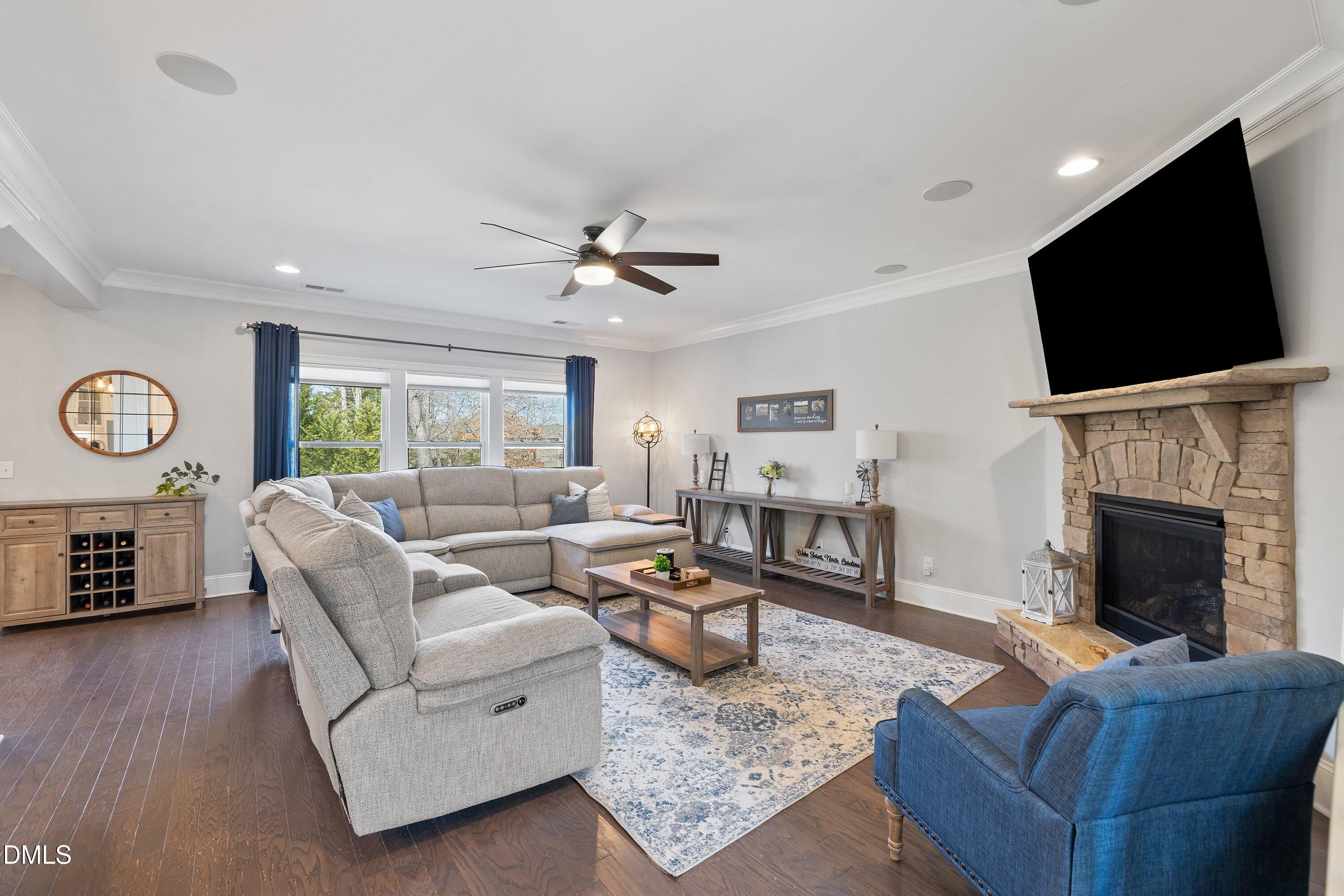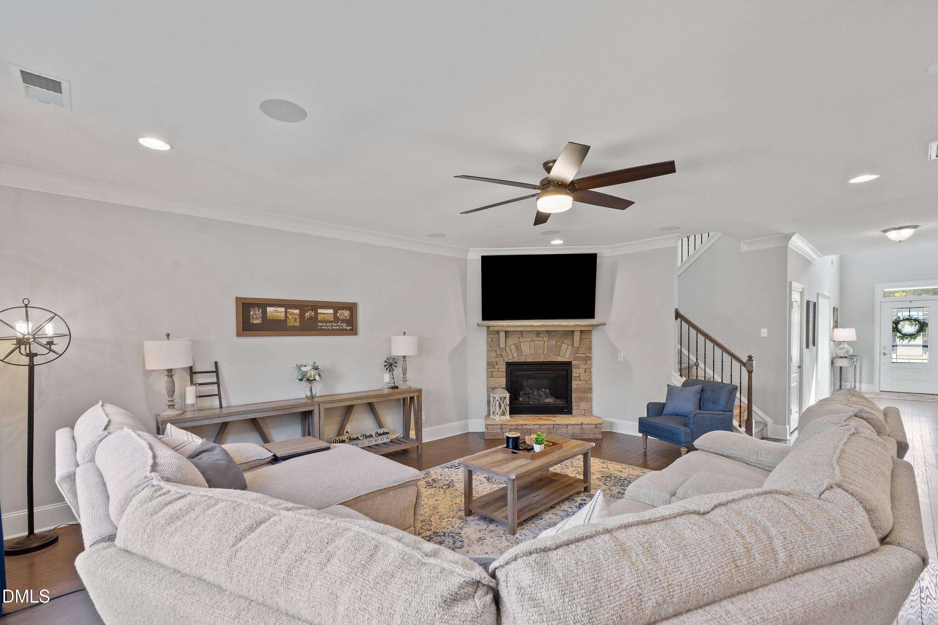 Step inside this stunning Wake Forest home with a bright, open floor plan and a grand two-story foyer! Perfectly designed for modern living and entertaining, this home features a formal dining room, private office, and a stunning kitchen with custom cabinets, stainless steel appliances, gas cooktop, tile backsplash, and a massive island that flows into the family room with a gorgeous stone fireplace and surround sound.
