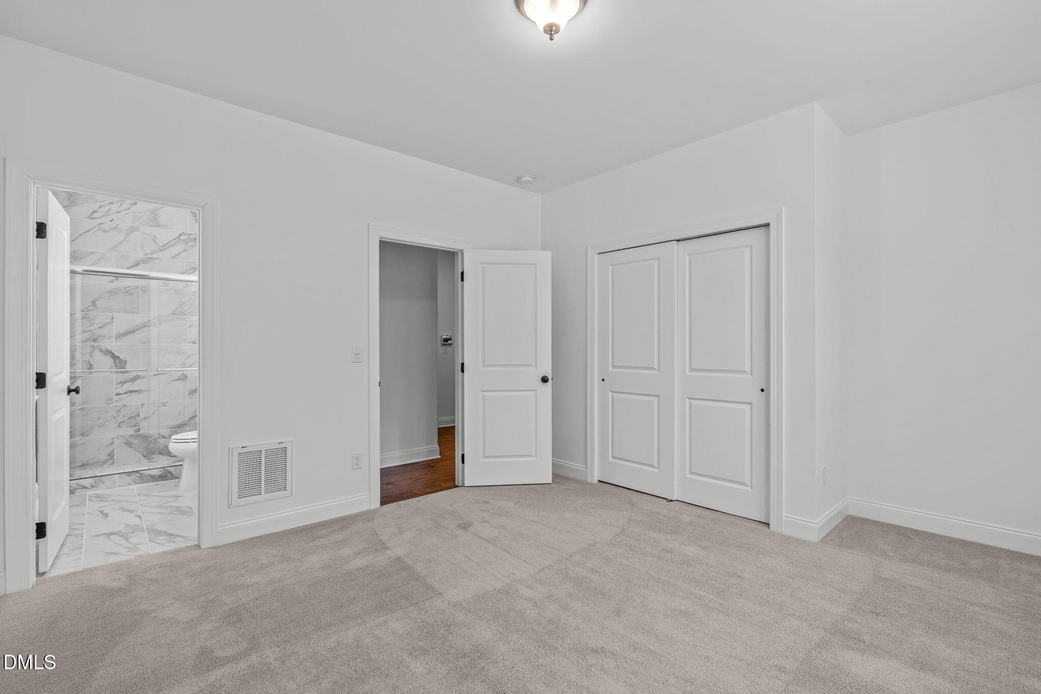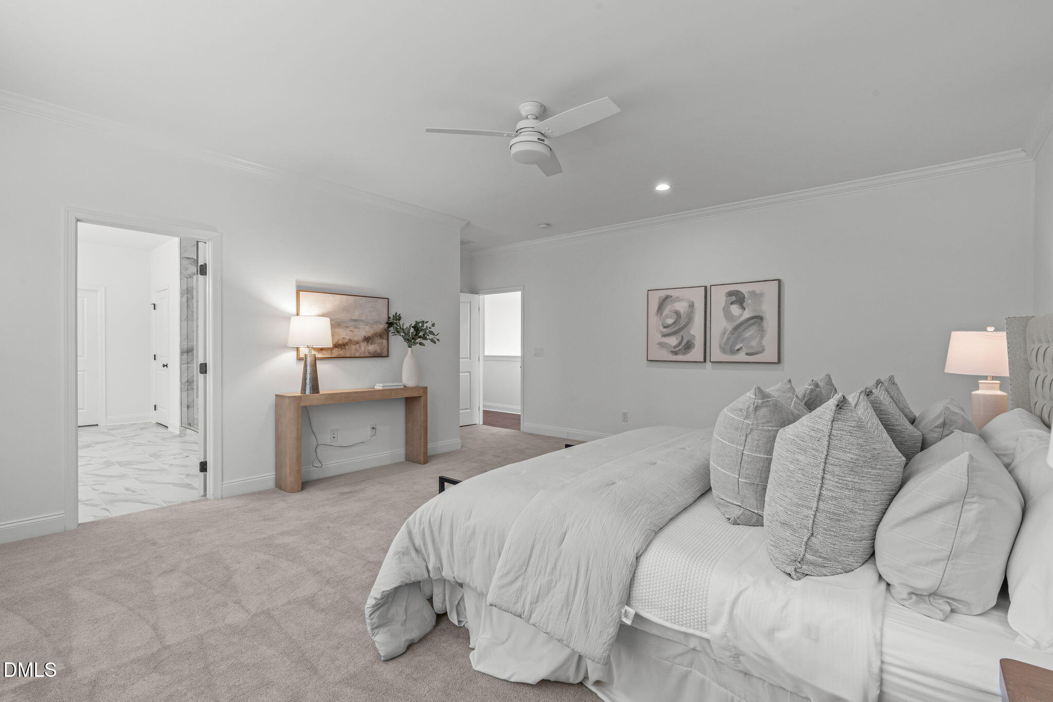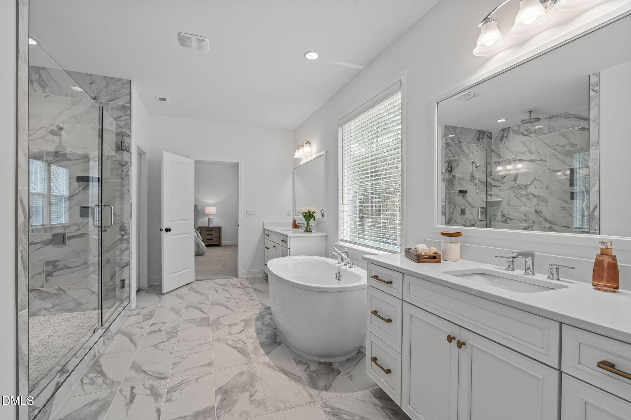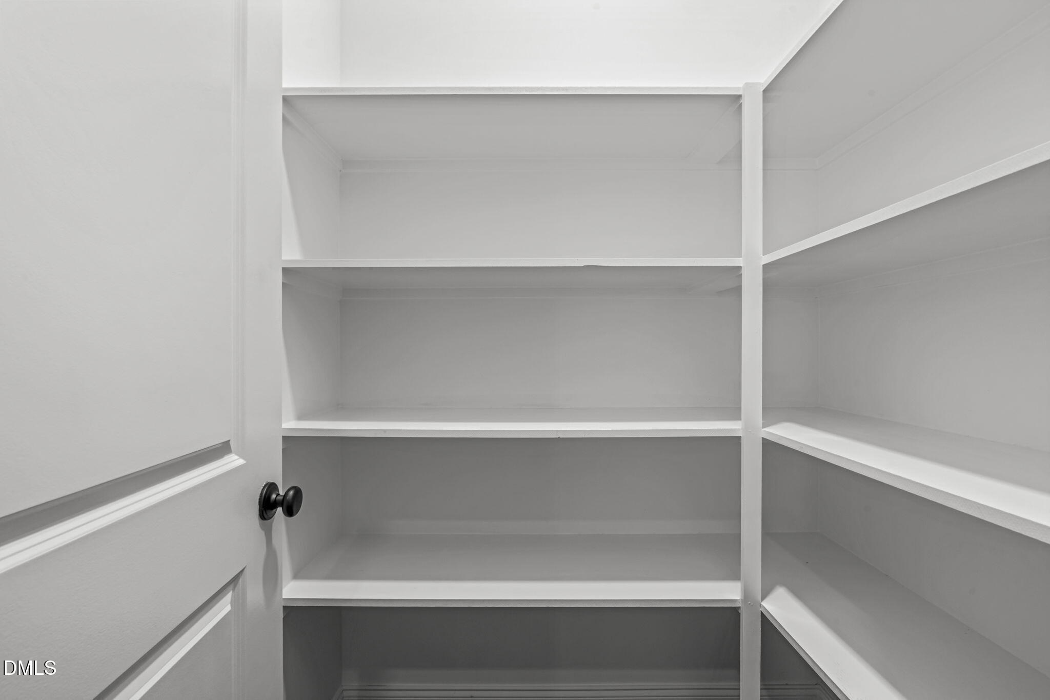 Upstairs, the south-facing primary suite serves as a private retreat. The spa-inspired bath features a soaking tub, dual vanities, and an expansive walk-in shower with two shower heads, including a rain shower head, along with three body jets. A spacious walk-in owner's closet provides generous wardrobe space, and an additional linen closet within the bath provides practical storage. Three additional bedrooms offer comfortable accommodations, supported by well-appointed baths. The large laundry room is conveniently located on the upper level and includes a utility sink and additional cabinetry with roll out trays. A substantial walk-in storage closet with built-in shelving is positioned adjacent to the laundry room, providing valuable additional storage.