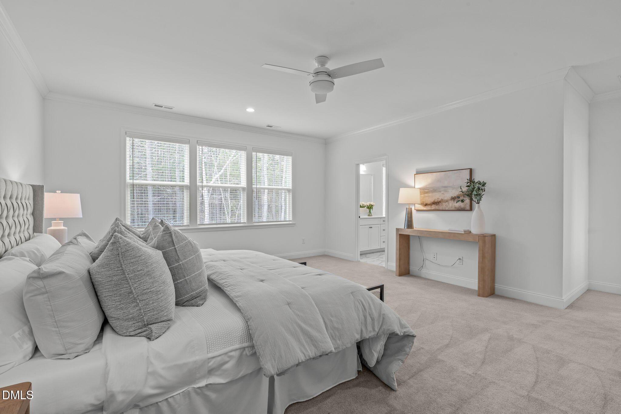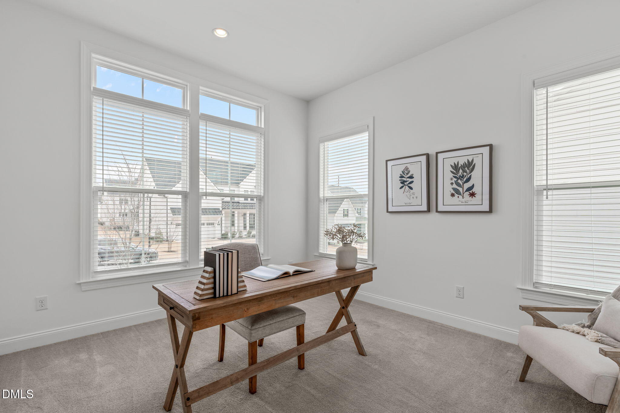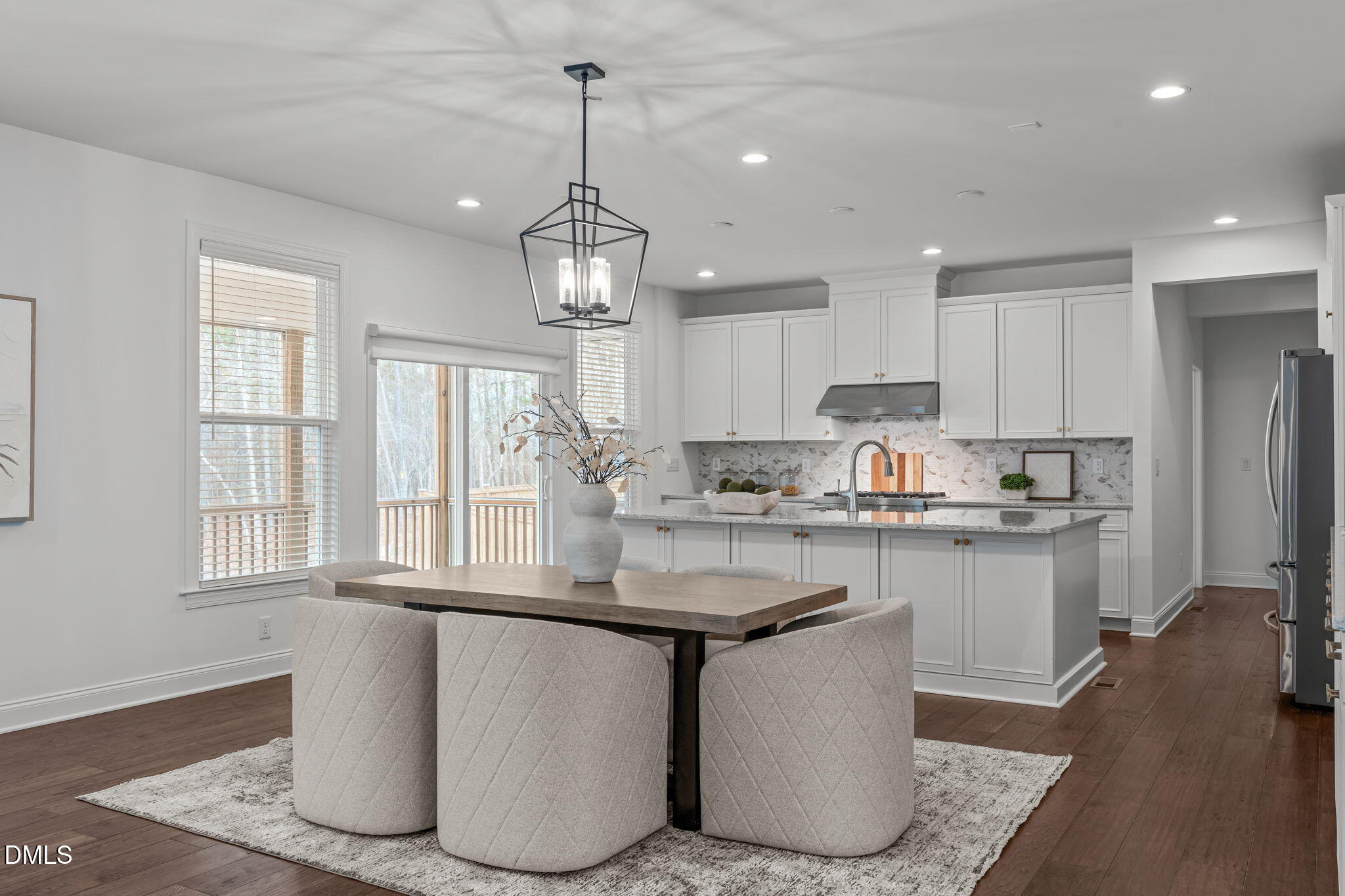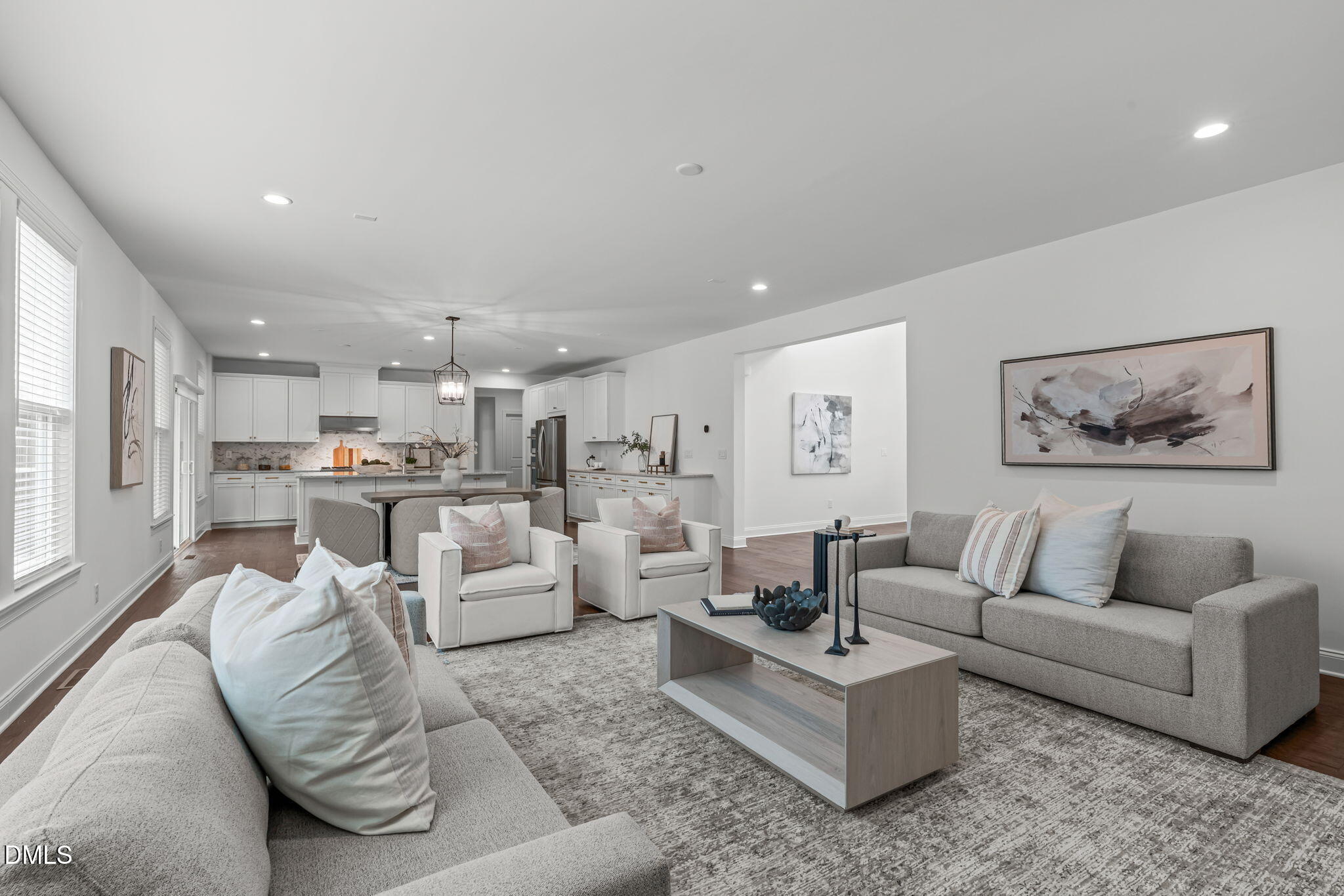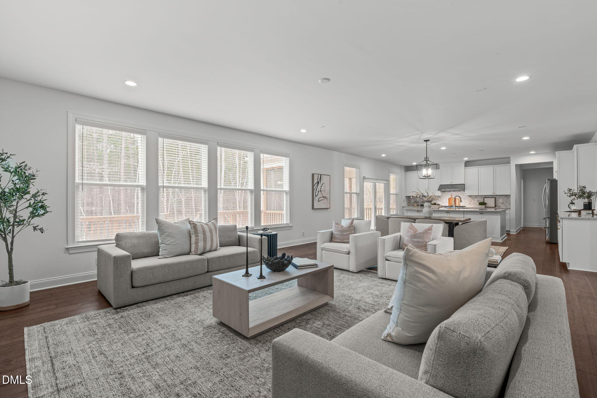 At the center of the residence, a thoughtfully designed culinary space balances beauty and performance. Quartz countertops and an oversized island anchor the room, complemented by JennAir built-in appliances, including a six burner gas cooktop with vented hood and a built-in convection oven. Expansive cabinetry with integrated island storage and roll out trays provides thoughtful functionality. Soft close cabinetry and drawers are featured throughout the home, reinforcing quality craftsmanship. Open sightlines connect the kitchen seamlessly to the living and dining areas, creating an inviting environment for both entertaining and everyday living.