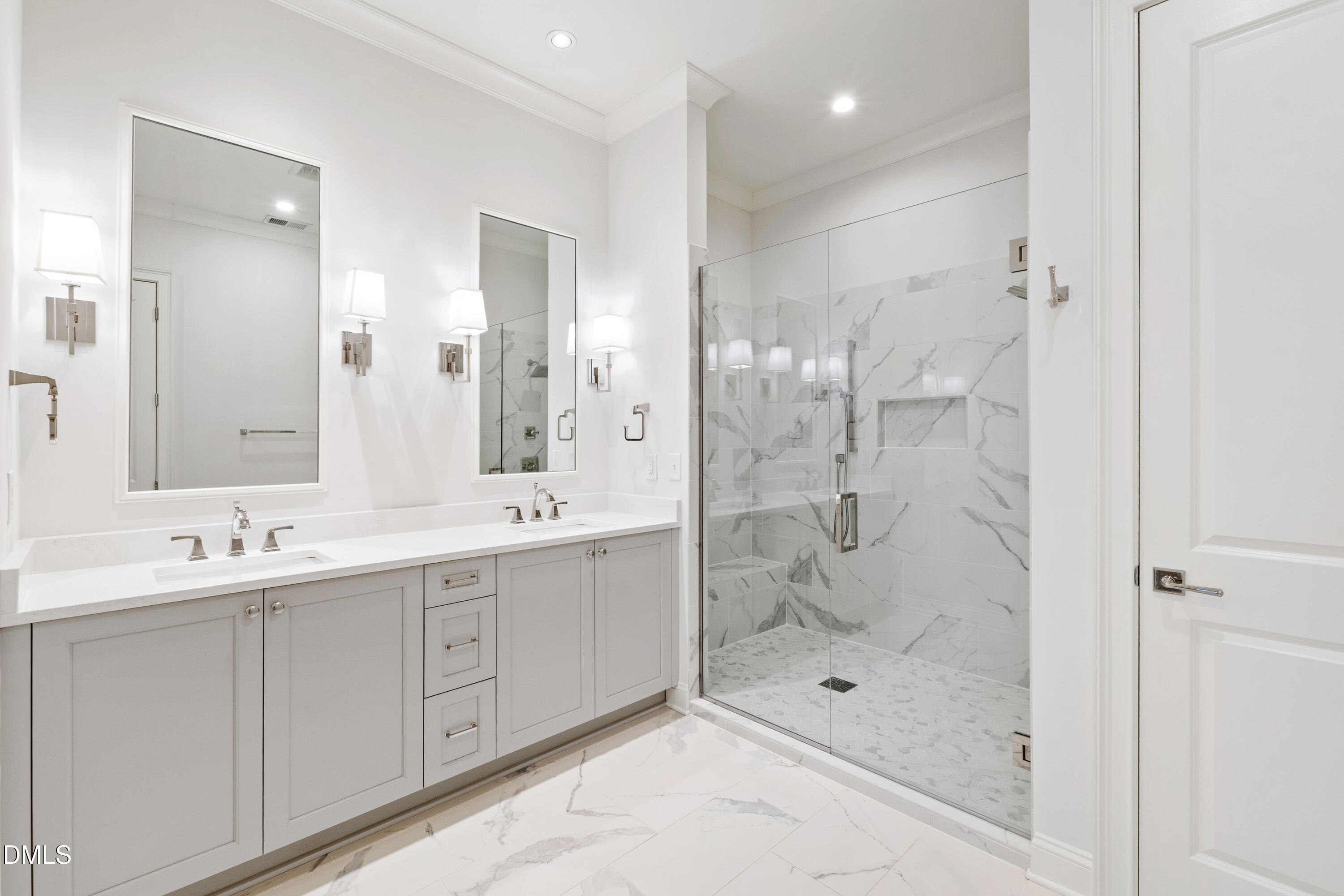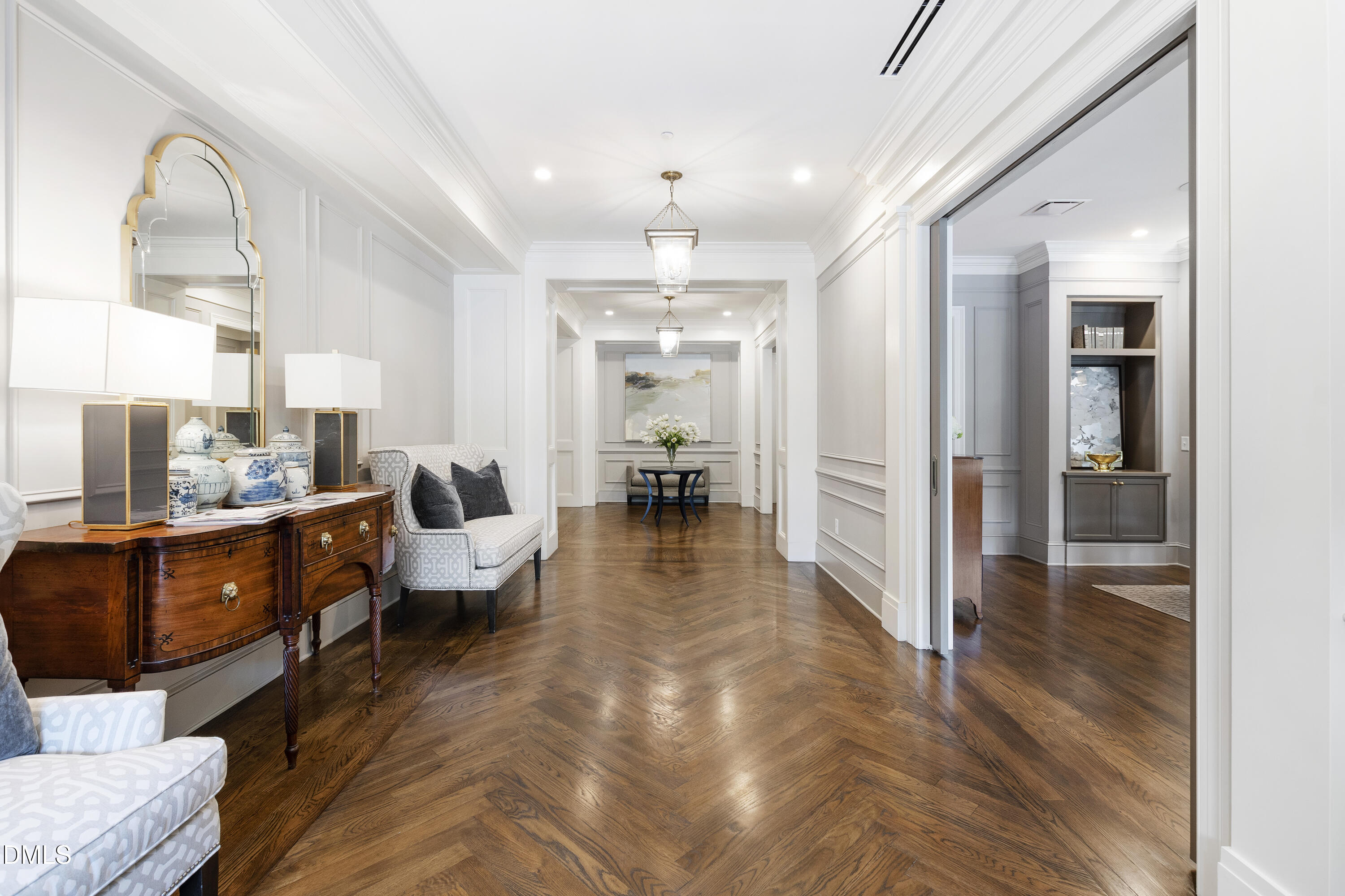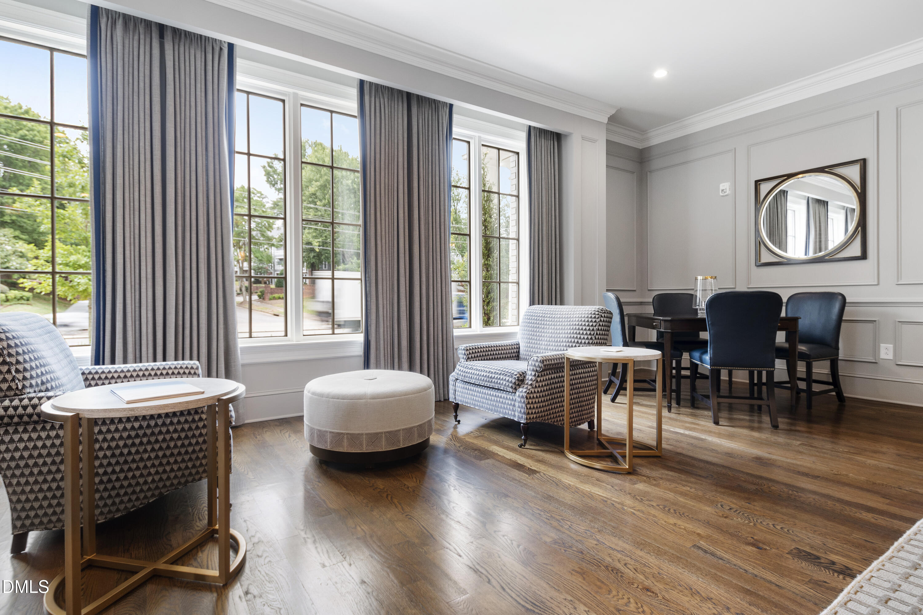 Nestled on the first floor in the back section of The Wade, this luxurious one-level residence offers a perfect blend of elegance and comfort. Freshly painted and ready for new owners, this home features three spacious bedrooms and two and a half bathrooms and an open-concept design ideal for modern living. The gourmet kitchen is a chef's dream, complete with a large quartz island, premium appliances, and seamless flow into the family and dining areas, perfect for entertaining or relaxing in style. A large gas log fireplace, beautiful mill work, and site-finished hardwood floors enhance the home's sophisticated character. Step outside to your private balcony and enjoy peaceful views, making this exquisite home a true sanctuary in one of the most desirable neighborhoods in Raleigh. Building amenities include a large gathering room, an exercise room, a gorgeous roof-top terrace as well as a rose-cutting garden. In addition, there is conditioned private storage just steps from your front door and assigned parking in the covered parking garage.