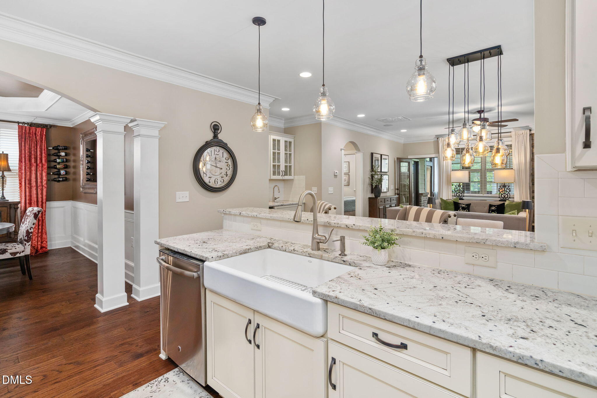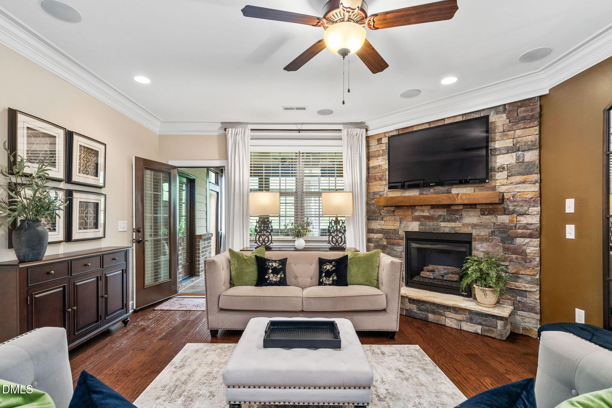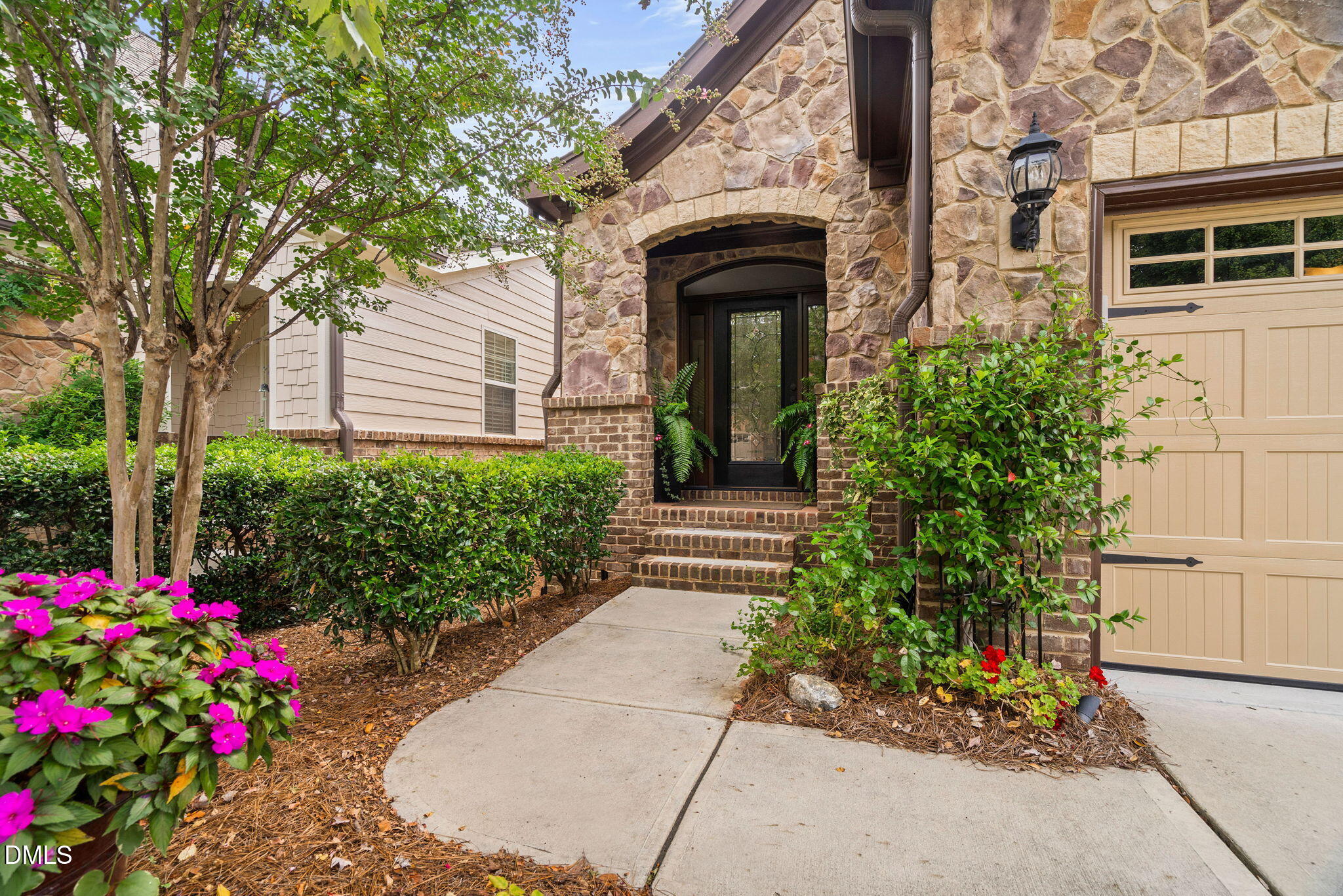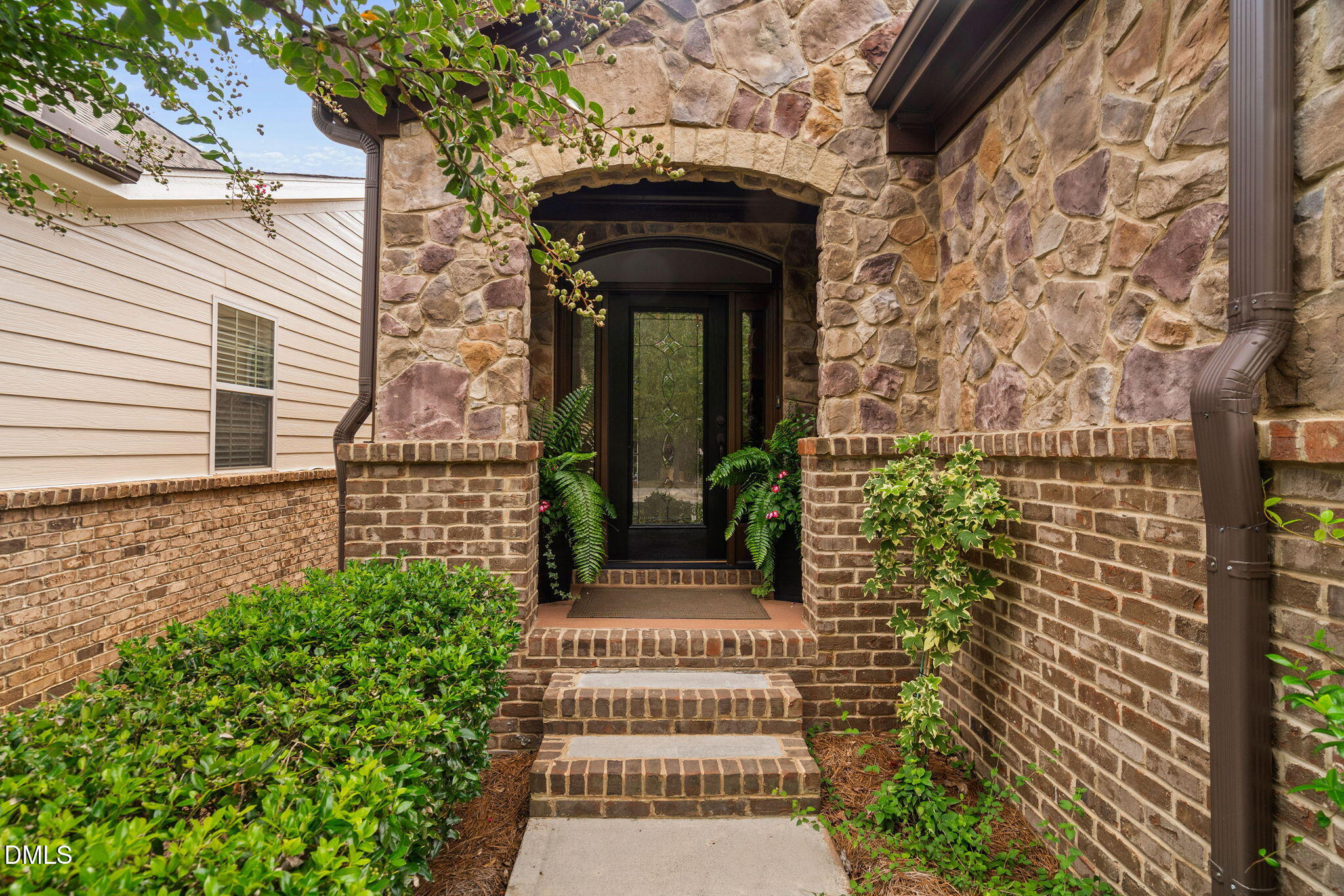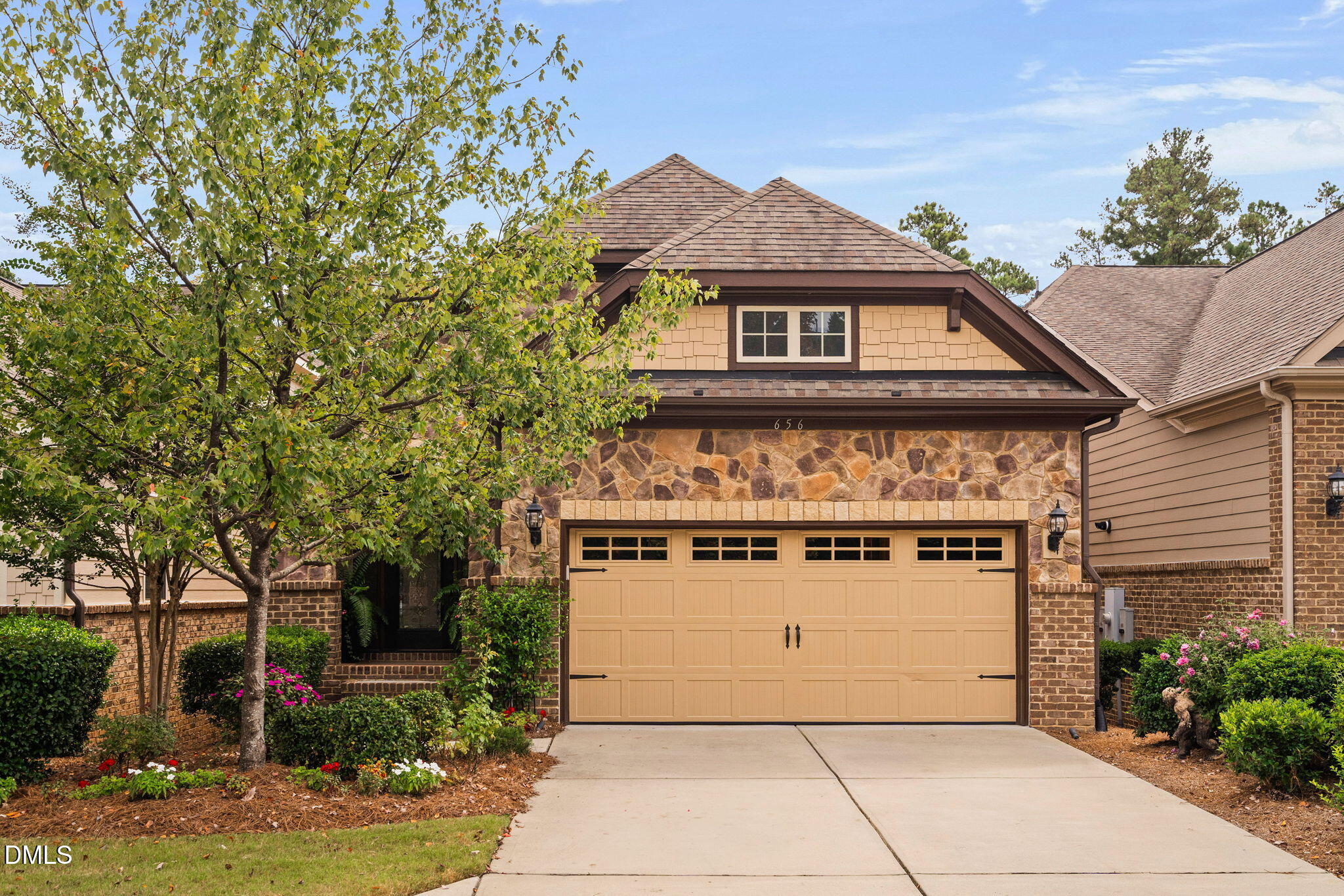 This stunning brick-and-stone front cottage home in the highly sought-after Regency community is a true showpiece. Lush landscaping and an elegant entryway set the tone, leading inside to gleaming hardwoods and a formal dining room framed by columns, tray ceiling, and detailed millwork. The gourmet kitchen boasts a large island, double oven, farmhouse sink, stylish lighting, and a breakfast bar that flows seamlessly into the dining area and family room. A stone fireplace and wet bar create a warm, welcoming gathering space. The main-level primary suite offers a tray ceiling, access to the sunroom, and a spa-inspired bath with an oversized tiled shower and dual vanities, water closet and walk-in closet. The sunroom with EZ breeze windows extends the living space outdoors, opening onto a deck overlooking the fenced yard and serene common area. The walkout lower level includes a spacious family room, private guest suite offering two additional bedrooms with en-suite baths, a second kitchen area, and a huge walk-in storage space. Enjoy low-maintenance living with HOA-maintained lawn, common areas, and exterior care. Ideally located near Koka Booth Amphitheatre, Life Time Fitness, Cary's Symphony Lake trails, top medical facilities, shopping, and dining.