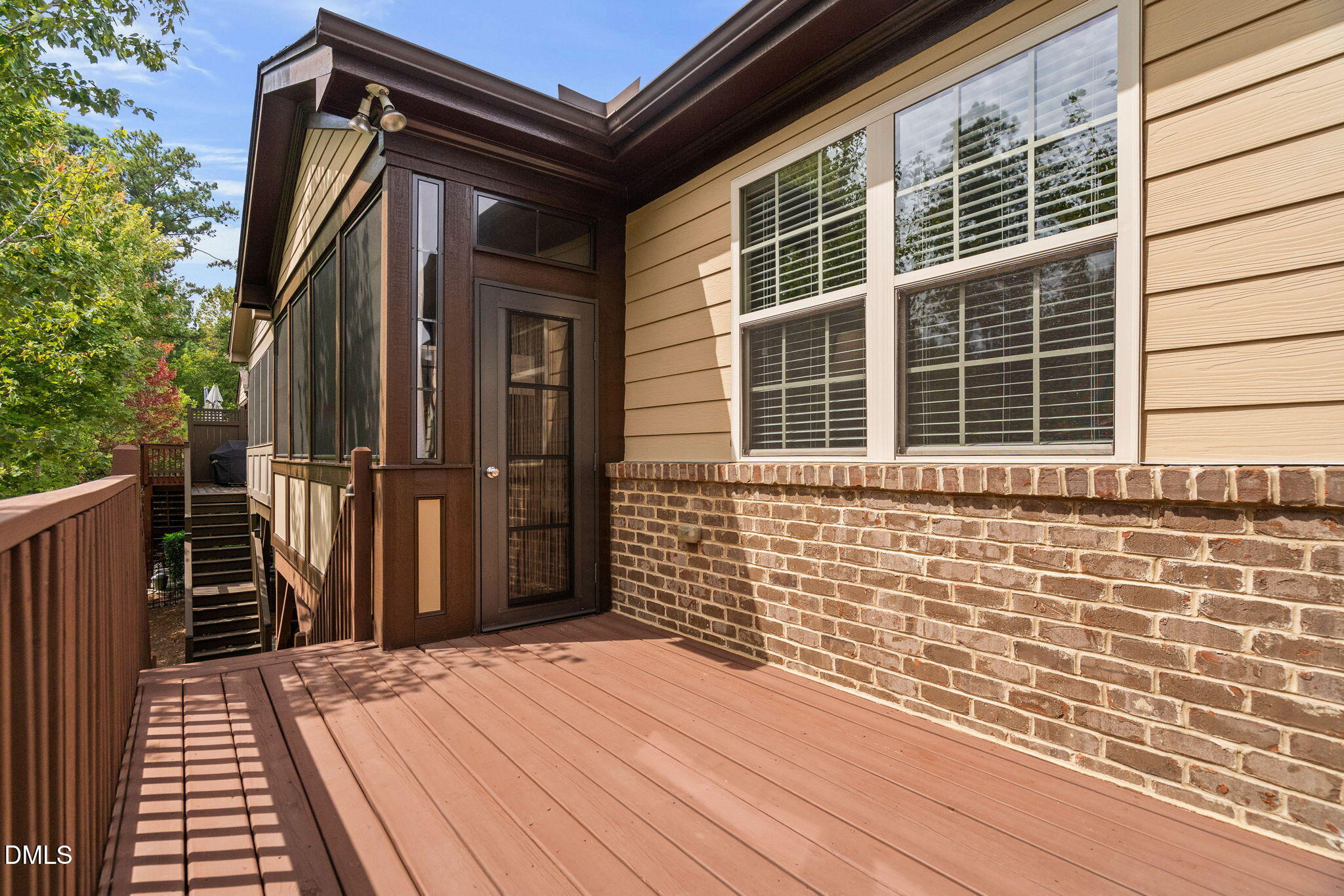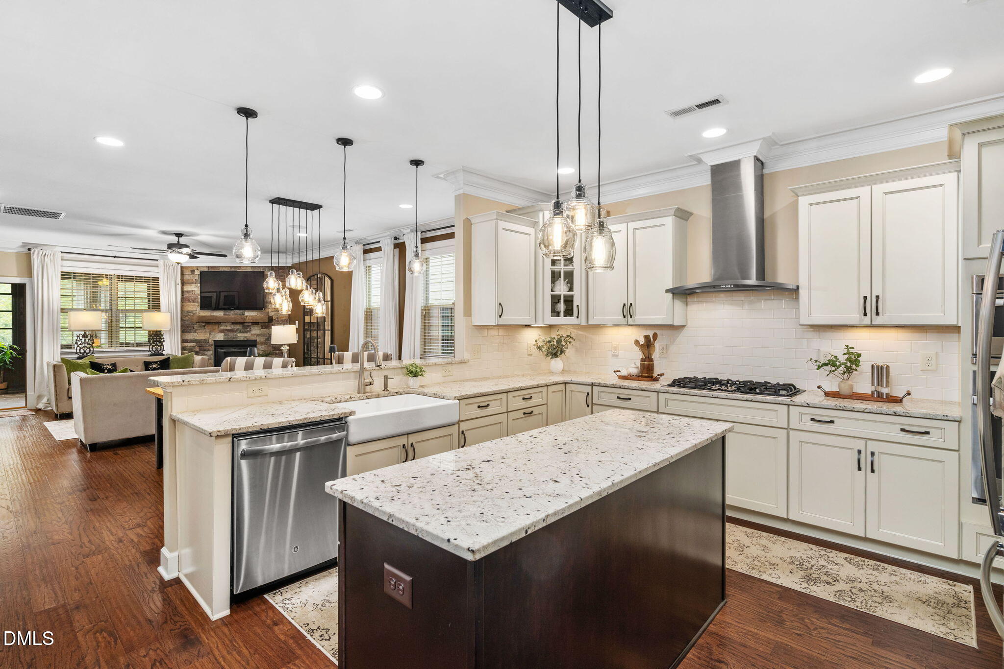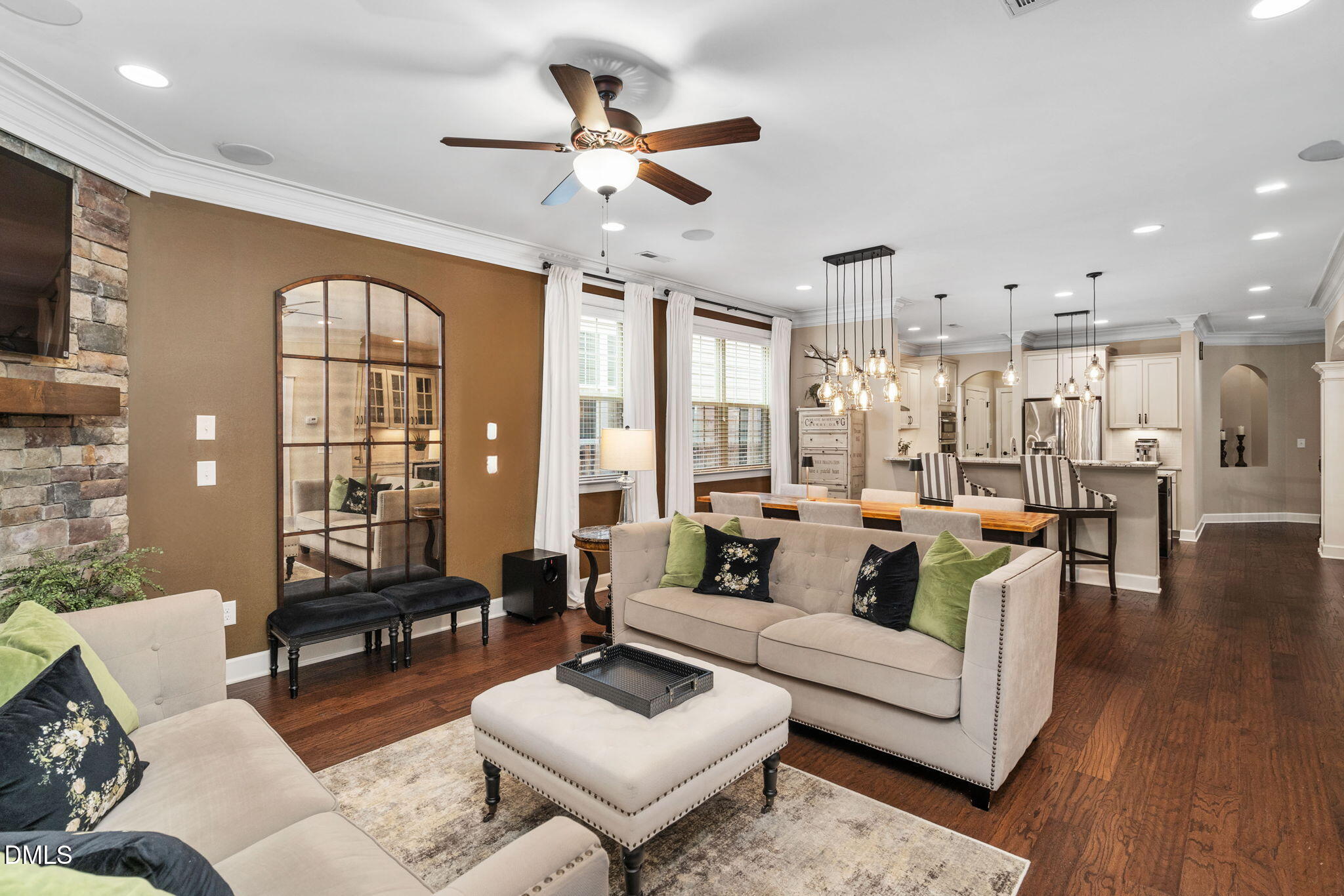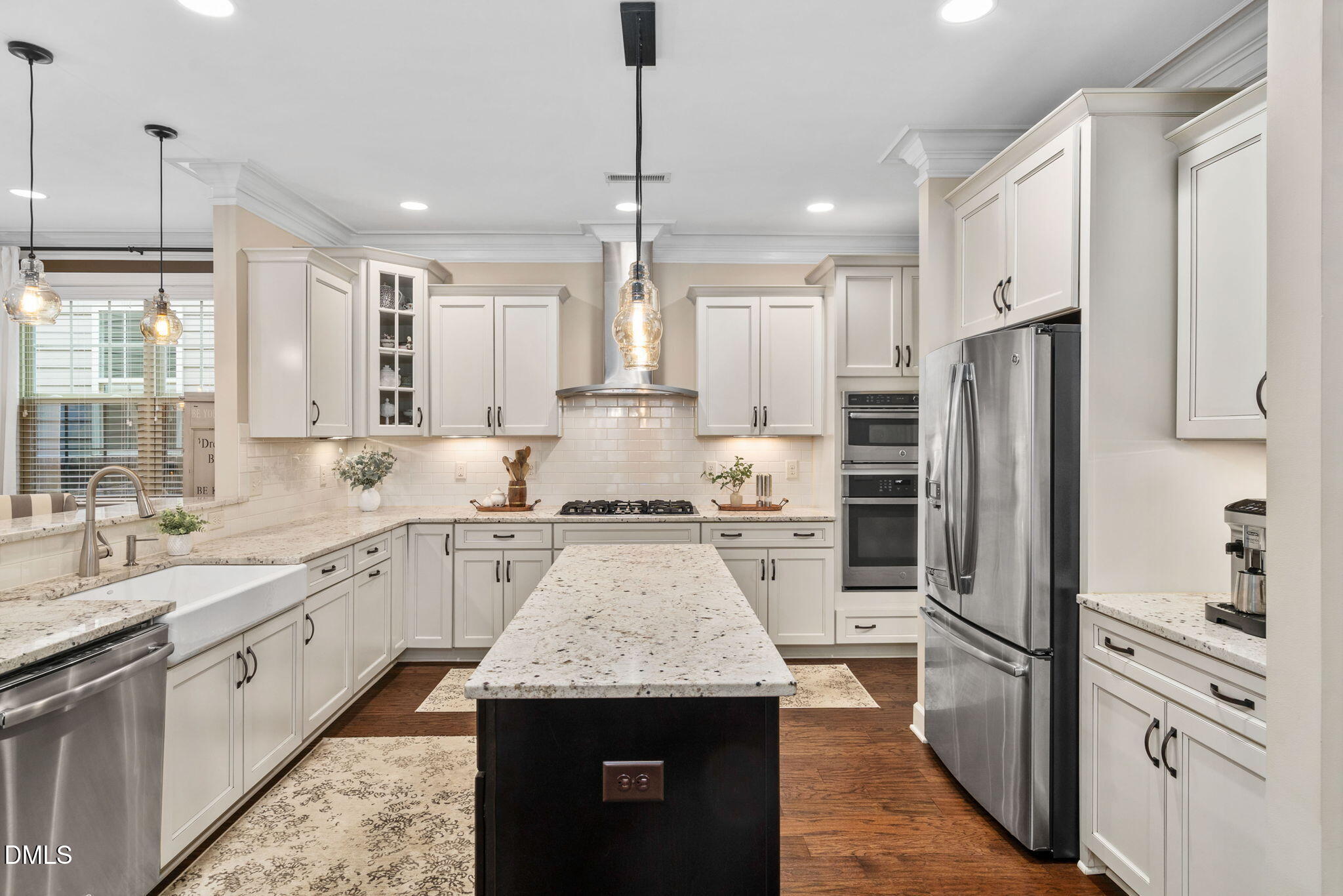 This stunning brick-and-stone front cottage home in the highly sought-after Regency community is a true showpiece. Lush landscaping and an elegant entryway set the tone, leading inside to gleaming hardwoods and a formal dining room framed by columns, tray ceiling, and detailed millwork. The gourmet kitchen boasts a large island, double oven, farmhouse sink, stylish lighting, and a breakfast bar that flows seamlessly into the dining area and family room. A stone fireplace and wet bar create a warm, welcoming gathering space. The main-level primary suite offers a tray ceiling, access to the sunroom, and a spa-inspired bath with an oversized tiled shower and dual vanities, water closet and walk-in closet. The sunroom with EZ breeze windows extends the living space outdoors, opening onto a deck overlooking the fenced yard and serene common area. The walkout lower level includes a spacious family room, private guest suite offering two additional bedrooms with en-suite baths, a second kitchen area, and a huge walk-in storage space. Enjoy low-maintenance living with HOA-maintained lawn, common areas, and exterior care. Ideally located near Koka Booth Amphitheatre, Life Time Fitness, Cary's Symphony Lake trails, top medical facilities, shopping, and dining.