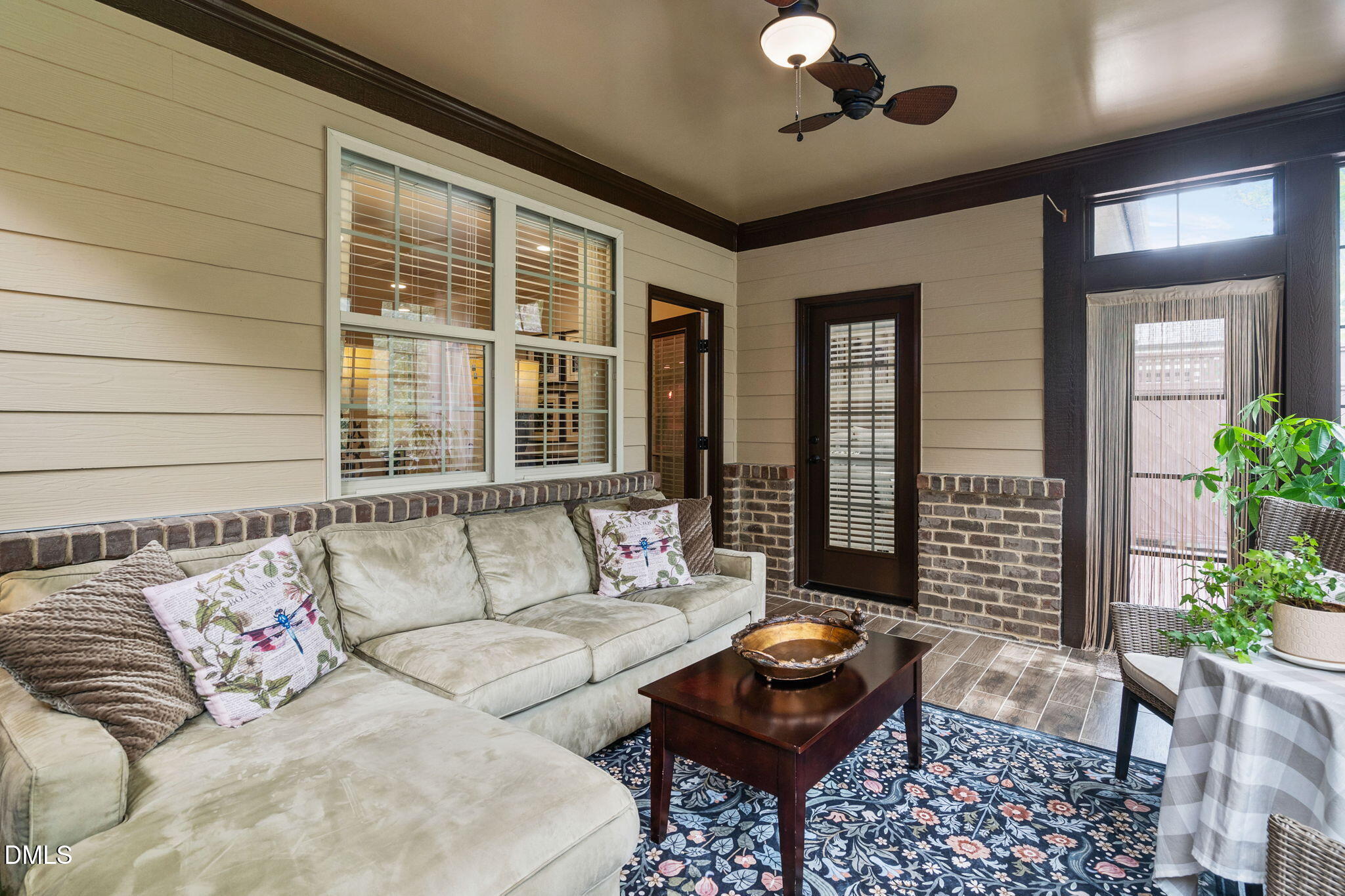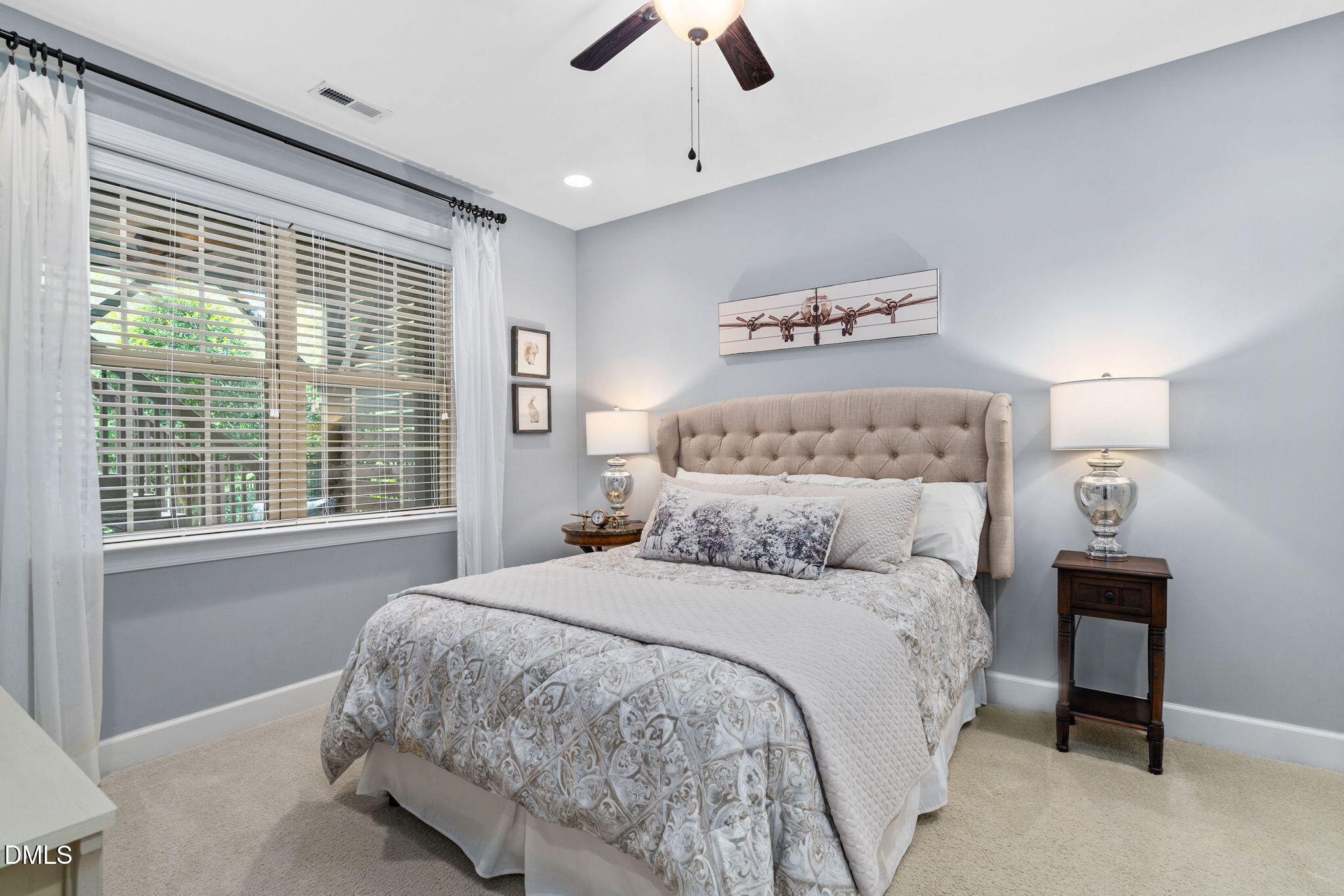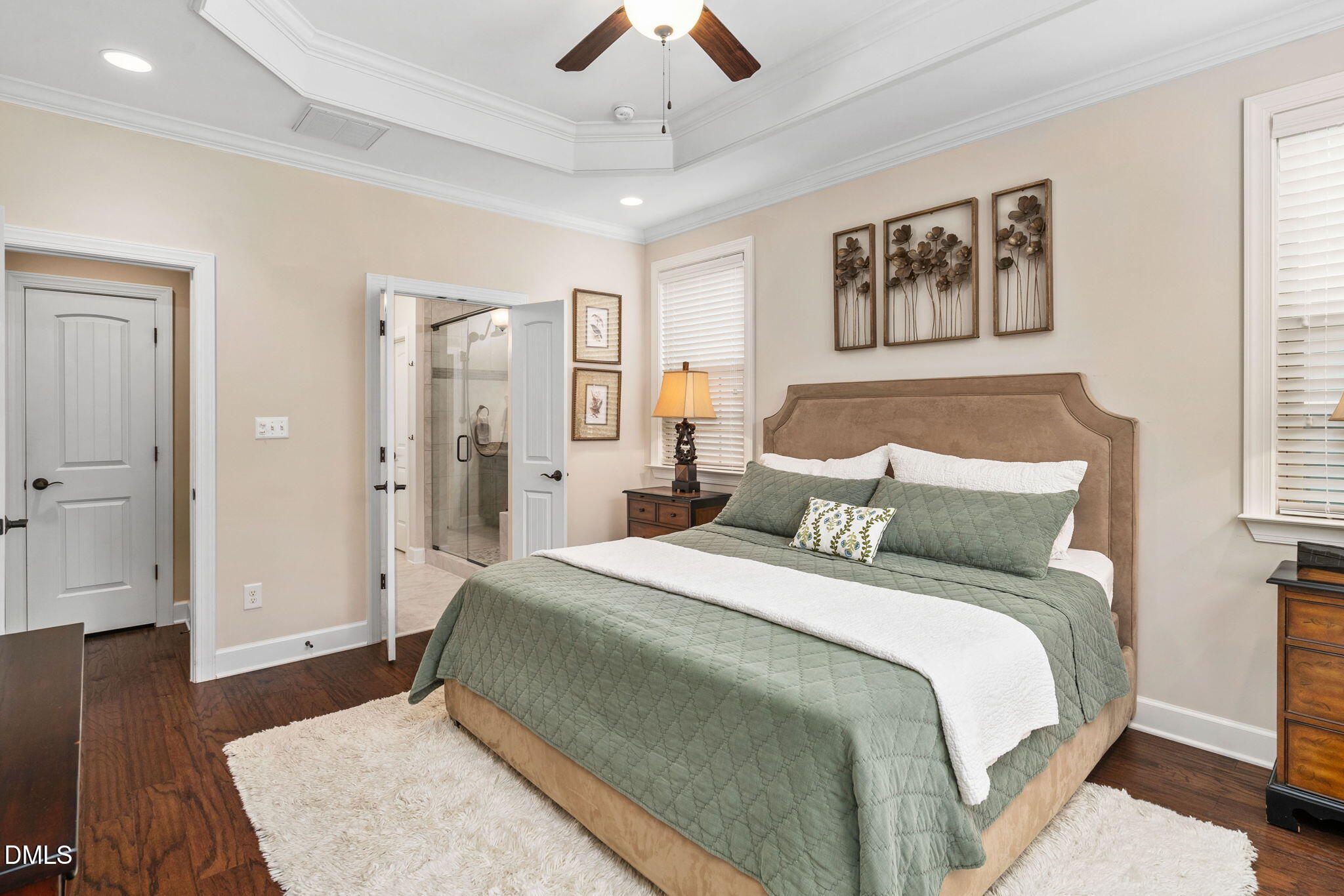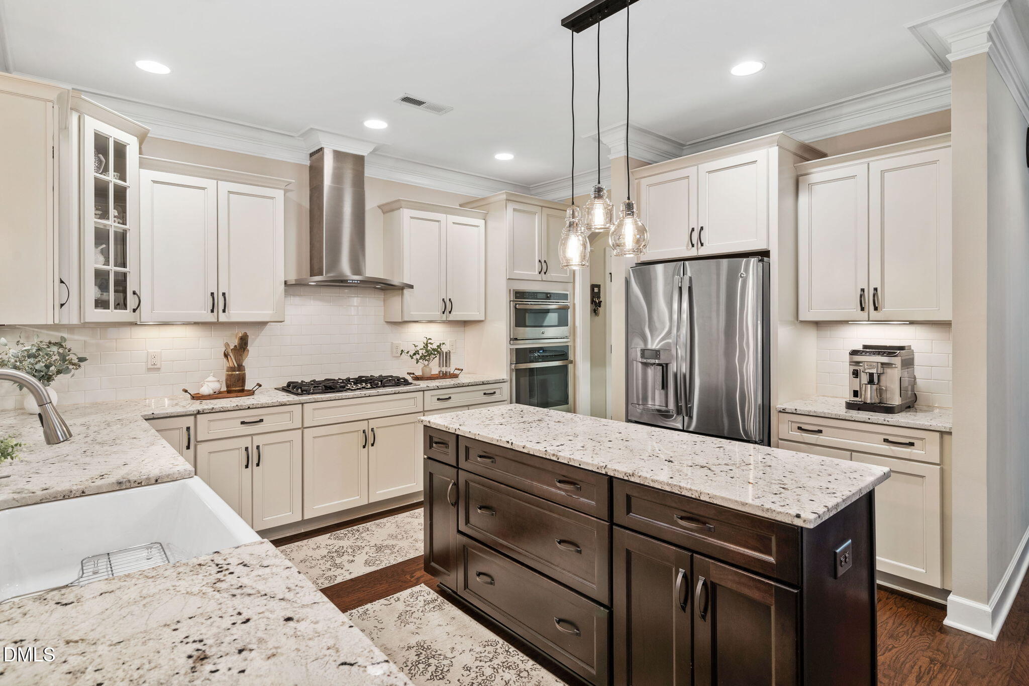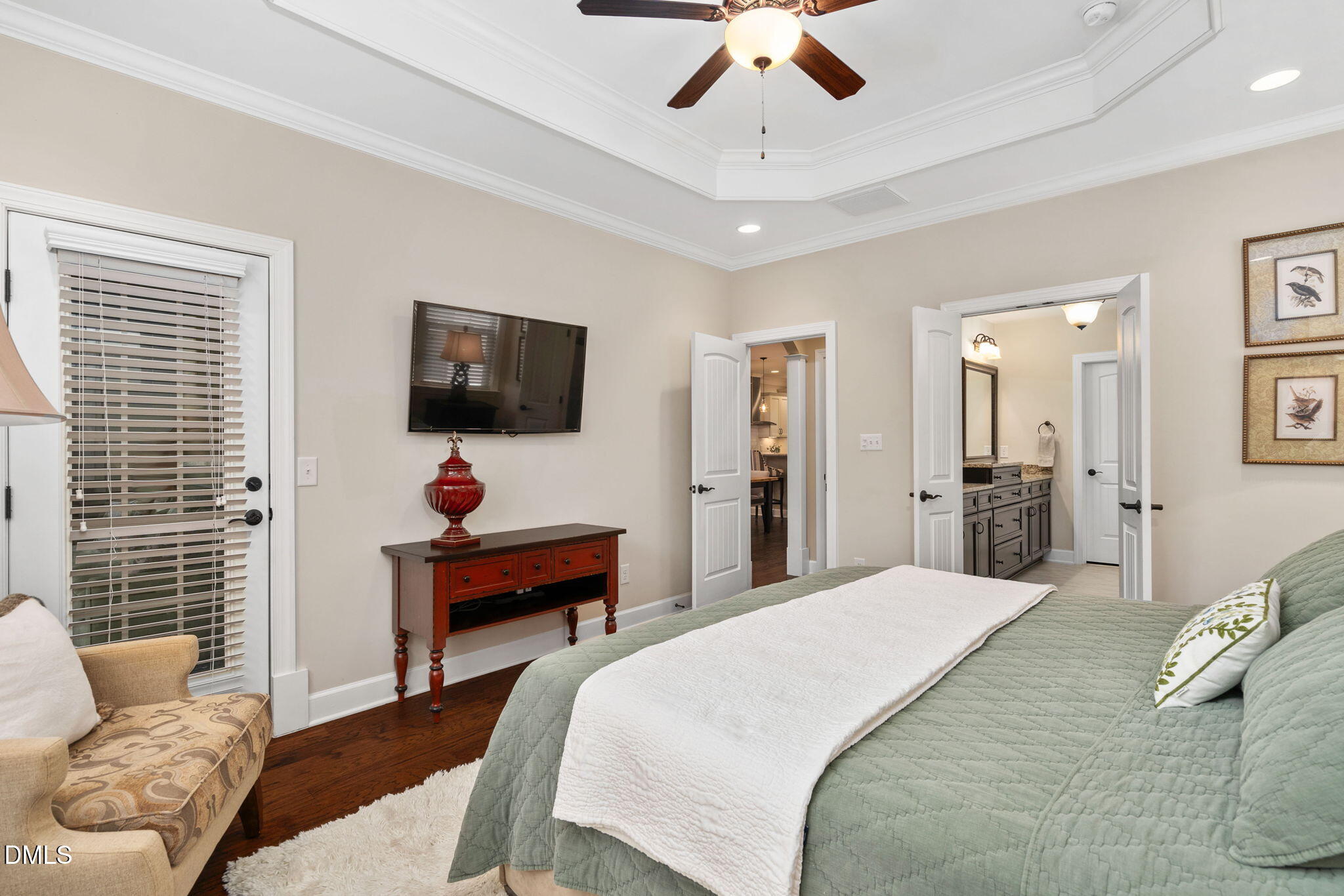 This stunning brick-and-stone front cottage home in the highly sought-after Regency community is a true showpiece. Lush landscaping and an elegant entryway set the tone, leading inside to gleaming hardwoods and a formal dining room framed by columns, tray ceiling, and detailed millwork. The gourmet kitchen boasts a large island, double oven, farmhouse sink, stylish lighting, and a breakfast bar that flows seamlessly into the dining area and family room. A stone fireplace and wet bar create a warm, welcoming gathering space. The main-level primary suite offers a tray ceiling, access to the sunroom, and a spa-inspired bath with an oversized tiled shower and dual vanities, water closet and walk-in closet. The sunroom with EZ breeze windows extends the living space outdoors, opening onto a deck overlooking the fenced yard and serene common area. The walkout lower level includes a spacious family room, private guest suite offering two additional bedrooms with en-suite baths, a second kitchen area, and a huge walk-in storage space. Enjoy low-maintenance living with HOA-maintained lawn, common areas, and exterior care. Ideally located near Koka Booth Amphitheatre, Life Time Fitness, Cary's Symphony Lake trails, top medical facilities, shopping, and dining.