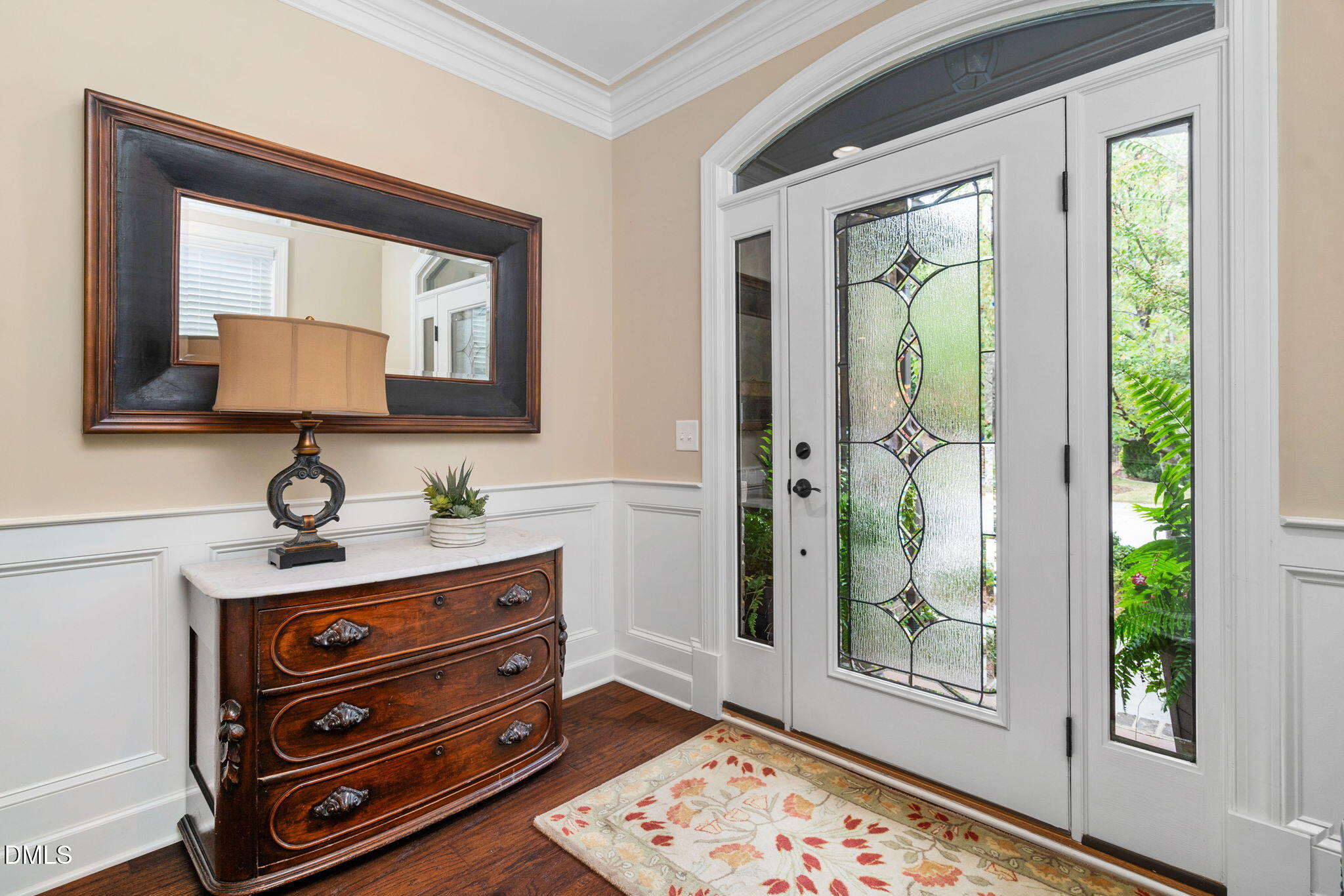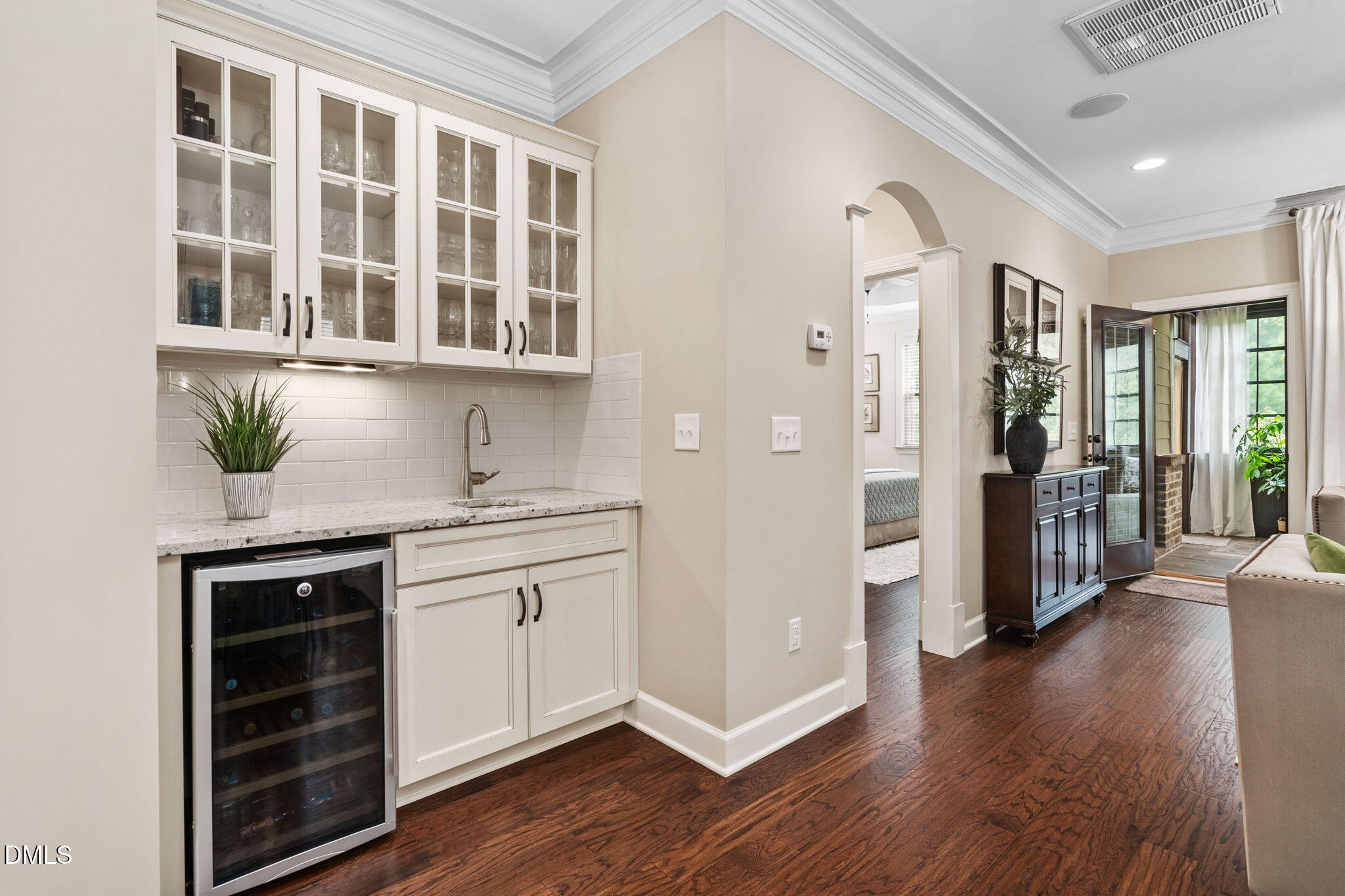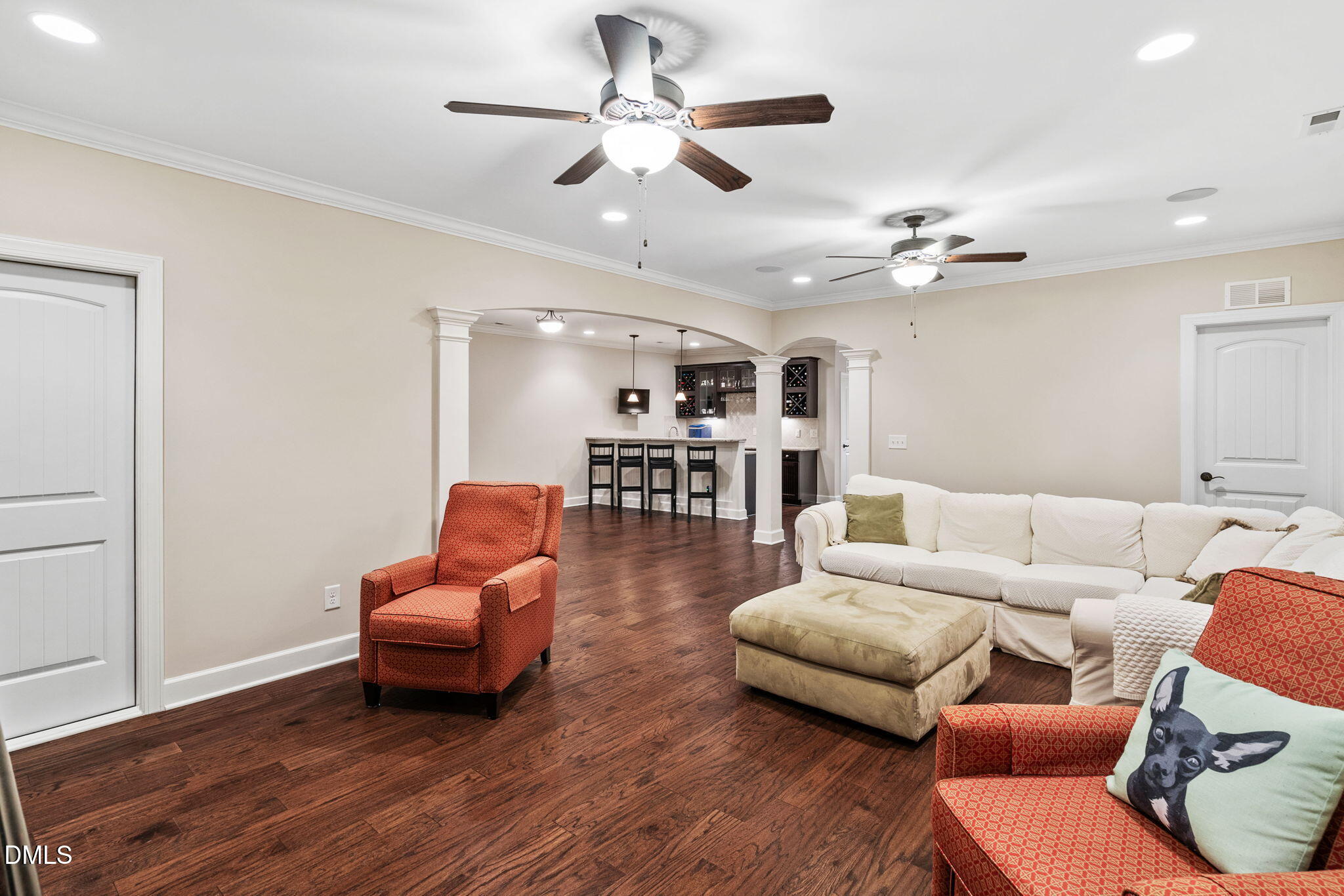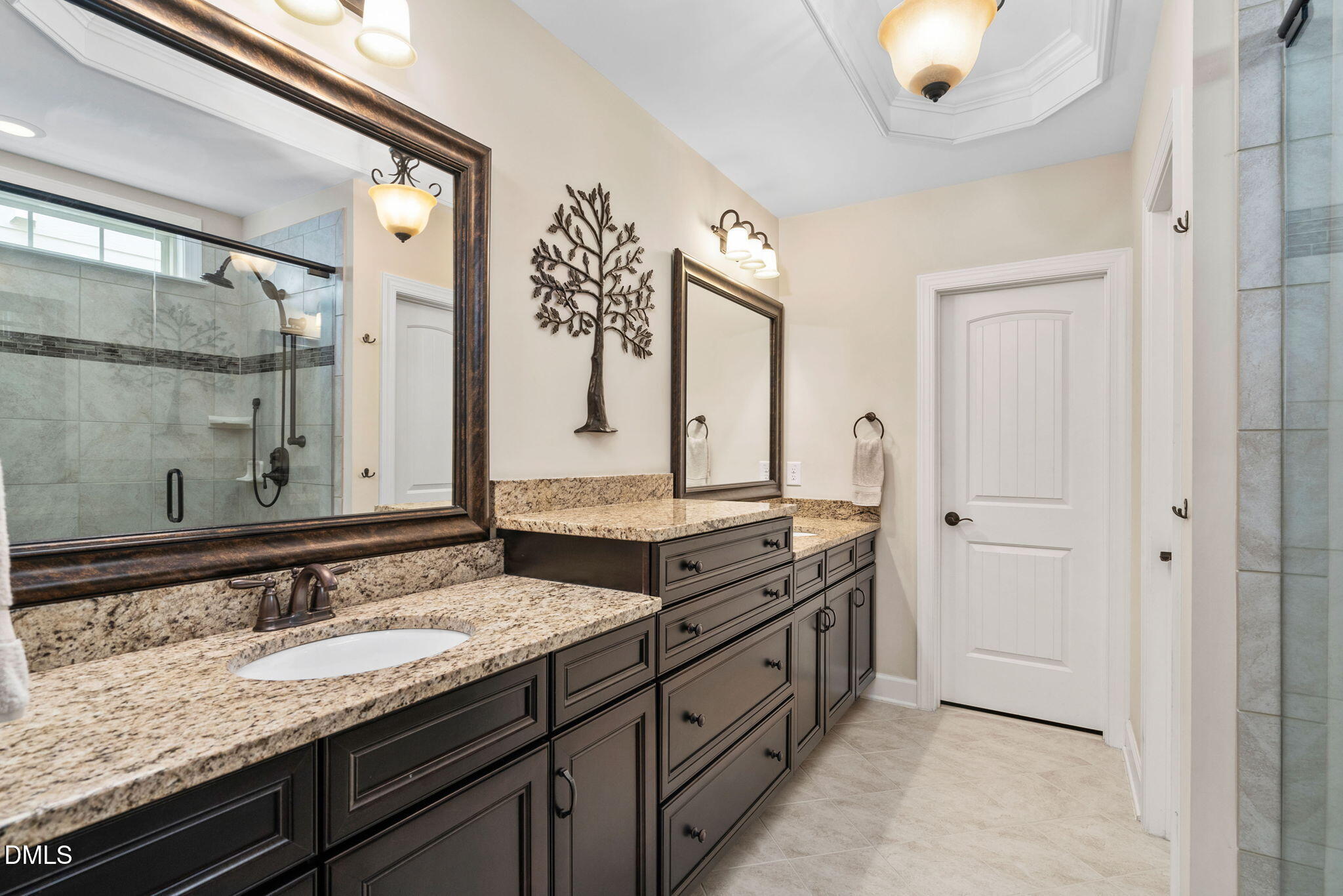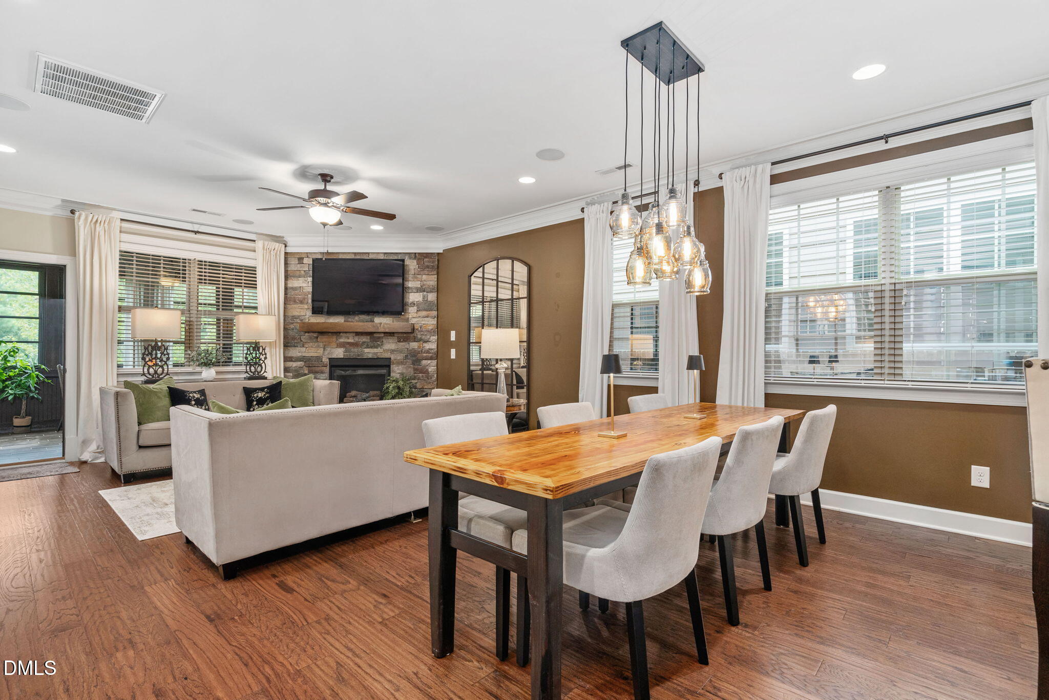This stunning brick-and-stone front cottage home in the highly sought-after Regency community is a true showpiece. Lush landscaping and an elegant entryway set the tone, leading inside to gleaming hardwoods and a formal dining room framed by columns, tray ceiling, and detailed millwork. The gourmet kitchen boasts a large island, double oven, farmhouse sink, stylish lighting, and a breakfast bar that flows seamlessly into the dining area and family room. A stone fireplace and wet bar create a warm, welcoming gathering space. The main-level primary suite offers a tray ceiling, access to the sunroom, and a spa-inspired bath with an oversized tiled shower and dual vanities, water closet and walk-in closet. The sunroom with EZ breeze windows extends the living space outdoors, opening onto a deck overlooking the fenced yard and serene common area. The walkout lower level includes a spacious family room, private guest suite offering two additional bedrooms with en-suite baths, a second kitchen area, and a huge walk-in storage space. Enjoy low-maintenance living with HOA-maintained lawn, common areas, and exterior care. Ideally located near Koka Booth Amphitheatre, Life Time Fitness, Cary's Symphony Lake trails, top medical facilities, shopping, and dining.