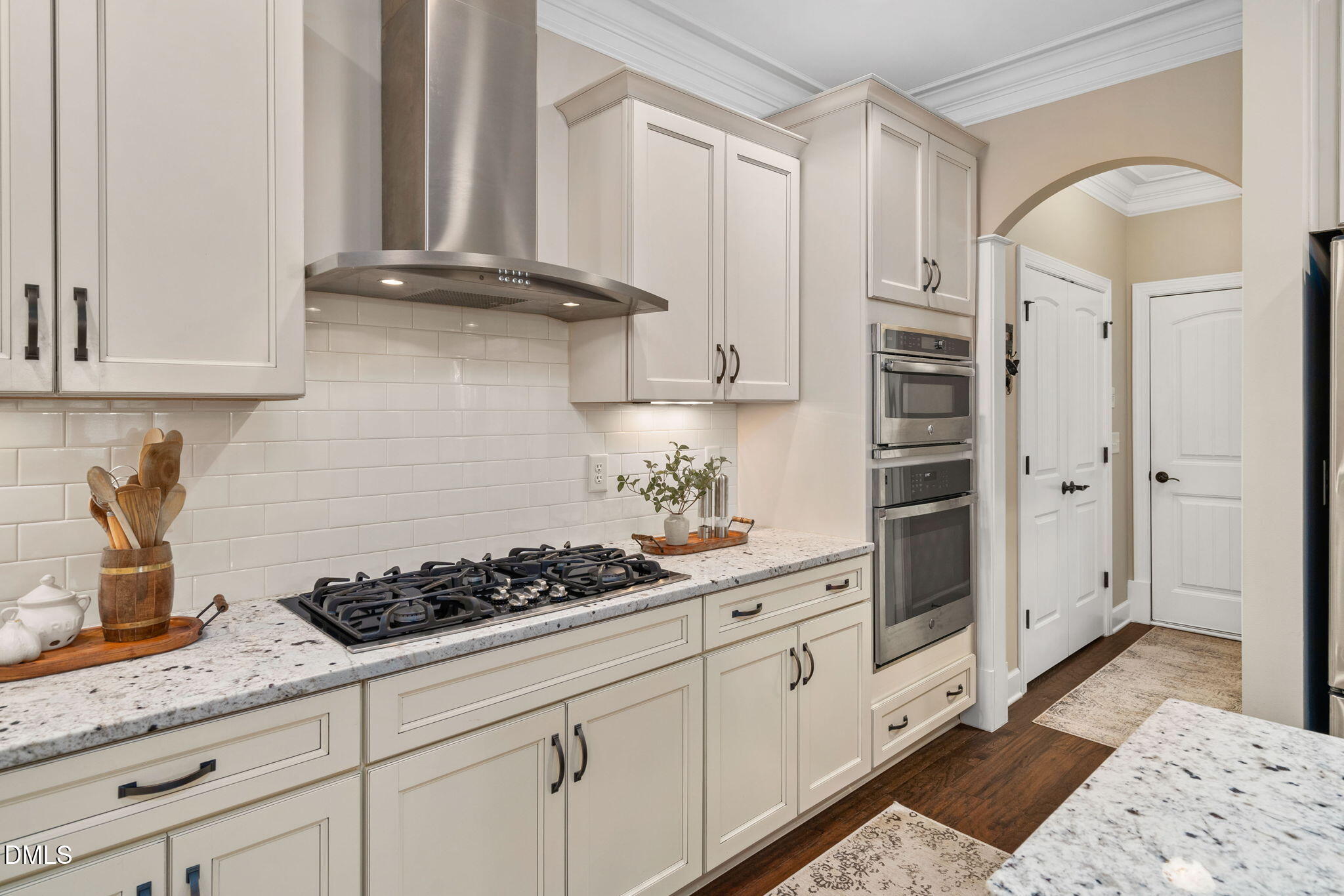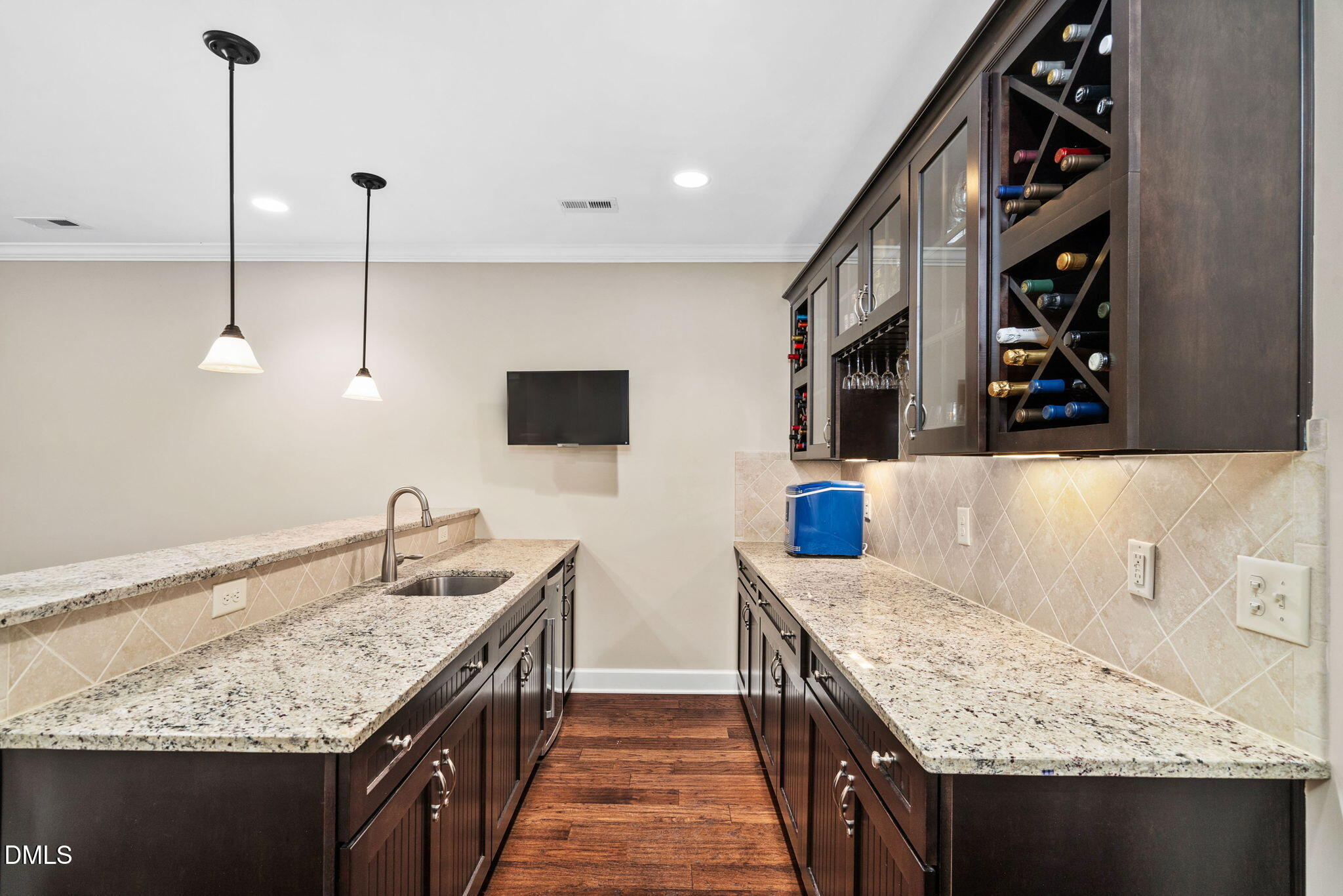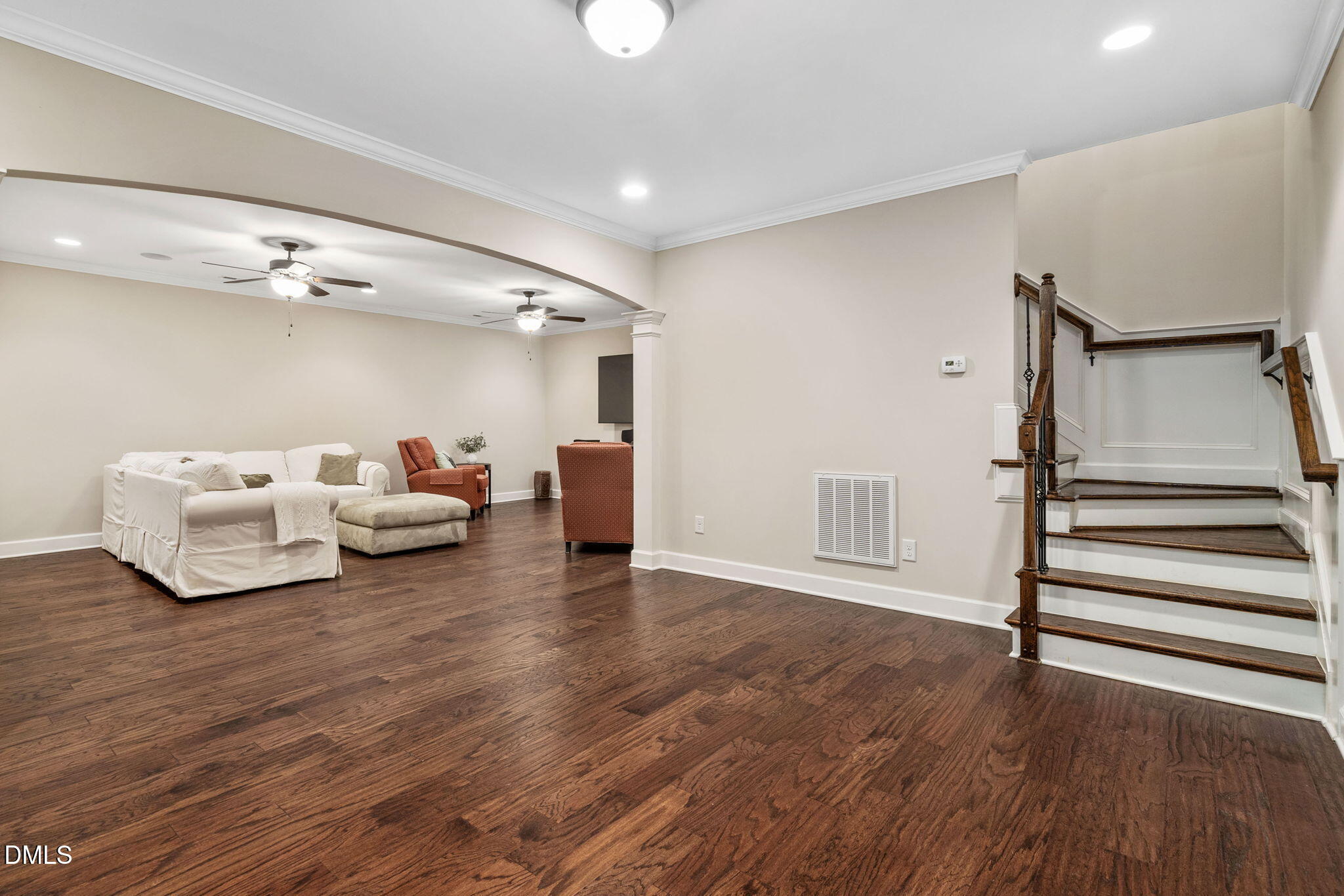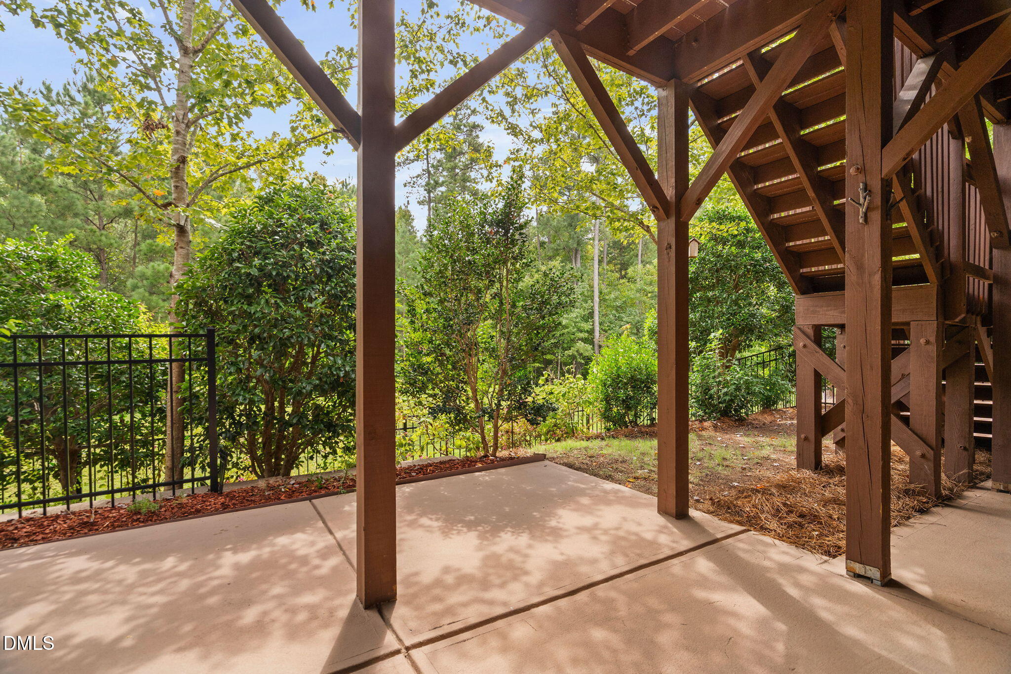 This stunning brick-and-stone front cottage home in the highly sought-after Regency community is a true showpiece. Lush landscaping and an elegant entryway set the tone, leading inside to gleaming hardwoods and a formal dining room framed by columns, tray ceiling, and detailed millwork. The gourmet kitchen boasts a large island, double oven, farmhouse sink, stylish lighting, and a breakfast bar that flows seamlessly into the dining area and family room. A stone fireplace and wet bar create a warm, welcoming gathering space. The main-level primary suite offers a tray ceiling, access to the sunroom, and a spa-inspired bath with an oversized tiled shower and dual vanities, water closet and walk-in closet. The sunroom with EZ breeze windows extends the living space outdoors, opening onto a deck overlooking the fenced yard and serene common area. The walkout lower level includes a spacious family room, private guest suite offering two additional bedrooms with en-suite baths, a second kitchen area, and a huge walk-in storage space. Enjoy low-maintenance living with HOA-maintained lawn, common areas, and exterior care. Ideally located near Koka Booth Amphitheatre, Life Time Fitness, Cary's Symphony Lake trails, top medical facilities, shopping, and dining.
