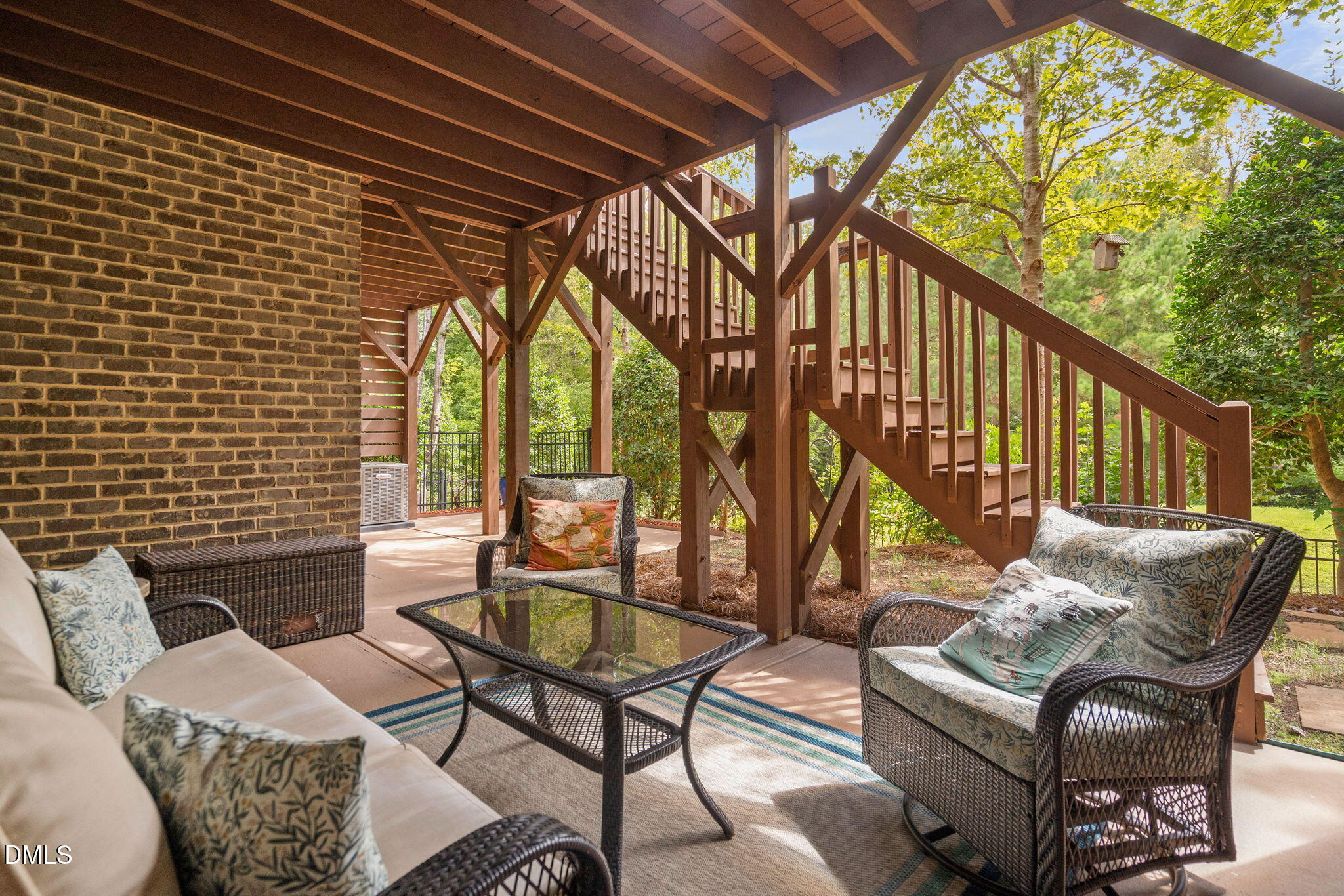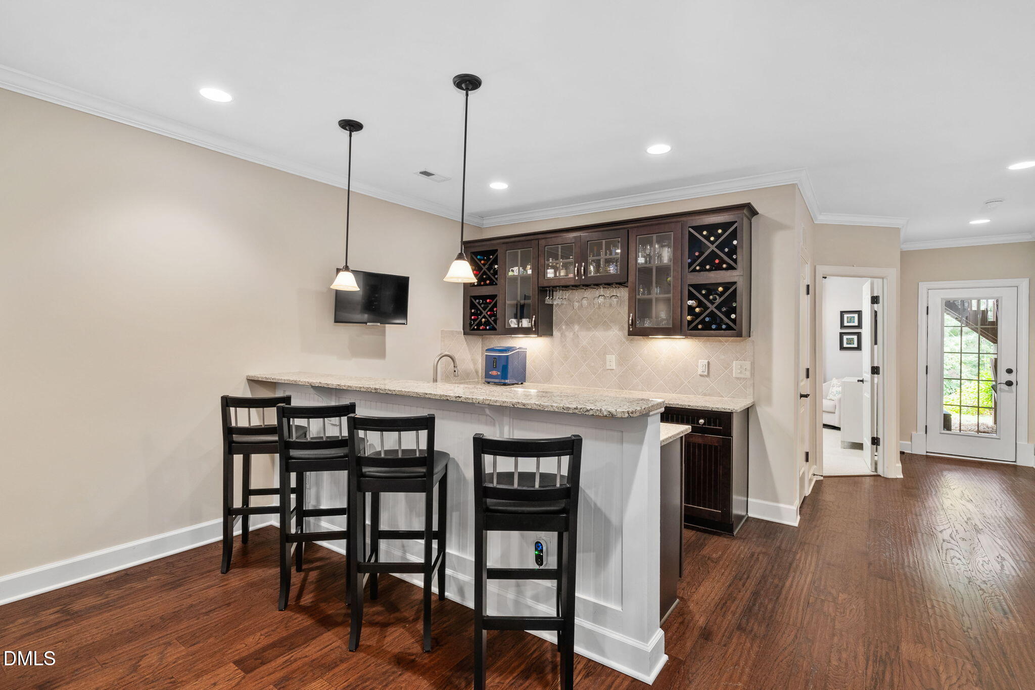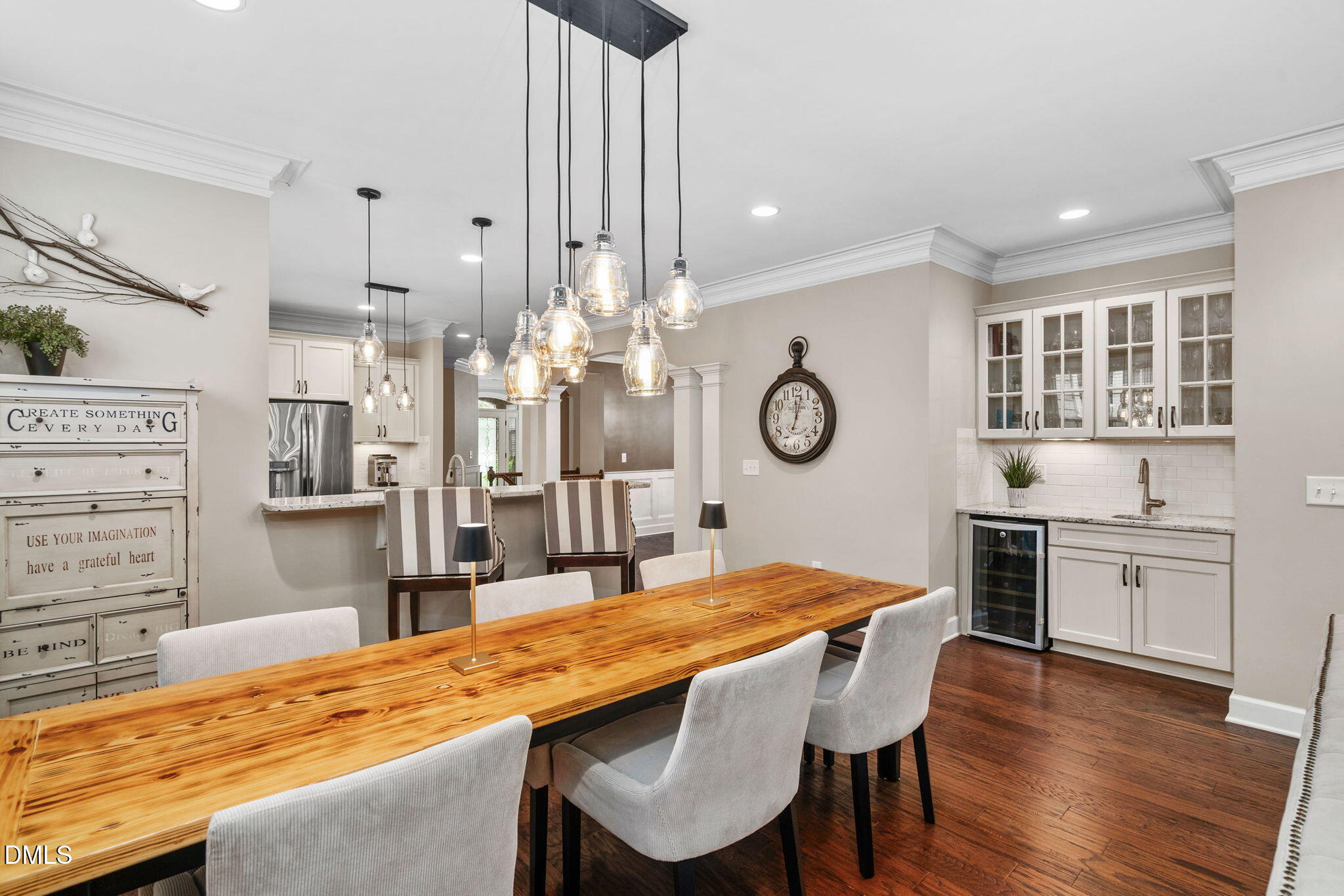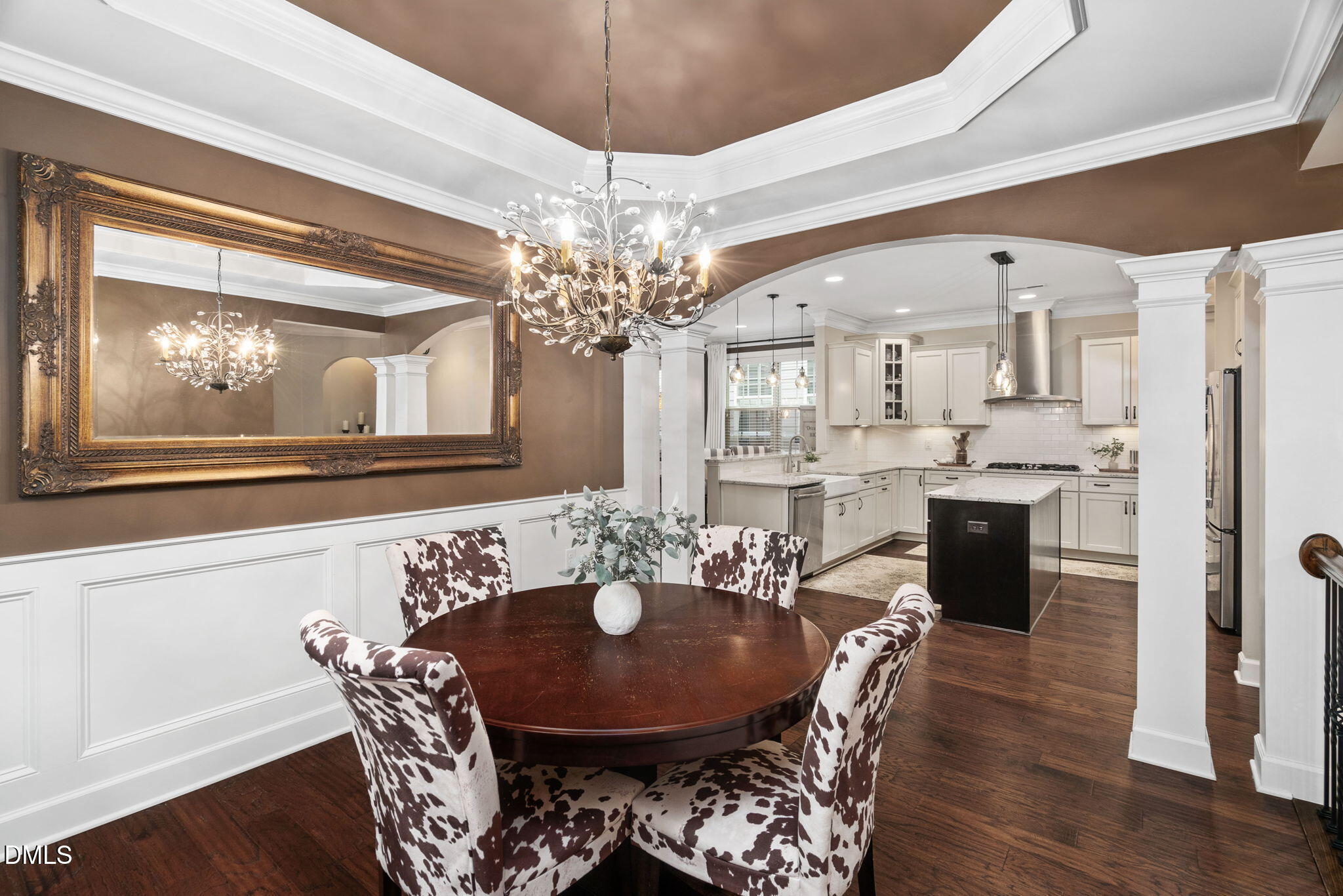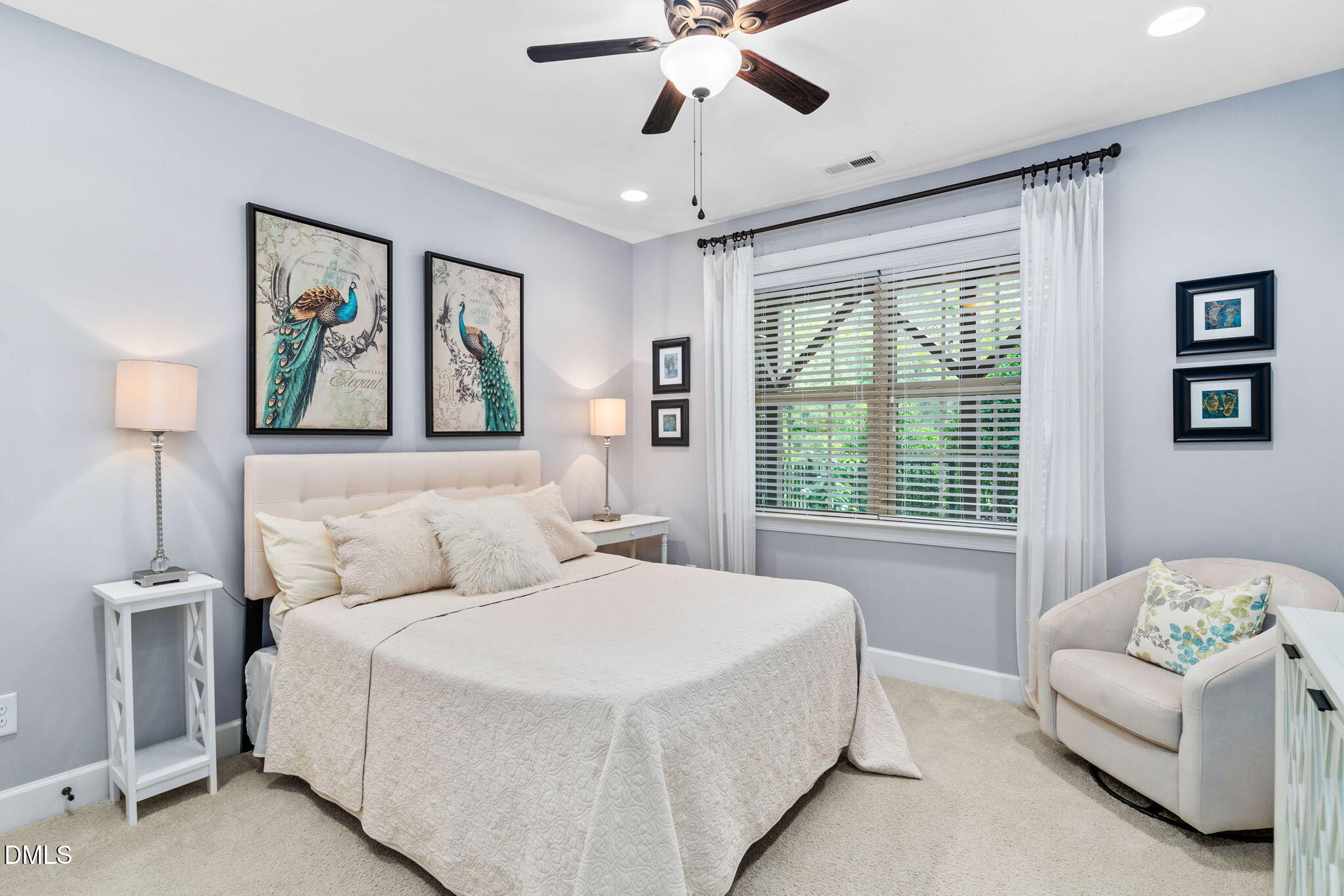 This stunning brick-and-stone front cottage home in the highly sought-after Regency community is a true showpiece. Lush landscaping and an elegant entryway set the tone, leading inside to gleaming hardwoods and a formal dining room framed by columns, tray ceiling, and detailed millwork. The gourmet kitchen boasts a large island, double oven, farmhouse sink, stylish lighting, and a breakfast bar that flows seamlessly into the dining area and family room. A stone fireplace and wet bar create a warm, welcoming gathering space. The main-level primary suite offers a tray ceiling, access to the sunroom, and a spa-inspired bath with an oversized tiled shower and dual vanities, water closet and walk-in closet. The sunroom with EZ breeze windows extends the living space outdoors, opening onto a deck overlooking the fenced yard and serene common area. The walkout lower level includes a spacious family room, private guest suite offering two additional bedrooms with en-suite baths, a second kitchen area, and a huge walk-in storage space. Enjoy low-maintenance living with HOA-maintained lawn, common areas, and exterior care. Ideally located near Koka Booth Amphitheatre, Life Time Fitness, Cary's Symphony Lake trails, top medical facilities, shopping, and dining.