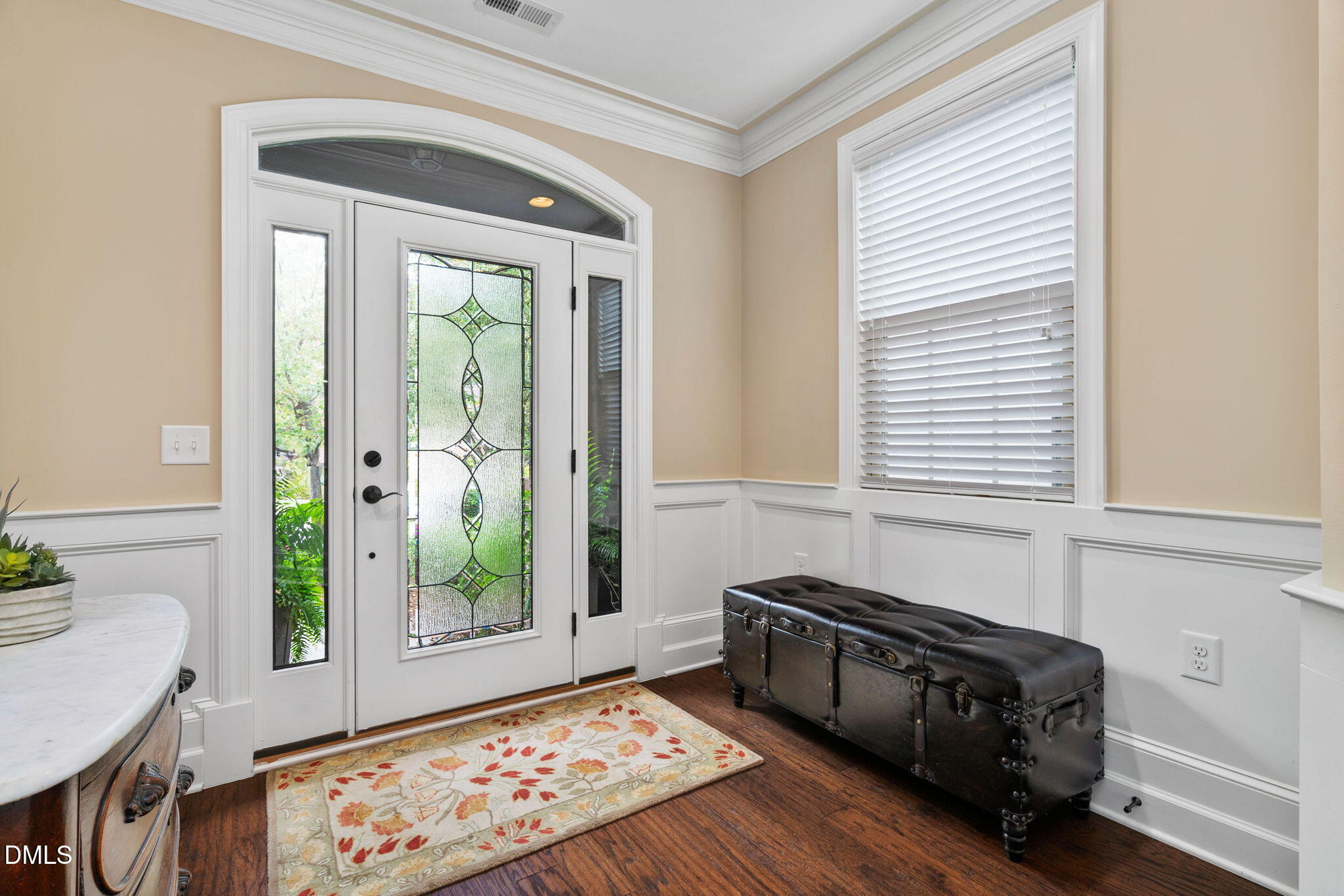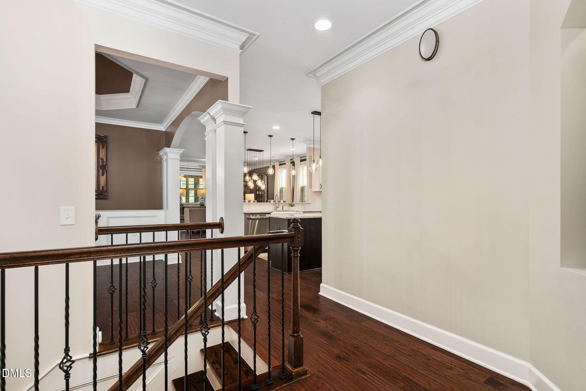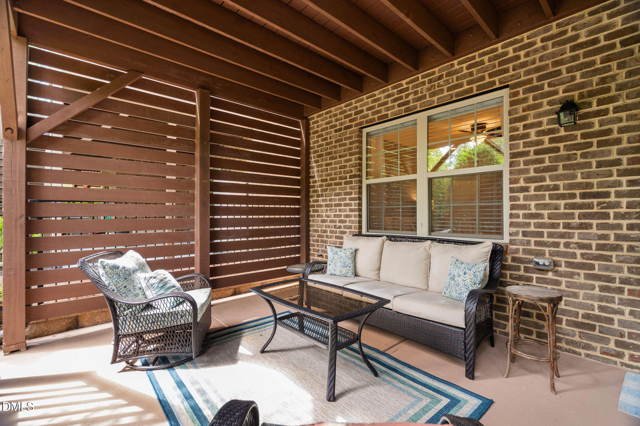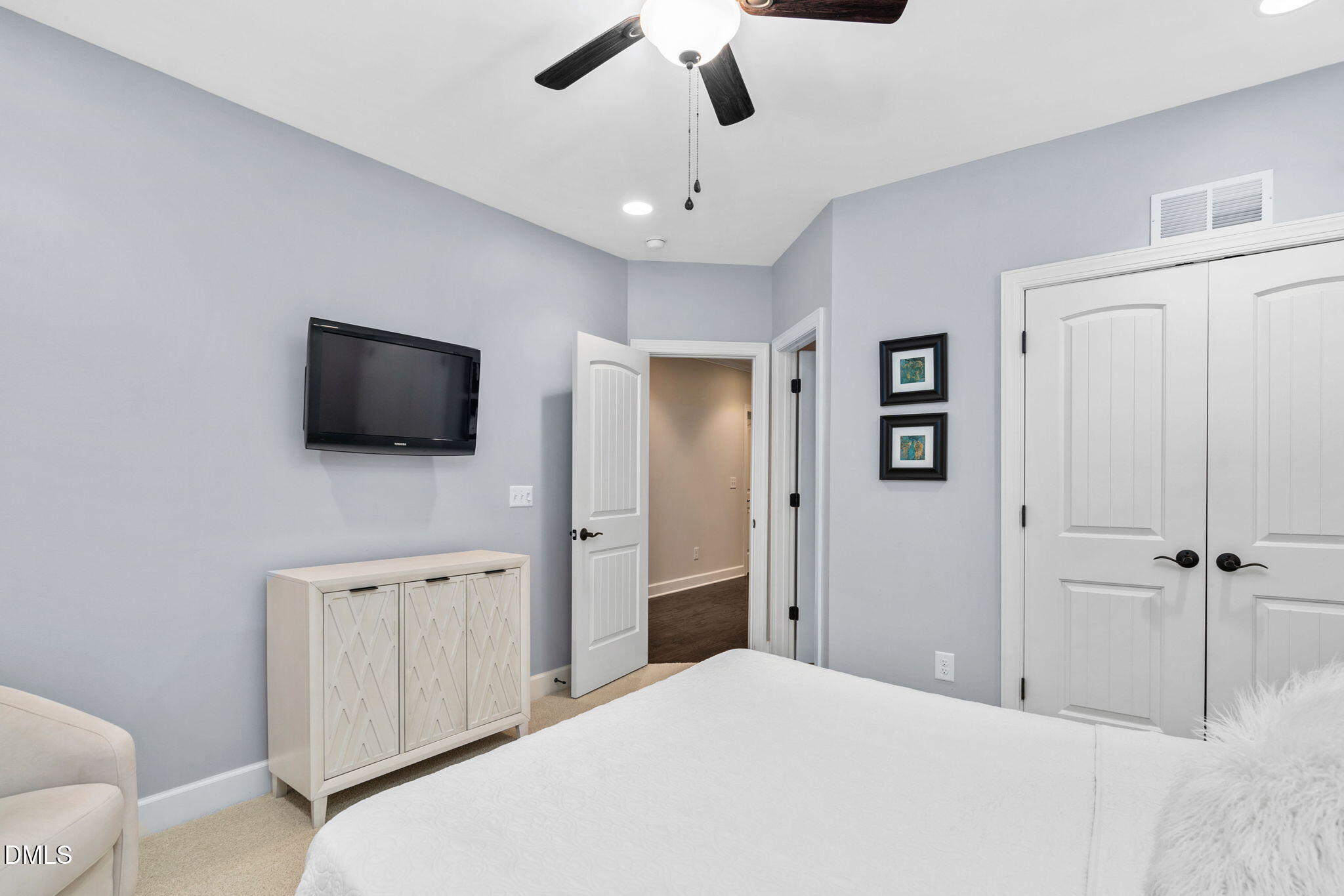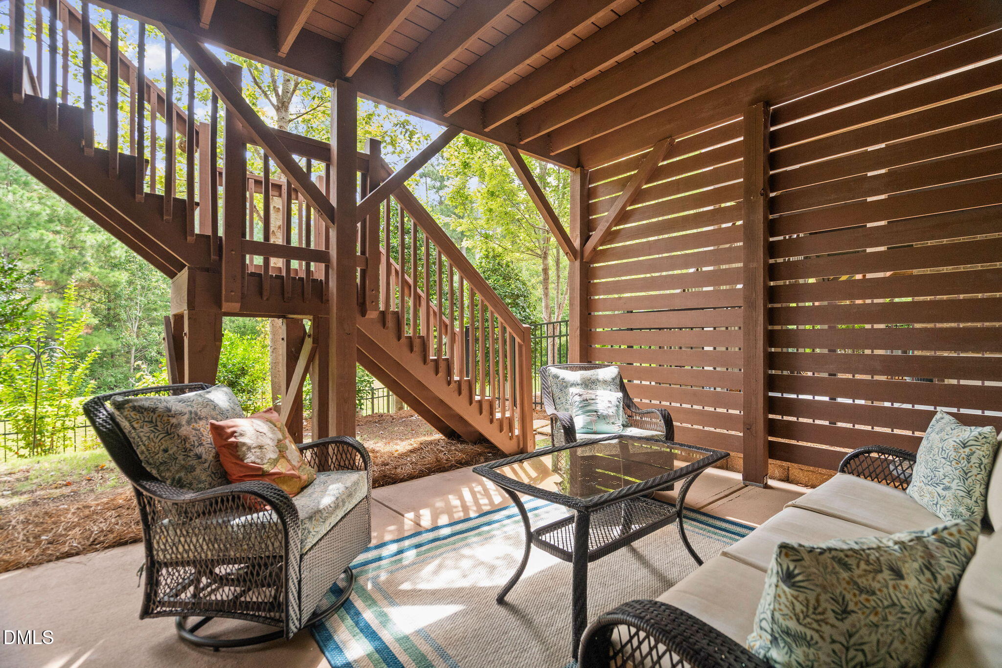 This stunning brick-and-stone front cottage home in the highly sought-after Regency community is a true showpiece. Lush landscaping and an elegant entryway set the tone, leading inside to gleaming hardwoods and a formal dining room framed by columns, tray ceiling, and detailed millwork. The gourmet kitchen boasts a large island, double oven, farmhouse sink, stylish lighting, and a breakfast bar that flows seamlessly into the dining area and family room. A stone fireplace and wet bar create a warm, welcoming gathering space. The main-level primary suite offers a tray ceiling, access to the sunroom, and a spa-inspired bath with an oversized tiled shower and dual vanities, water closet and walk-in closet. The sunroom with EZ breeze windows extends the living space outdoors, opening onto a deck overlooking the fenced yard and serene common area. The walkout lower level includes a spacious family room, private guest suite offering two additional bedrooms with en-suite baths, a second kitchen area, and a huge walk-in storage space. Enjoy low-maintenance living with HOA-maintained lawn, common areas, and exterior care. Ideally located near Koka Booth Amphitheatre, Life Time Fitness, Cary's Symphony Lake trails, top medical facilities, shopping, and dining.