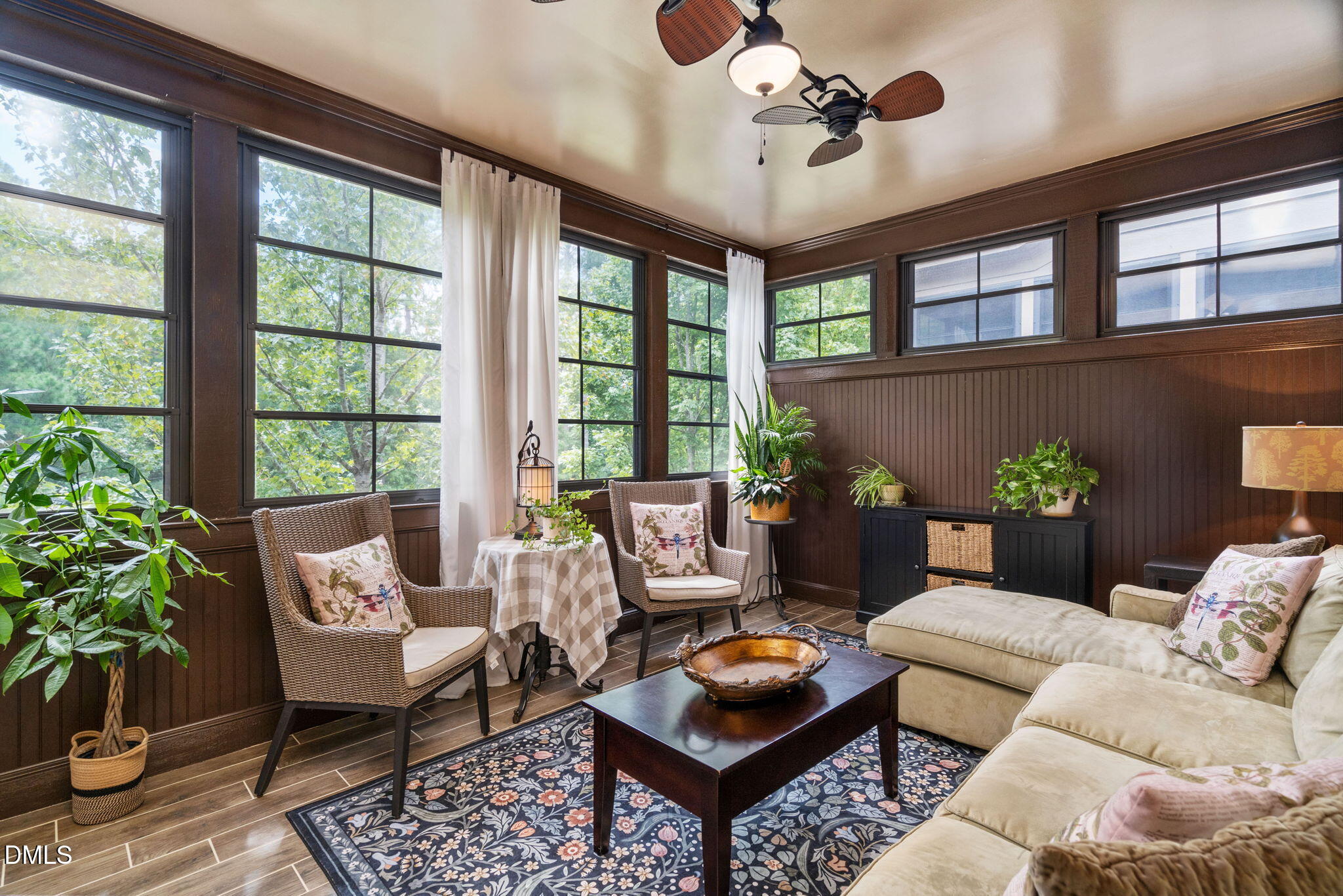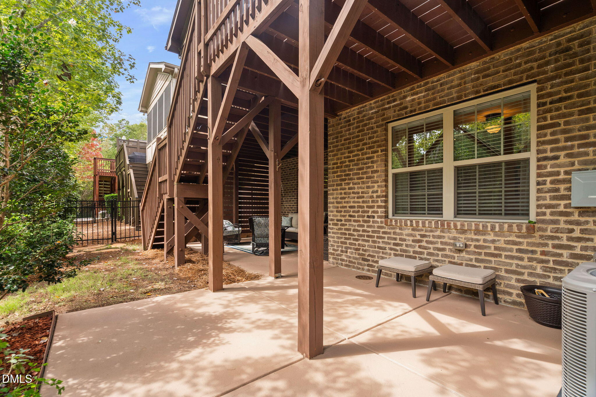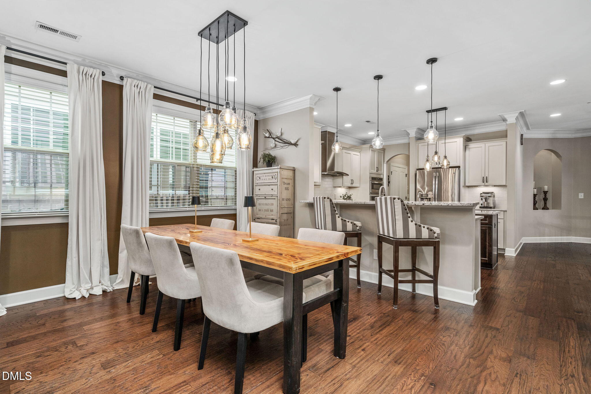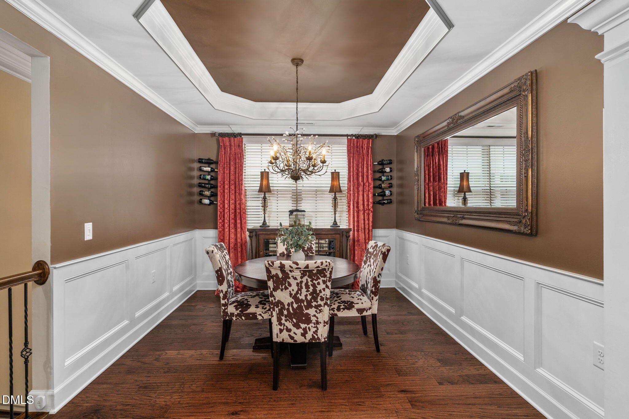 This stunning brick-and-stone front cottage home in the highly sought-after Regency community is a true showpiece. Lush landscaping and an elegant entryway set the tone, leading inside to gleaming hardwoods and a formal dining room framed by columns, tray ceiling, and detailed millwork. The gourmet kitchen boasts a large island, double oven, farmhouse sink, stylish lighting, and a breakfast bar that flows seamlessly into the dining area and family room. A stone fireplace and wet bar create a warm, welcoming gathering space. The main-level primary suite offers a tray ceiling, access to the sunroom, and a spa-inspired bath with an oversized tiled shower and dual vanities, water closet and walk-in closet. The sunroom with EZ breeze windows extends the living space outdoors, opening onto a deck overlooking the fenced yard and serene common area. The walkout lower level includes a spacious family room, private guest suite offering two additional bedrooms with en-suite baths, a second kitchen area, and a huge walk-in storage space. Enjoy low-maintenance living with HOA-maintained lawn, common areas, and exterior care. Ideally located near Koka Booth Amphitheatre, Life Time Fitness, Cary's Symphony Lake trails, top medical facilities, shopping, and dining.