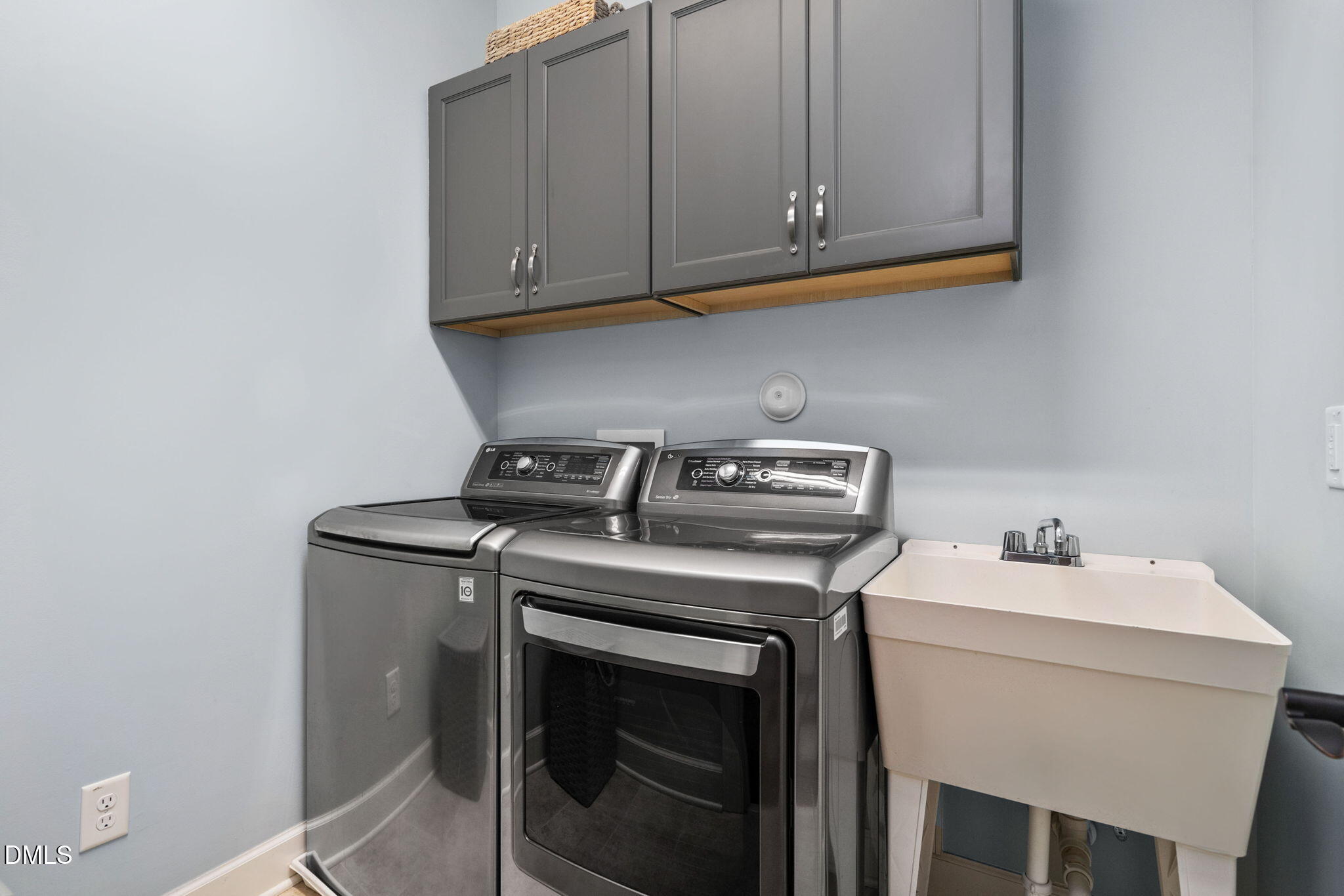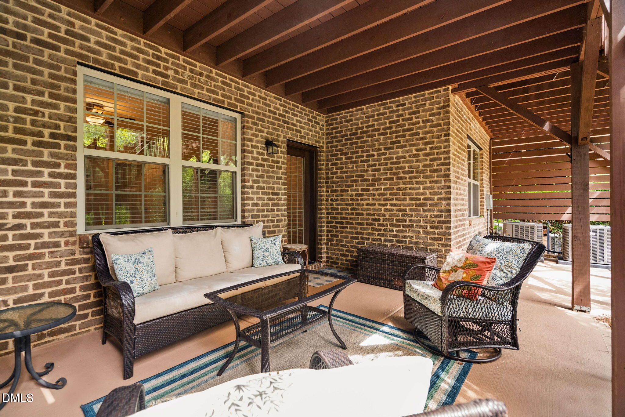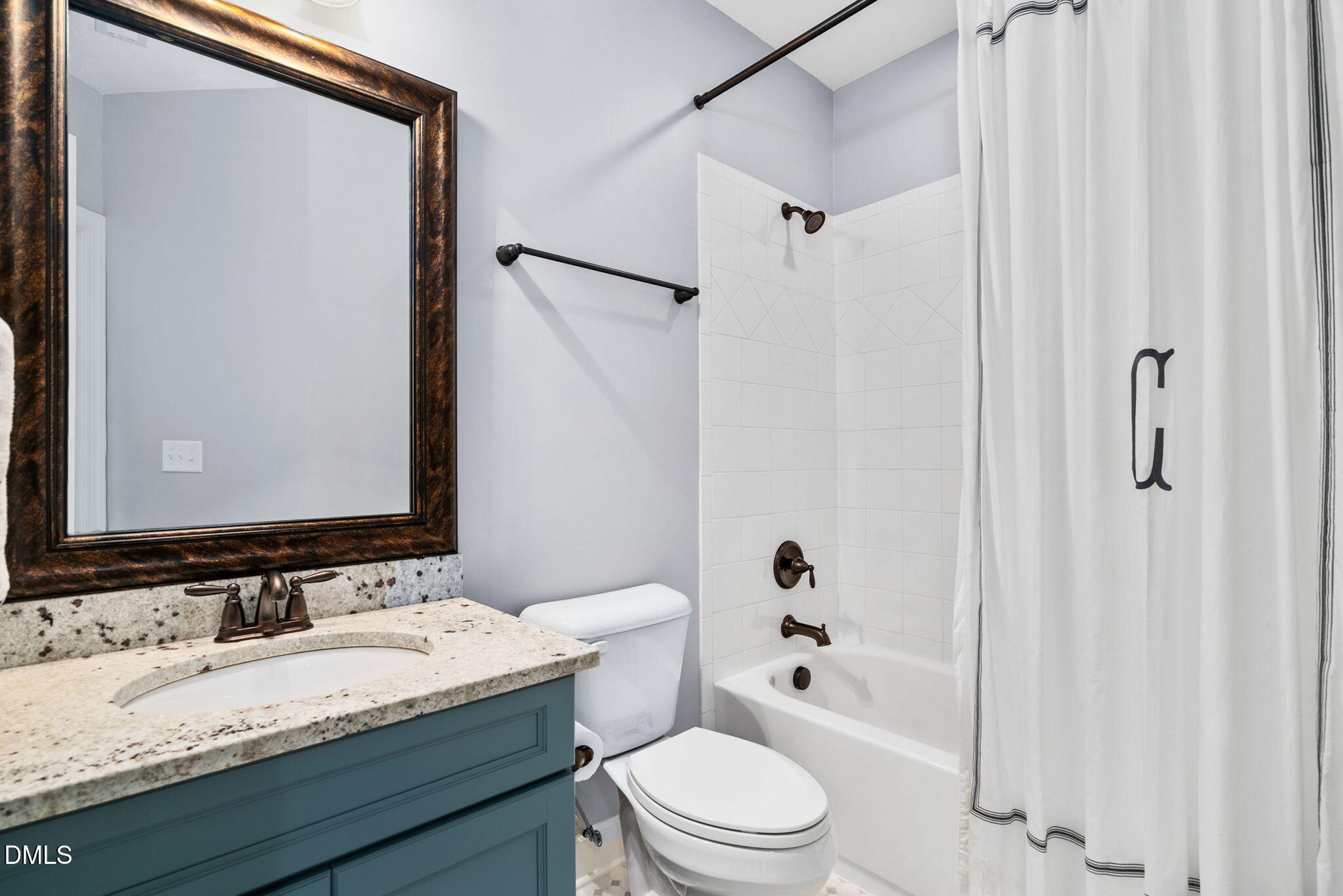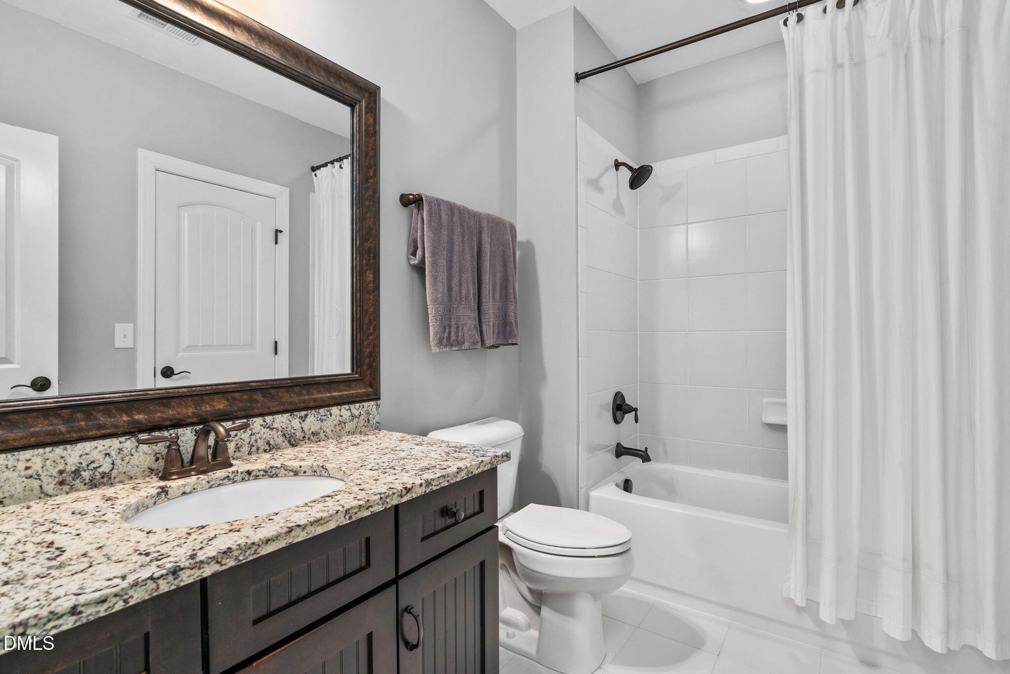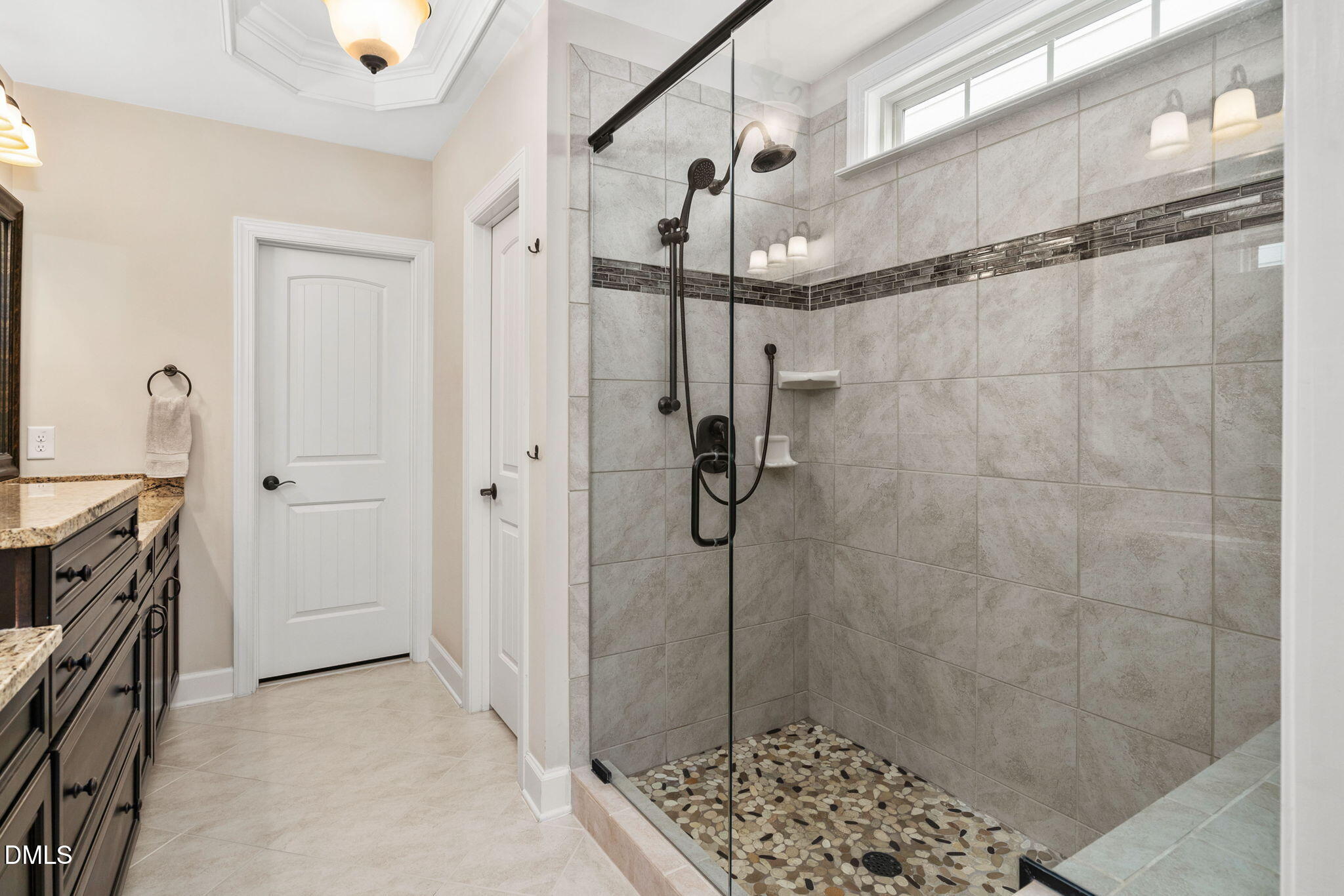 This stunning brick-and-stone front cottage home in the highly sought-after Regency community is a true showpiece. Lush landscaping and an elegant entryway set the tone, leading inside to gleaming hardwoods and a formal dining room framed by columns, tray ceiling, and detailed millwork. The gourmet kitchen boasts a large island, double oven, farmhouse sink, stylish lighting, and a breakfast bar that flows seamlessly into the dining area and family room. A stone fireplace and wet bar create a warm, welcoming gathering space. The main-level primary suite offers a tray ceiling, access to the sunroom, and a spa-inspired bath with an oversized tiled shower and dual vanities, water closet and walk-in closet. The sunroom with EZ breeze windows extends the living space outdoors, opening onto a deck overlooking the fenced yard and serene common area. The walkout lower level includes a spacious family room, private guest suite offering two additional bedrooms with en-suite baths, a second kitchen area, and a huge walk-in storage space. Enjoy low-maintenance living with HOA-maintained lawn, common areas, and exterior care. Ideally located near Koka Booth Amphitheatre, Life Time Fitness, Cary's Symphony Lake trails, top medical facilities, shopping, and dining.