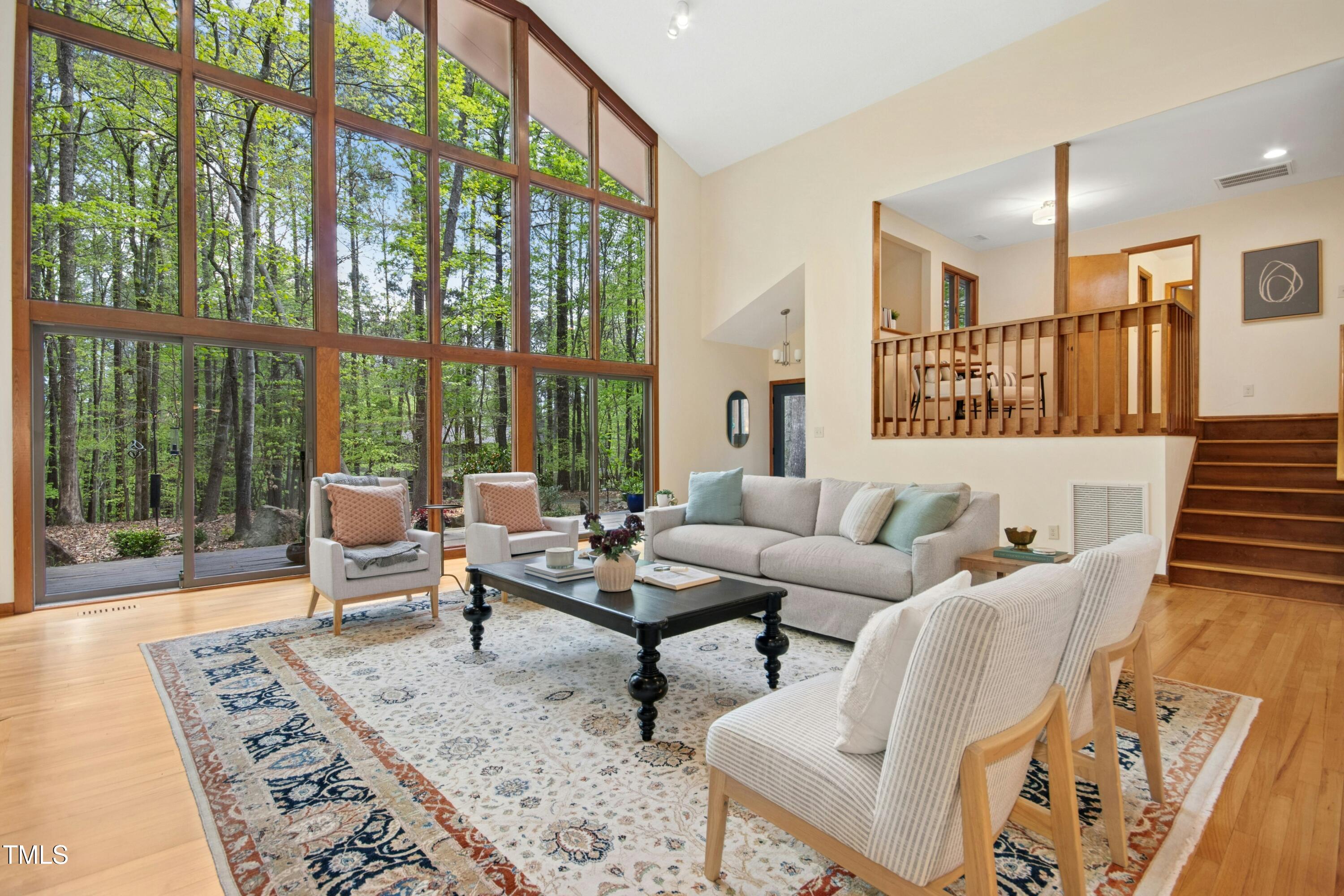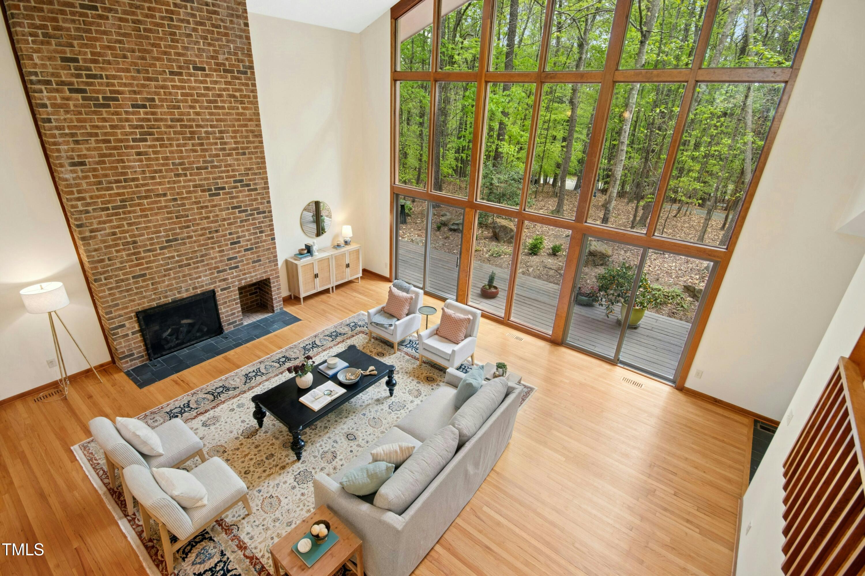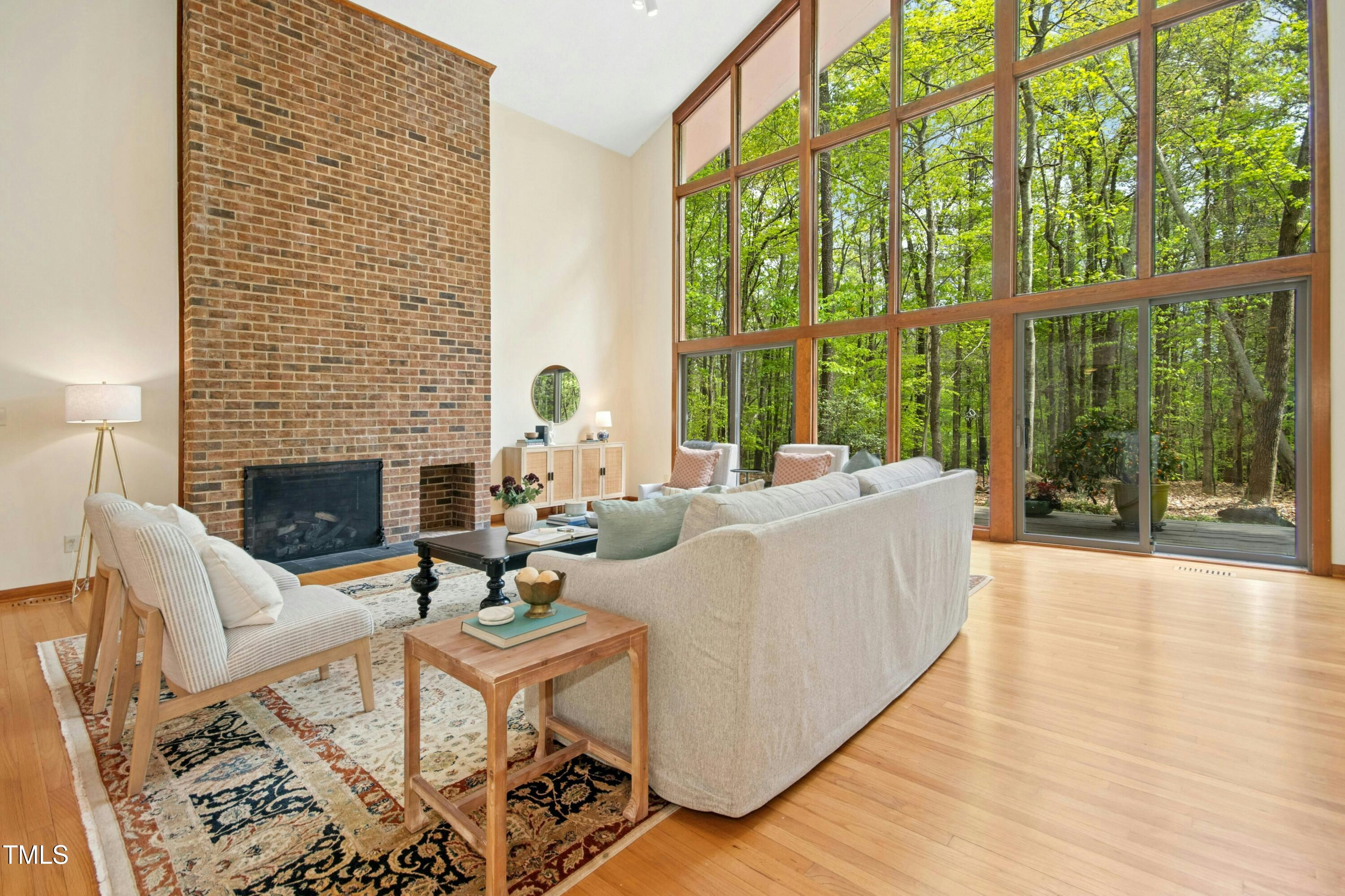 Step inside to a warm foyer that opens to a stunning two-story family room where a soaring brick fireplace with slate hearth anchors the room and floor-to-ceiling windows flood the space with natural light. Sliding glass doors blur the boundaries between indoors and out, inviting the peaceful woodland setting into your daily life and hardwoods flow throughout.