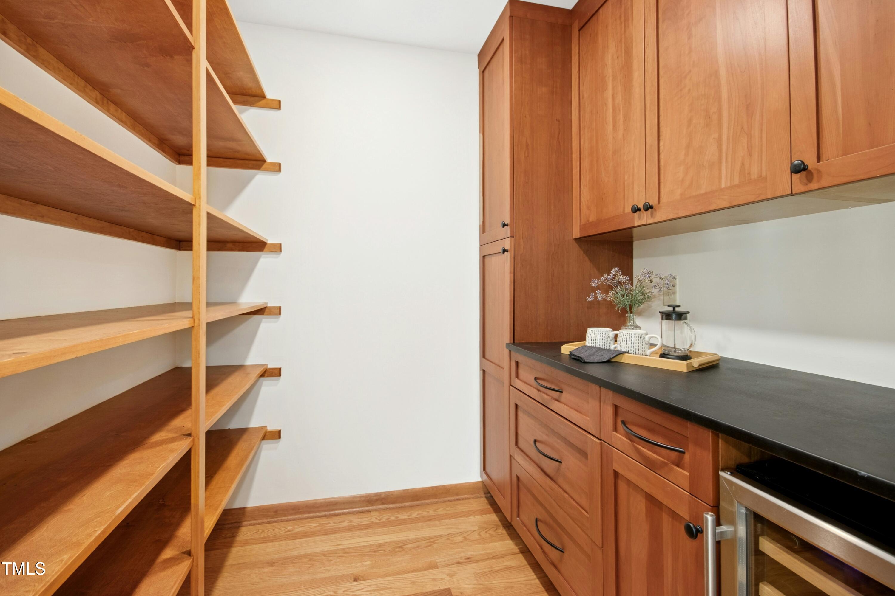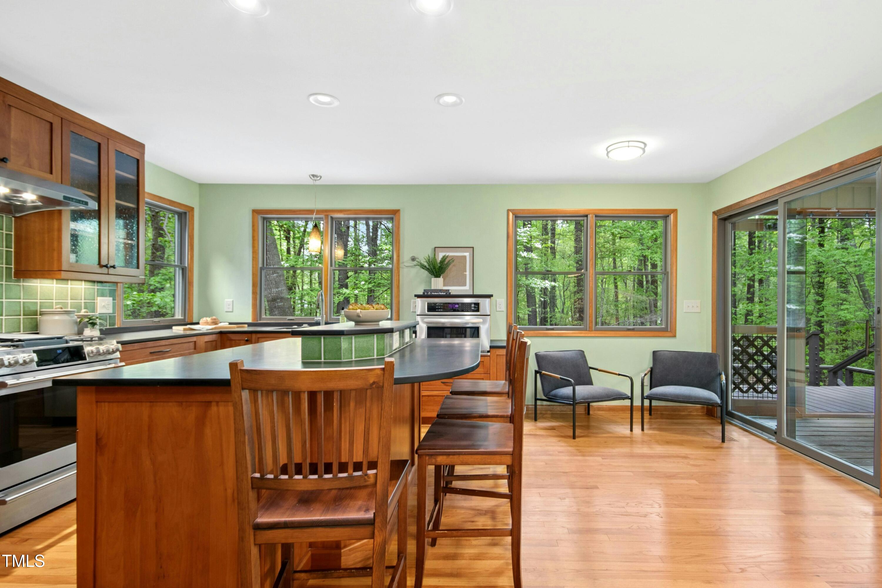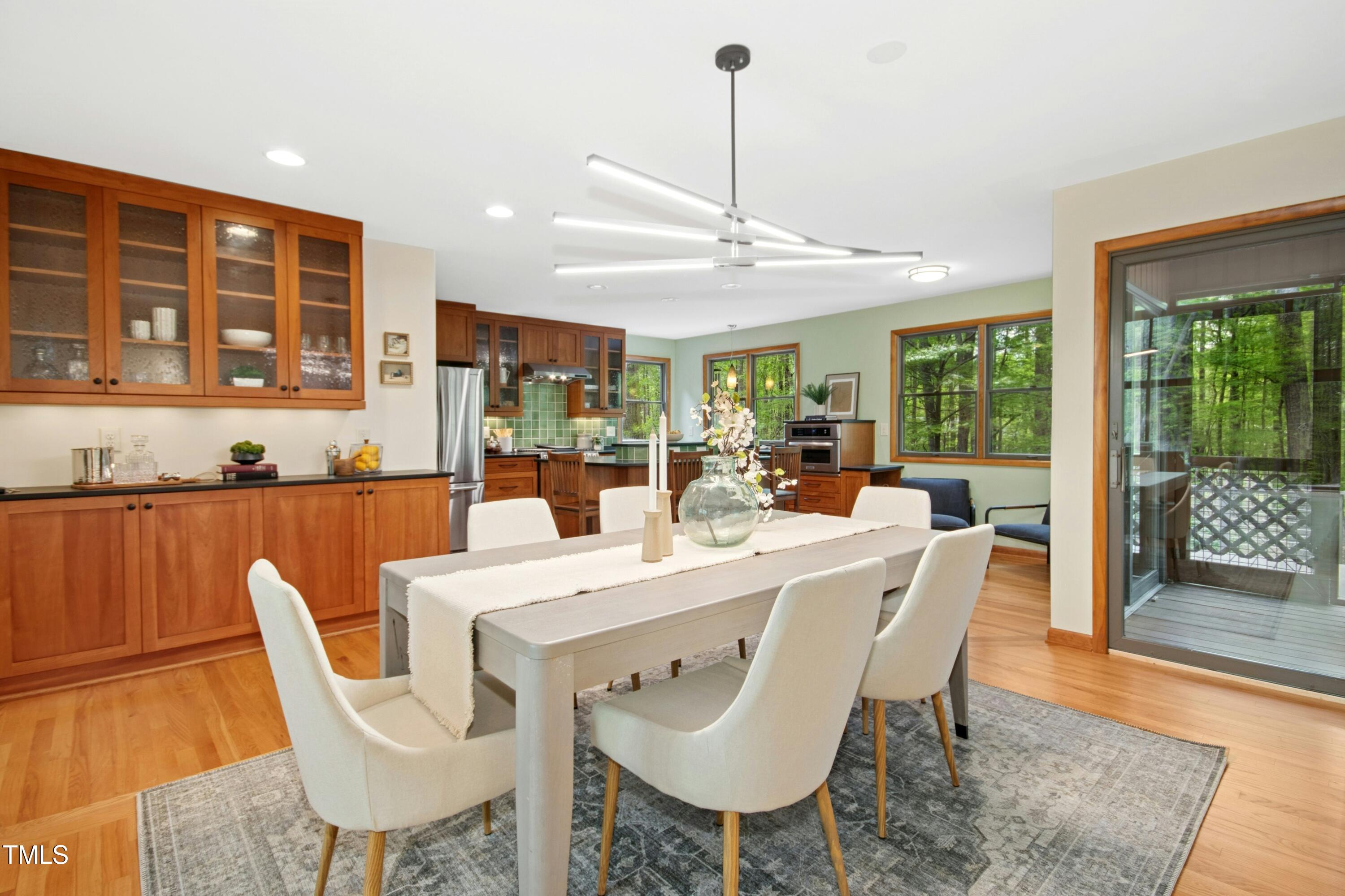 A walk-in pantry boasting custom built-ins, recessed lighting, electrical outlets for small appliances, and a dedicated wine refrigerator! You will love the convenience of a serving station off the dining area! Showcasing a contemporary chandelier, the dining area is generously sized and offers access to a magnificent, screened porch and expansive deck. A cozy corner is the perfect breakfast nook surrounded by gentle light-filled windows and wooded views.