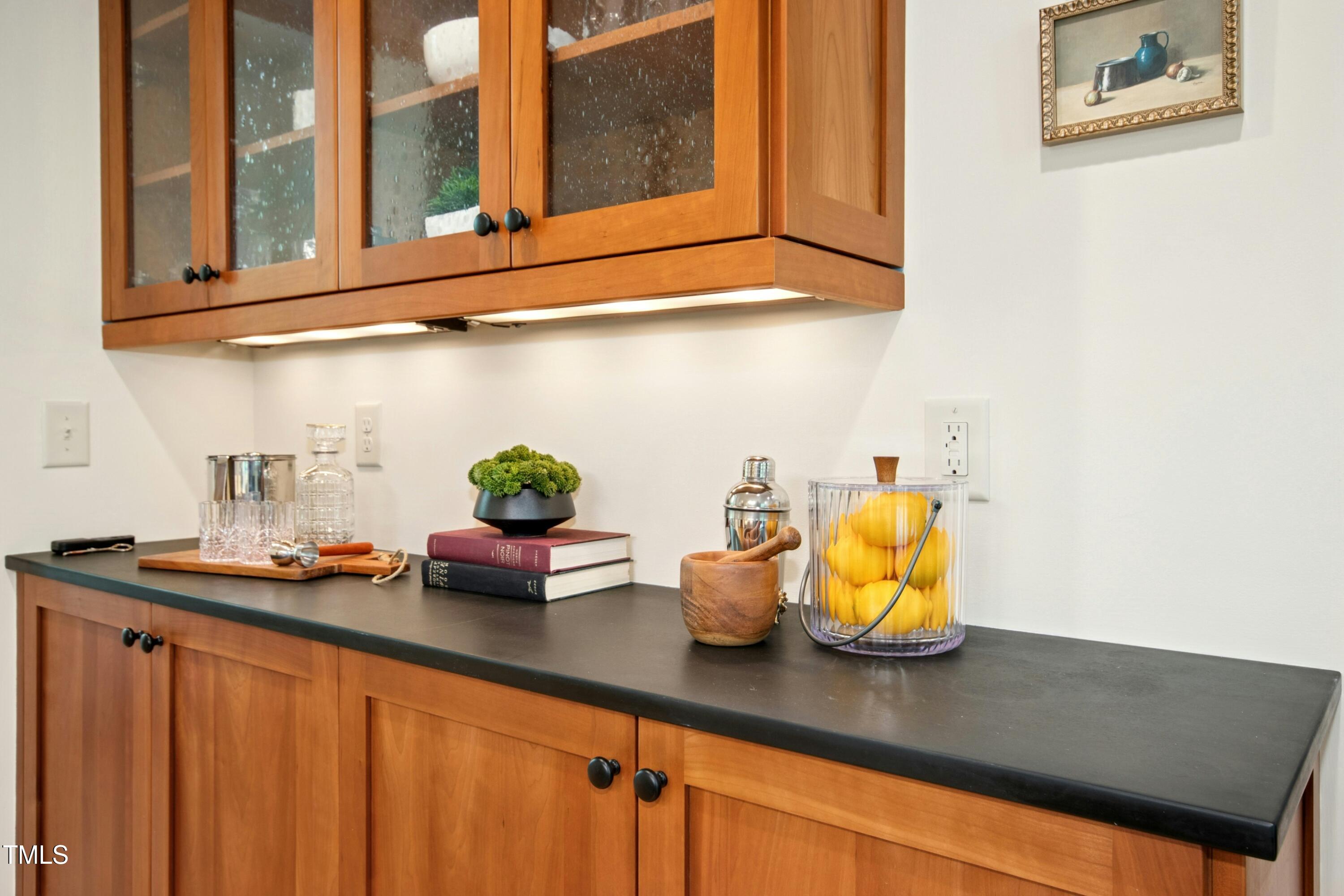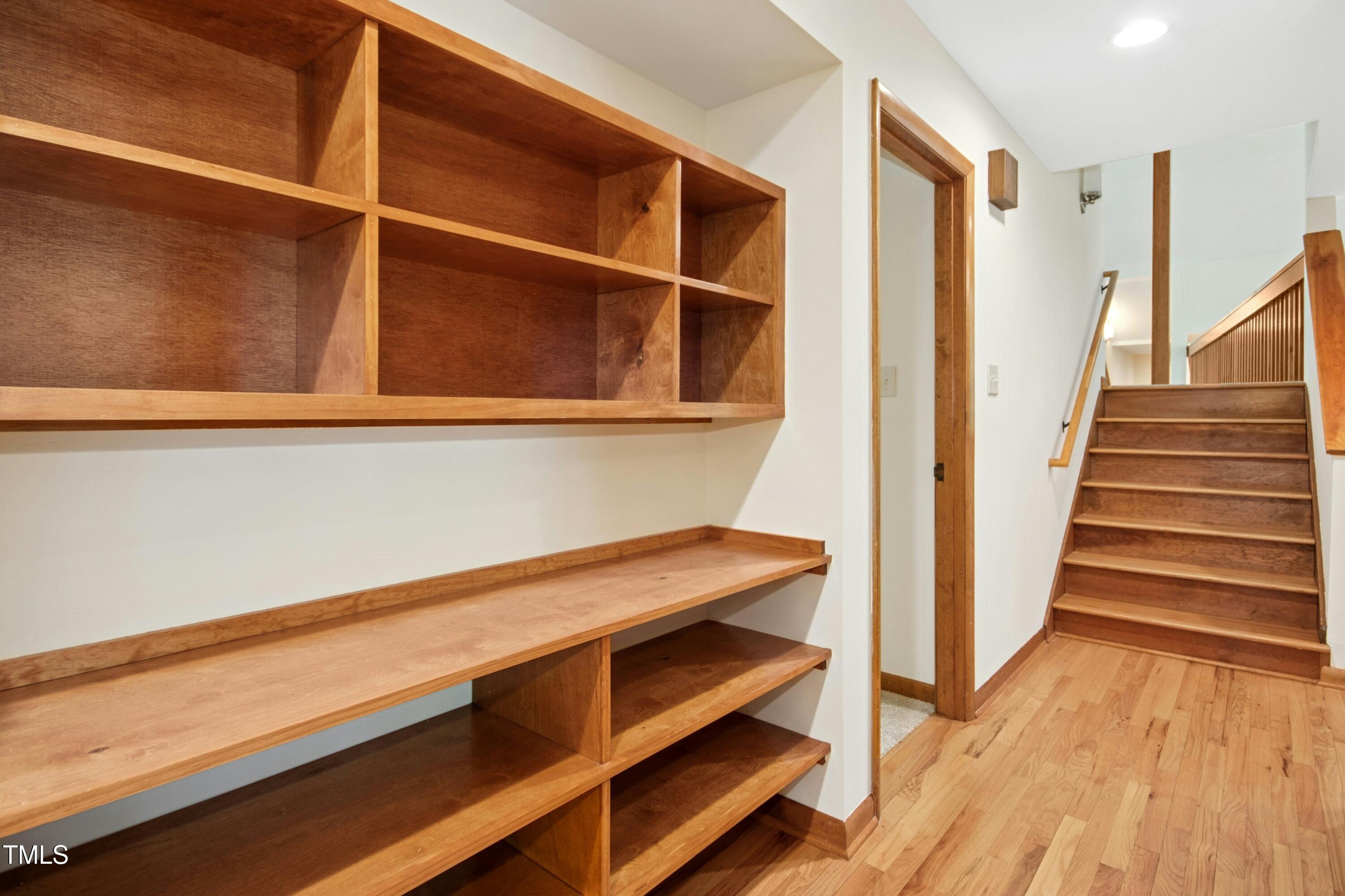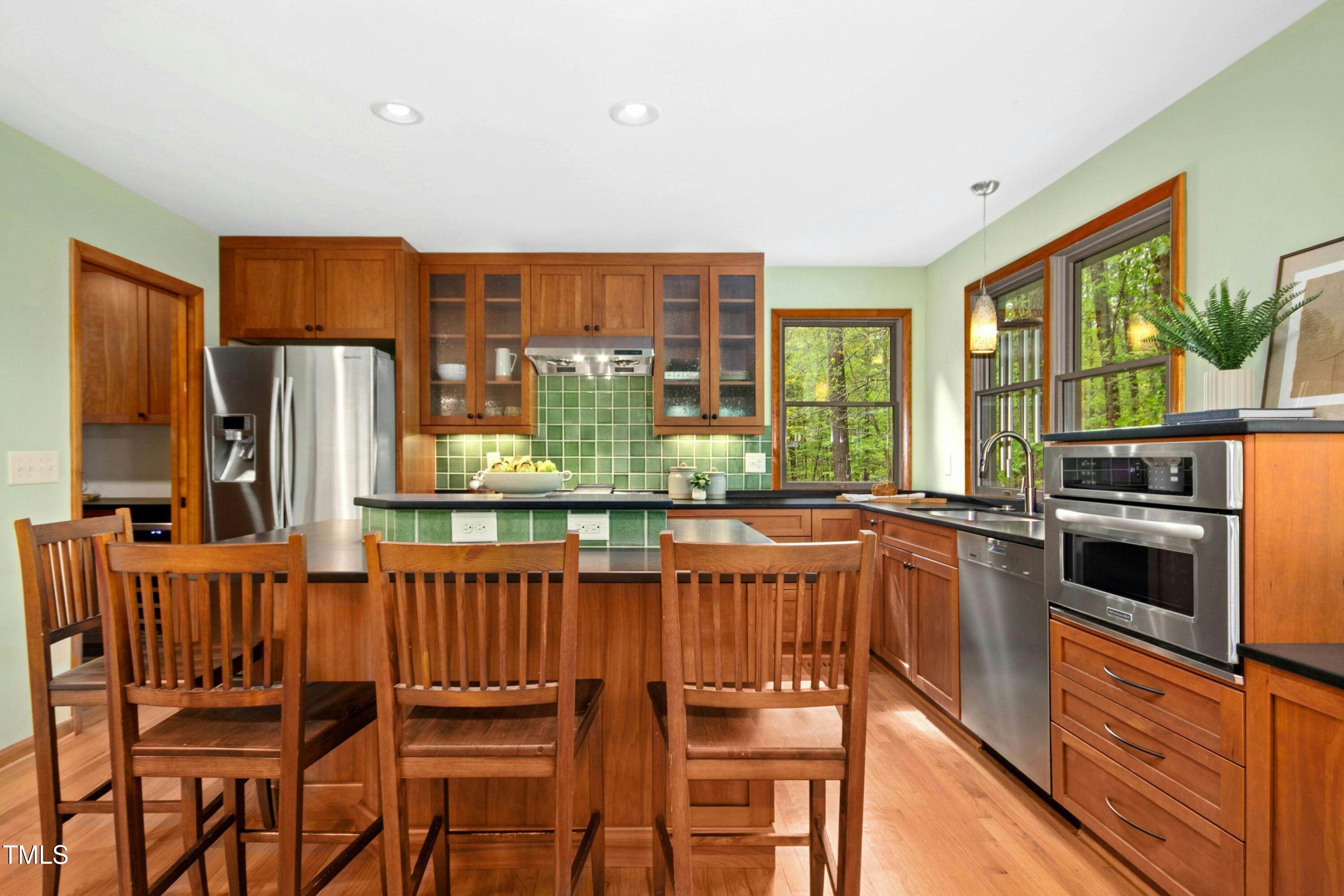 A walk-in pantry boasting custom built-ins, recessed lighting, electrical outlets for small appliances, and a dedicated wine refrigerator! You will love the convenience of a serving station off the dining area! Showcasing a contemporary chandelier, the dining area is generously sized and offers access to a magnificent, screened porch and expansive deck. A cozy corner is the perfect breakfast nook surrounded by gentle light-filled windows and wooded views.