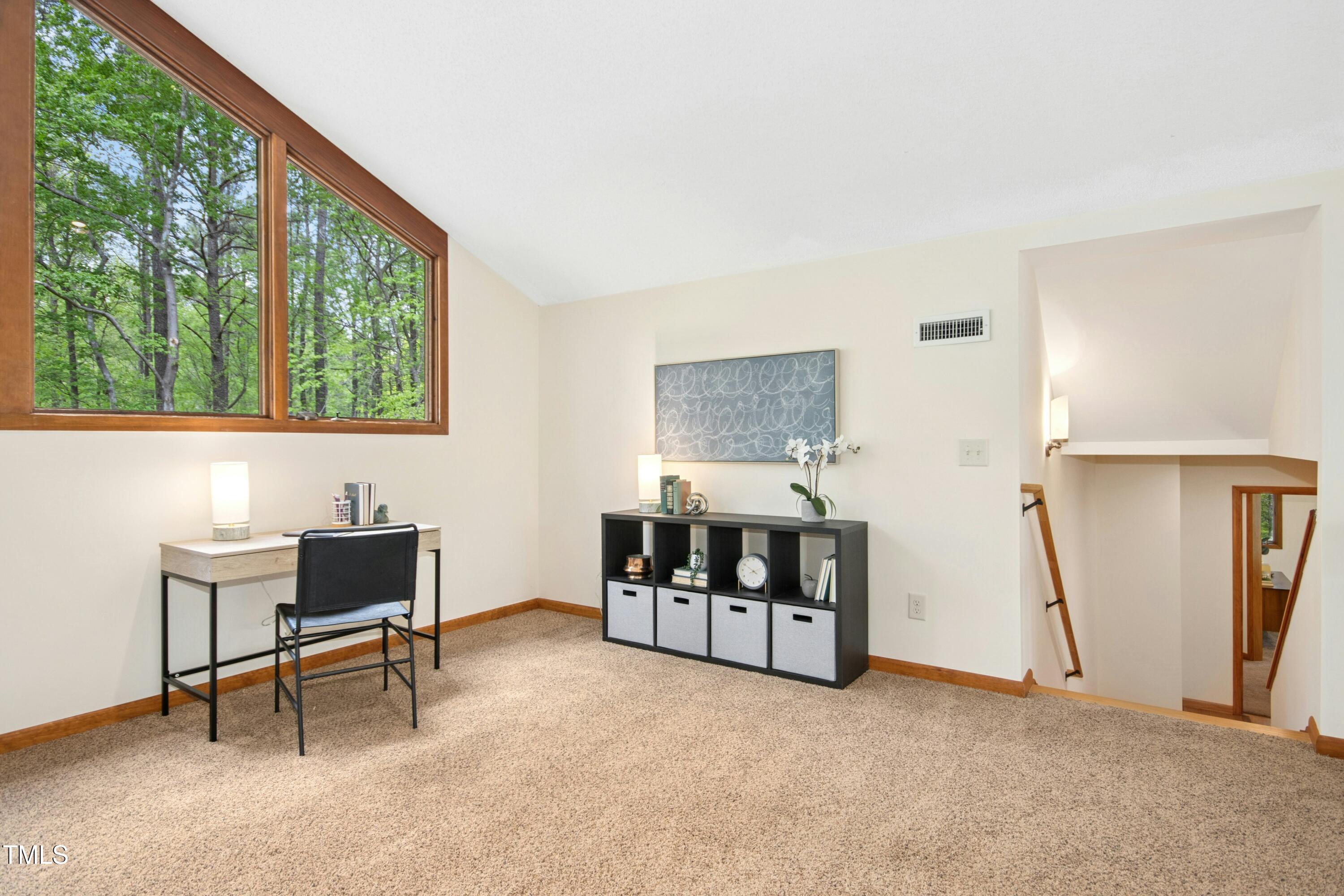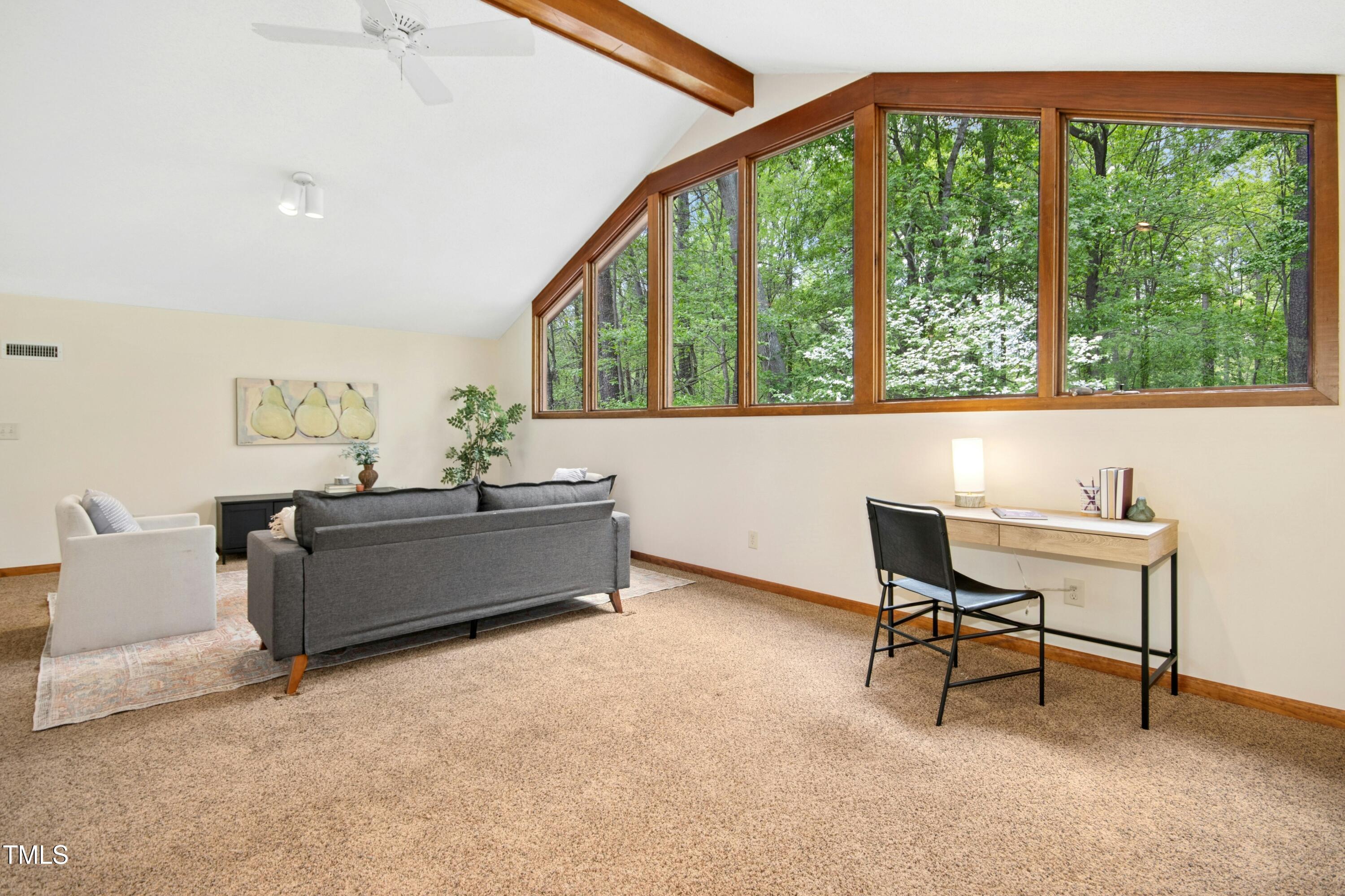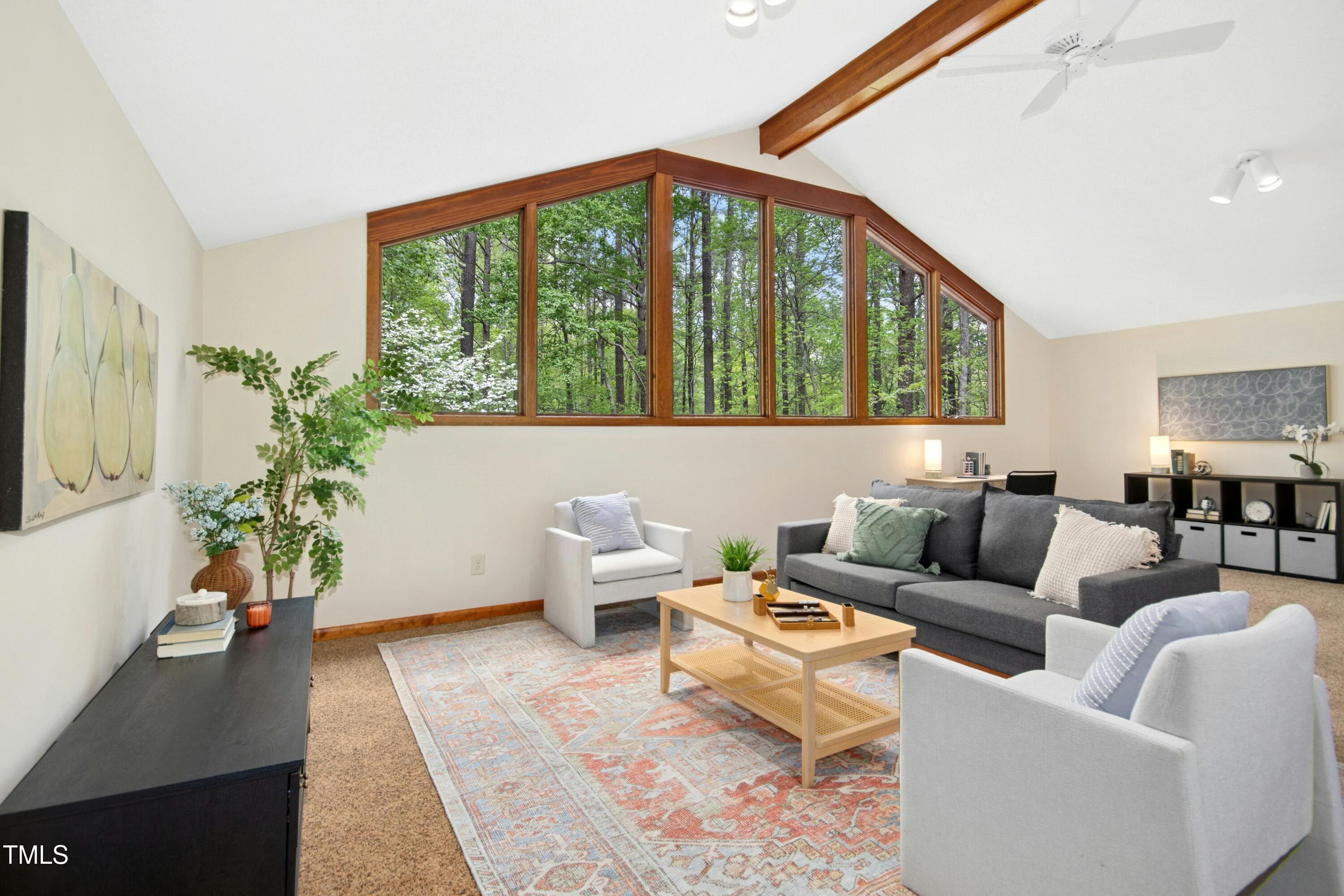 A stunning loft crowns the home with dramatic architectural windows and exposed beam work, creating a versatile space for artistic pursuits, game night fun, or quiet contemplation.