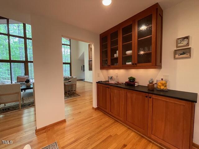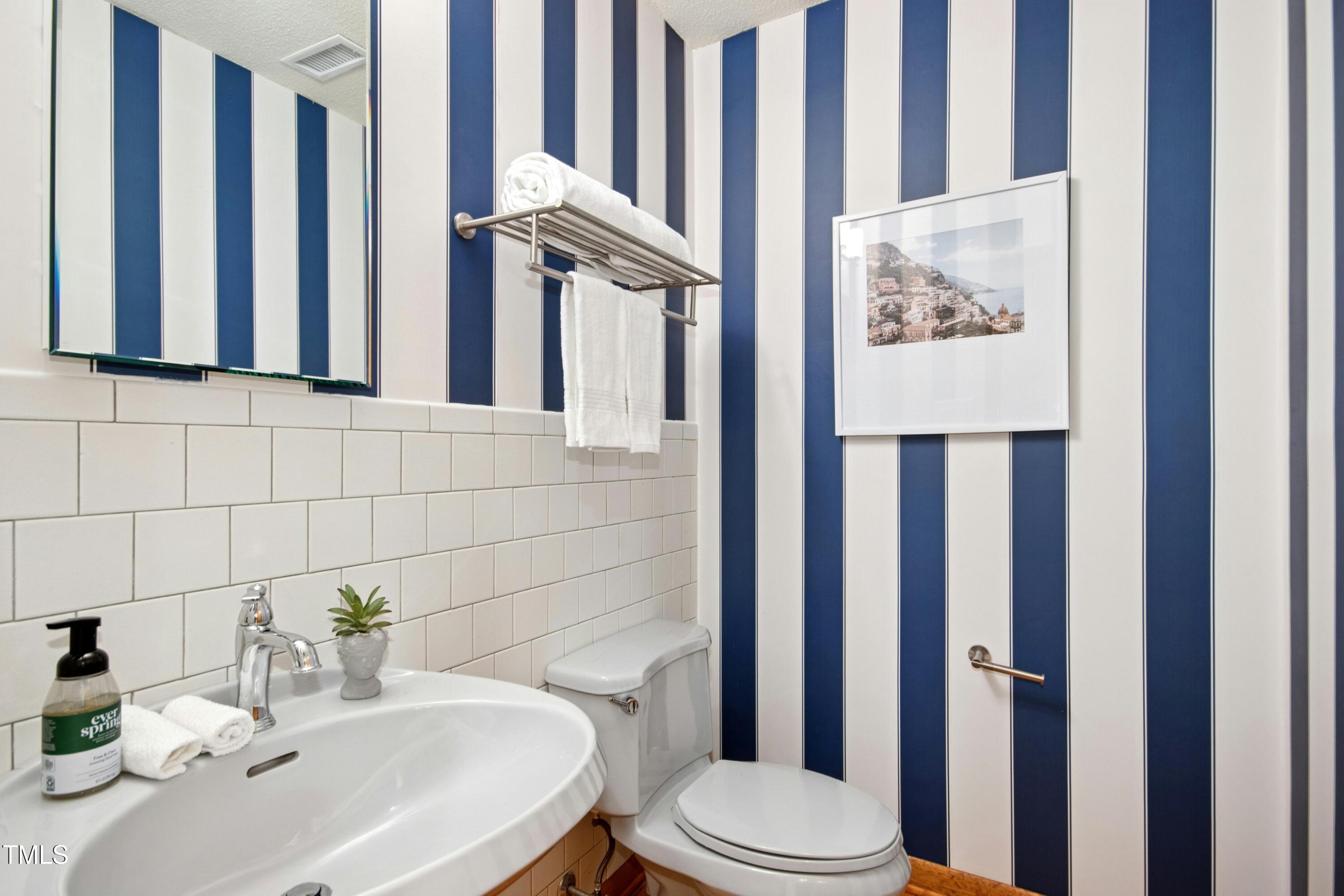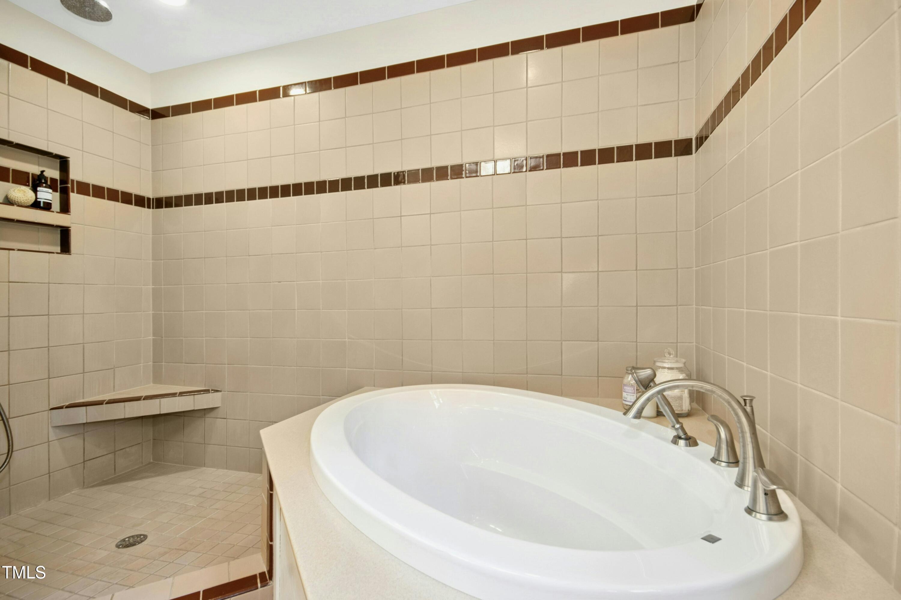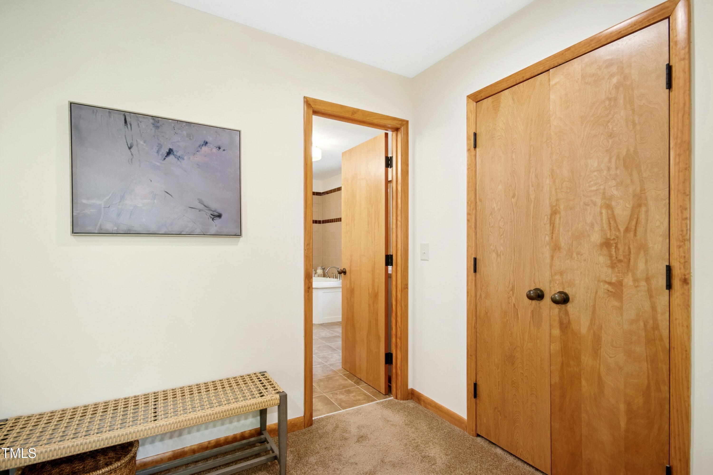Indulge in the primary bath's cherry-stained double vanity, Aquatic soaking tub, and open tile shower with rain head and built-in bench--your personal spa experience. There is even a thoughtful space for a coffee station and cosmetic refrigerator! A widened hallway creates the perfect nook for your dog beds or tv binges with a powder room with new bidet adjacent.