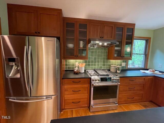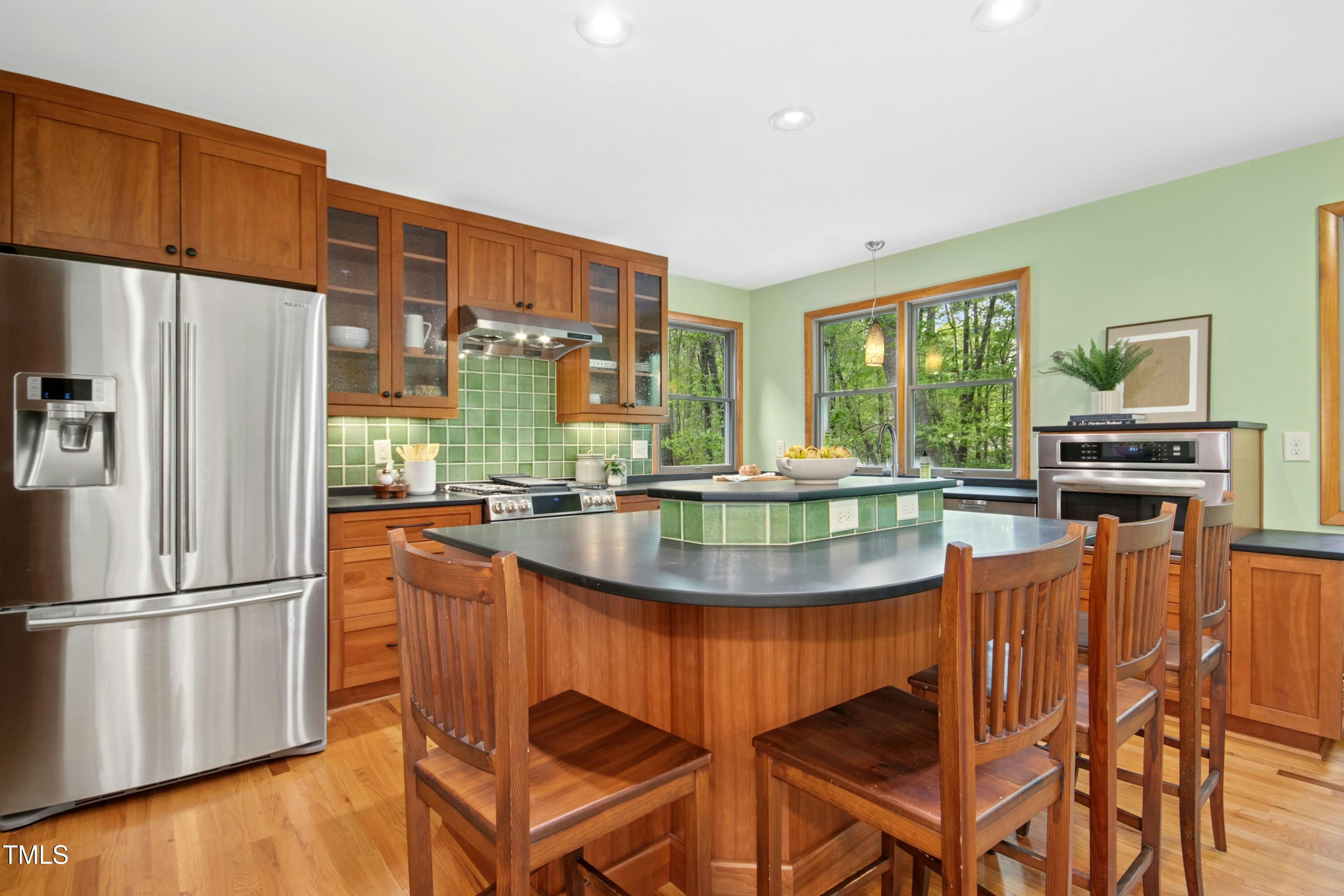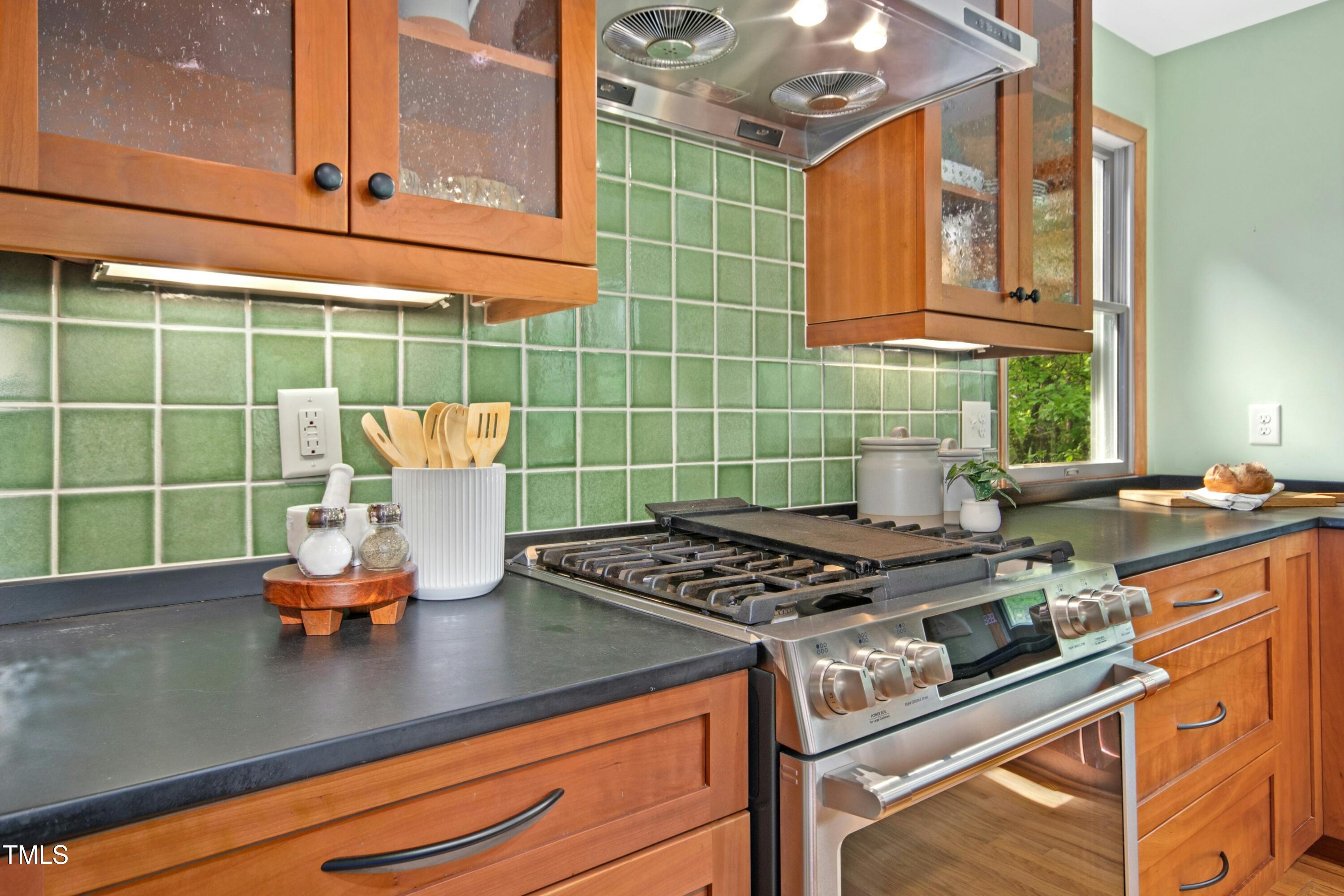 Sleek flat-panel cherry cabinetry with elegant, seeded glass, Expansive center island with built-in spice drawer & Paper-stone countertops,Bosch 6-burner cafe-style dual-fuel range and Zephyr exhaust fan, KitchenAid built-in microwave,Ceramic tile backsplash that adds artistic dimension.