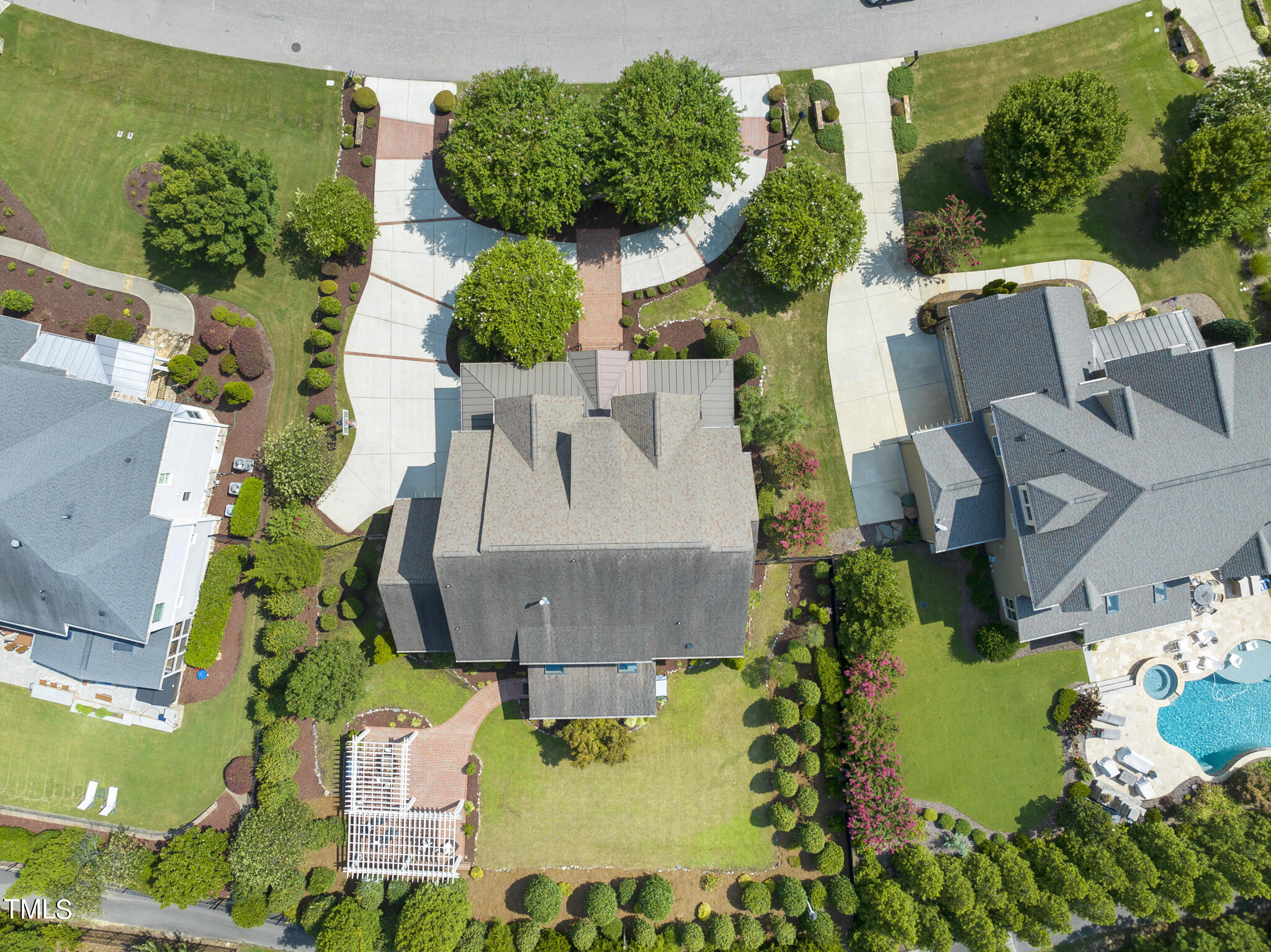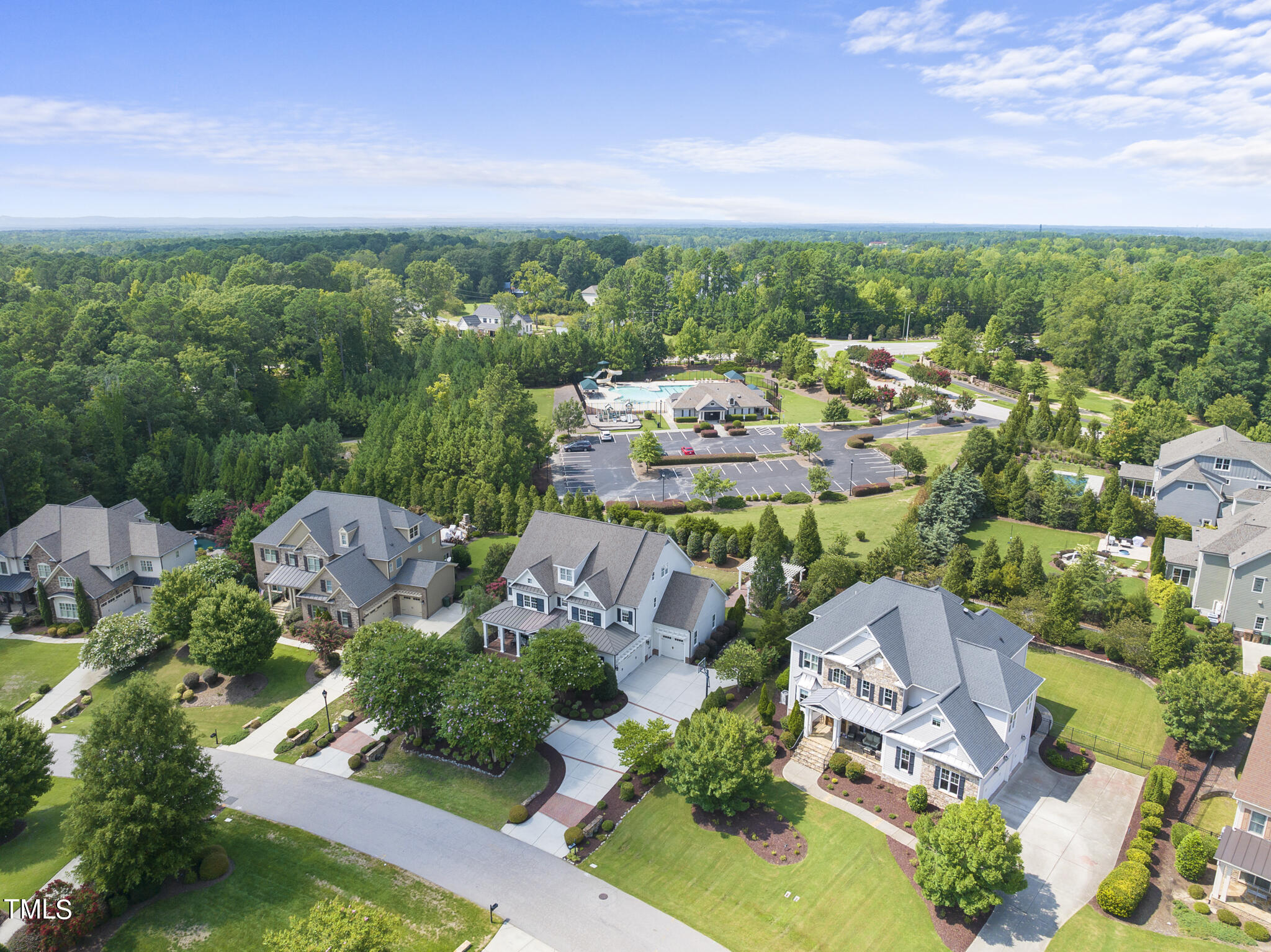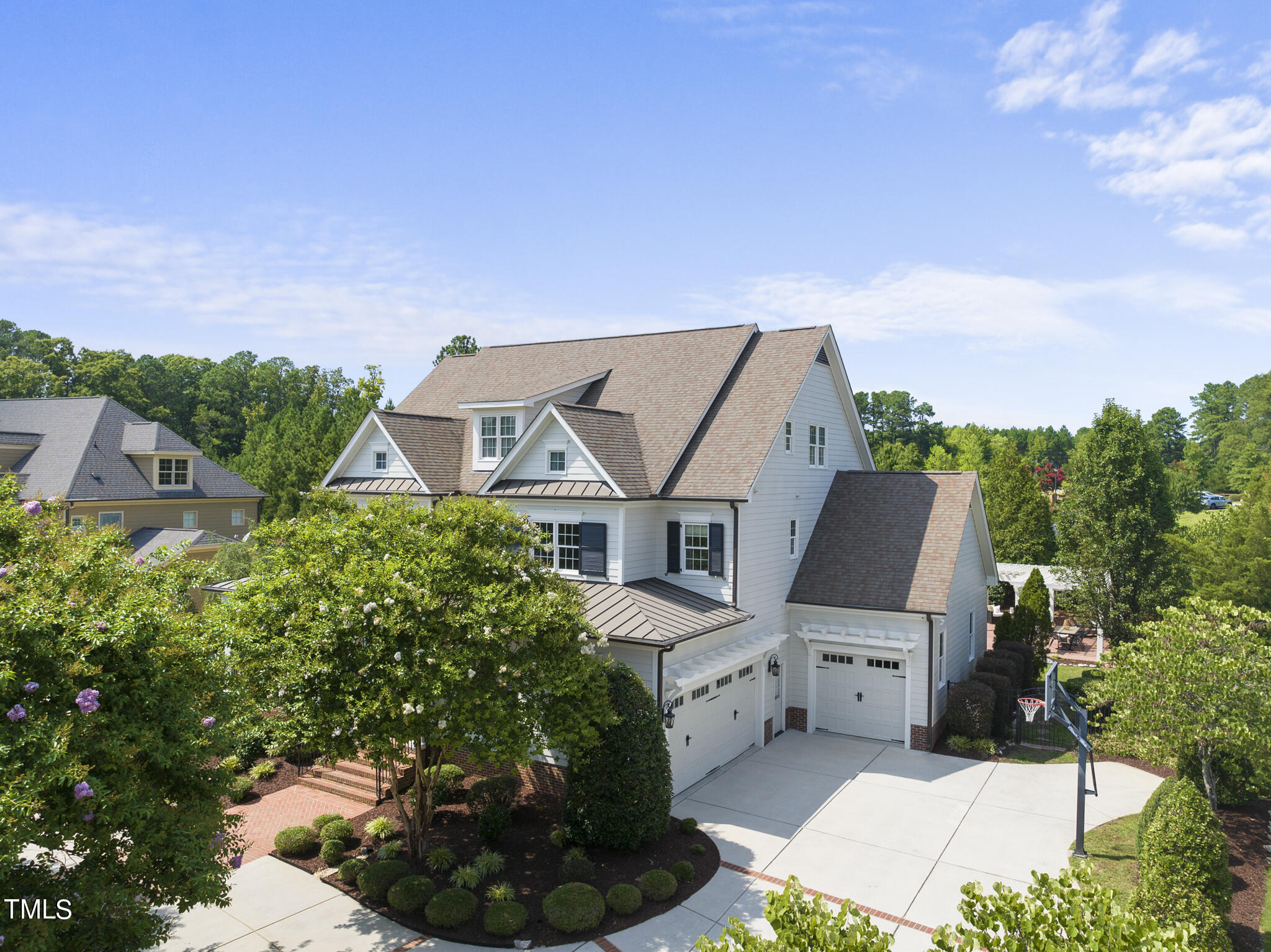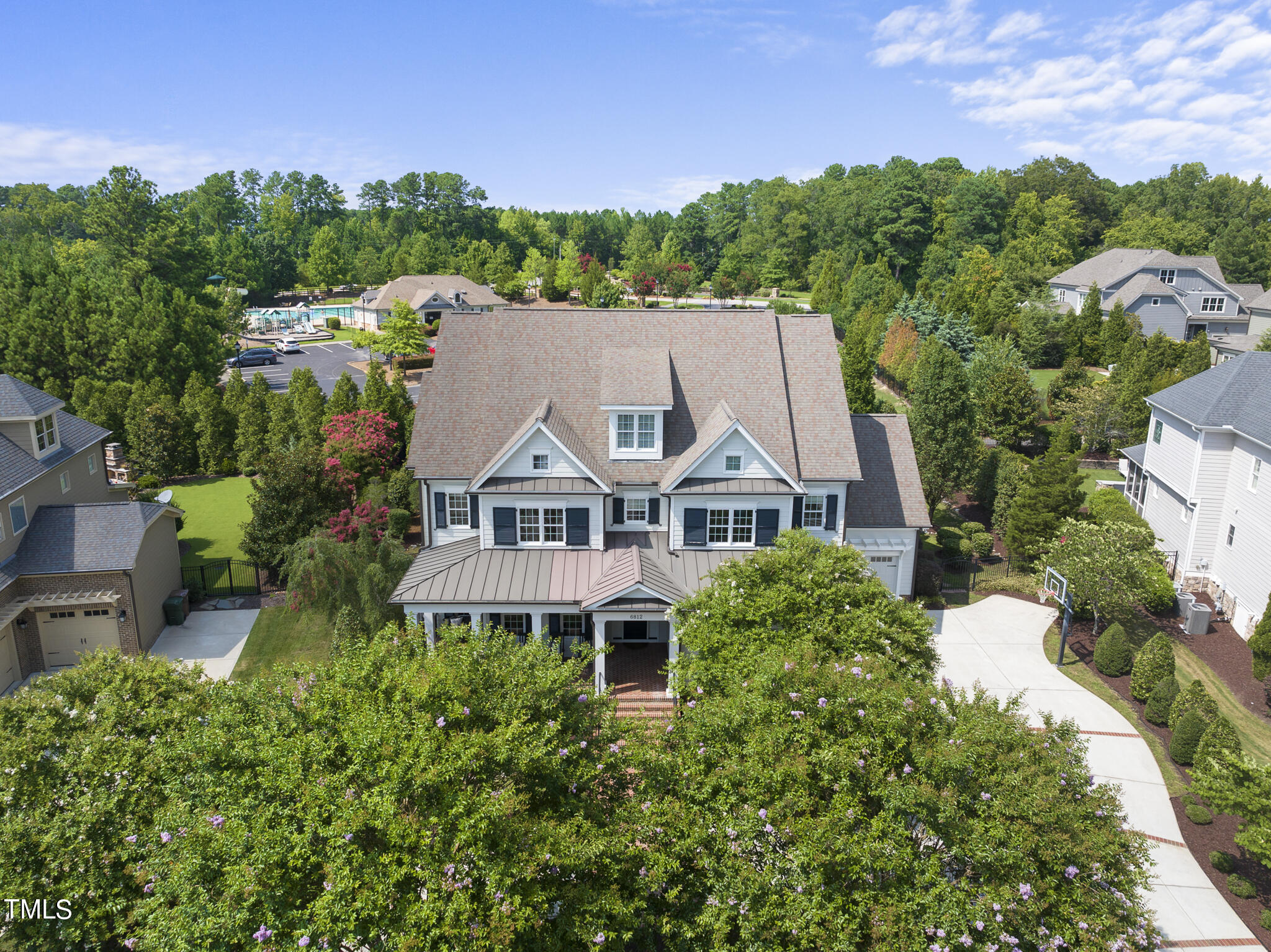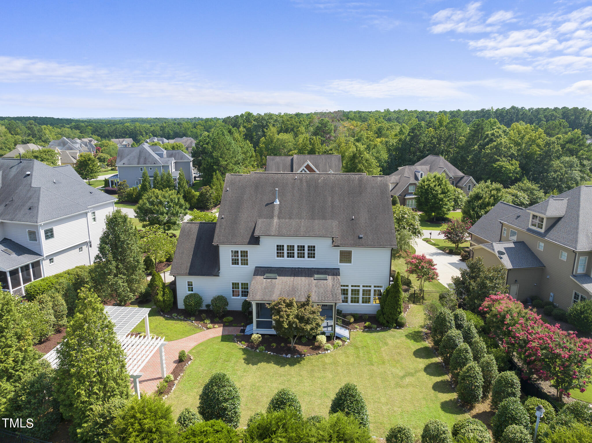 Beautiful, well maintained home with impressive curb appeal and a spacious interior plan. The front of this home offers delightful landscaping, a circular drive with brick inlays and a wraparound front porch. In the rear you'll find a screened porch overlooking a private fenced yard, large patio with pergola, grill island and easy access to the neighborhood pool or community greenway system connecting to the American Tobacco Trail. The main level is open, spacious and features arched thresholds, coffered ceilings, a see-through gas fireplace and a plethora of windows overlooking the lush backyard. The kitchen and breakfast room is a large space perfect for entertaining and includes Viking and KitchenAid stainless appliances. 1st floor guest bed/office/bath. The 2nd floor features the primary and 3 secondary bedrooms with ensuite baths and bonus room with wet bar. Expand your living space via the walk-up 3rd floor. New HVAC and hot water in 2018, irrigation, wired security and whole house water softener systems, distributed audio and a closed crawlspace.