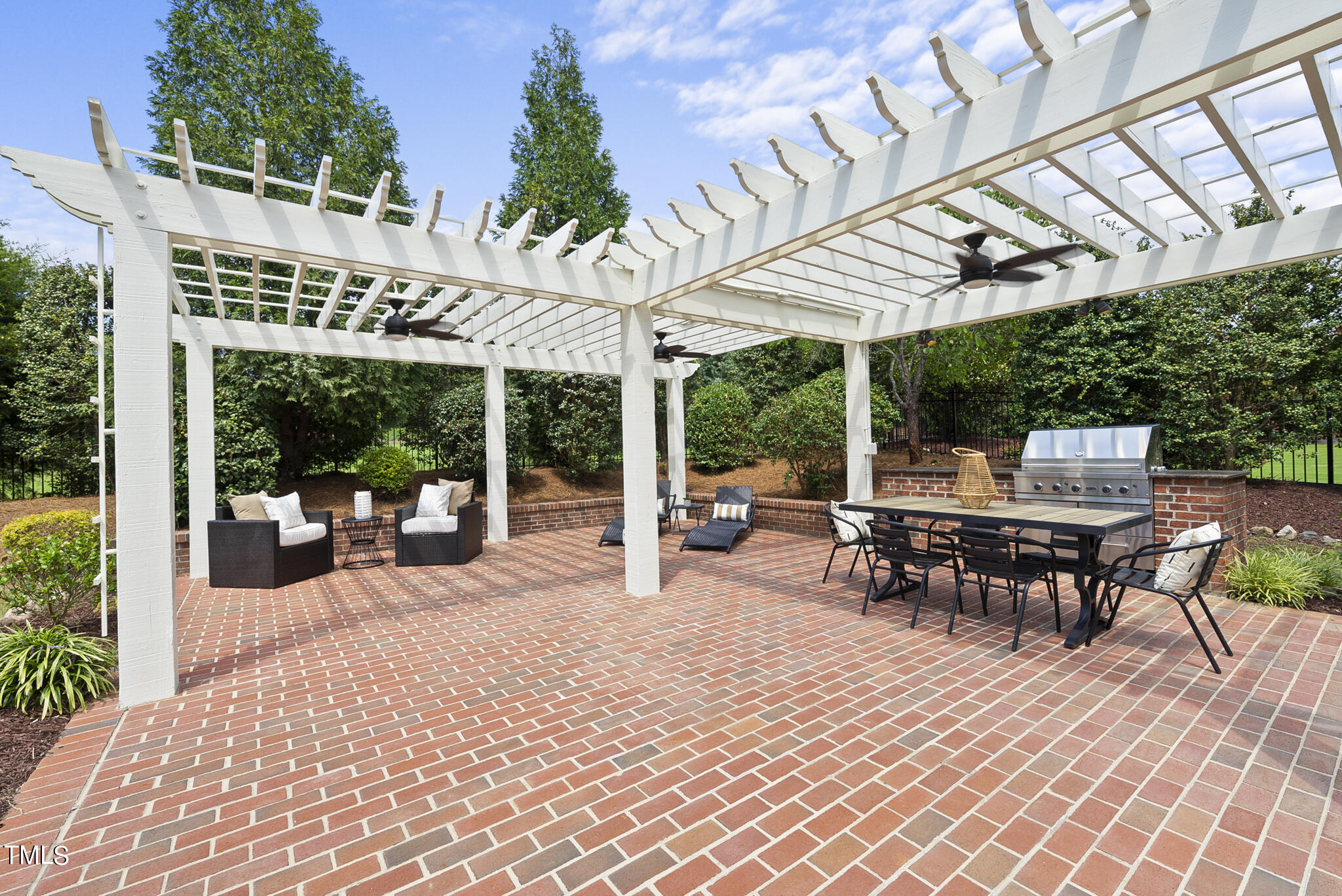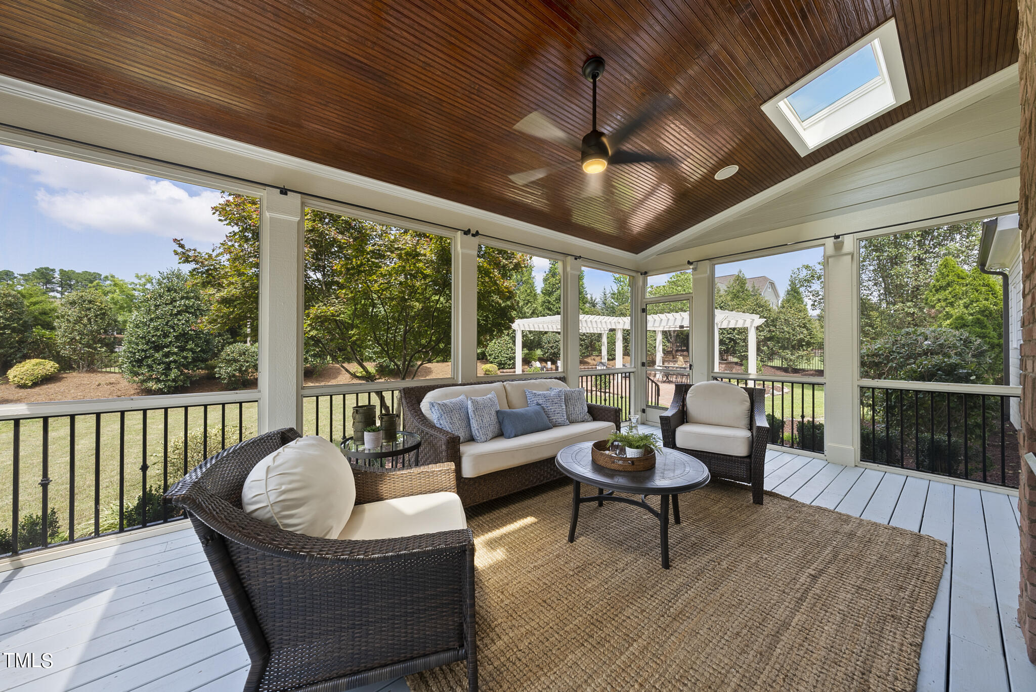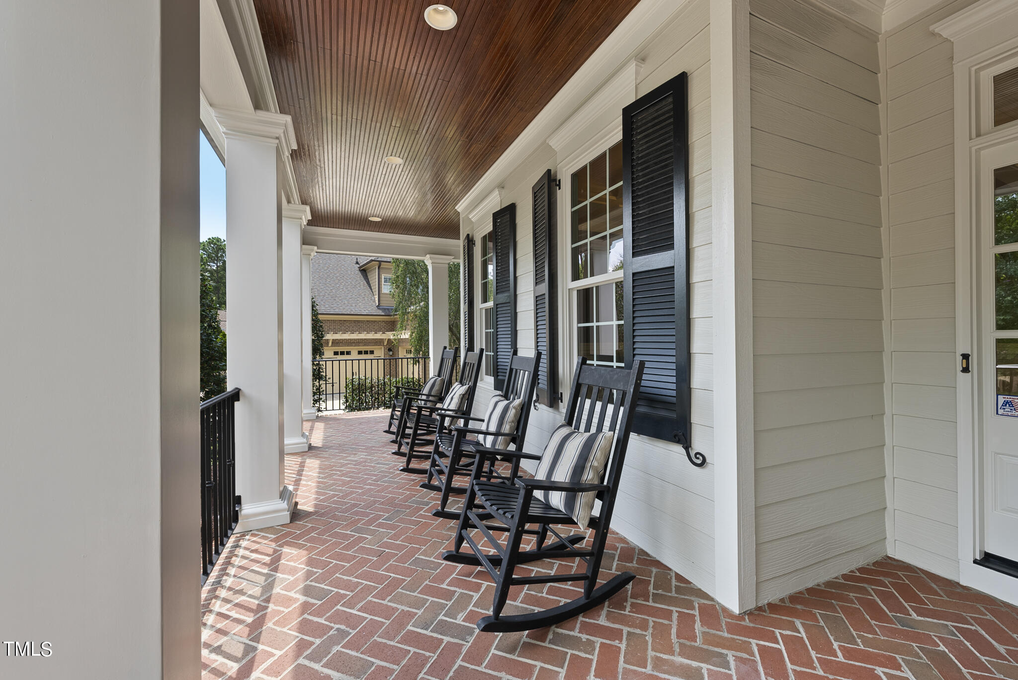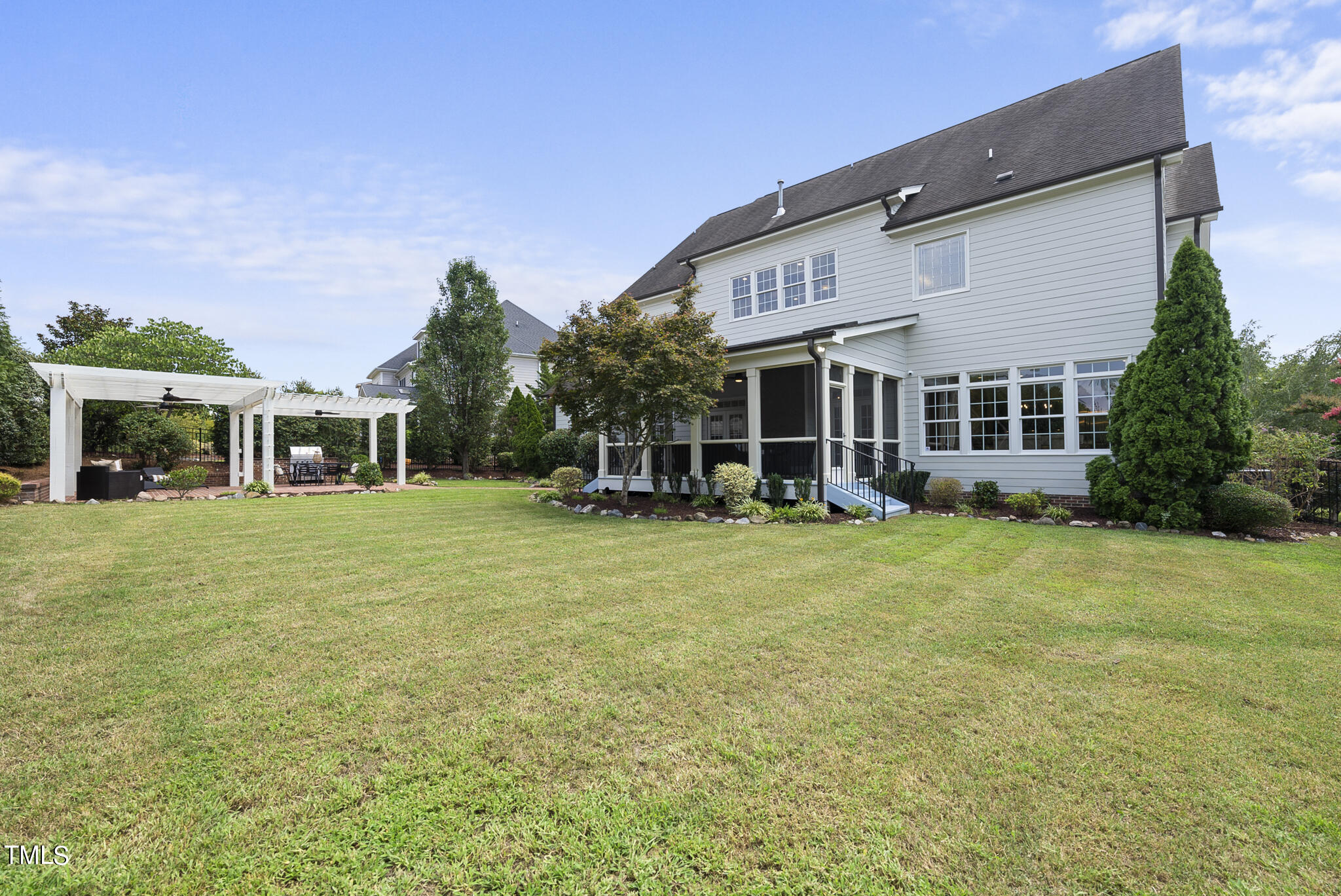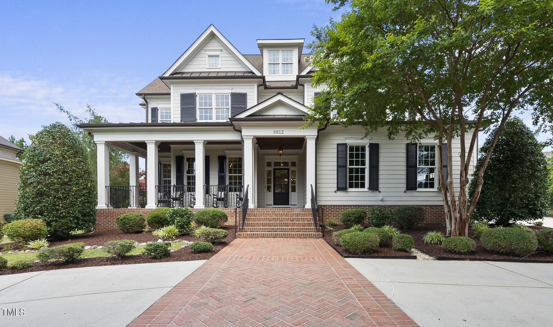 Beautiful, well maintained home with impressive curb appeal and a spacious interior plan. The front of this home offers delightful landscaping, a circular drive with brick inlays and a wraparound front porch. In the rear you'll find a screened porch overlooking a private fenced yard, large patio with pergola, grill island and easy access to the neighborhood pool or community greenway system connecting to the American Tobacco Trail. The main level is open, spacious and features arched thresholds, coffered ceilings, a see-through gas fireplace and a plethora of windows overlooking the lush backyard. The kitchen and breakfast room is a large space perfect for entertaining and includes Viking and KitchenAid stainless appliances. 1st floor guest bed/office/bath. The 2nd floor features the primary and 3 secondary bedrooms with ensuite baths and bonus room with wet bar. Expand your living space via the walk-up 3rd floor. New HVAC and hot water in 2018, irrigation, wired security and whole house water softener systems, distributed audio and a closed crawlspace.