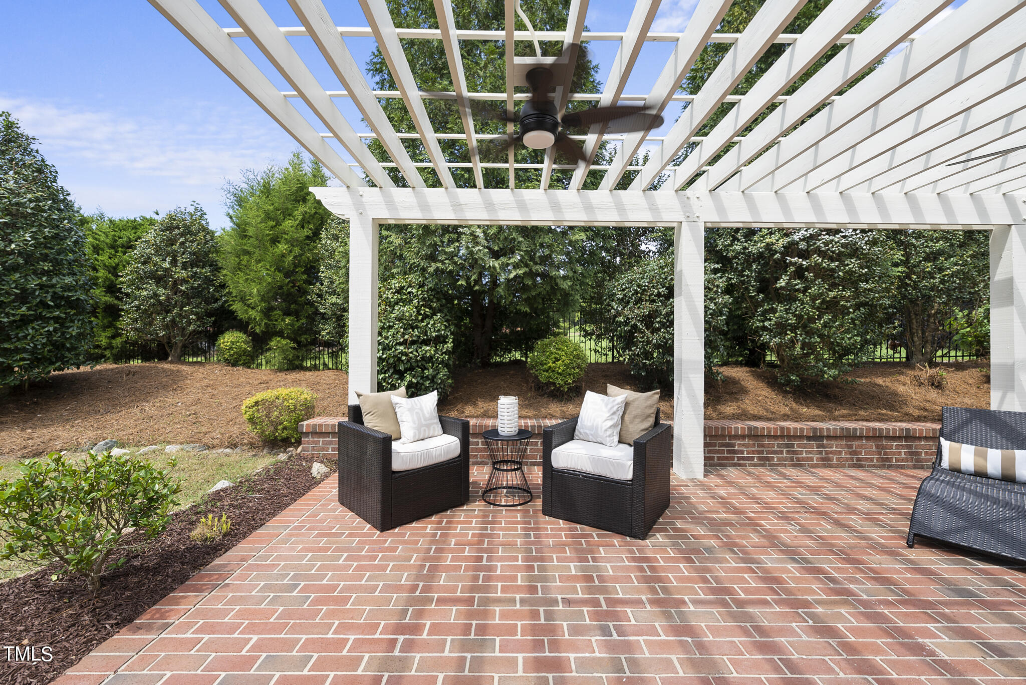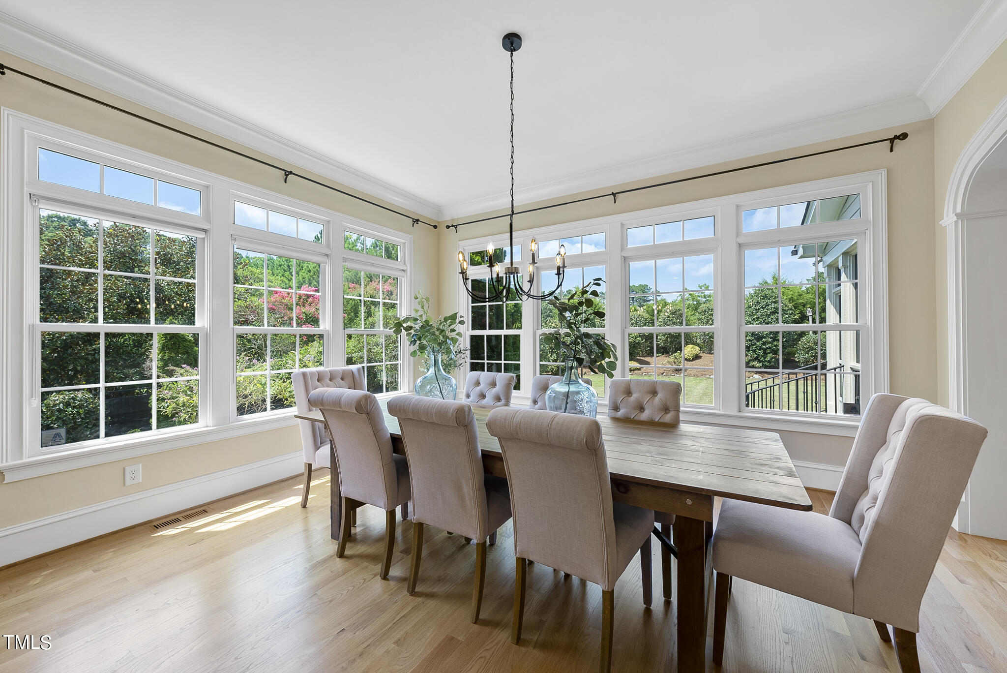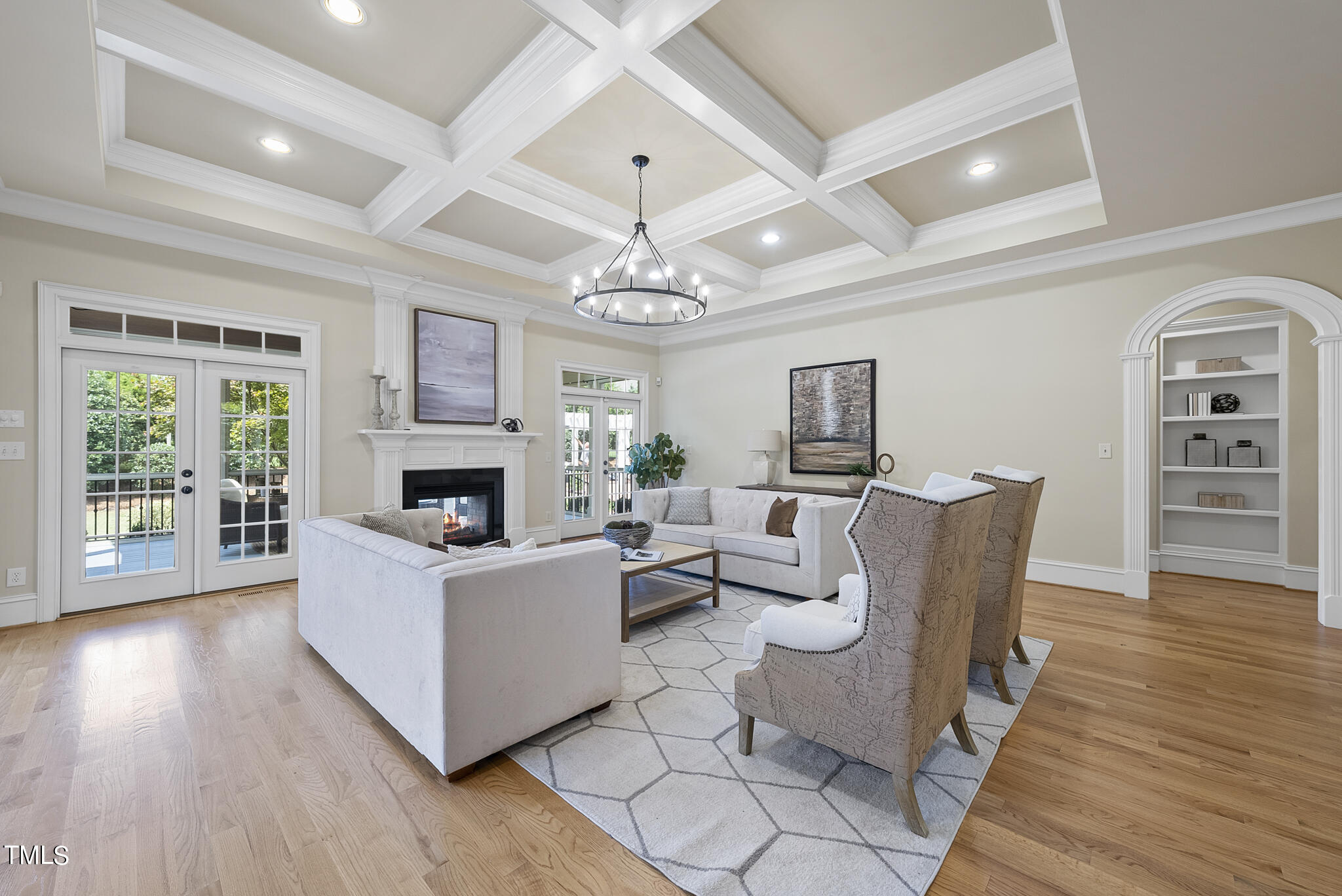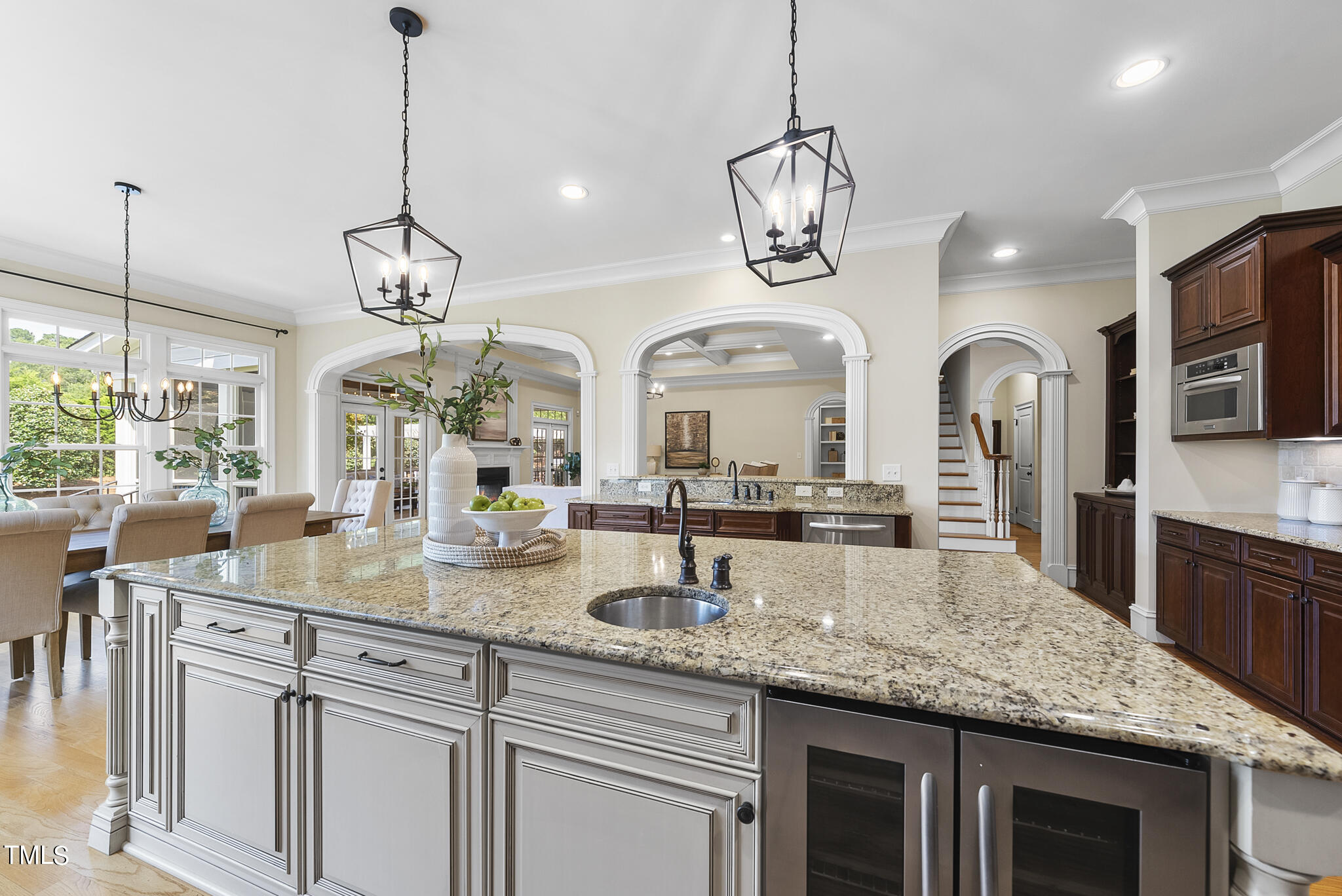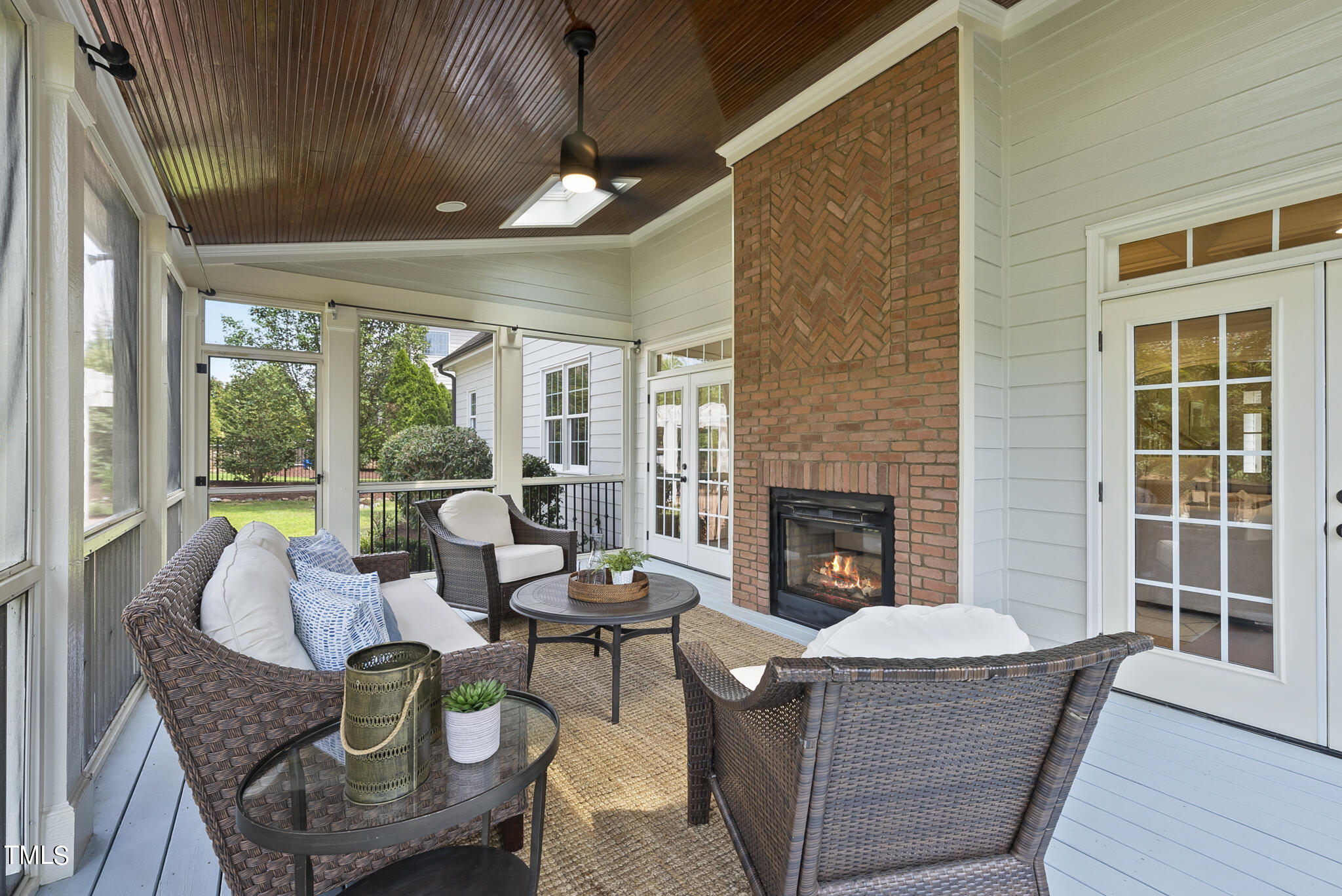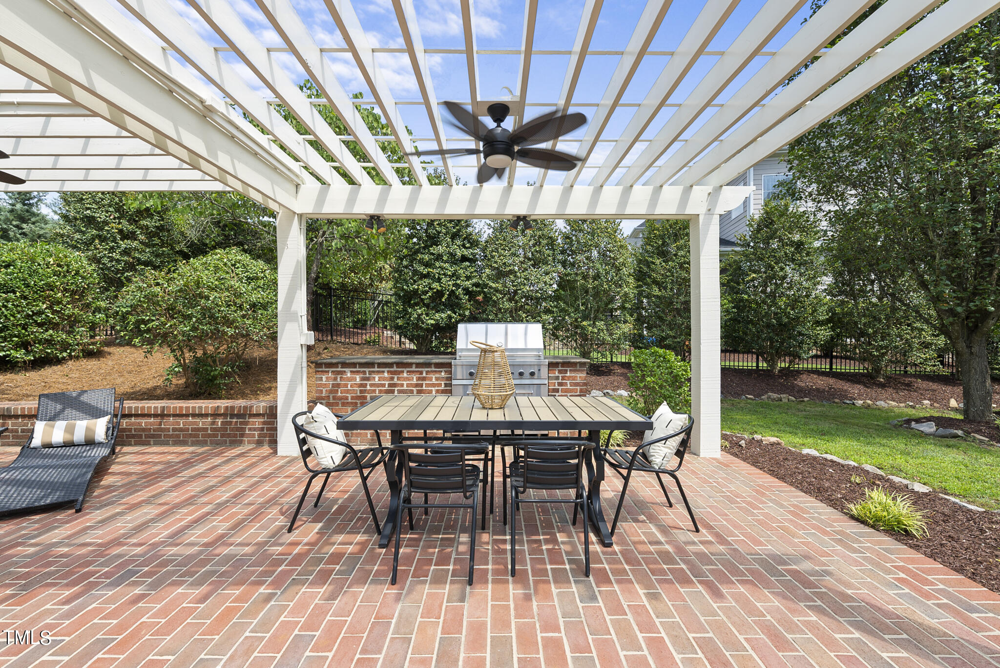 Beautiful, well maintained home with impressive curb appeal and a spacious interior plan. The front of this home offers delightful landscaping, a circular drive with brick inlays and a wraparound front porch. In the rear you'll find a screened porch overlooking a private fenced yard, large patio with pergola, grill island and easy access to the neighborhood pool or community greenway system connecting to the American Tobacco Trail. The main level is open, spacious and features arched thresholds, coffered ceilings, a see-through gas fireplace and a plethora of windows overlooking the lush backyard. The kitchen and breakfast room is a large space perfect for entertaining and includes Viking and KitchenAid stainless appliances. 1st floor guest bed/office/bath. The 2nd floor features the primary and 3 secondary bedrooms with ensuite baths and bonus room with wet bar. Expand your living space via the walk-up 3rd floor. New HVAC and hot water in 2018, irrigation, wired security and whole house water softener systems, distributed audio and a closed crawlspace.